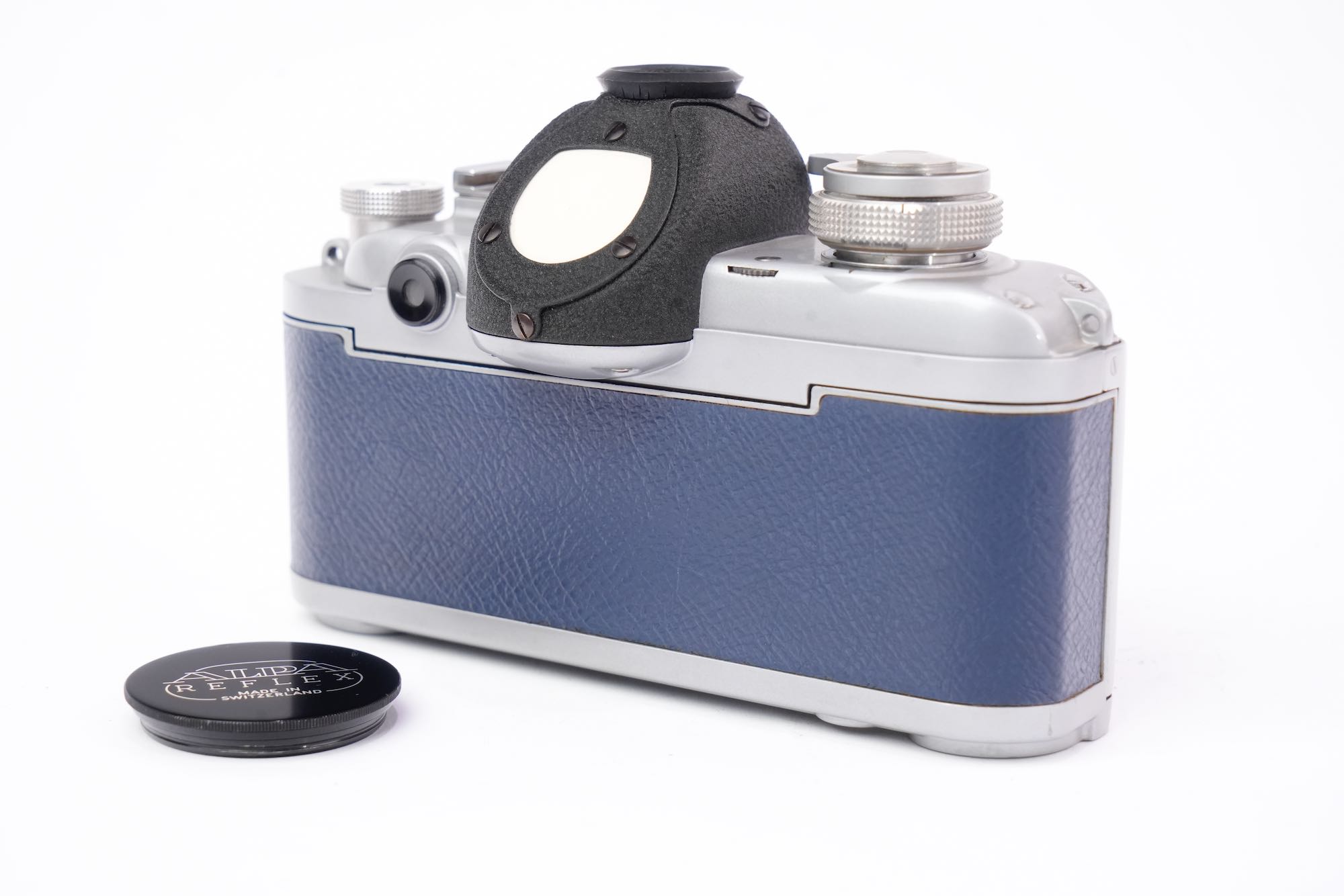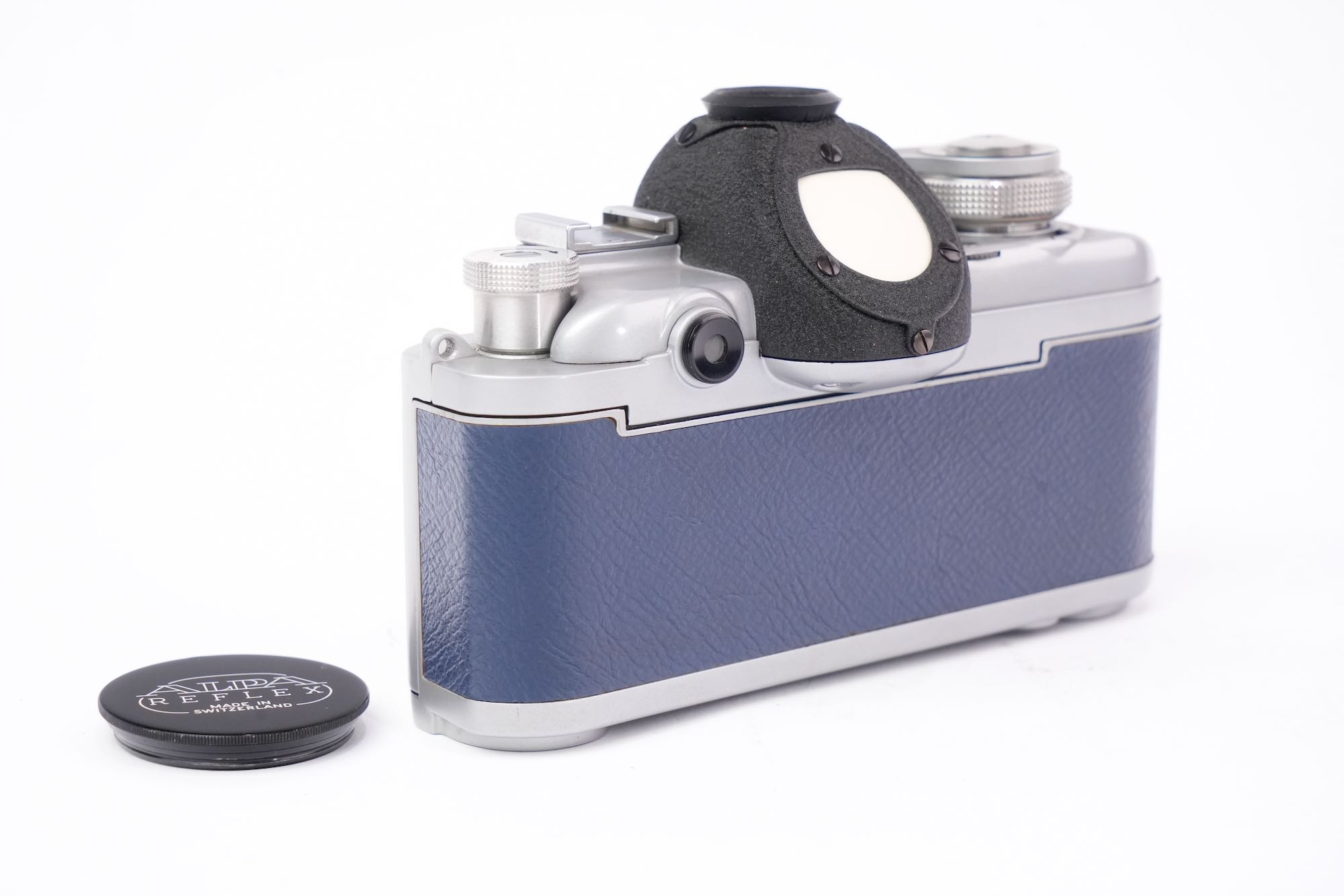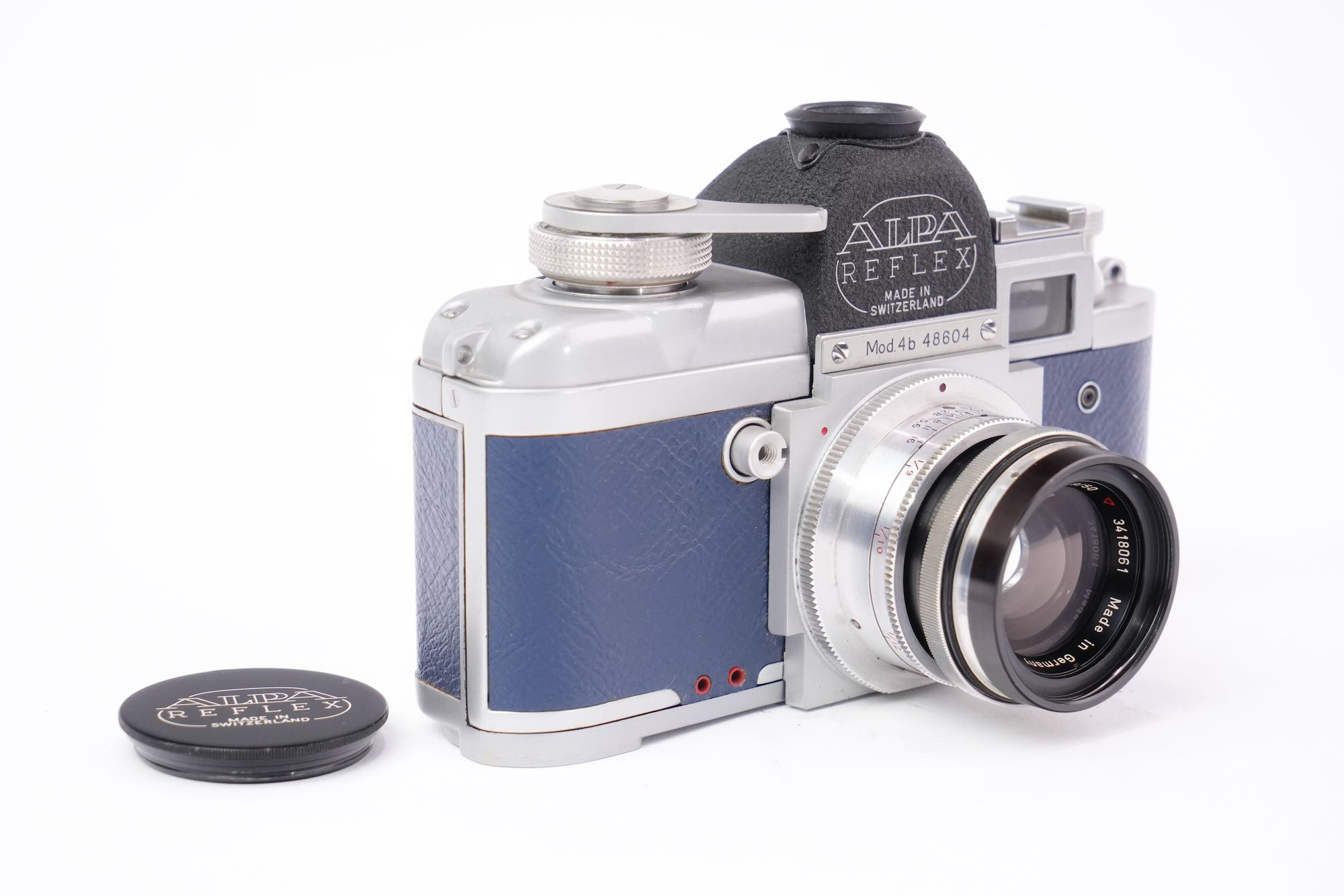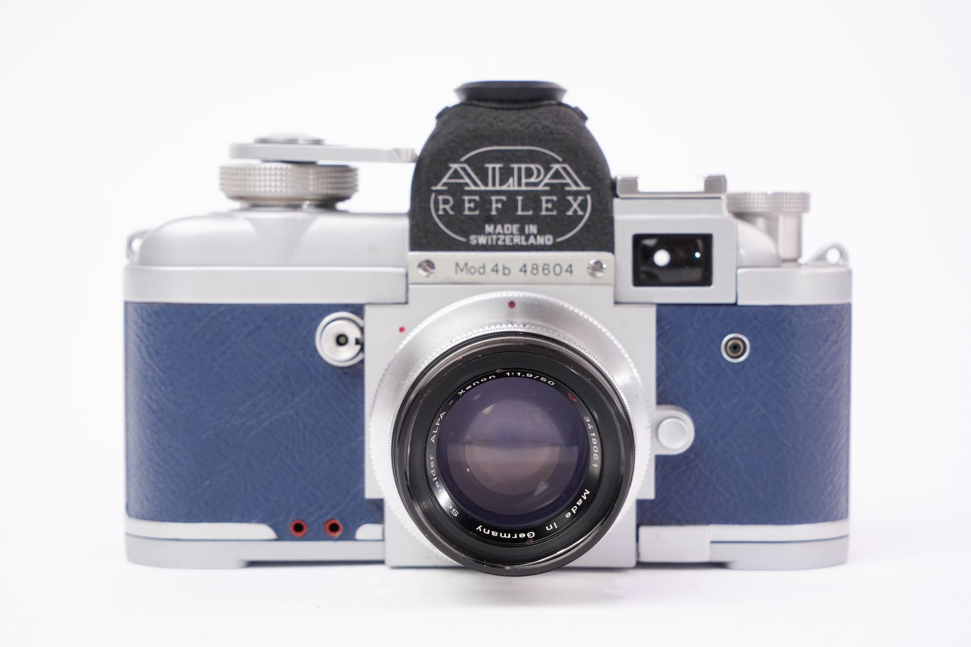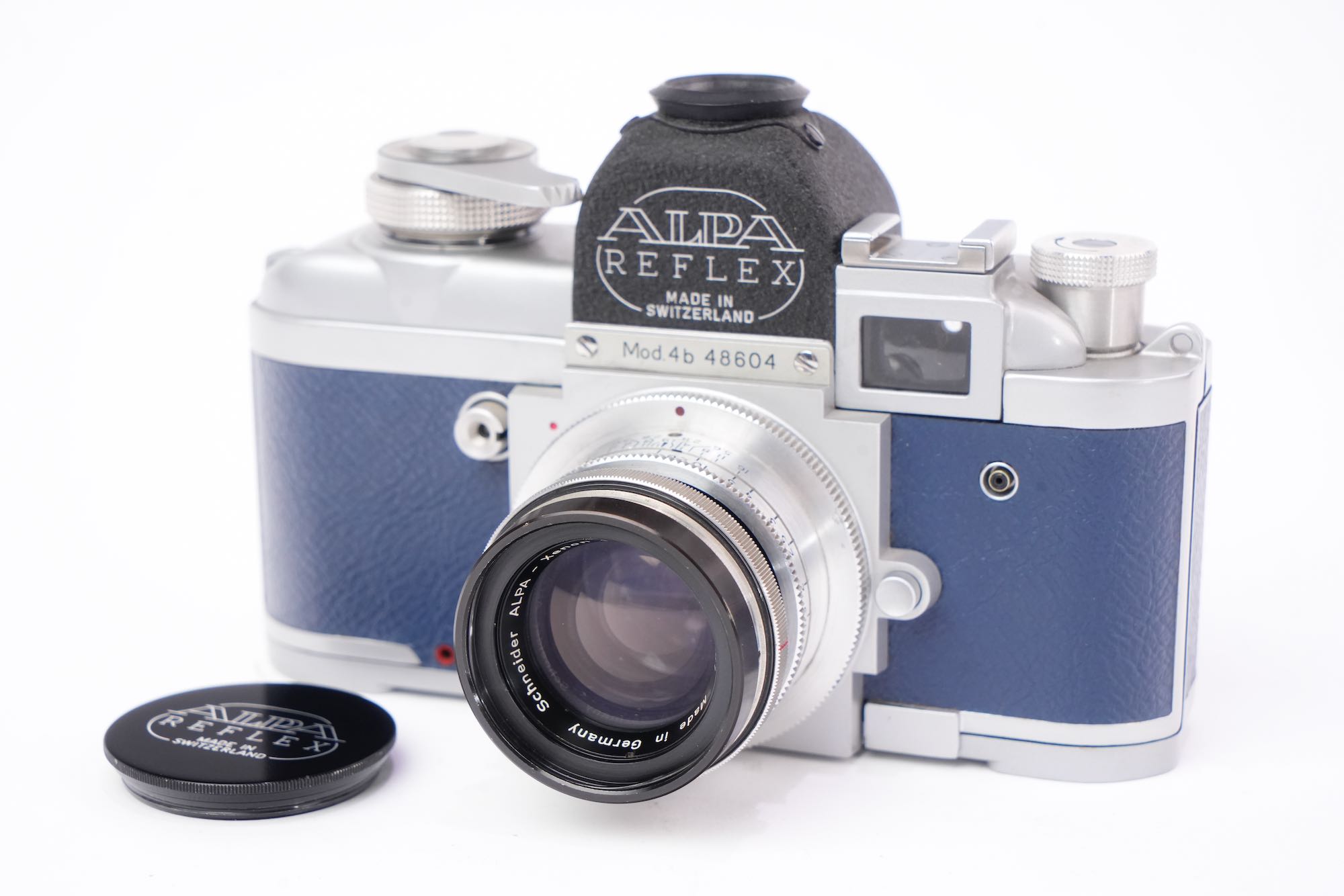 <div class="available-middle-text">Rarissime version 4B Alpa de luxe en cuir bleu. La visée reflex se fait à 90° sur le sommet du boîtier. Le système reflex est doublé d’un viseur clair pour le cadrage rapide. L’objectif télescopique à mise au point hélicoïdale est un Schneider f/1,9 F=50mm. Très bon état extérieur. Rideaux en bon état. L'appareil s'arme et semble déclencher correctement. Objectif sans décollement ni champignon, présente quelques poussières et une légère brume. Réglages du diaphragme et de la mise au point opérationnels. Numéro 48604. Le modèle 4B a été fabriqué selon certaines sources à seulement 93 exemplaires.</div>