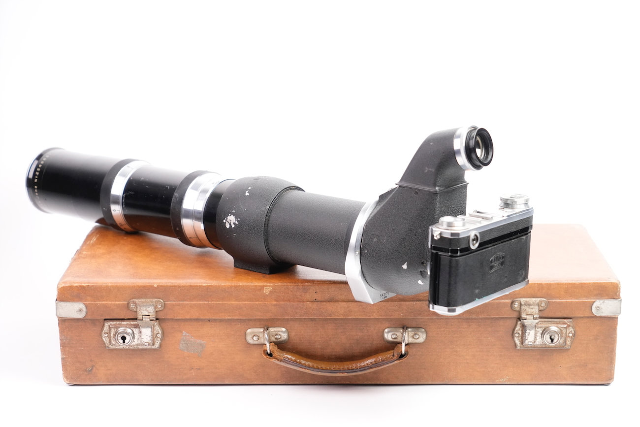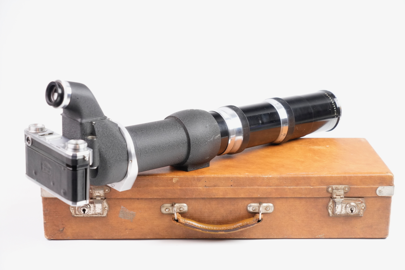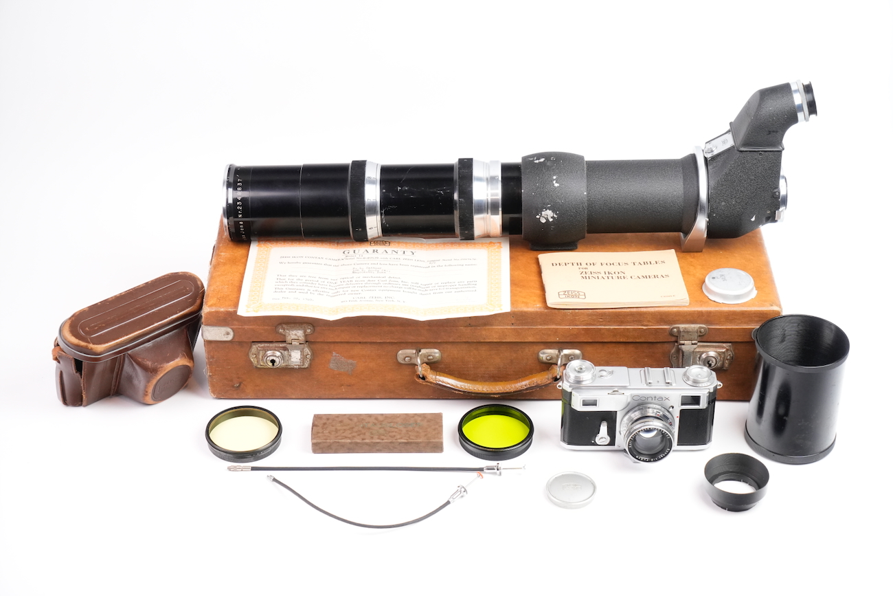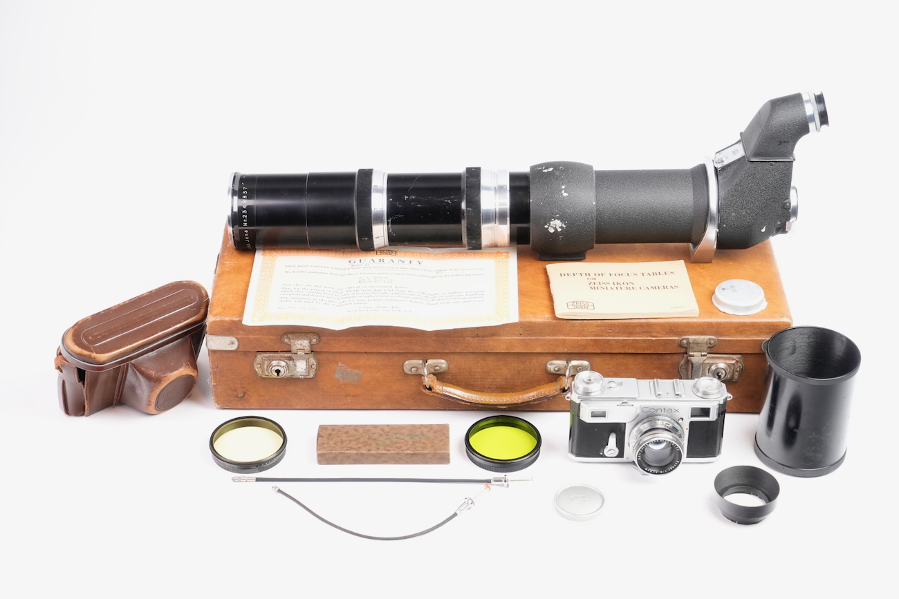 Ensemble composé d'un Contax Modèle II, d'un objectif Sonnar 50/2 et Fernobjectiv à visée réflex 500/8. Quelques accessoires sont fournis : pare-soleil, filtres, déclencheurs souples, étui d'appareil et valise pour le téléobjectif. Destiné à la photographie à très longue distance, il associe une focale inhabituelle pour l’époque à un dispositif de visée réflex intégrée, permettant un cadrage précis malgré un angle de champ extrêmement réduit. Par ses dimensions, sa complexité mécanique et optique, ainsi que sa diffusion très limitée, La documentation d'époque avec numéros de série est également inclue. On note la présence de quelques signes d'usure, malgré tout, l'ensemble est en bon état et présente une certaine rareté.