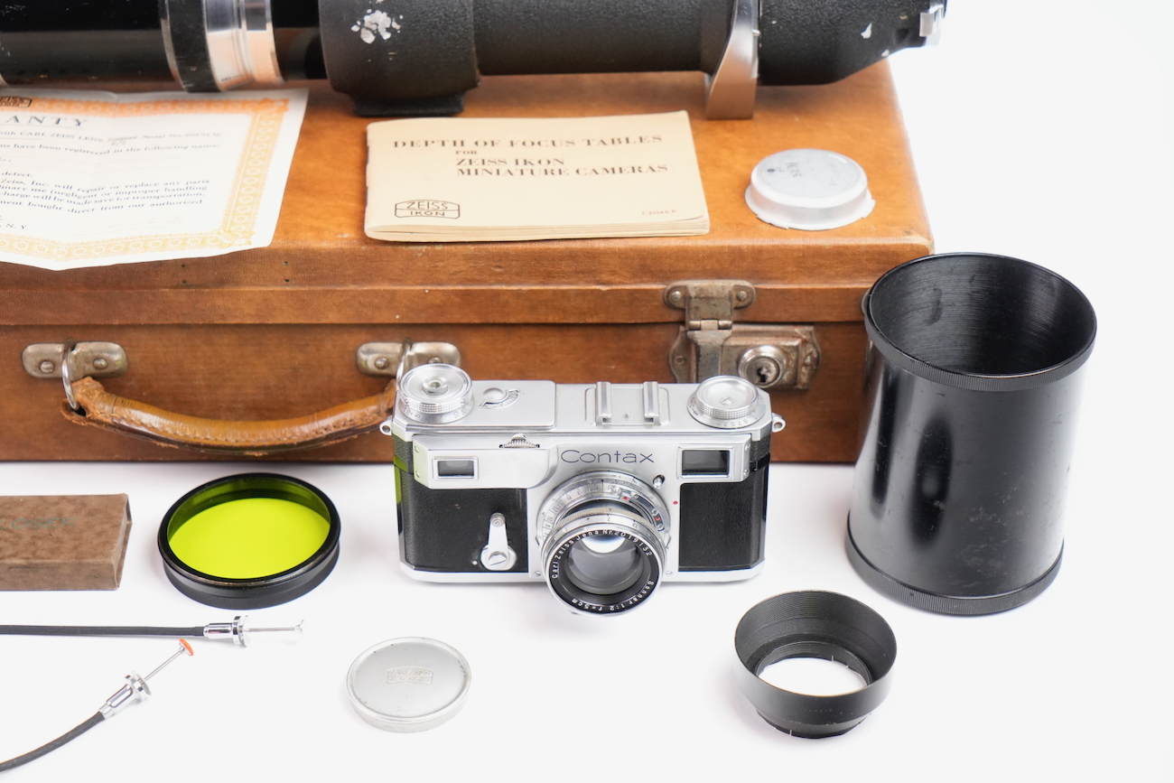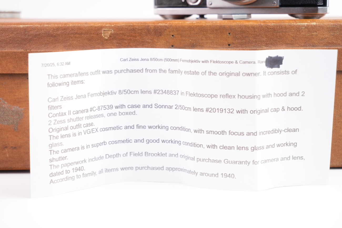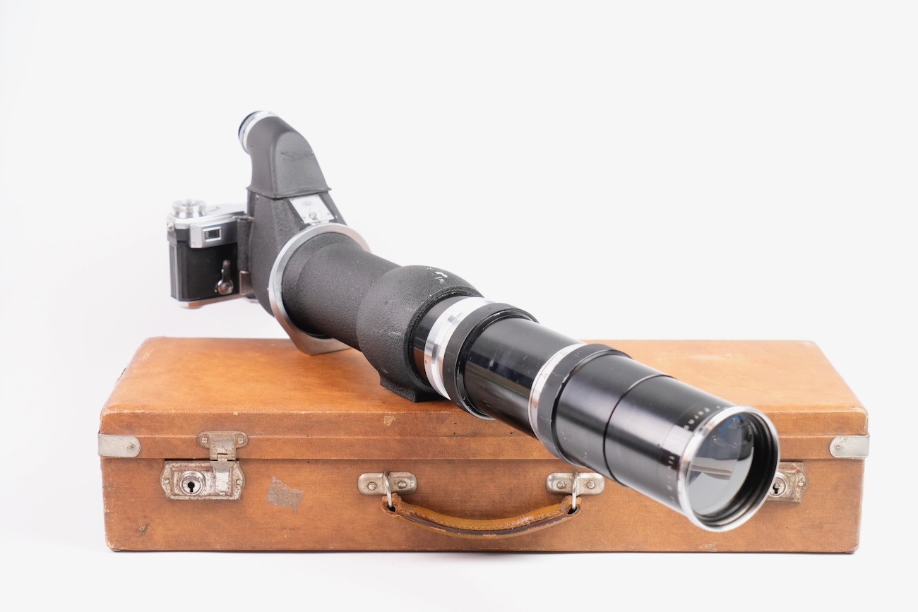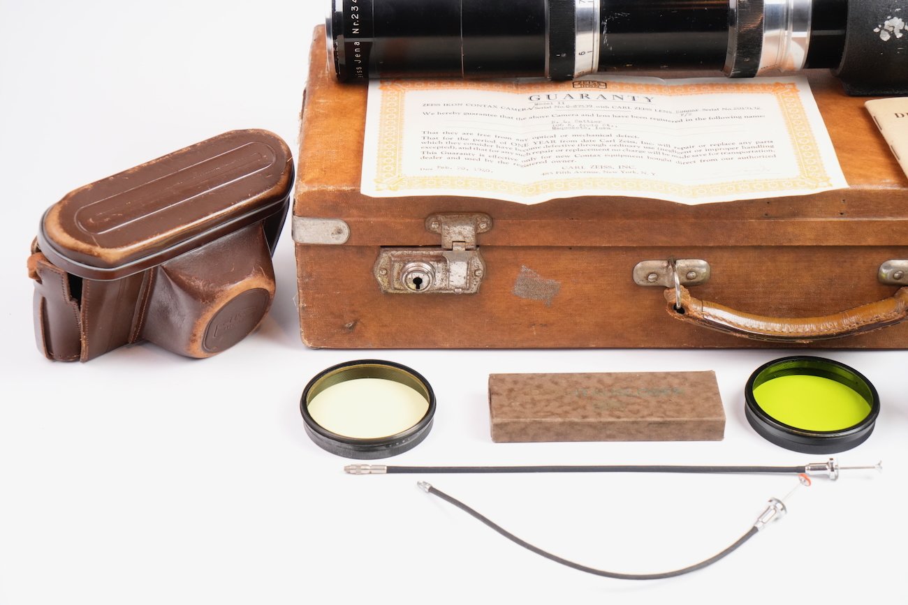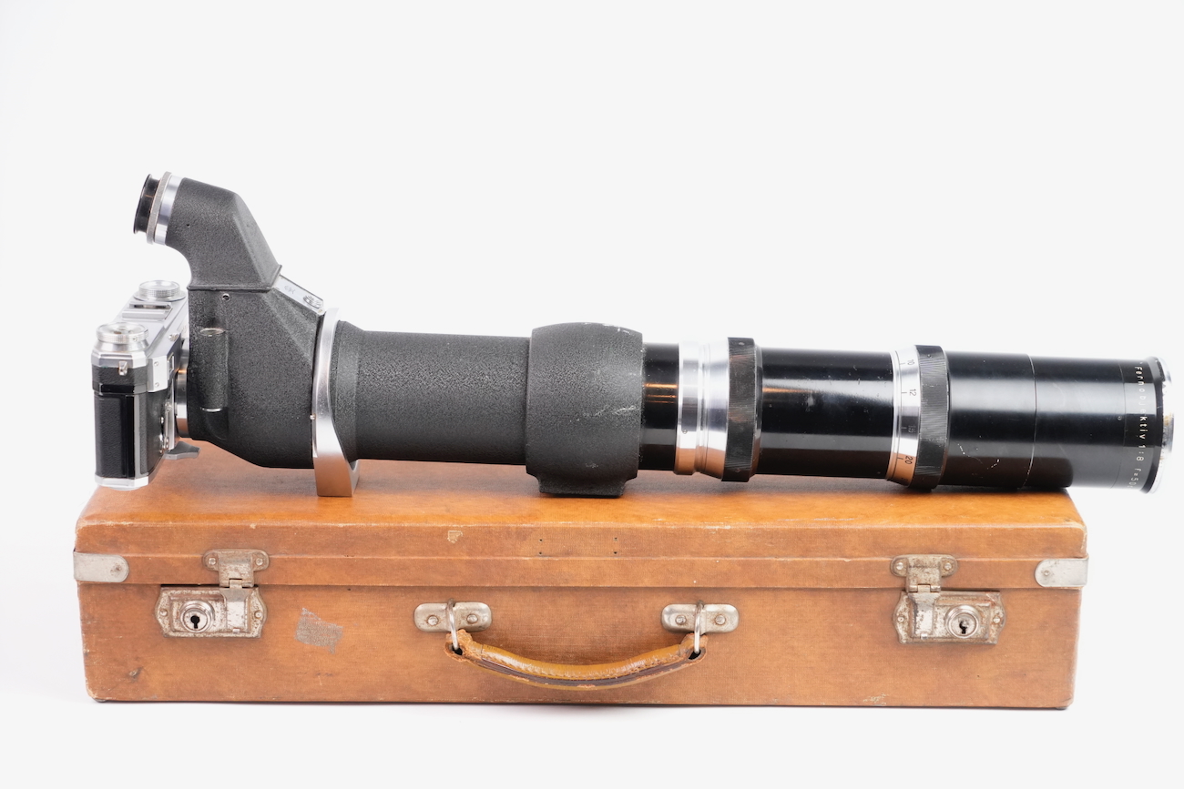 Ensemble composé d'un Contax Modèle II, d'un objectif Sonnar 50/2 et Fernobjectiv à visée réflex 500/8. Quelques accessoires sont fournis : pare-soleil, filtres, déclencheurs souples, étui d'appareil et valise pour le téléobjectif. Destiné à la photographie à très longue distance, il associe une focale inhabituelle pour l’époque à un dispositif de visée réflex intégrée, permettant un cadrage précis malgré un angle de champ extrêmement réduit. Par ses dimensions, sa complexité mécanique et optique, ainsi que sa diffusion très limitée, La documentation d'époque avec numéros de série est également inclue. On note la présence de quelques signes d'usure, malgré tout, l'ensemble est en bon état et présente une certaine rareté.