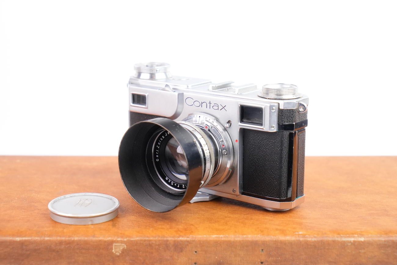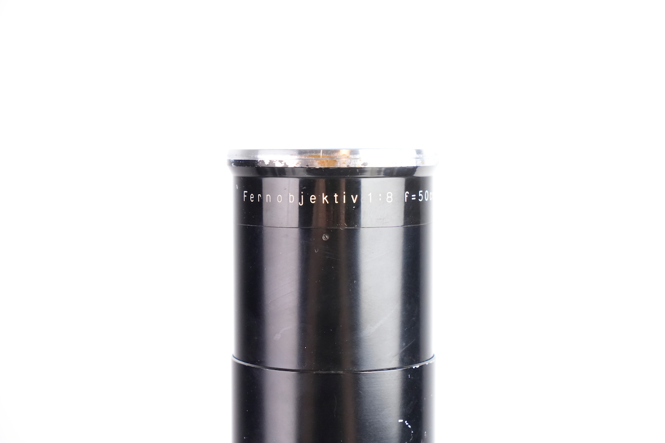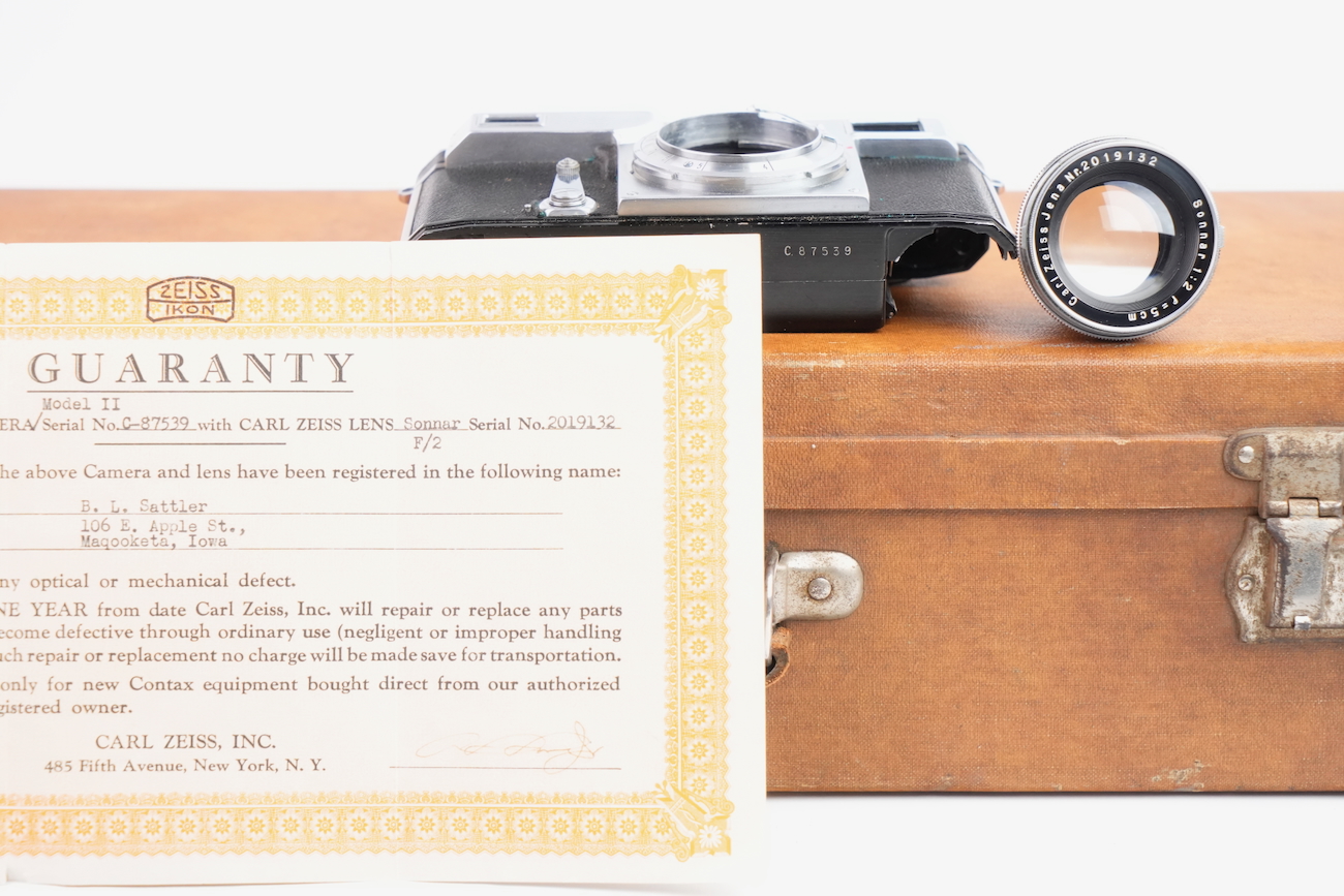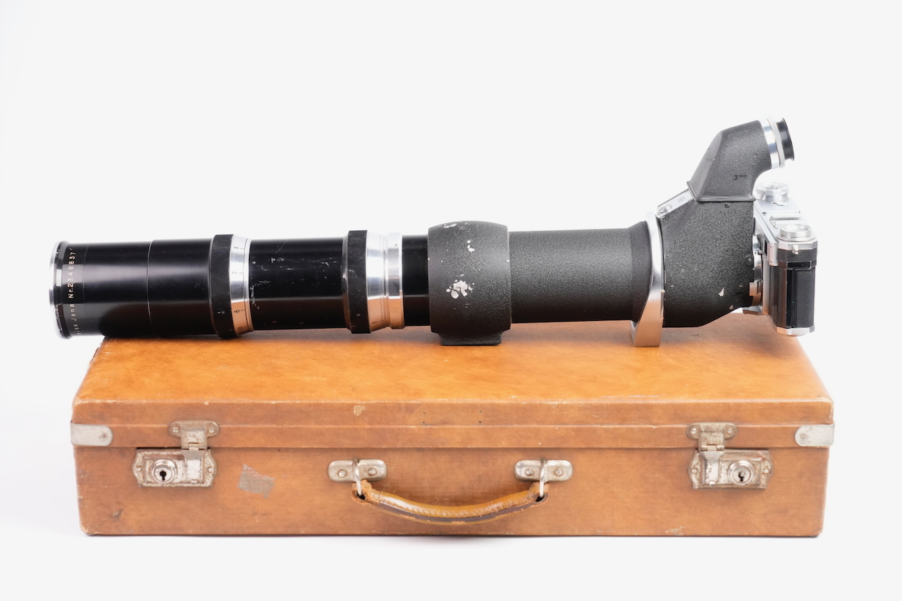 Ensemble composé d'un Contax Modèle II, d'un objectif Sonnar 50/2 et Fernobjectiv à visée réflex 500/8. Quelques accessoires sont fournis : pare-soleil, filtres, déclencheurs souples, étui d'appareil et valise pour le téléobjectif. Destiné à la photographie à très longue distance, il associe une focale inhabituelle pour l’époque à un dispositif de visée réflex intégrée, permettant un cadrage précis malgré un angle de champ extrêmement réduit. Par ses dimensions, sa complexité mécanique et optique, ainsi que sa diffusion très limitée, La documentation d'époque avec numéros de série est également inclue. On note la présence de quelques signes d'usure, malgré tout, l'ensemble est en bon état et présente une certaine rareté.