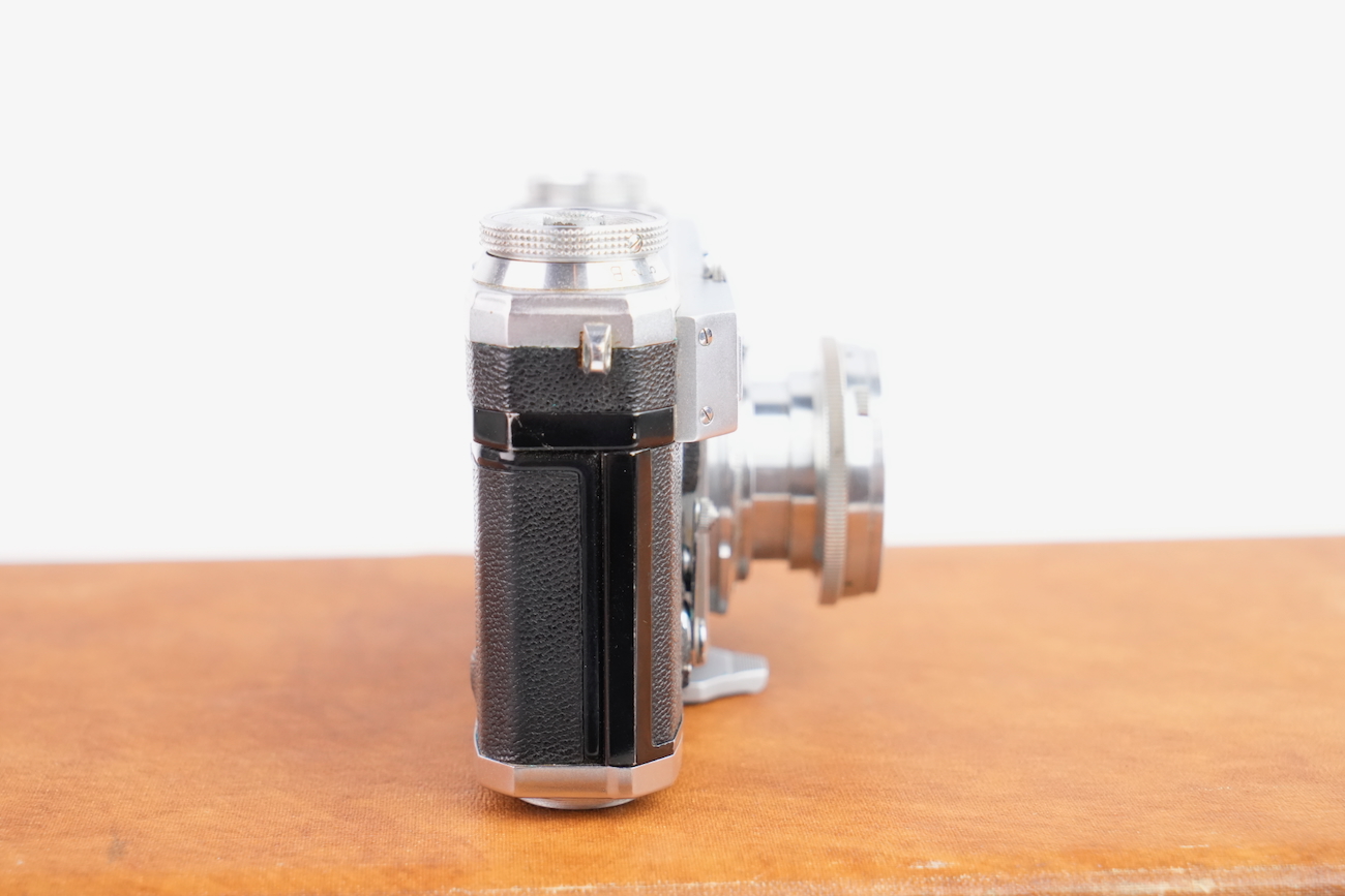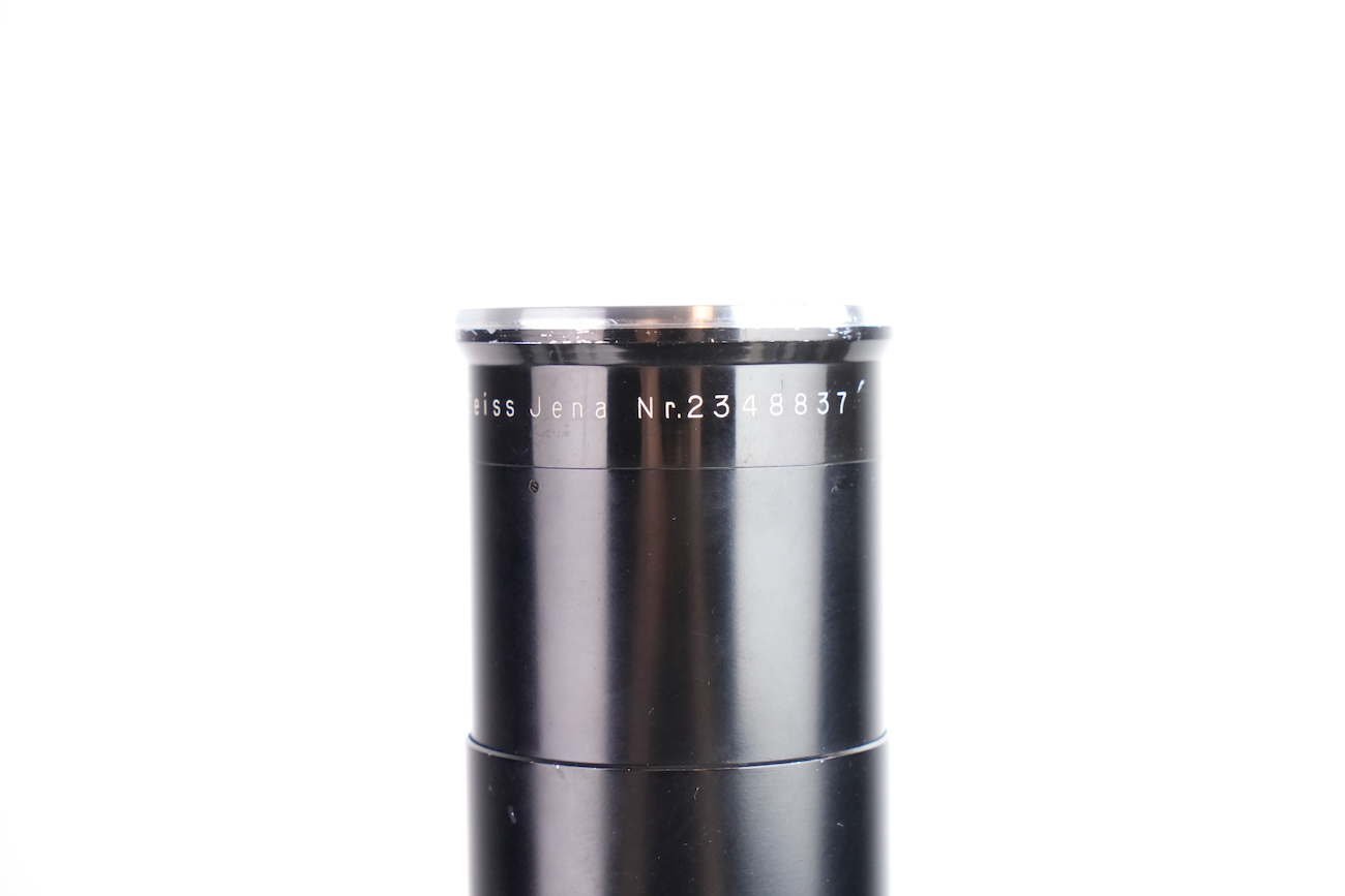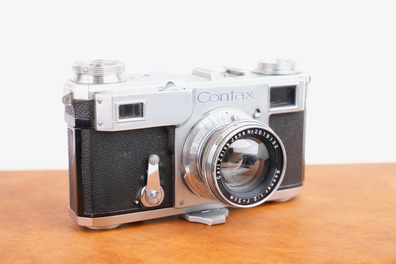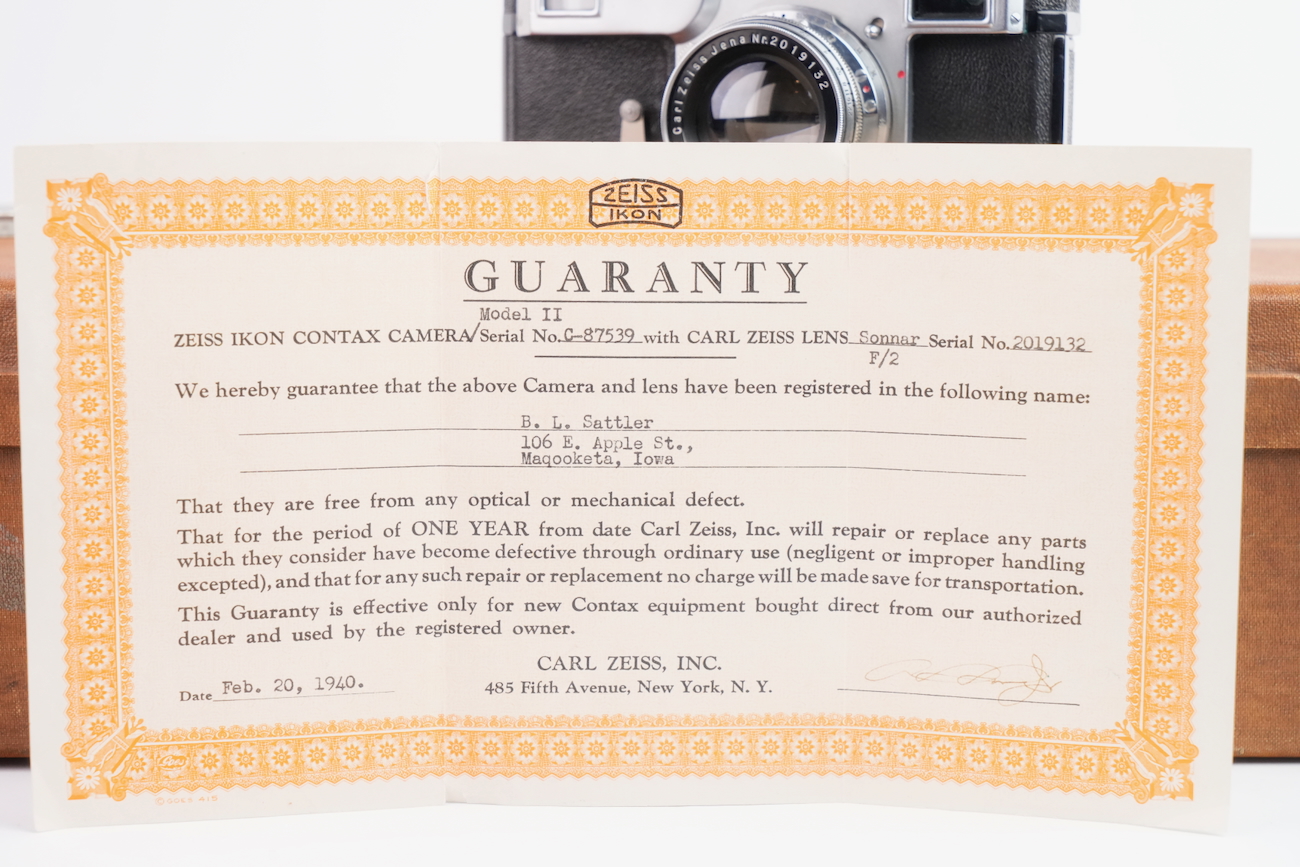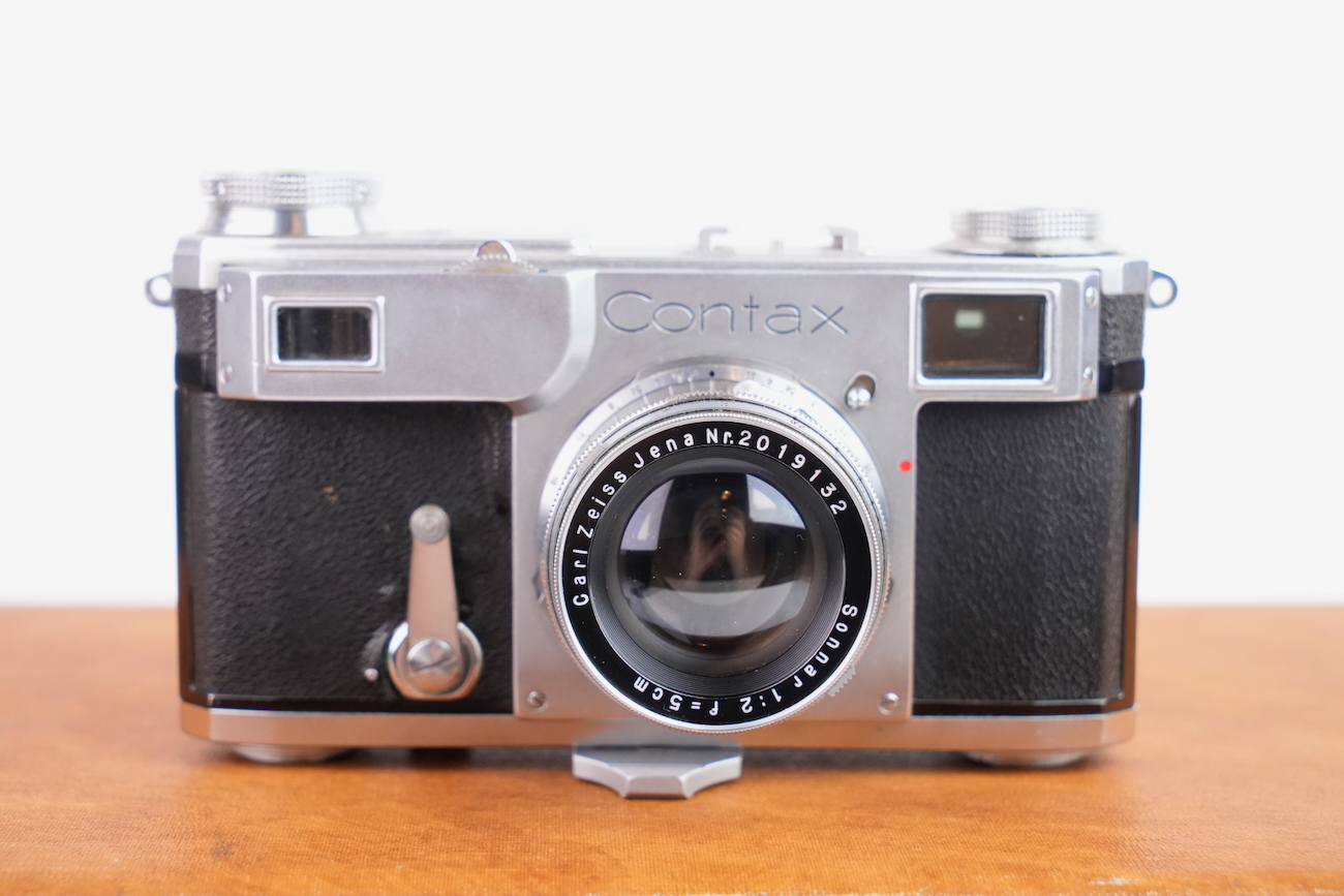 Ensemble composé d'un Contax Modèle II, d'un objectif Sonnar 50/2 et Fernobjectiv à visée réflex 500/8. Quelques accessoires sont fournis : pare-soleil, filtres, déclencheurs souples, étui d'appareil et valise pour le téléobjectif. Destiné à la photographie à très longue distance, il associe une focale inhabituelle pour l’époque à un dispositif de visée réflex intégrée, permettant un cadrage précis malgré un angle de champ extrêmement réduit. Par ses dimensions, sa complexité mécanique et optique, ainsi que sa diffusion très limitée, La documentation d'époque avec numéros de série est également inclue. On note la présence de quelques signes d'usure, malgré tout, l'ensemble est en bon état et présente une certaine rareté.