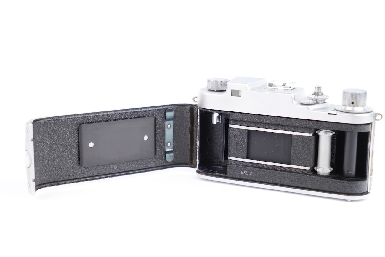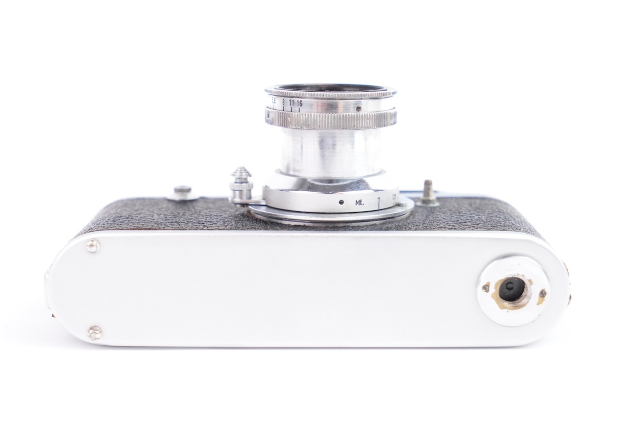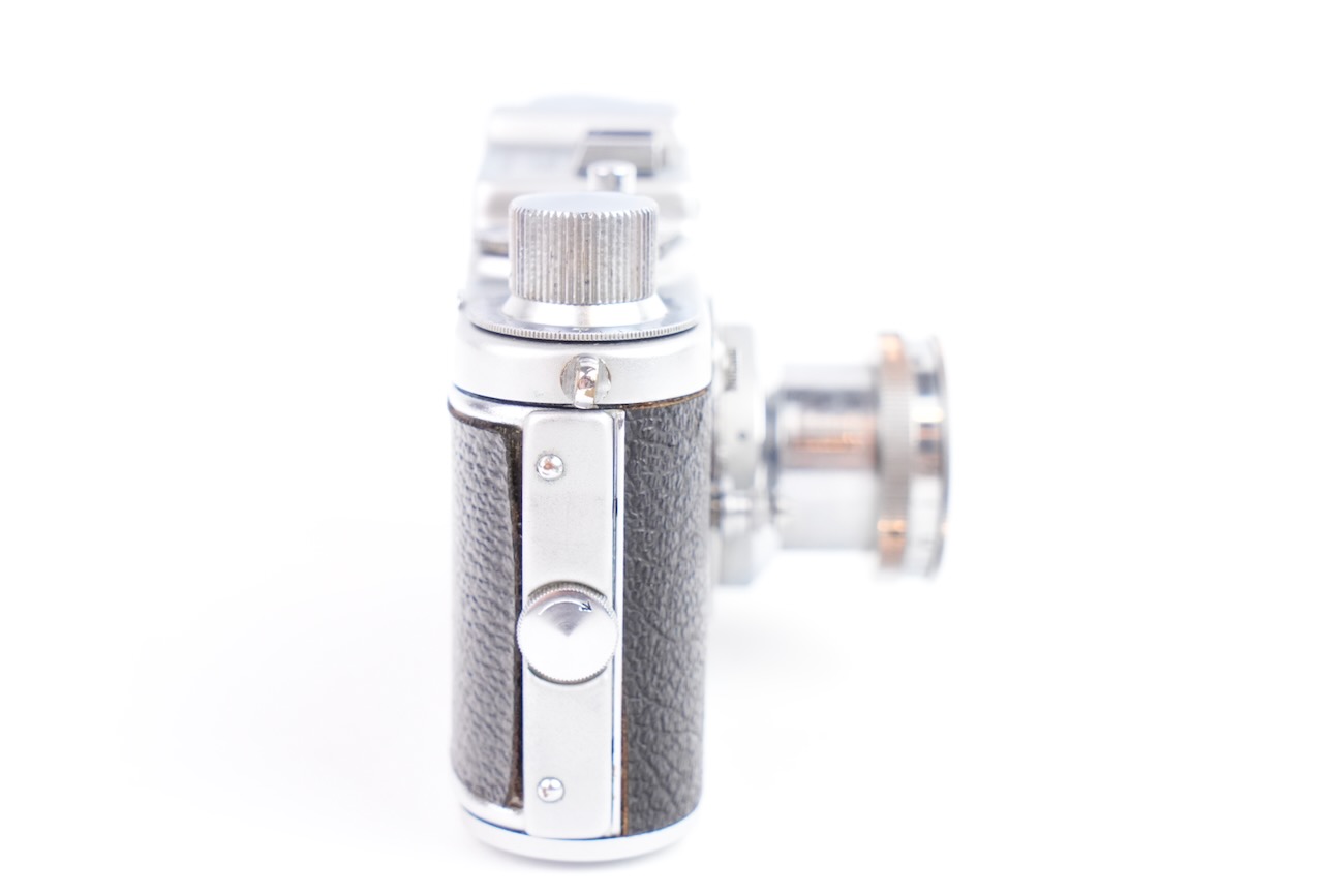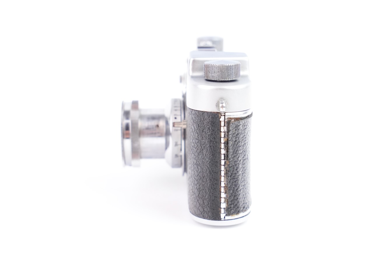 Le Gatto A.G. Sonne C4 est un appareil photo télémétrique produit en Italie vers 1947-53 et de conception soignée. Équipé d’un objectif Elionar Anastigmat 50 mm f/3.5 en bon état. Sans rayures, sans décollement et sans brume. Ce modèle rare possède des rideaux en bon état avec un obturateur opérationnel et un télémètre, modérément contrasté. Les vitesses sont à revoir.