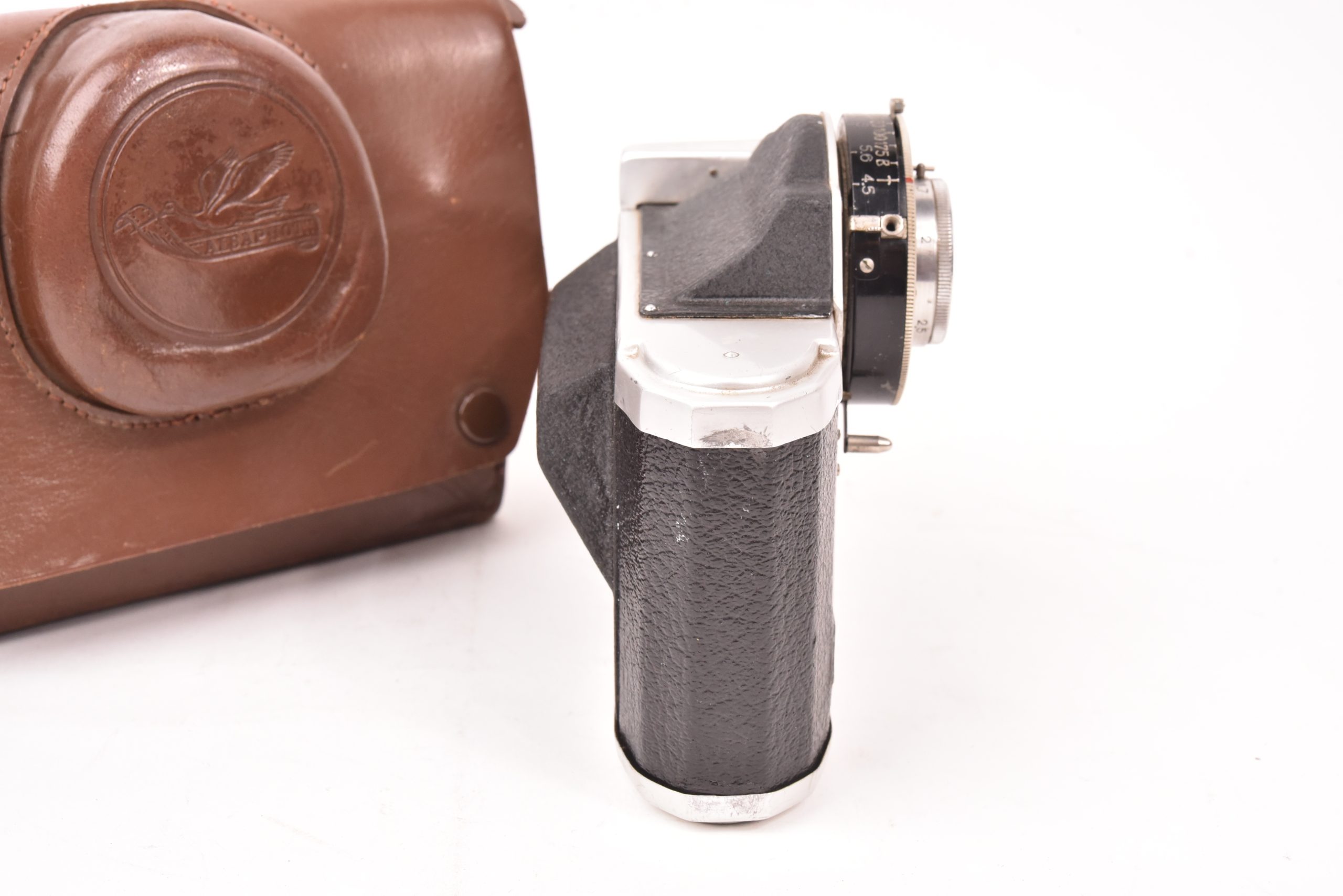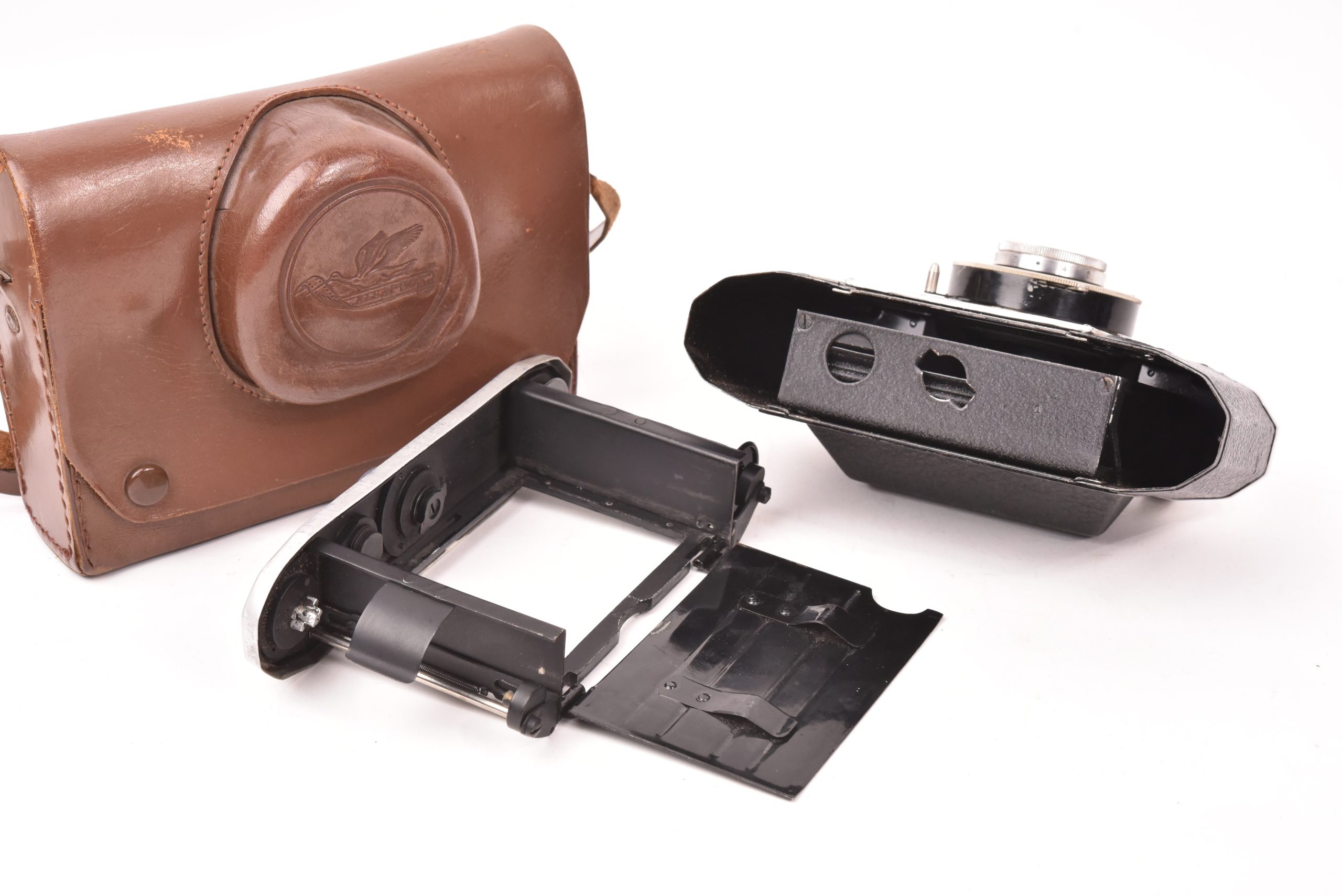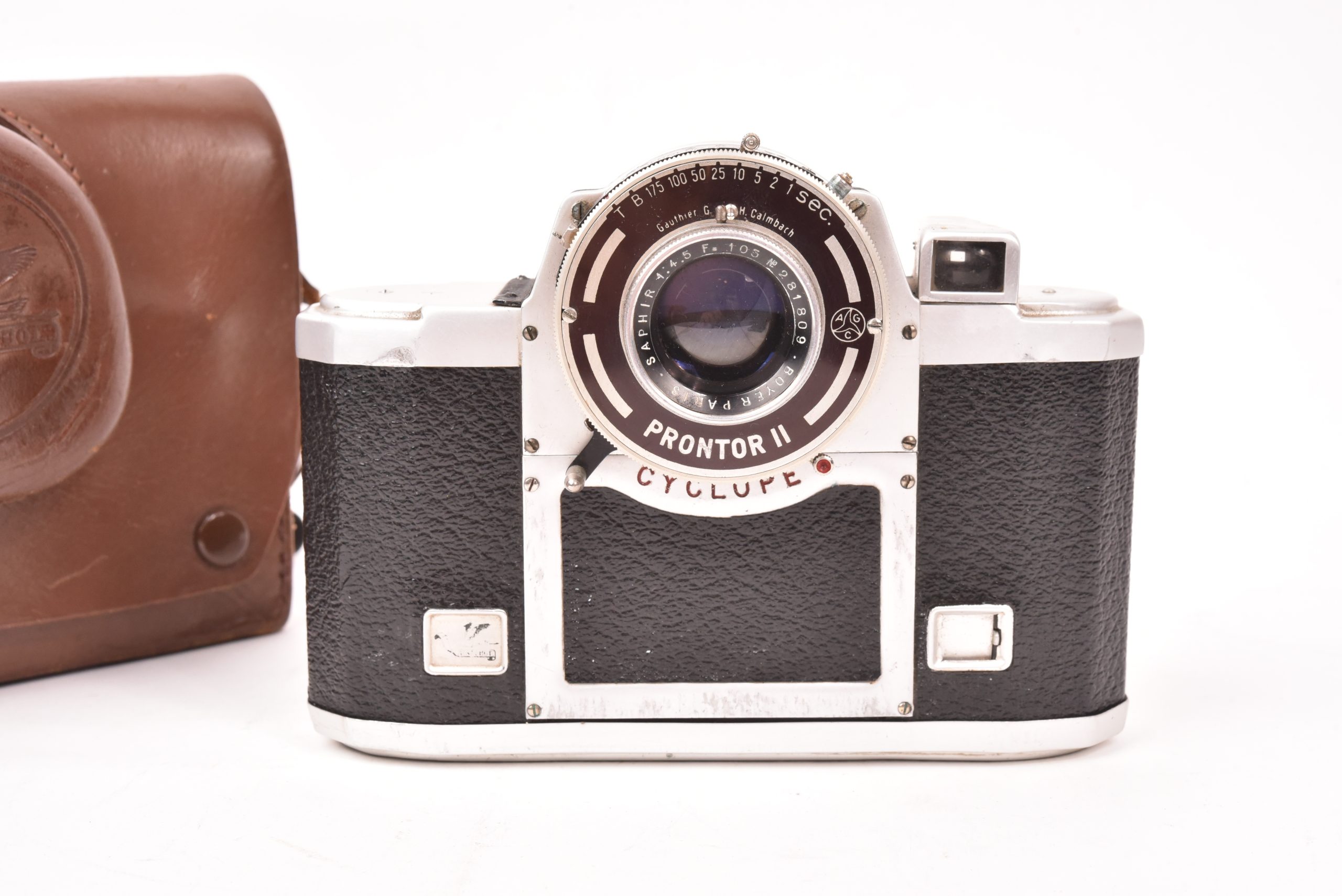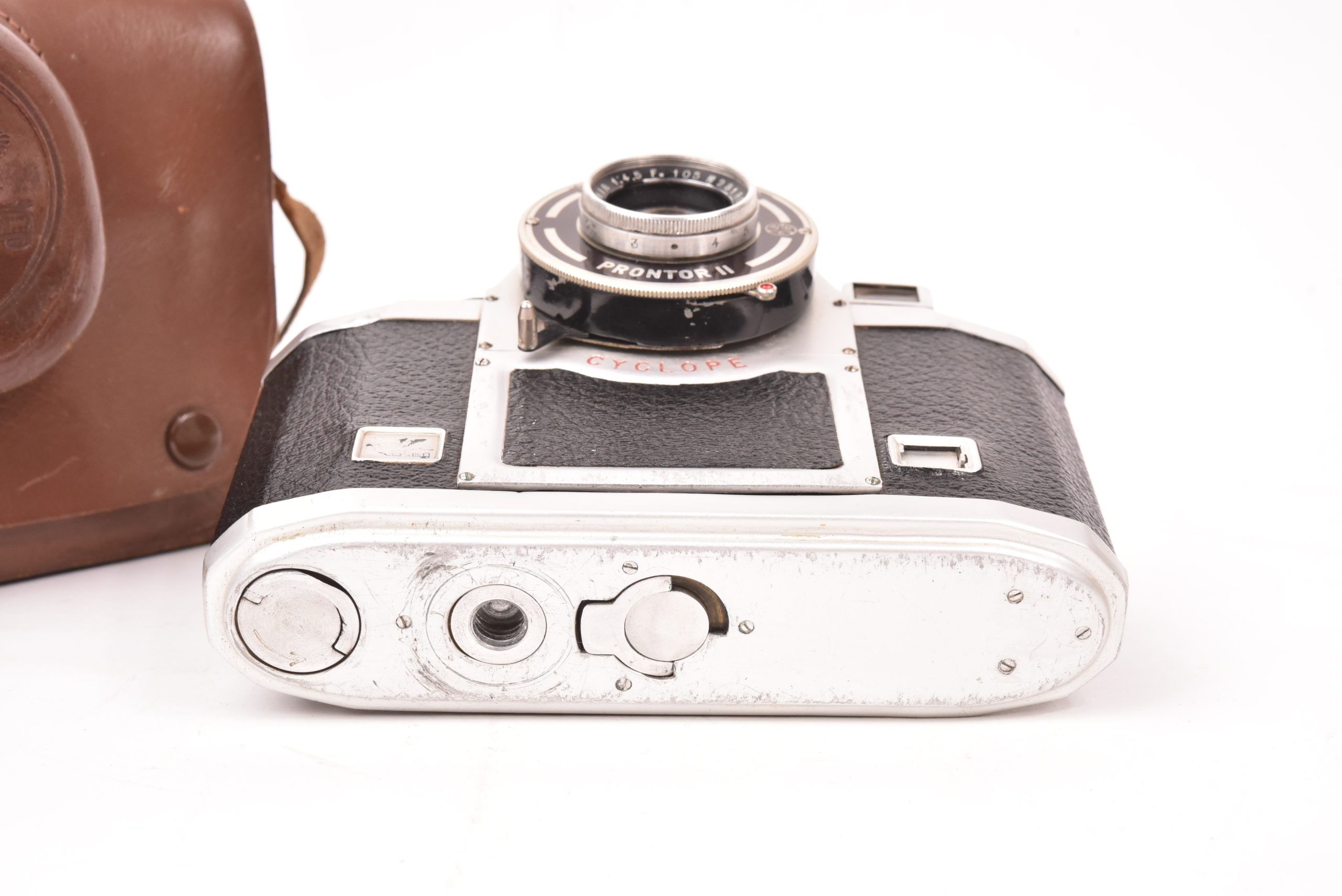 In 1949 Lucien Dodin designed the Cyclope camera. Manufactured by Alsaphot, it appeared on the market in 1951. 6x9 format, rigid body camera. Although it is thin, its focal length is 105 mm. This is due to the fact that the light travels in the chamber after being reflected by two 90° mirrors. The lens/shutter unit is placed in front on the top of the camera, lending it this unusual appearance. Saphir Boyer 1:4,5 F=105 mm lens, mounted on a Prontor II shutter. Camera in good condition, in its original " Alsaphot " case. No fungus, no haze, no separation, no scratches.