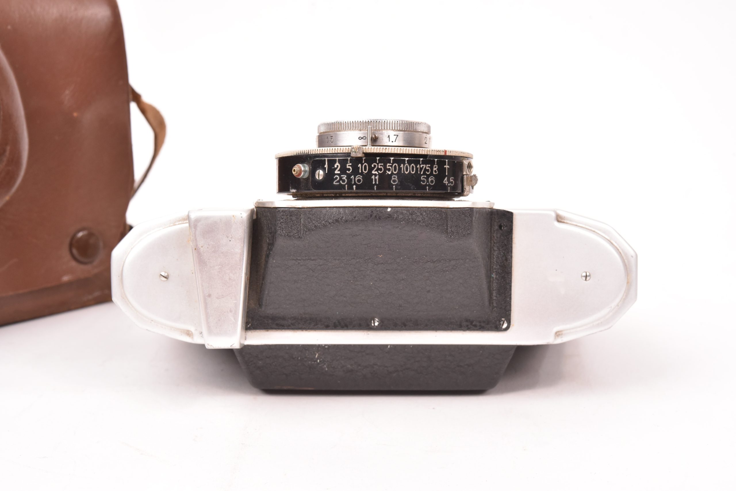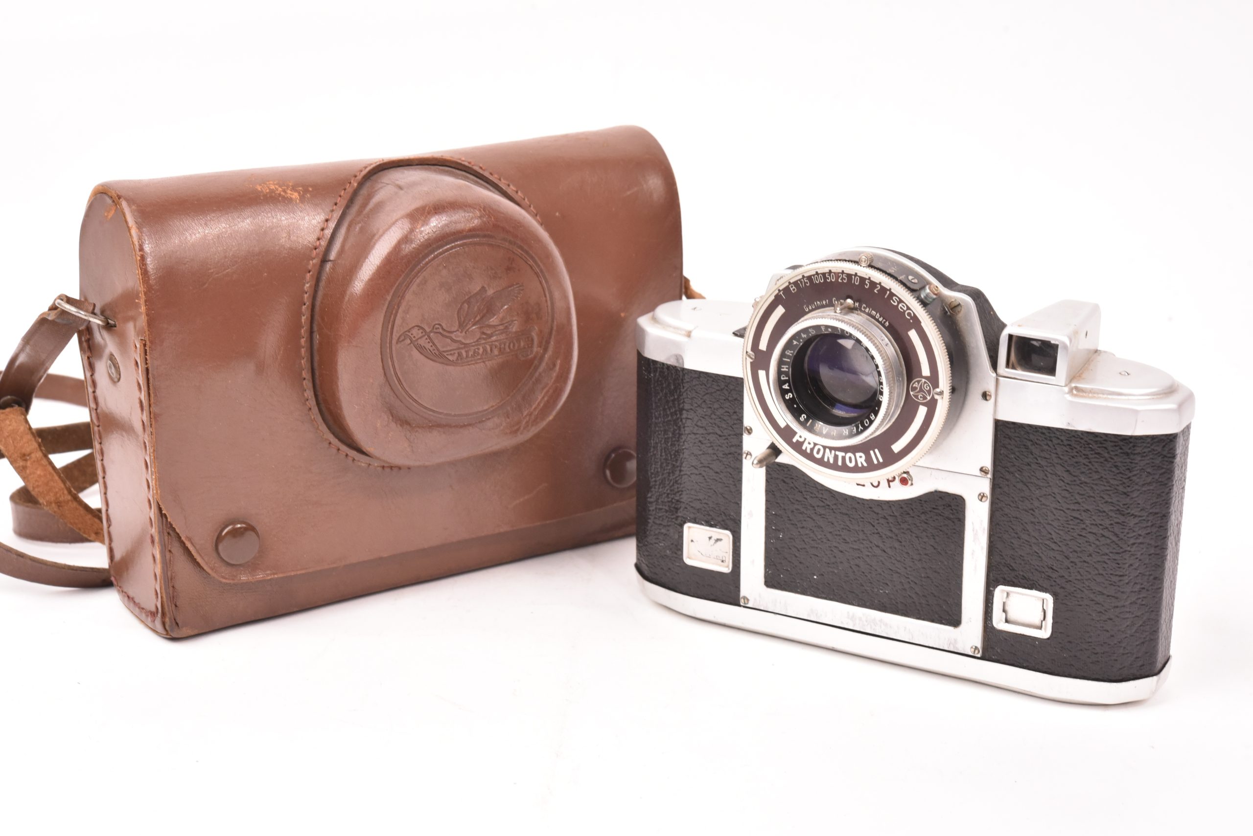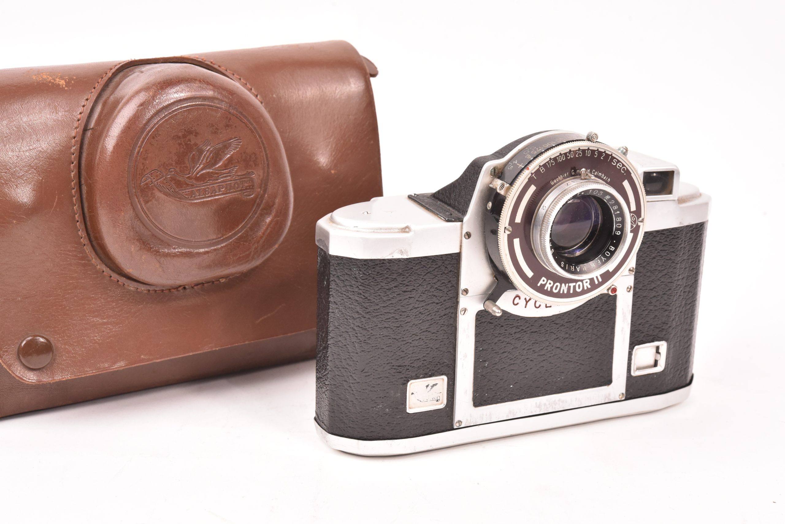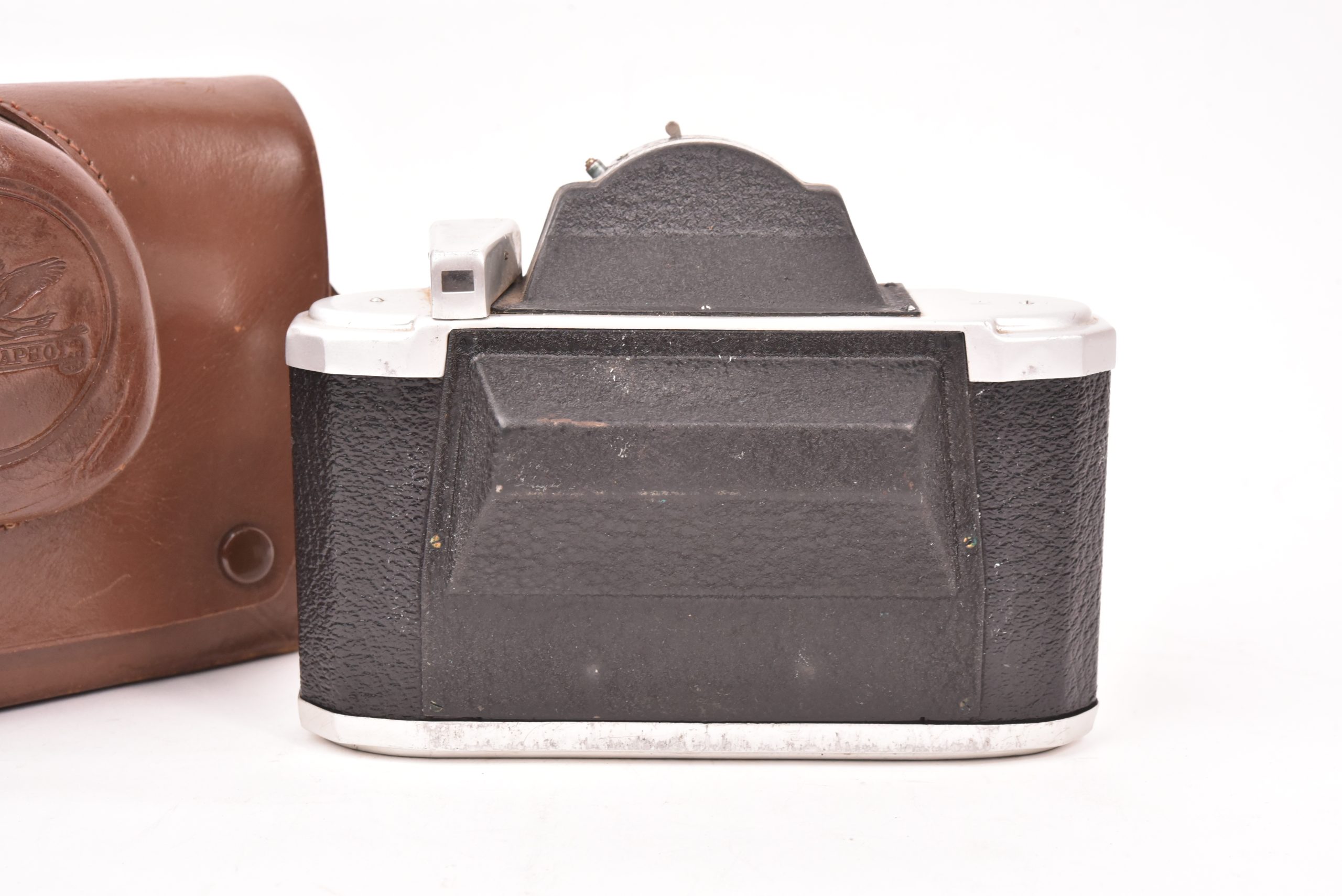 In 1949 Lucien Dodin designed the Cyclope camera. Manufactured by Alsaphot, it appeared on the market in 1951. 6x9 format, rigid body camera. Although it is thin, its focal length is 105 mm. This is due to the fact that the light travels in the chamber after being reflected by two 90° mirrors. The lens/shutter unit is placed in front on the top of the camera, lending it this unusual appearance. Saphir Boyer 1:4,5 F=105 mm lens, mounted on a Prontor II shutter. Camera in good condition, in its original " Alsaphot " case. No fungus, no haze, no separation, no scratches.