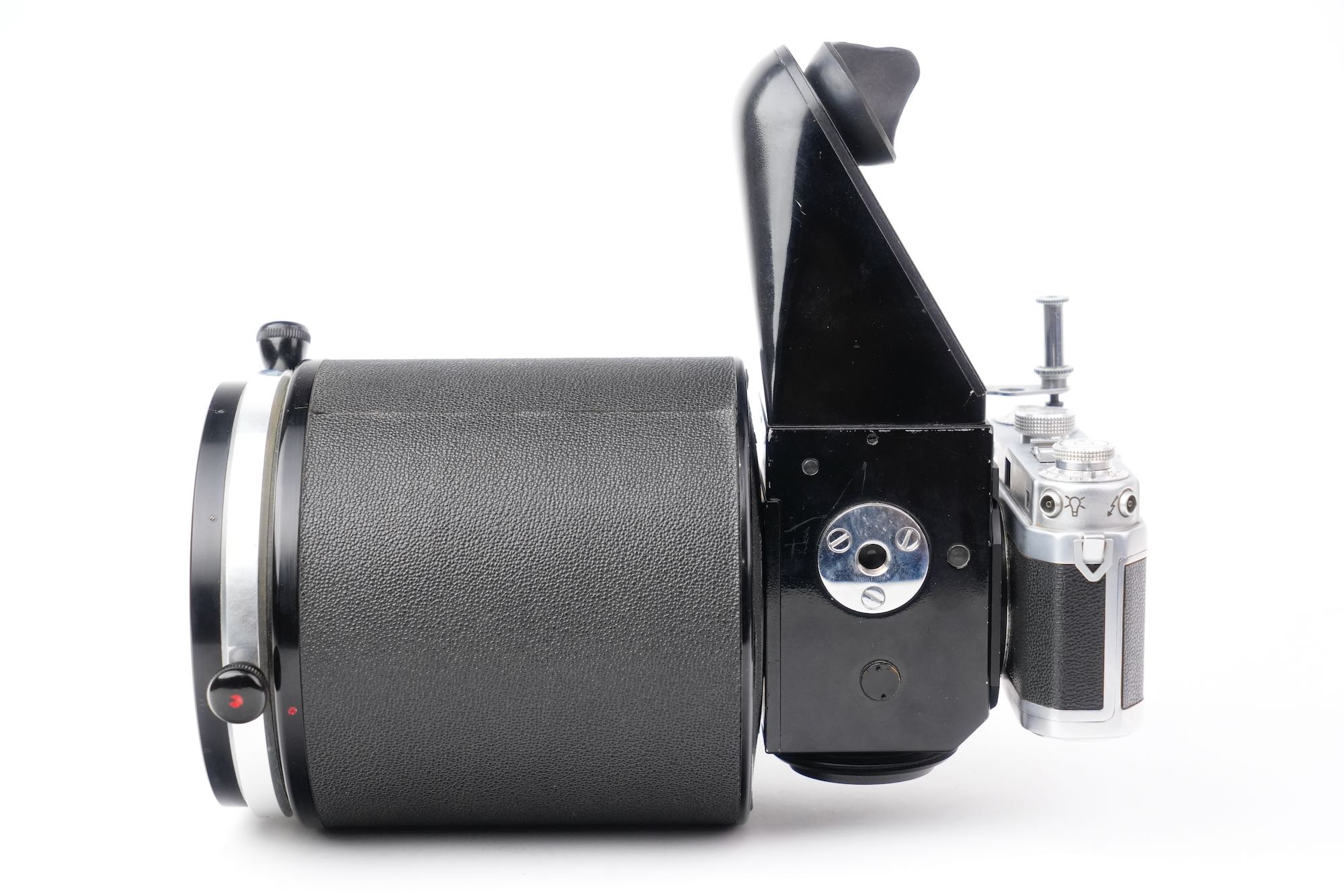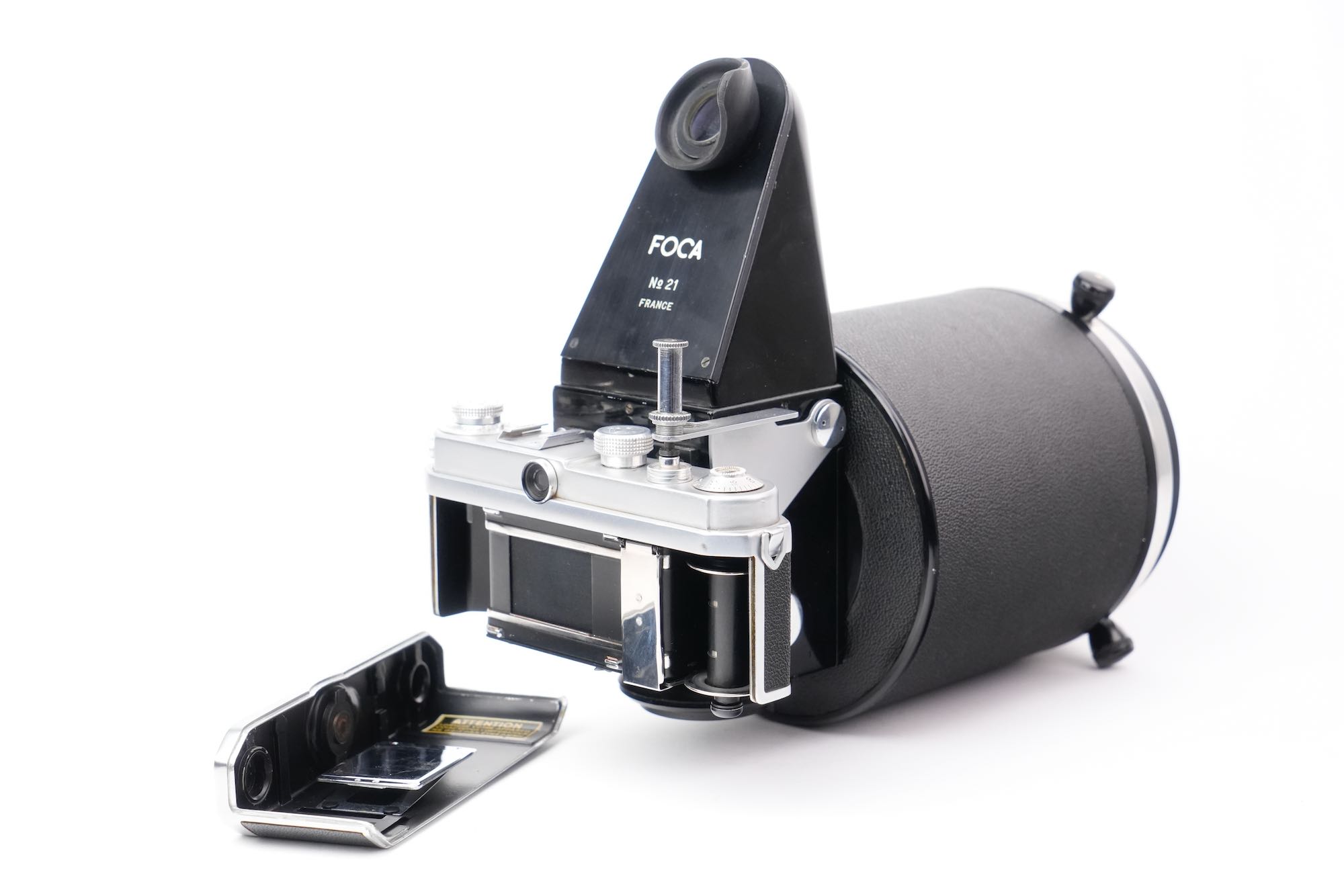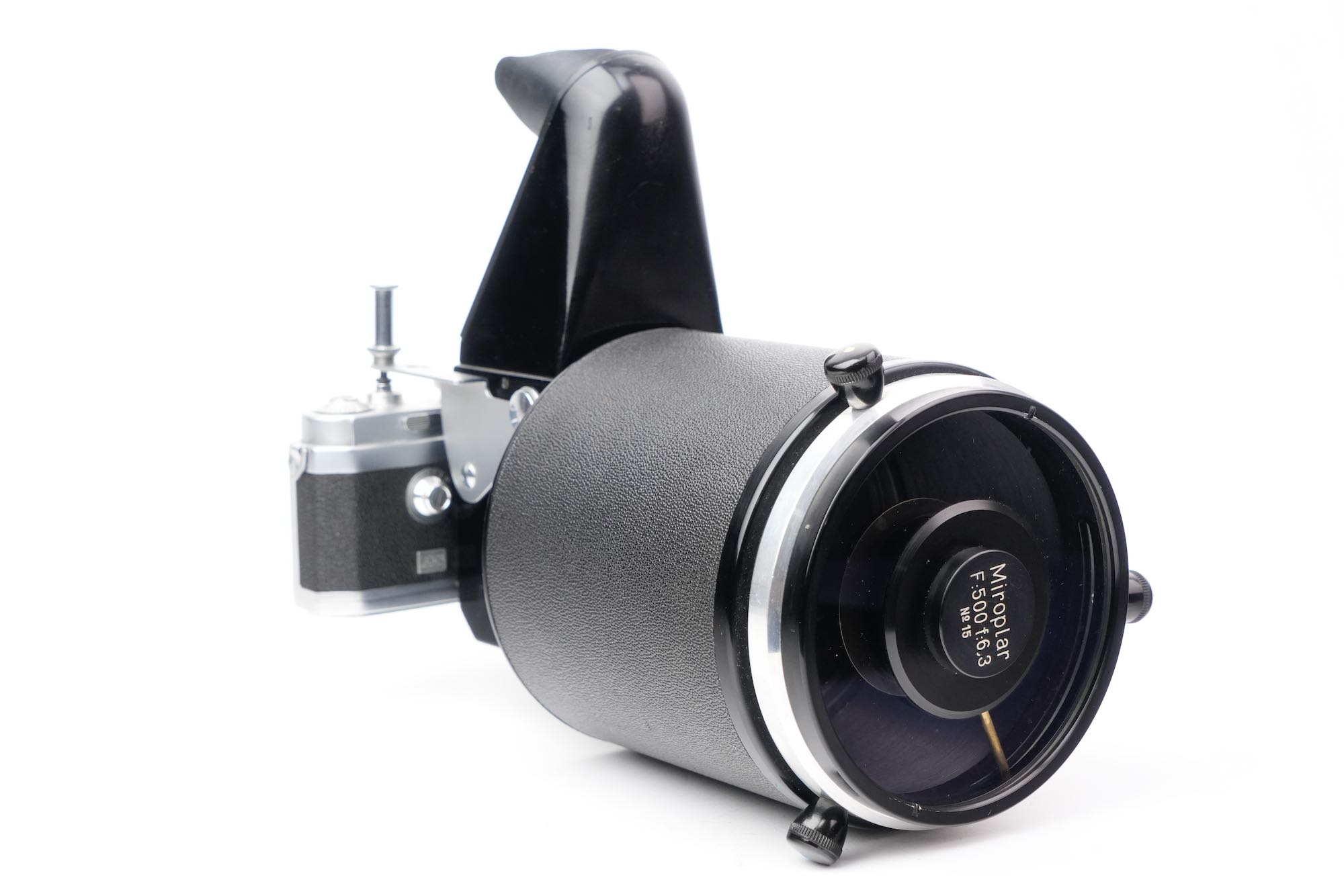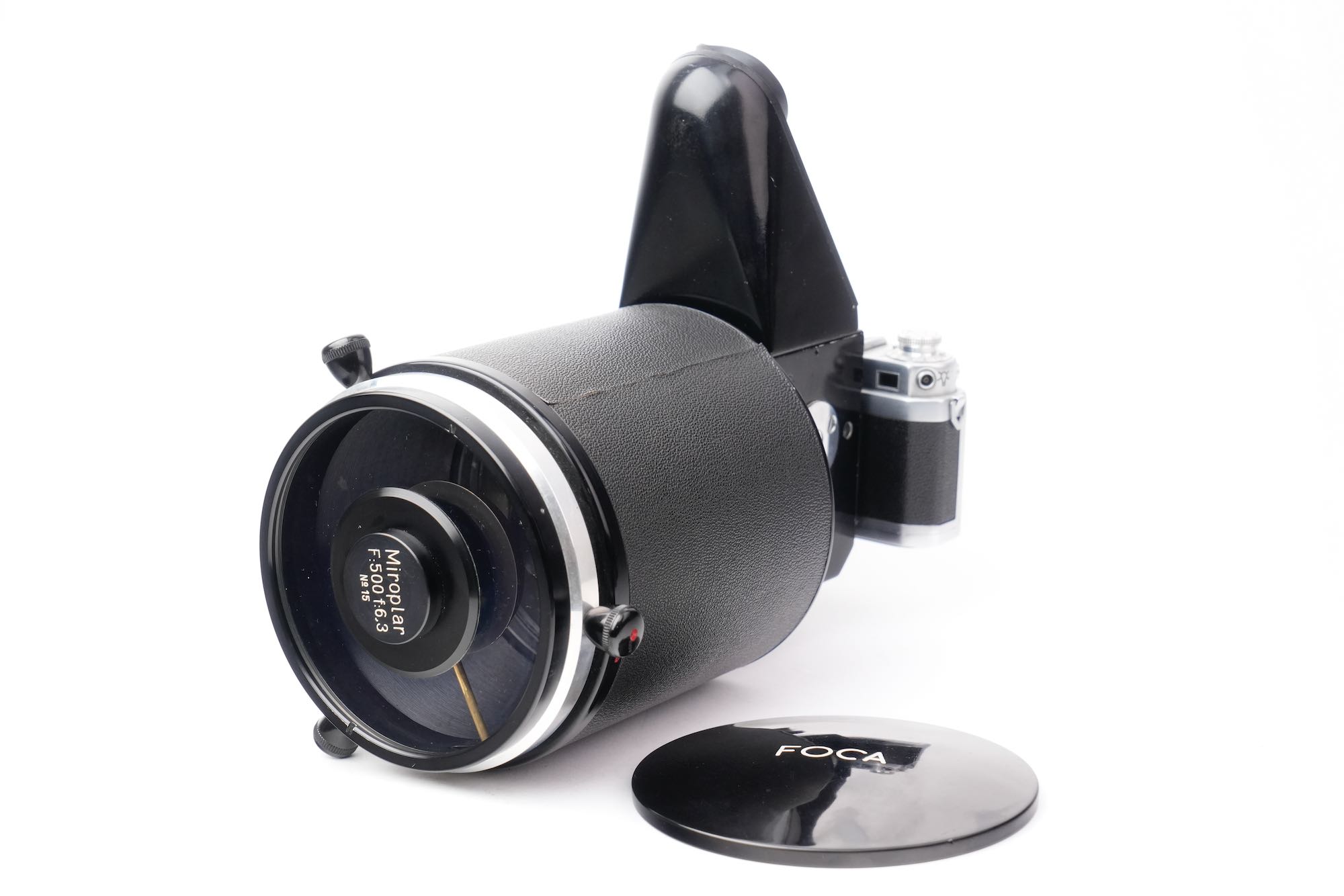 <div class="available-middle-text">Imposant objectif catadioptrique du fabricant français OPL avec sa chambre réflex coudée "Microfoca" semi automatique N°21 et son Foca Universel N°201.142. Notre objectif Miroplar porte le numéro 15, il appartient à la deuxième génération avec son boucon laqué noir et son revêtement en Skaï. Optiquement, cet exemplaire n'est pas irréprochable. On note la présence de brume et de champignons, notamment en périphérie des miroirs. La mise au point est fluide et la chambre reflex Microfoca est opérante. Dans son livre de référence sur le sujet, Jean Loup Princelle (Foca Historica, Cyclope, 1997, pp. 138-141) nous précise que seuls 50 exemplaires furent produits et environ 25 assemblés ! Un objectif rare.</div>