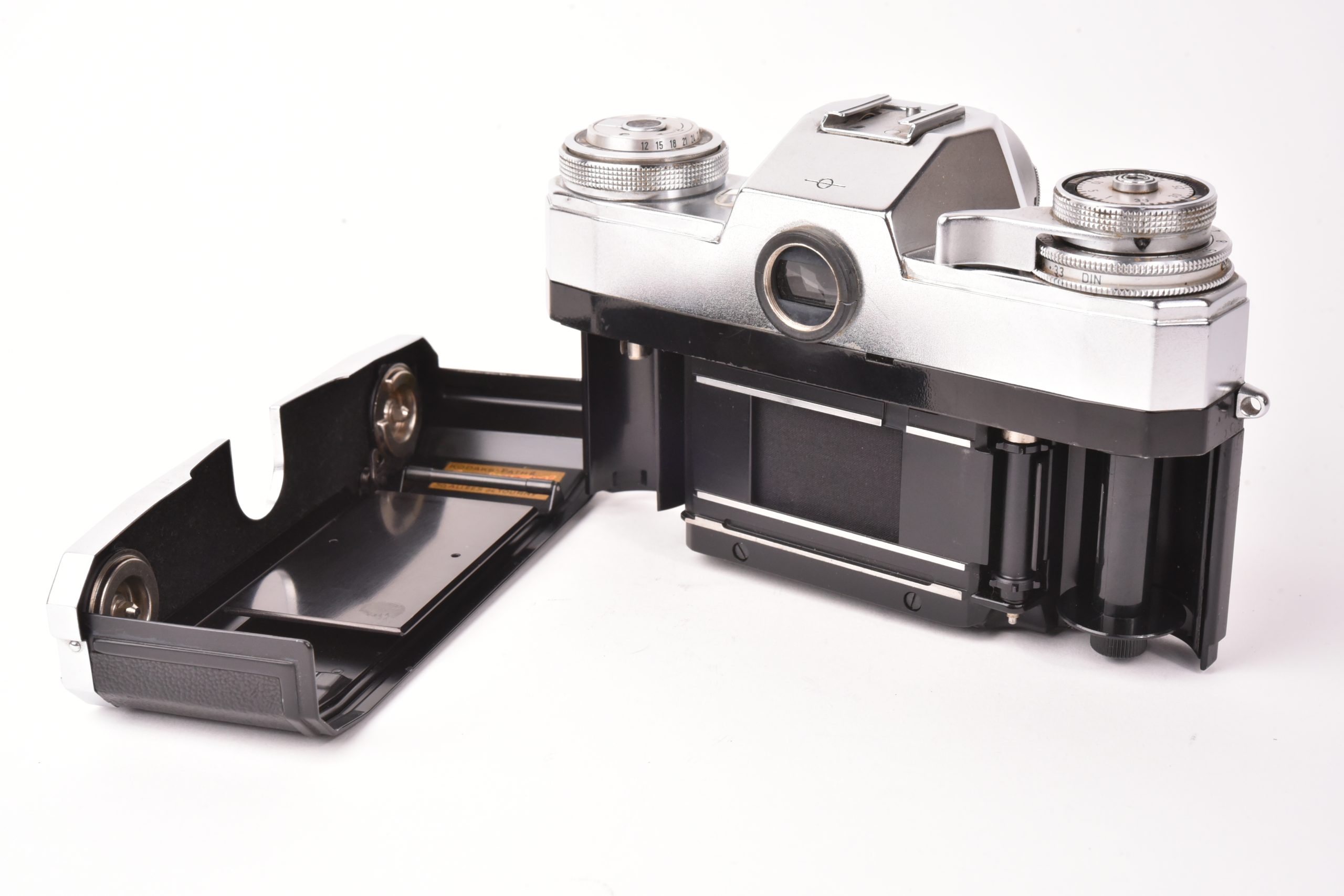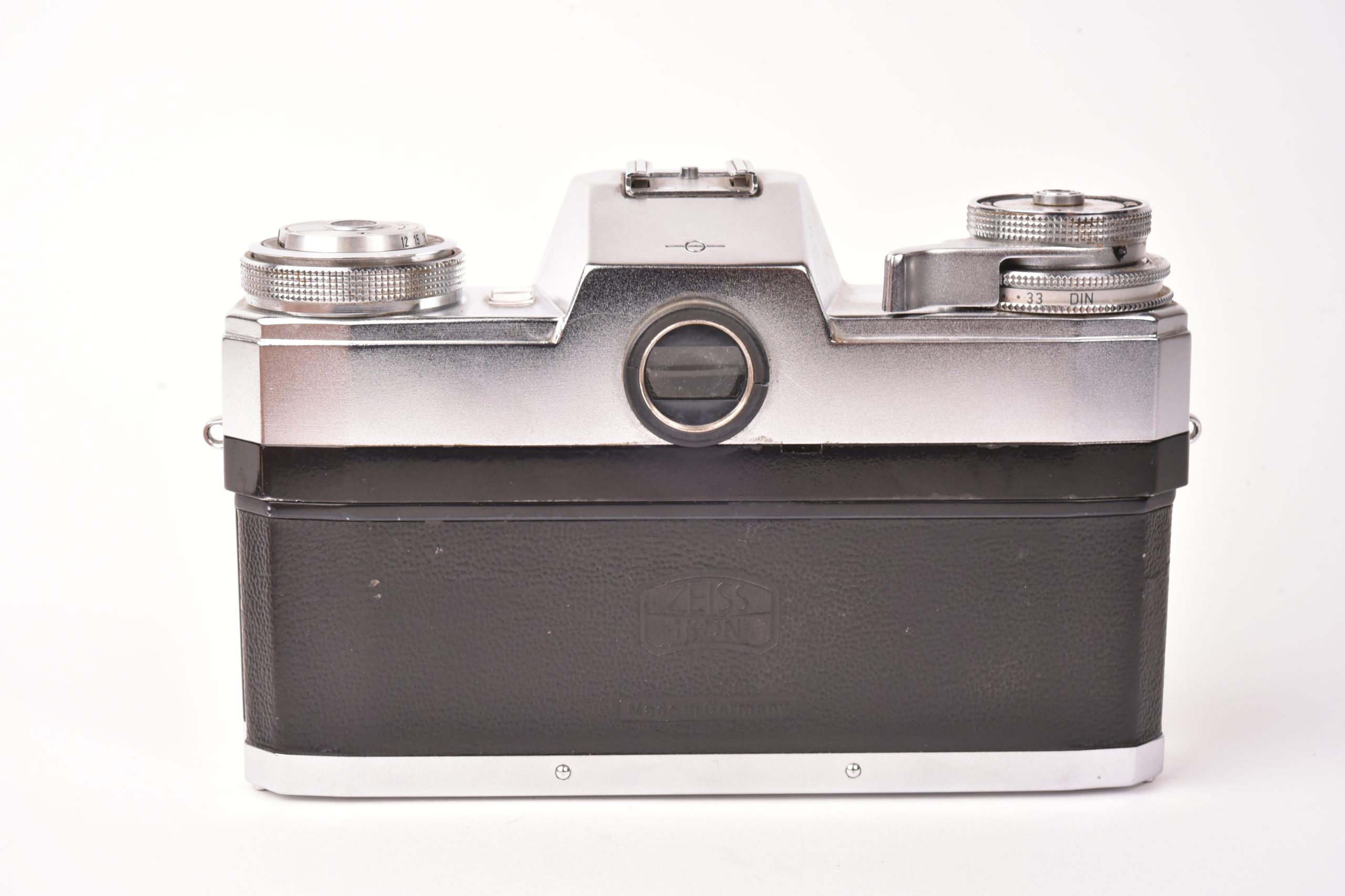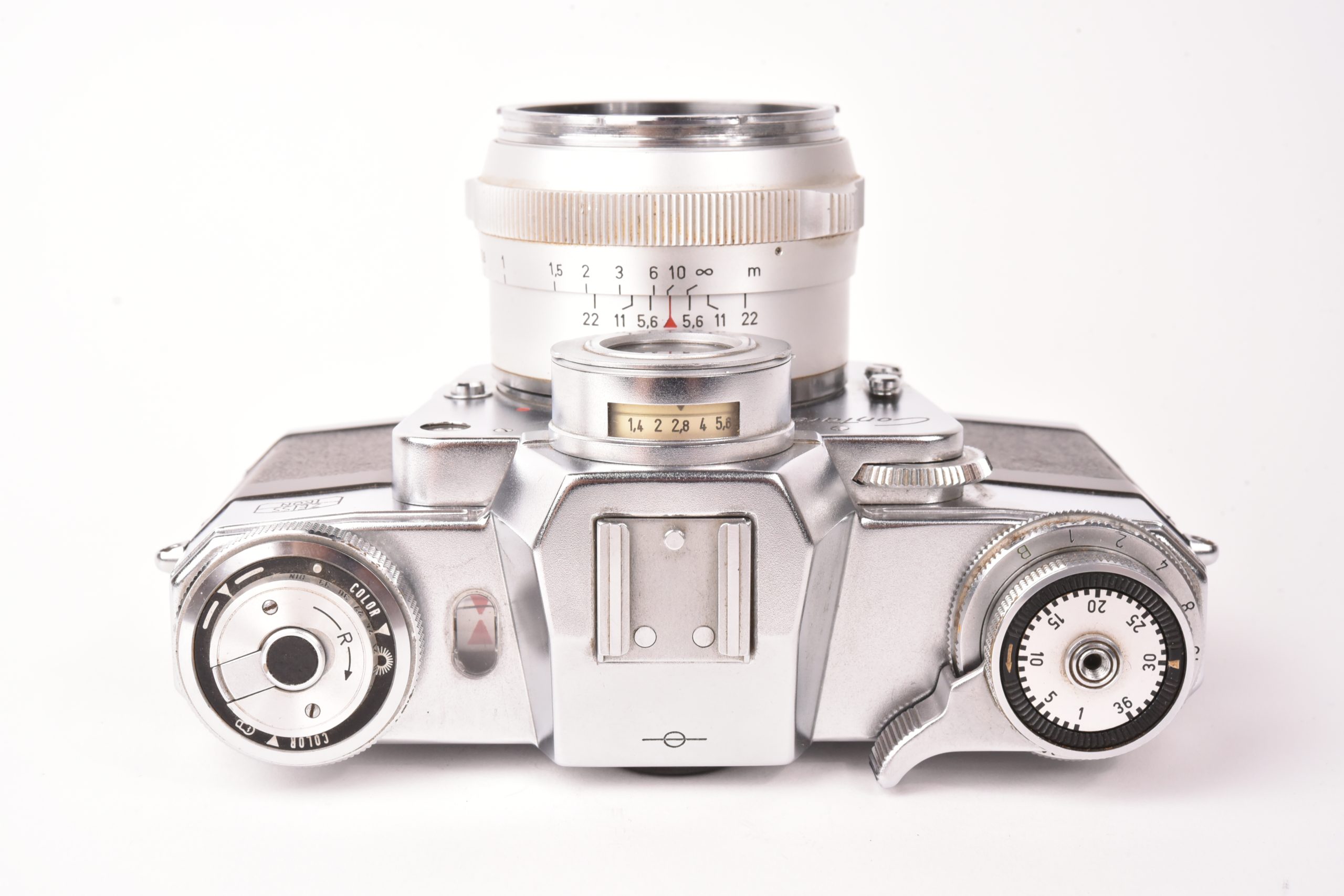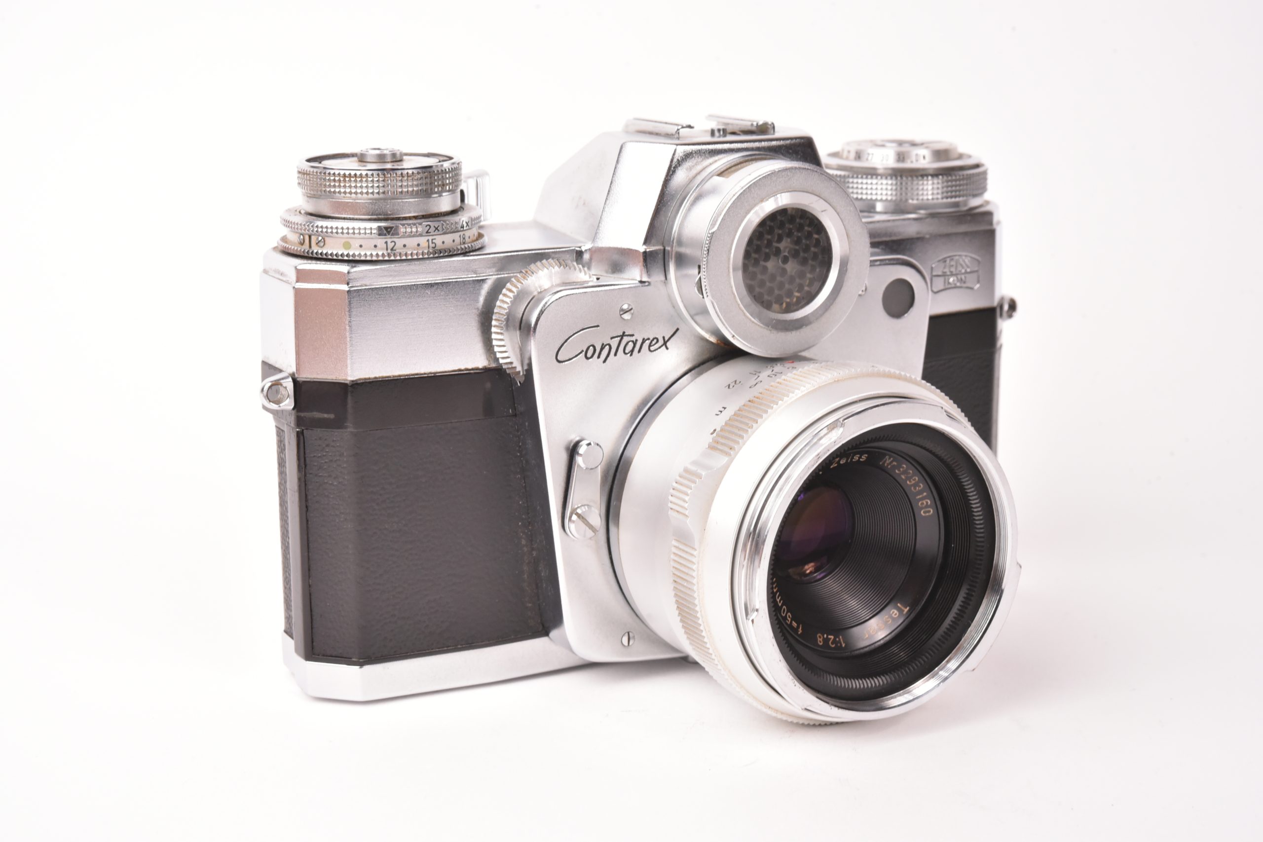 Le Contarex de Zeiss est un appareil 35mm de qualité qui a connu plusieurs itérations. La présente version comporte le fameux posemètre circulaire qui siège au dessus de l'objectif et lui vaut le surnom "Bull's eye". Fabrication allemande entre 1959 et 1964. L'optique fournie est un Tessar 50mm f/2.8. Bel état. Fonctionne correctement.