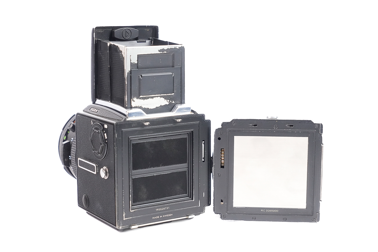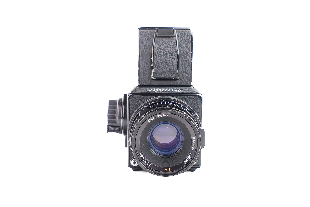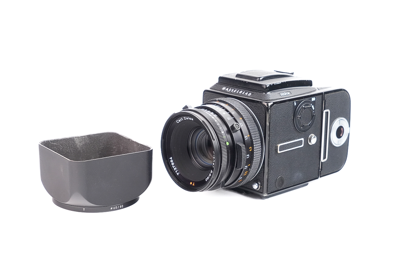 Superbe appareil de prise de vue Hasselblad, dernier appareil de la série V, évolution du 503 CX. Produit entre 1996 et 2013. On relève des spécificités : un verre dépoli Acute-Matte, une synchro-flash avec mesure TTL, un miroir plus long pour faciliter la visée avec les longues focales. Vient avec un objectif Planar 80/2.8 CF avec son pare-soleil ainsi qu'un dos A12. Lentilles propres. Pas de rayures, pas de brume, pas de champignons à noter.