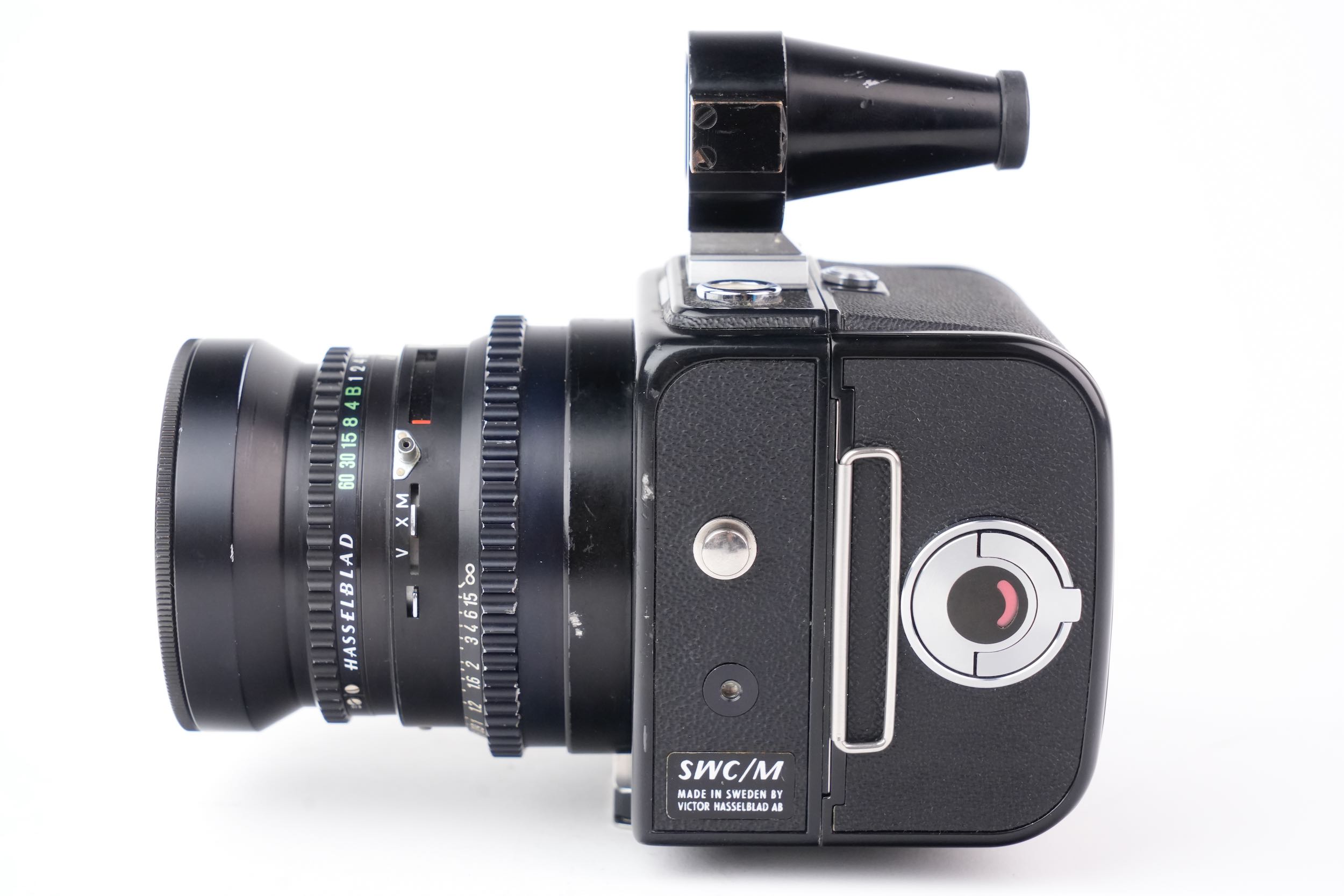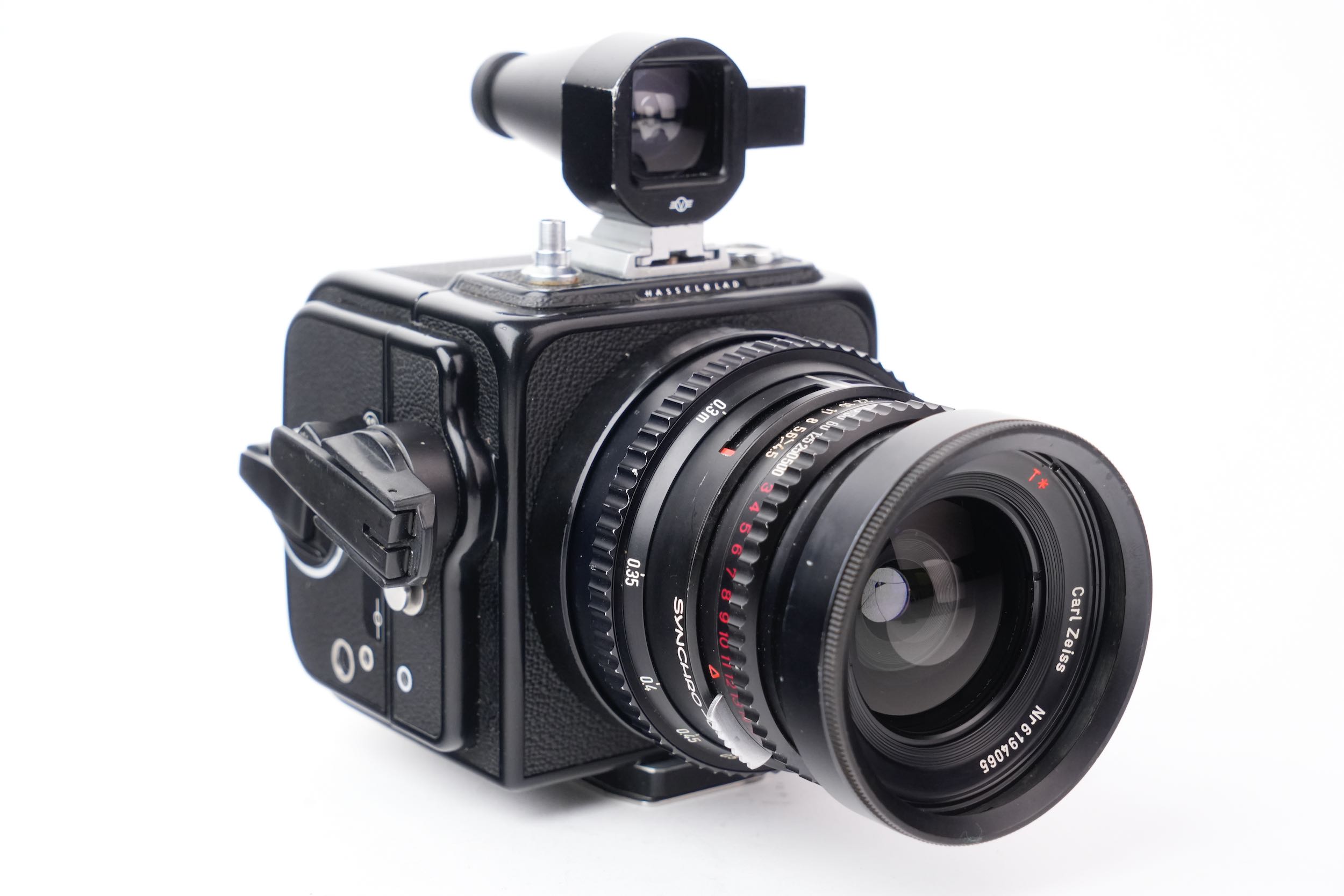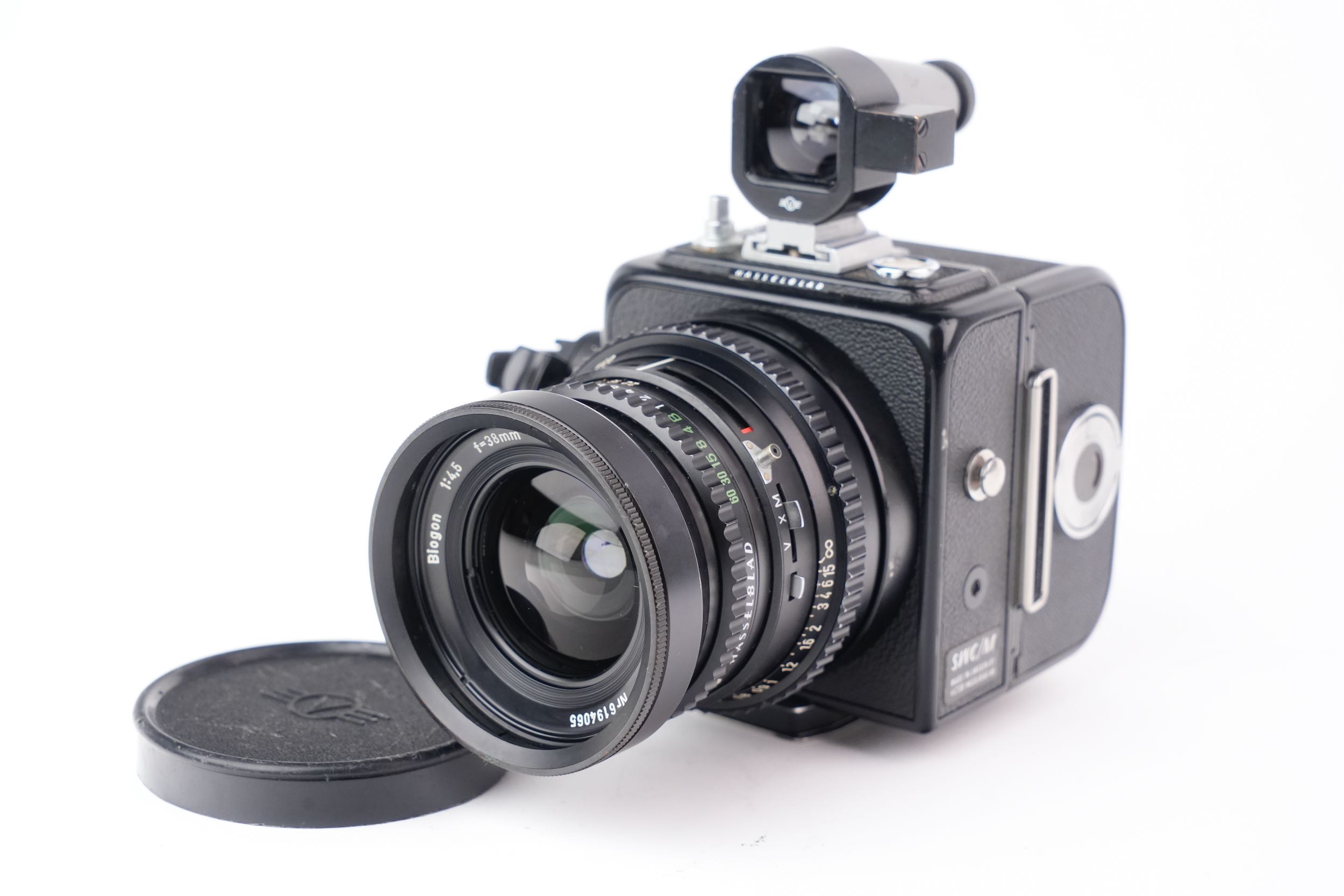 Hasselblad "Super Wide Camera" pour film 120 grand angulaire à objectif non interchangeable avec son viseur externe. Biogon 38mm f/4.5. Les lentilles sont propres, sans rayures, sans brume, sans décollement et sans champignon. Vitesses OK. Viseur sans brume. Numéro de série #UIW12595. Le dos A12 porte le numéro #RS142346 et produit des images au format 6x6cm. On remarques quelques traces de corrosion légère sur le métal de la molette gauche du dos film et sur le bouton d'attache du dessus.
