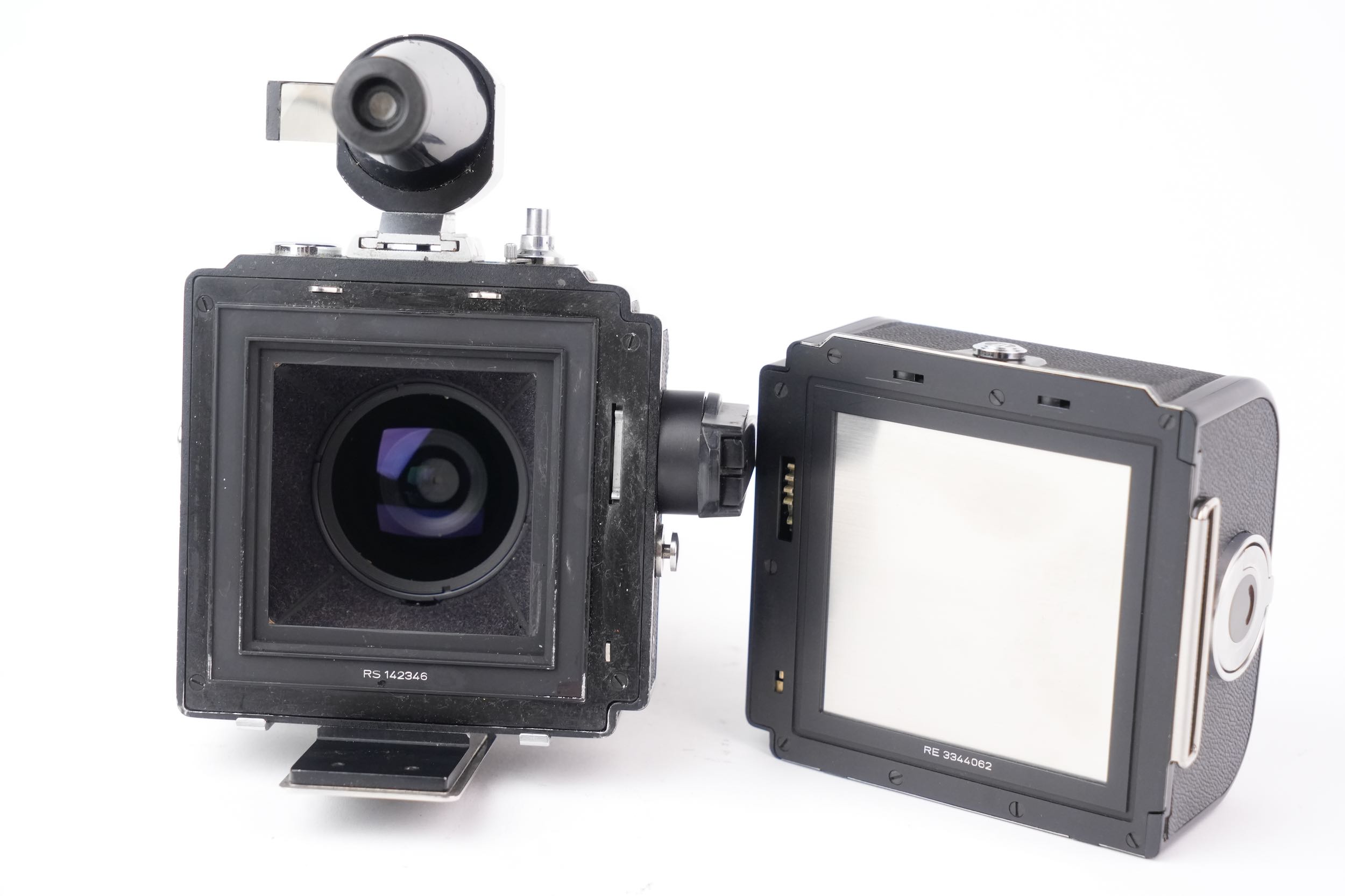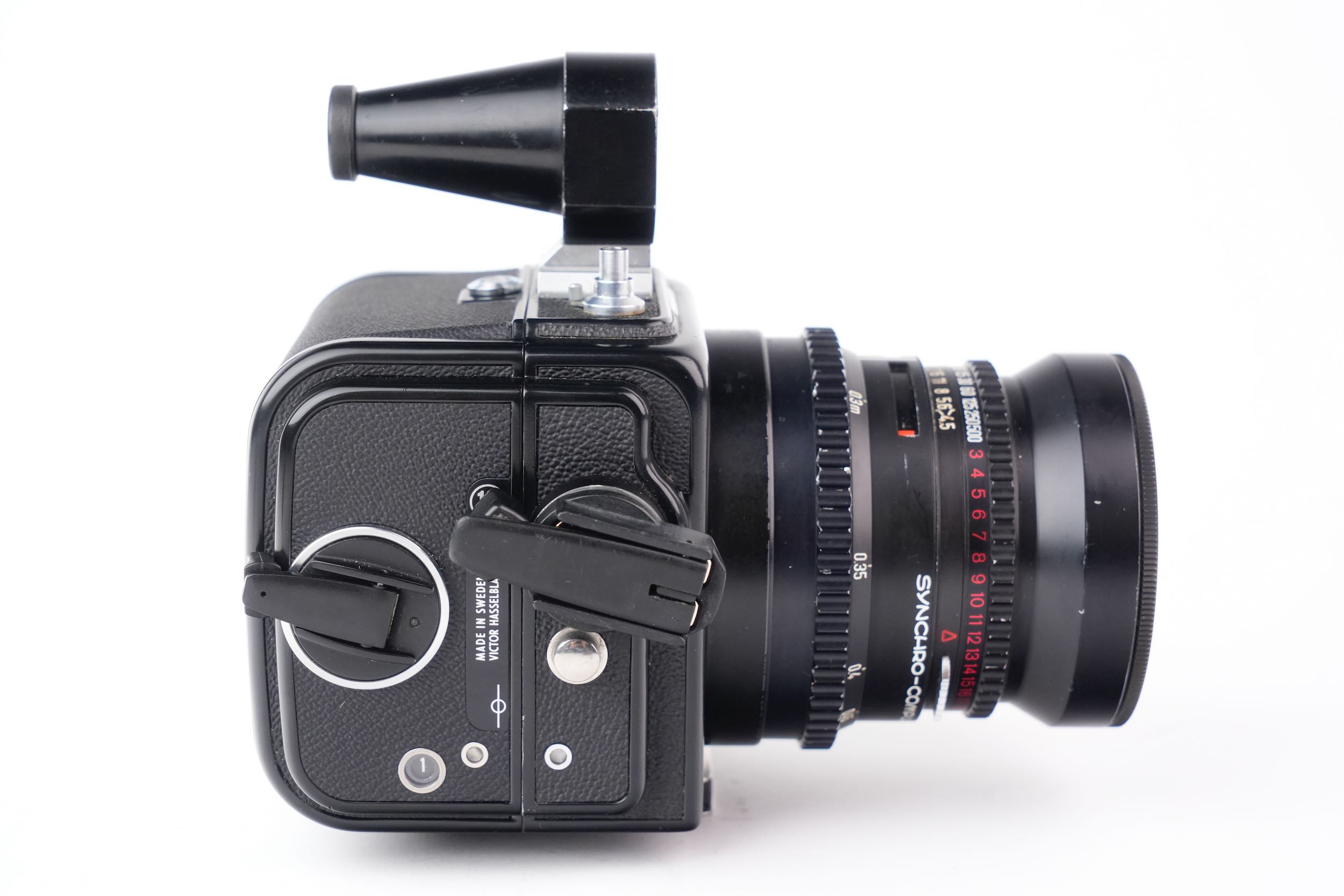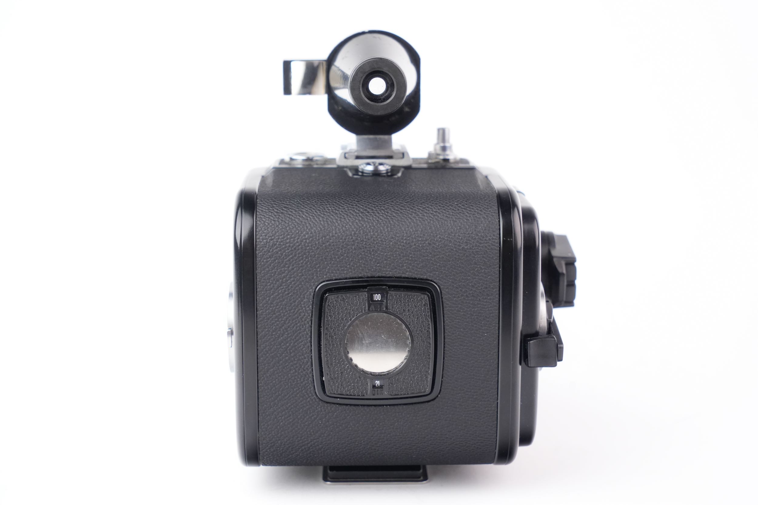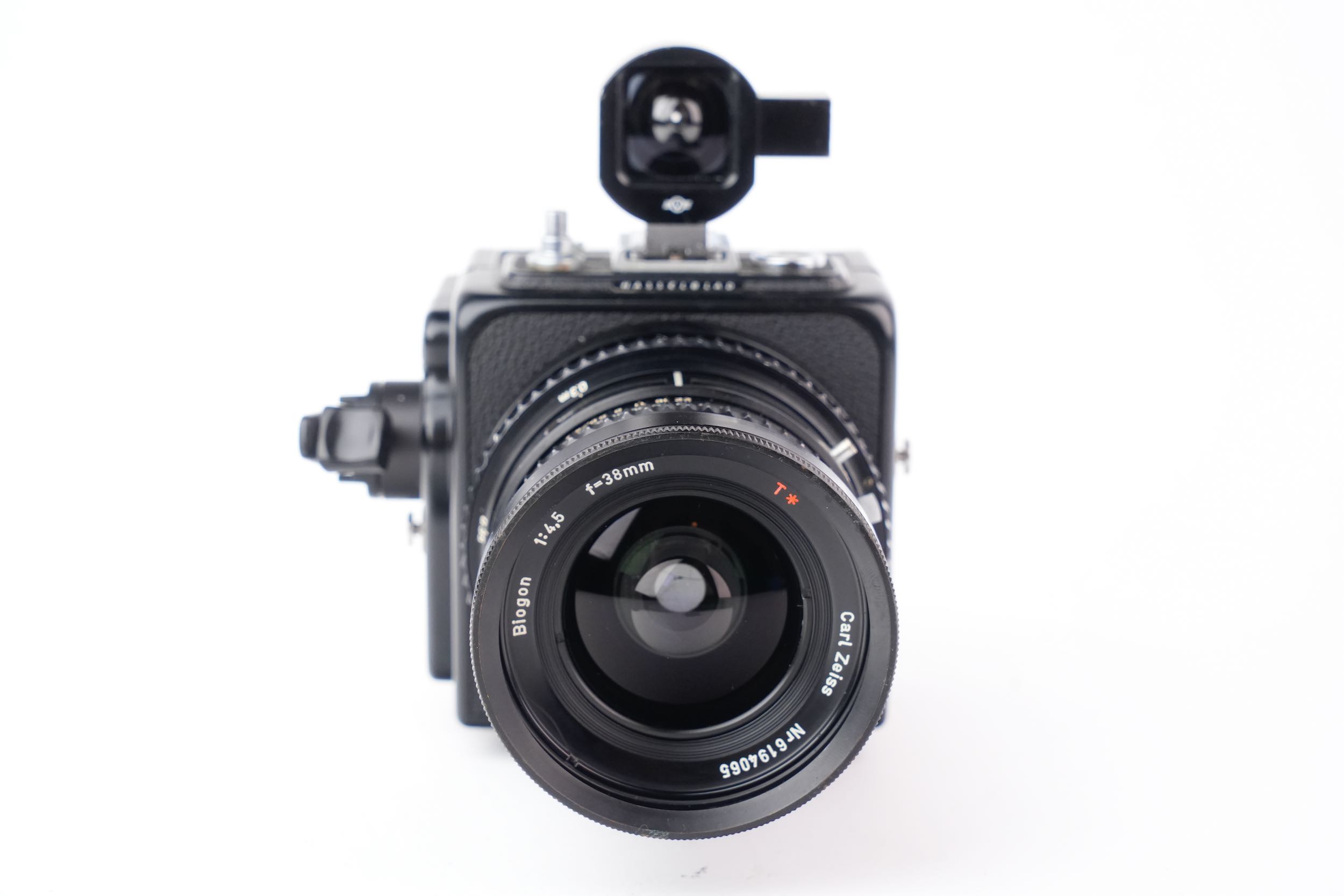 Hasselblad "Super Wide Camera" pour film 120 grand angulaire à objectif non interchangeable avec son viseur externe. Biogon 38mm f/4.5. Les lentilles sont propres, sans rayures, sans brume, sans décollement et sans champignon. Vitesses OK. Viseur sans brume. Numéro de série #UIW12595. Le dos A12 porte le numéro #RS142346 et produit des images au format 6x6cm. On remarques quelques traces de corrosion légère sur le métal de la molette gauche du dos film et sur le bouton d'attache du dessus.