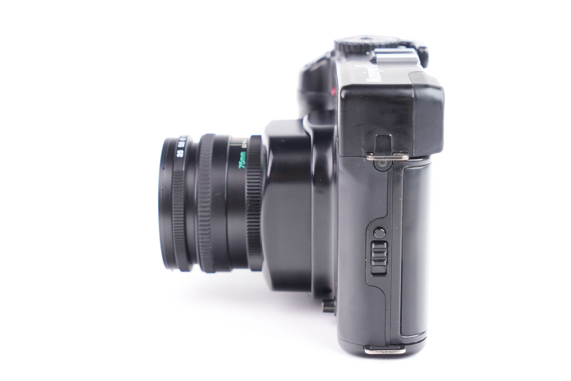Le Mamiya 6, produit au Japon entre 1989 et 1995, est un appareil photo moyen format télémétrique utilisant des pellicules 120 ou 220, permettant la prise de vues carrées en 6 × 6 cm. Compact et innovant pour ce format, il dispose d’un système d’objectifs interchangeables avec un mécanisme de rétraction unique, réduisant l’encombrement du boîtier pour le transport. L’exemplaire présenté est accompagné de trois optiques Mamiya : un Wide 50 mm f/4 L, un Standard 75 mm f/3,5 L et un Tele 150 mm f/4,5 L, offrant un éventail polyvalent allant du grand-angle au téléobjectif. L’ensemble est complété par ses pare-soleil dédiés, ses bouchons avant et arrière. Apprécié des photographes de reportage et de voyage, le Mamiya 6 associe compacité, discrétion et qualité d’image exceptionnelle, tout en incarnant une alternative moderne et portable aux reflex moyen format plus volumineux.
