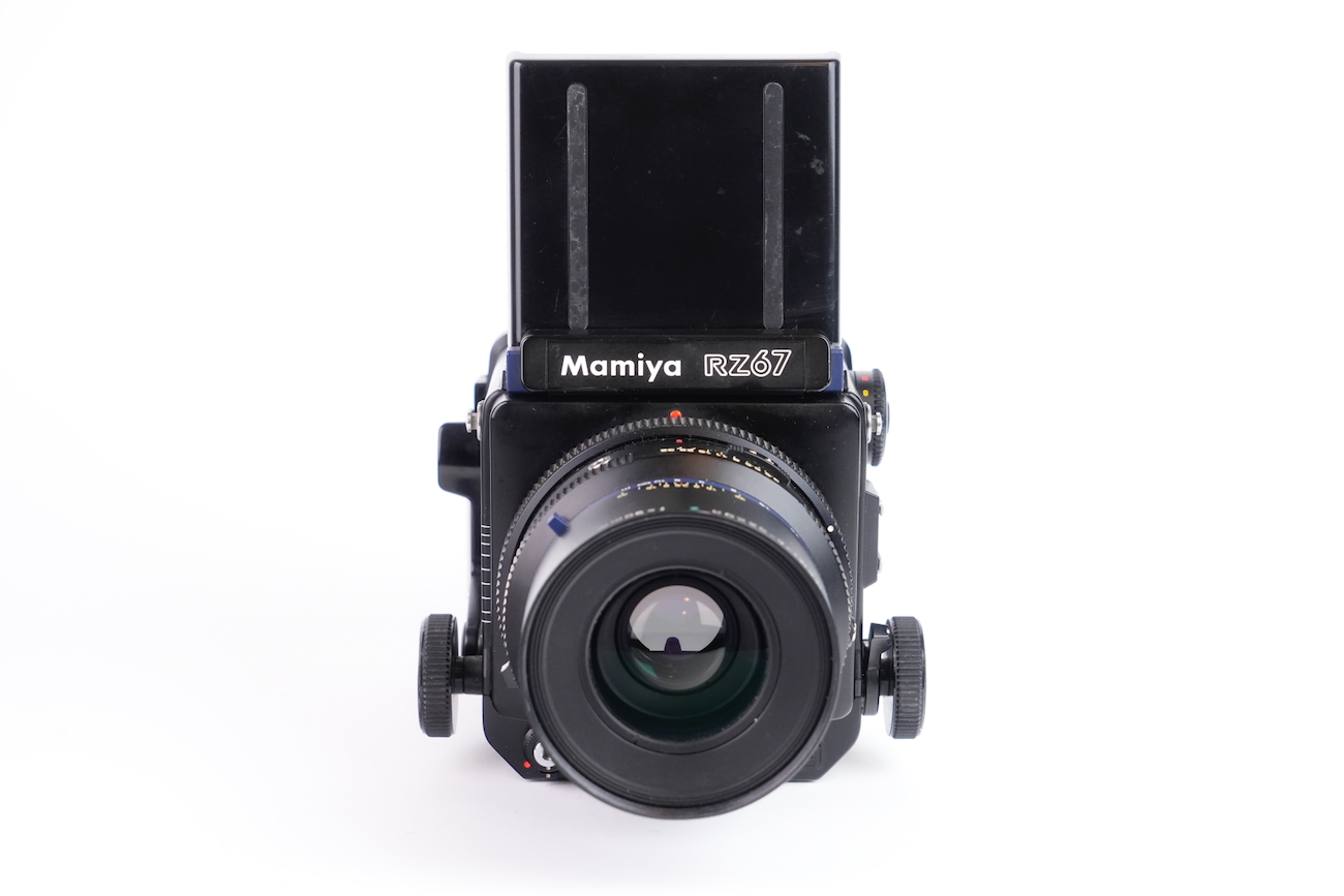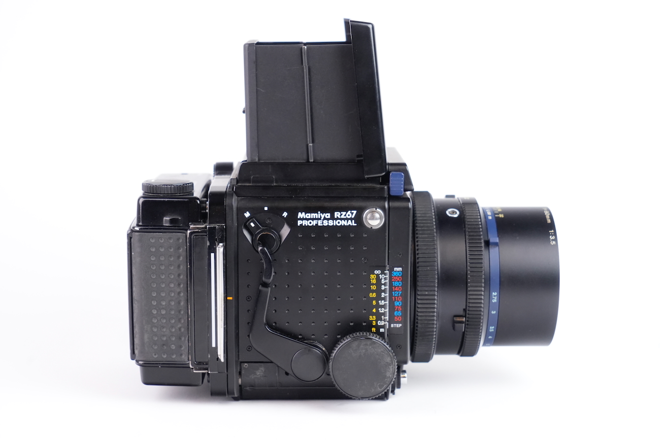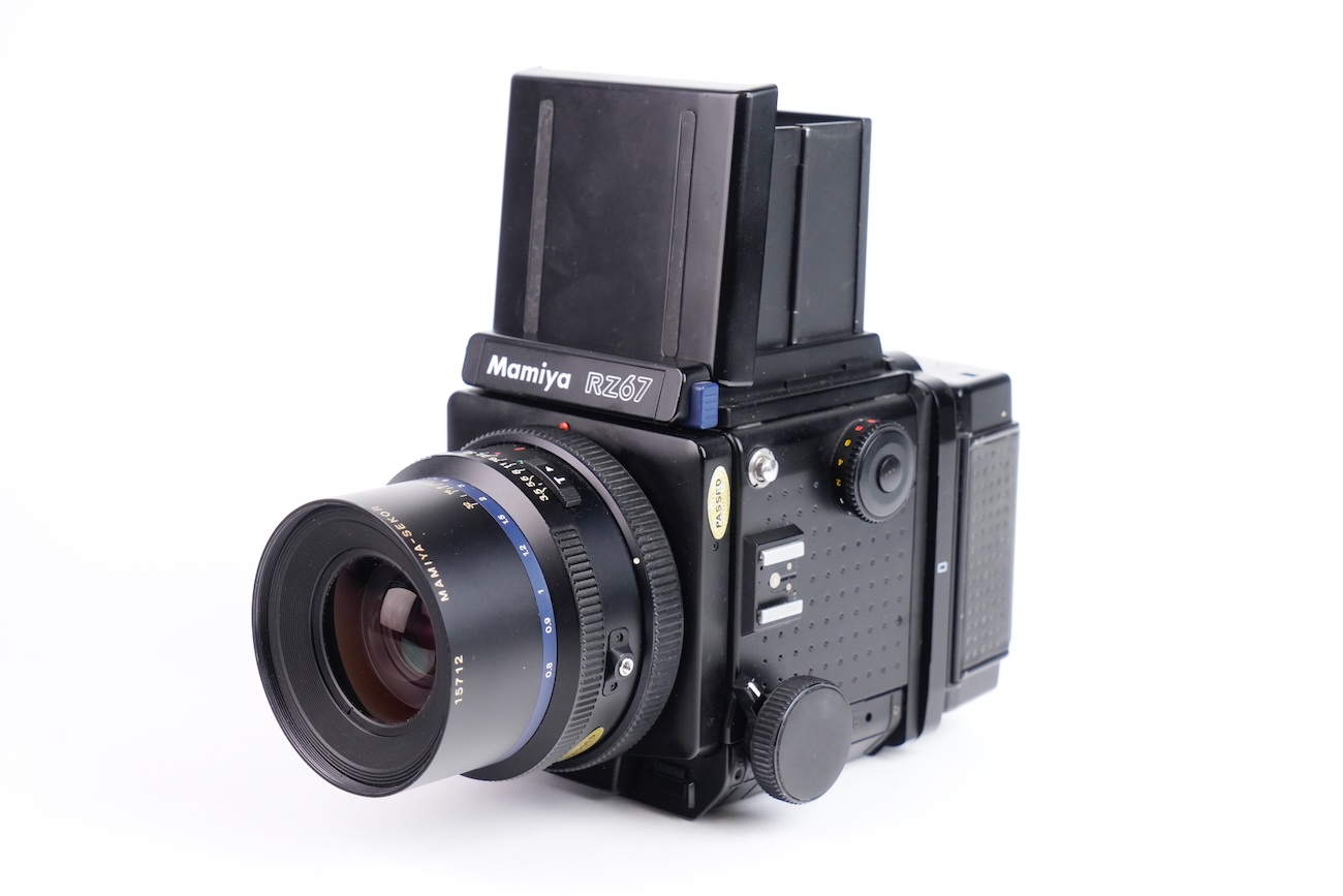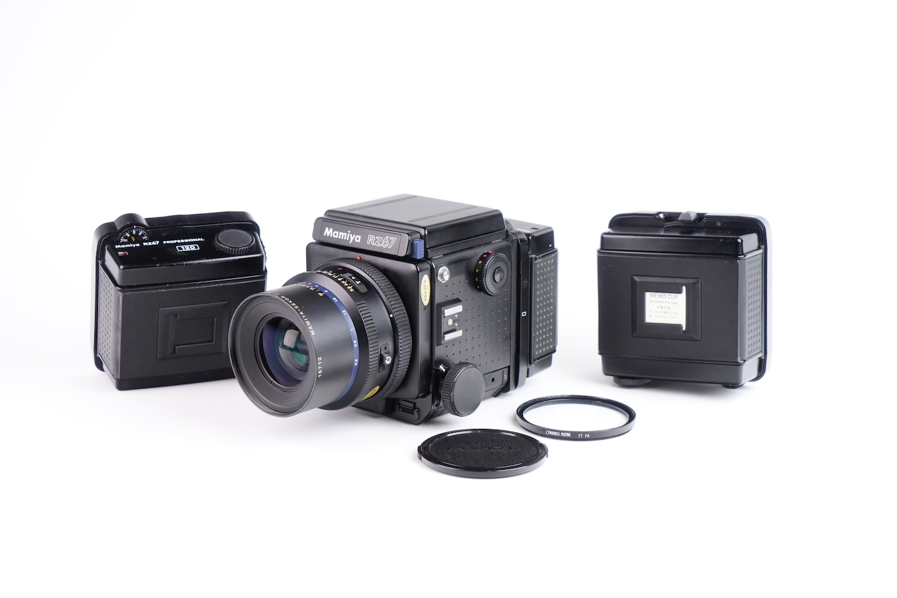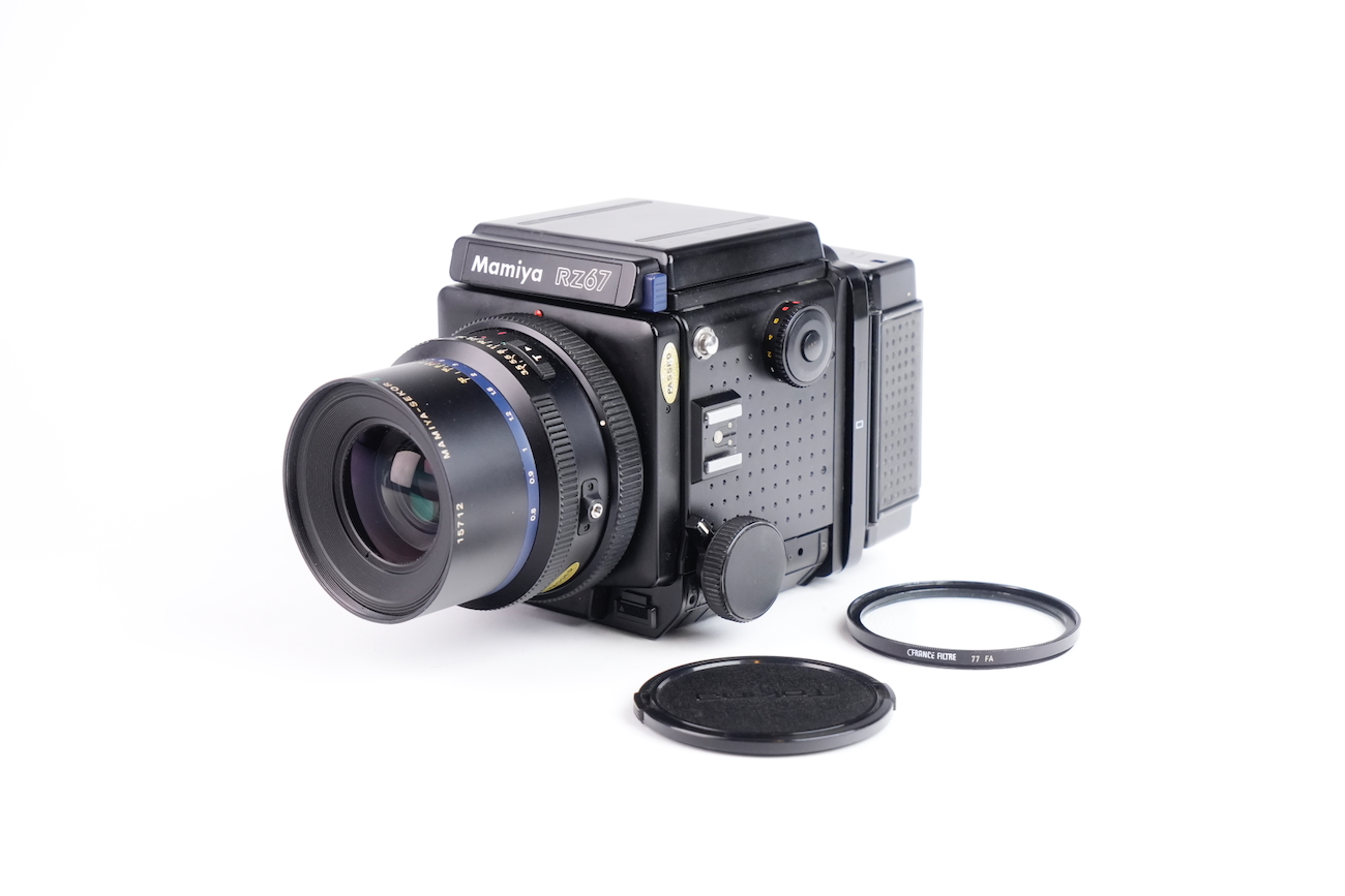 Appareil moyen format reflex Mamiya RZ67 Professional, système modulaire 6×7 cm. Boîtier à commande électronique (nécessite une pile de 6V, type 4LR44), soufflet intégré pour la mise au point rapprochée. Compatible avec dos interchangeables et objectifs Mamiya RZ. Le boîtier fonctionne correctement, le dos rotatif est opérationnel, l'armement et le déclenchement se fait sans encombre, les vitesses sont respectées. L'objectif Mamiya-Sekkor 90/3.5 est propre, sans défaut optique et sans souci mécanique. Pas de brume, pas de décollement, pas de rayure, pas de champignon. Vient avec trois dos, un filtre créatif "CFrance" et un bouchon d'objectif "Tokina".