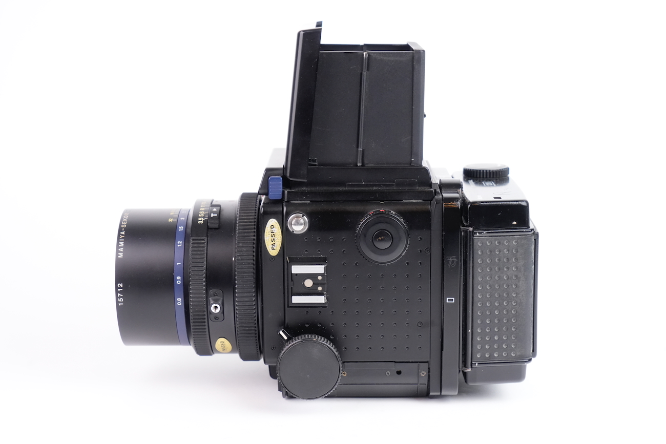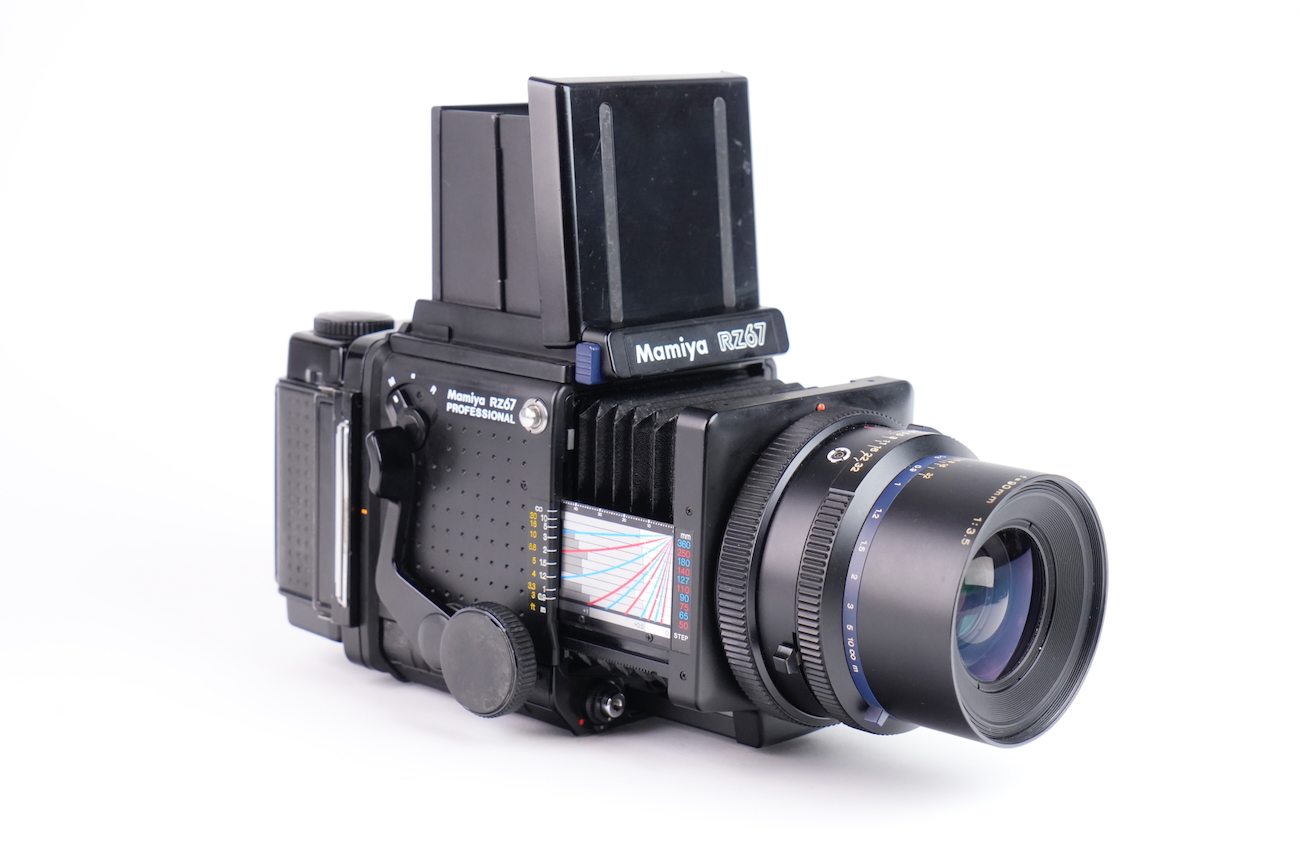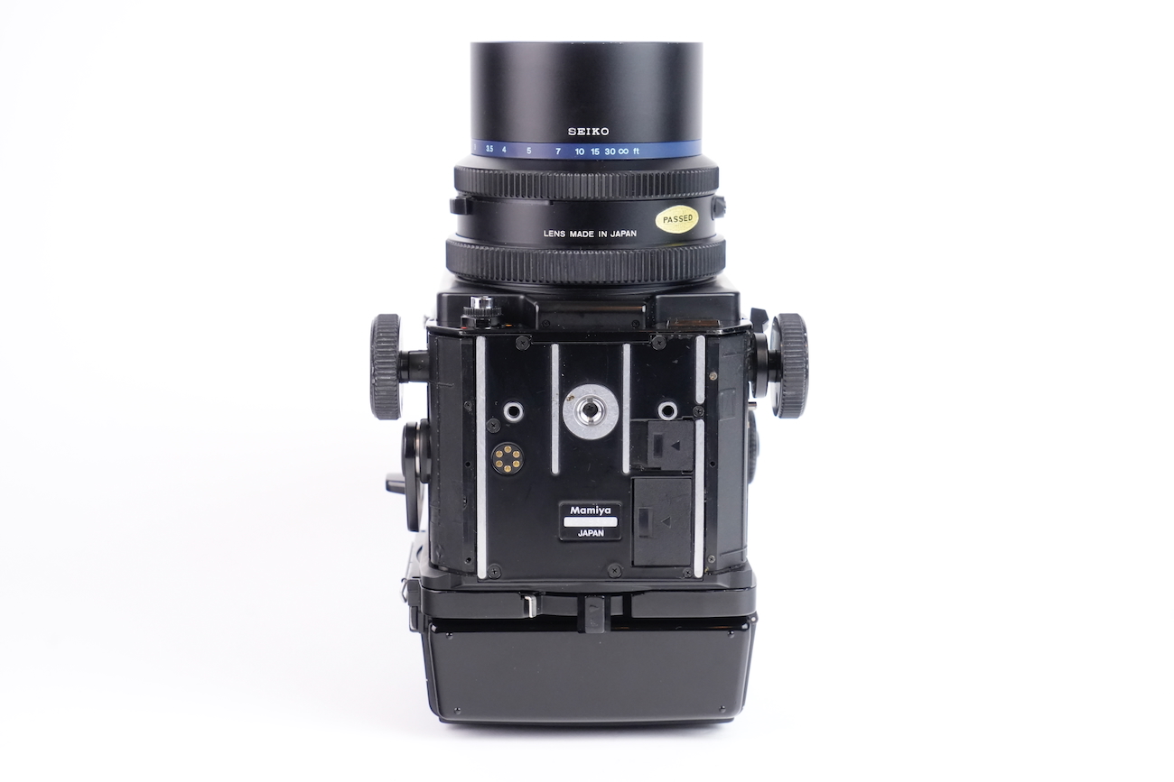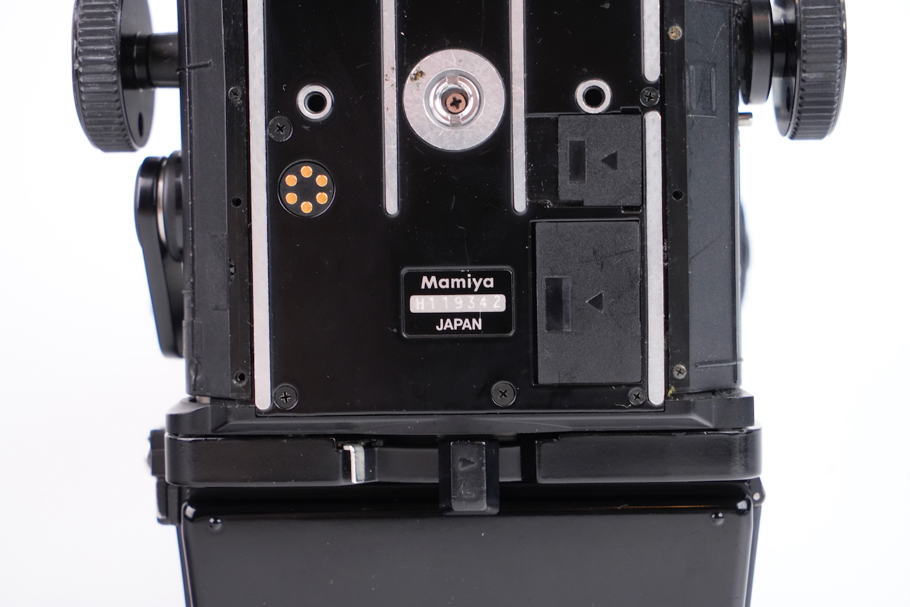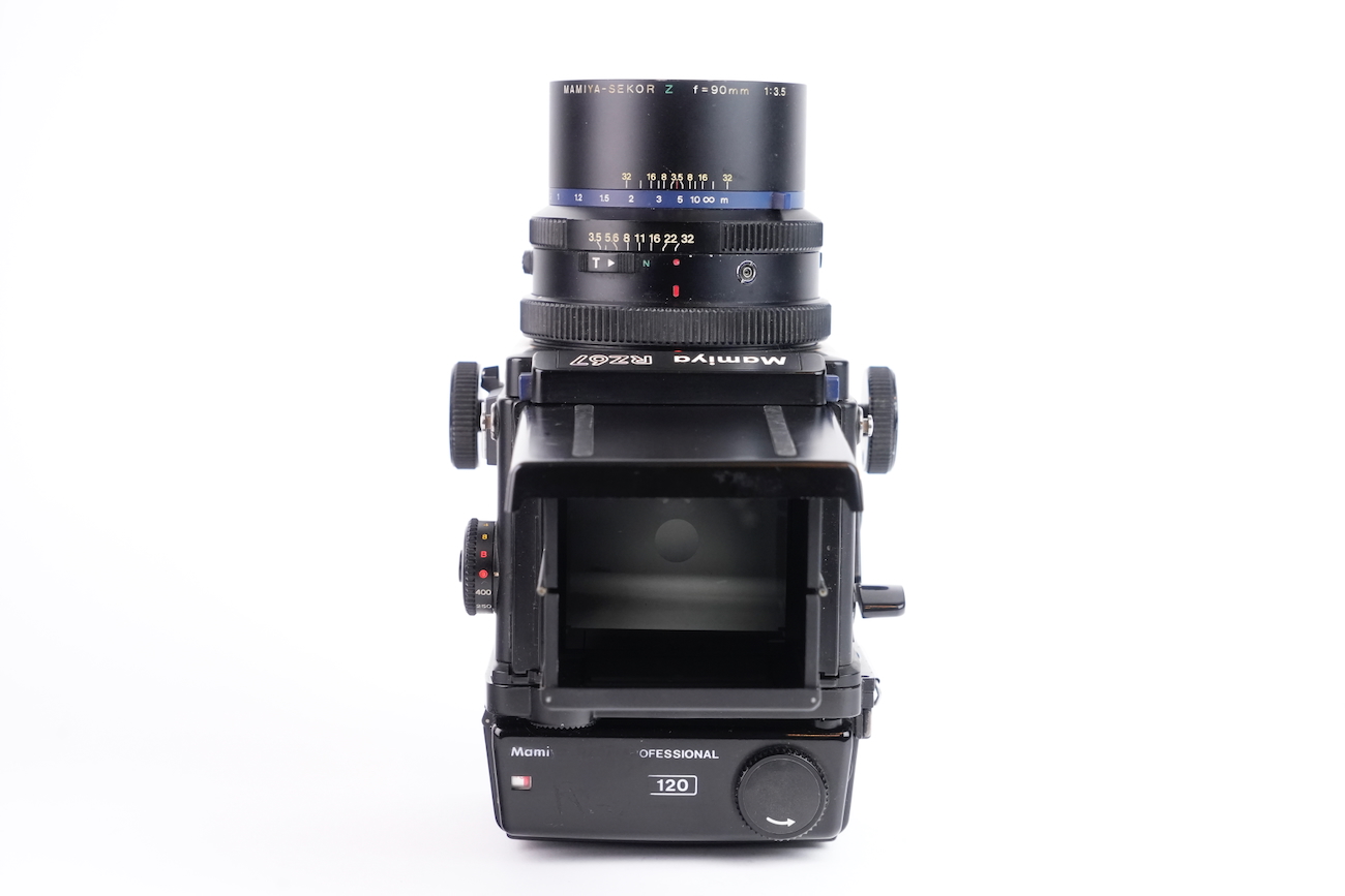 Appareil moyen format reflex Mamiya RZ67 Professional, système modulaire 6×7 cm. Boîtier à commande électronique (nécessite une pile de 6V, type 4LR44), soufflet intégré pour la mise au point rapprochée. Compatible avec dos interchangeables et objectifs Mamiya RZ. Le boîtier fonctionne correctement, le dos rotatif est opérationnel, l'armement et le déclenchement se fait sans encombre, les vitesses sont respectées. L'objectif Mamiya-Sekkor 90/3.5 est propre, sans défaut optique et sans souci mécanique. Pas de brume, pas de décollement, pas de rayure, pas de champignon. Vient avec trois dos, un filtre créatif "CFrance" et un bouchon d'objectif "Tokina".