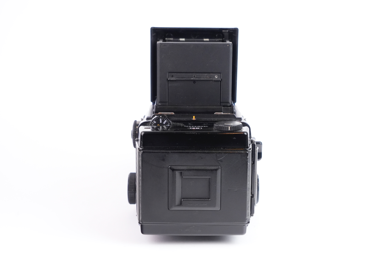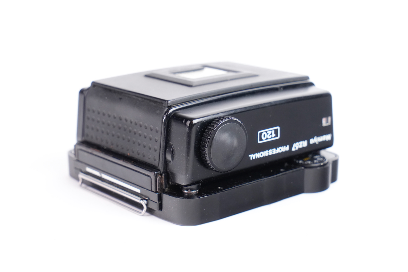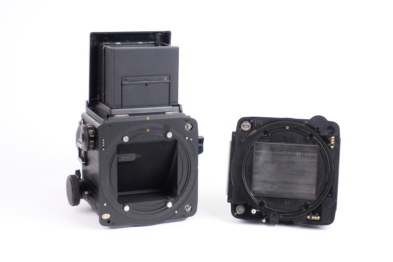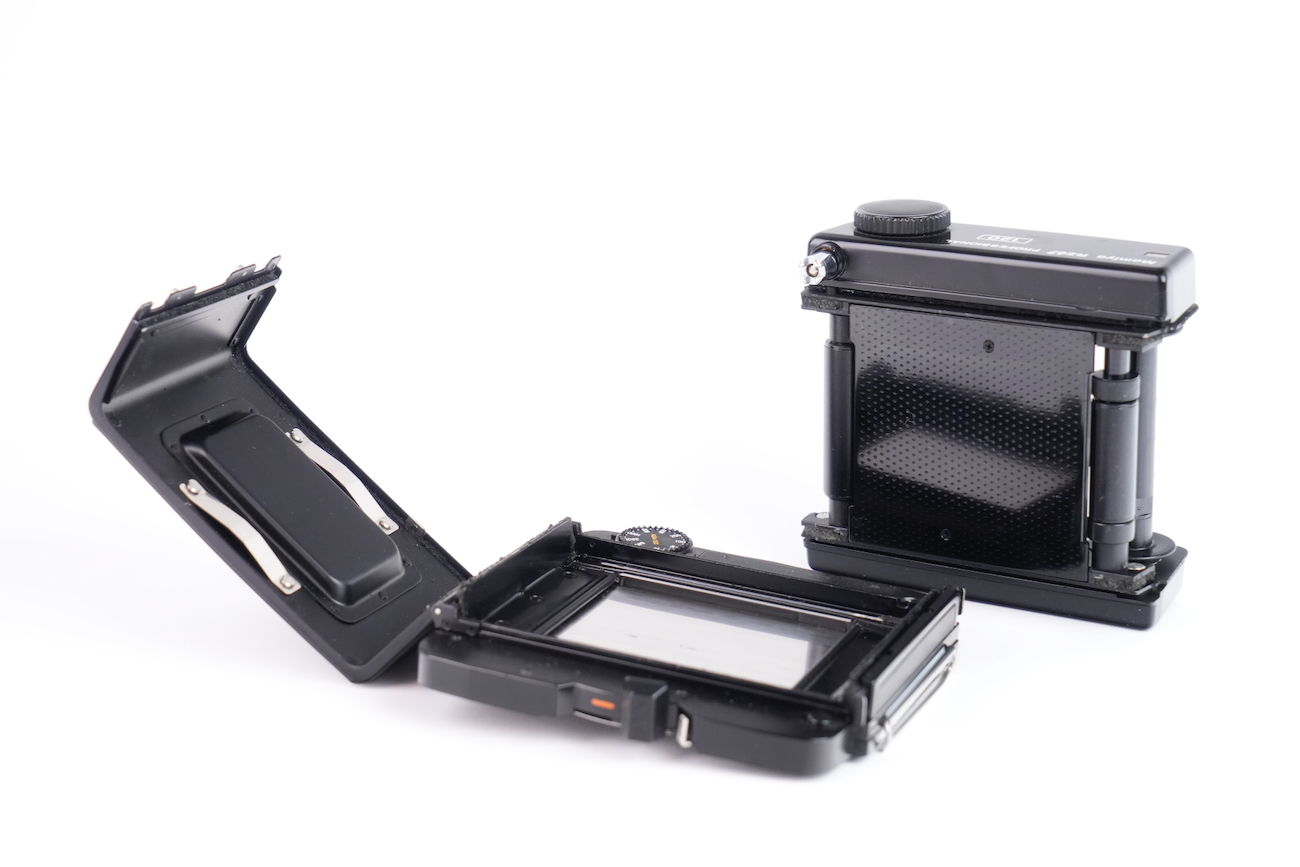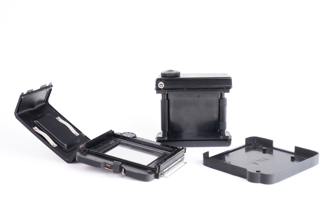 Appareil moyen format reflex Mamiya RZ67 Professional, système modulaire 6×7 cm. Boîtier à commande électronique (nécessite une pile de 6V, type 4LR44), soufflet intégré pour la mise au point rapprochée. Compatible avec dos interchangeables et objectifs Mamiya RZ. Le boîtier fonctionne correctement, le dos rotatif est opérationnel, l'armement et le déclenchement se fait sans encombre, les vitesses sont respectées. L'objectif Mamiya-Sekkor 90/3.5 est propre, sans défaut optique et sans souci mécanique. Pas de brume, pas de décollement, pas de rayure, pas de champignon. Vient avec trois dos, un filtre créatif "CFrance" et un bouchon d'objectif "Tokina".