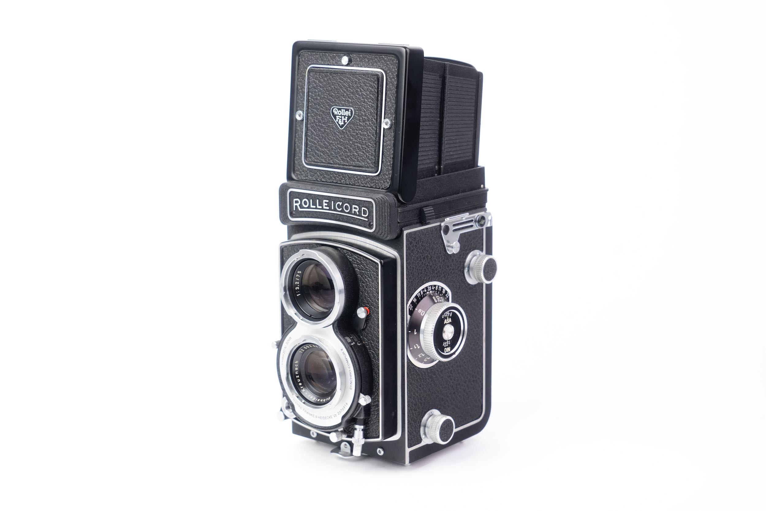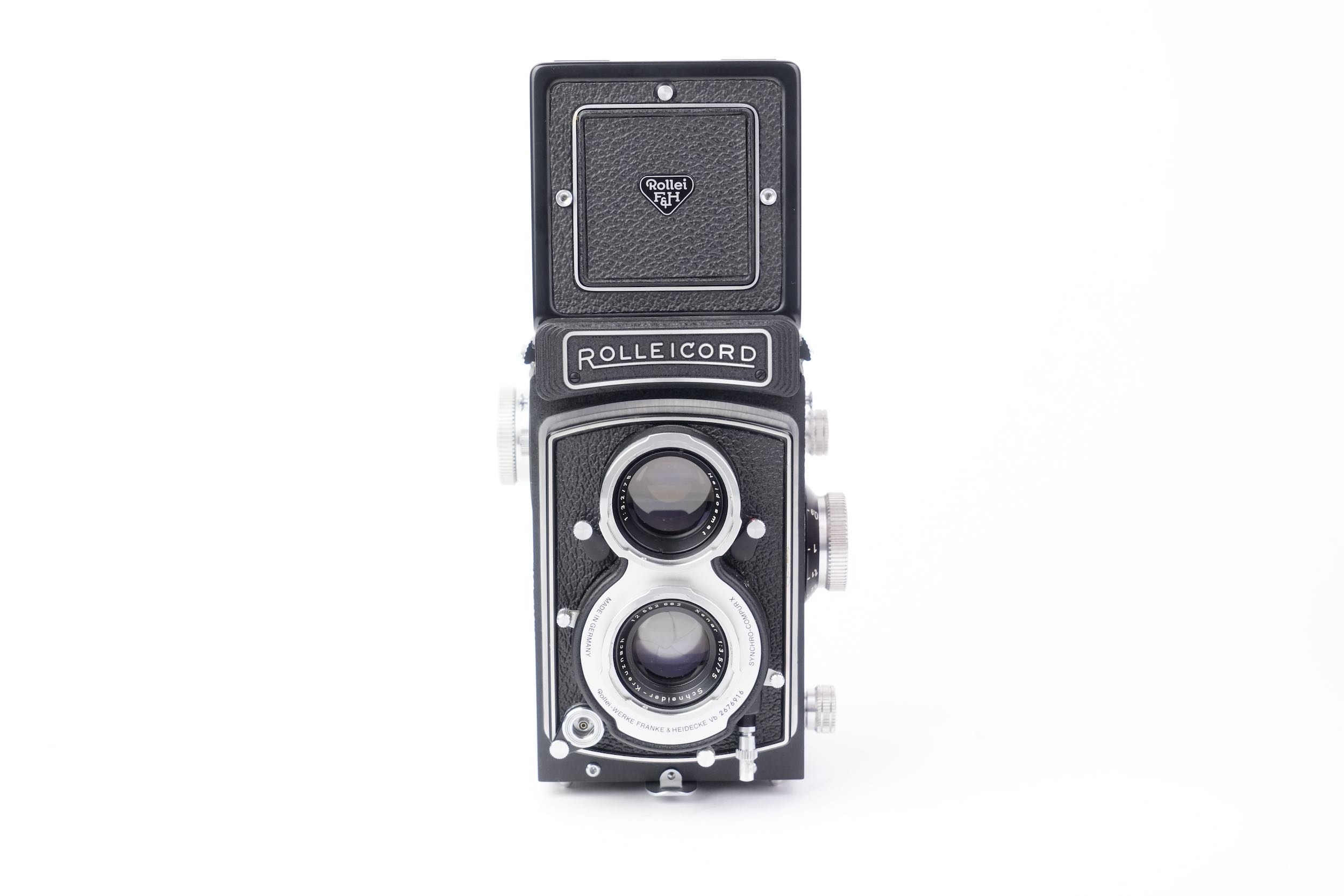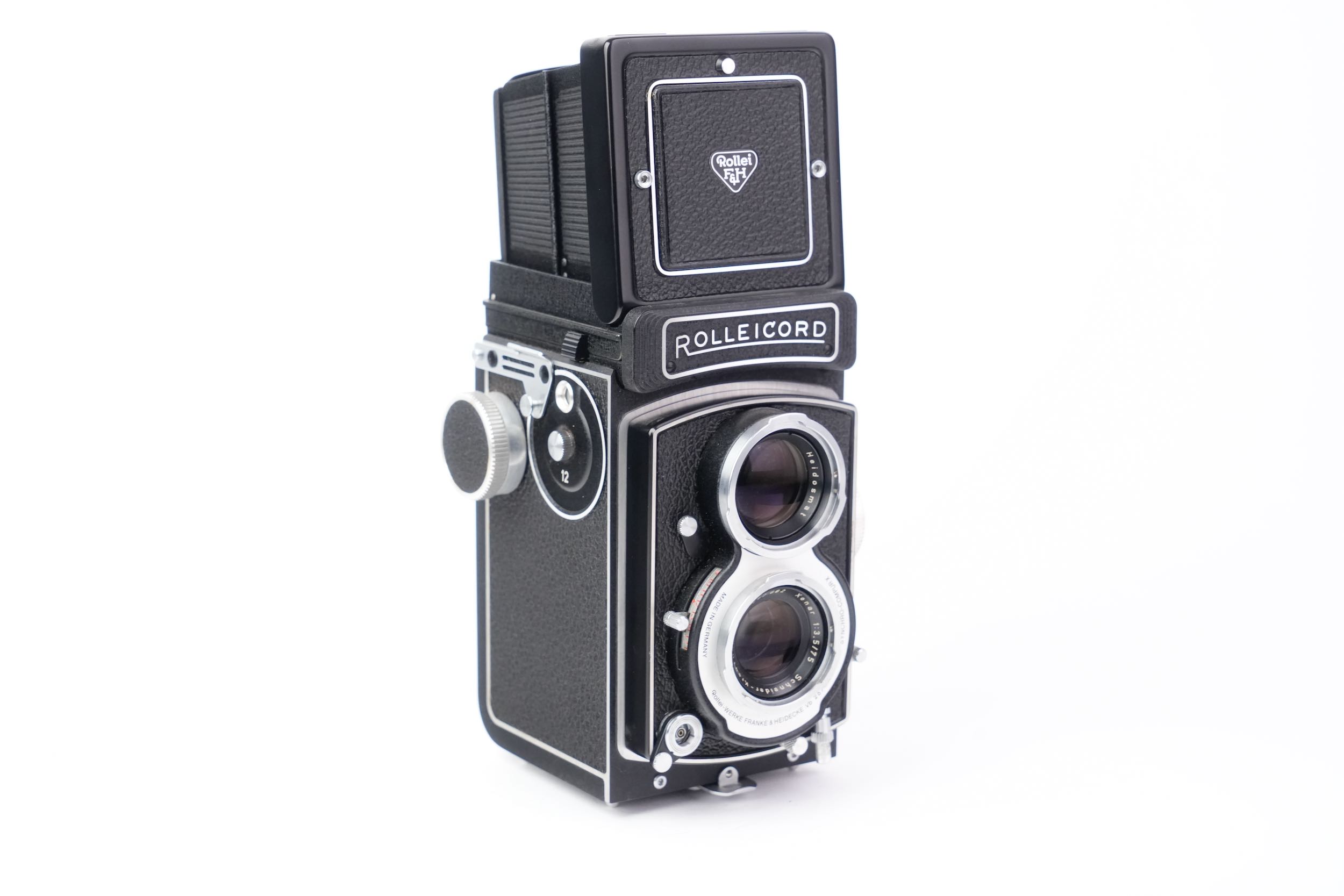 Le Rolleicord Vb "White Face", fabriqué par Rollei-Werke Franke & Heidecke à Braunschweig entre 1970 et 1977, est un appareil photographique bi-objectif (TLR) utilisant du film 120 pour des images au format 6×6 cm. Dernière évolution de la lignée Rolleicord, il se distingue par sa façade blanche caractéristique, d’où son surnom. Plus abordable que le Rolleiflex mais doté d’une excellente optique, il embarque un objectif Schneider-Kreuznach Xenar 75 mm f/3,5 pour la prise de vue et un Heidosmat 75 mm f/3,2 pour la visée, associés à un obturateur Synchro-Compur offrant des vitesses de 1 s à 1/500 s. Destiné aux amateurs éclairés, le Rolleicord White Face est aujourd’hui très recherché par les collectionneurs pour sa rareté, sa qualité de fabrication et son statut d’ultime représentant de cette gamme.