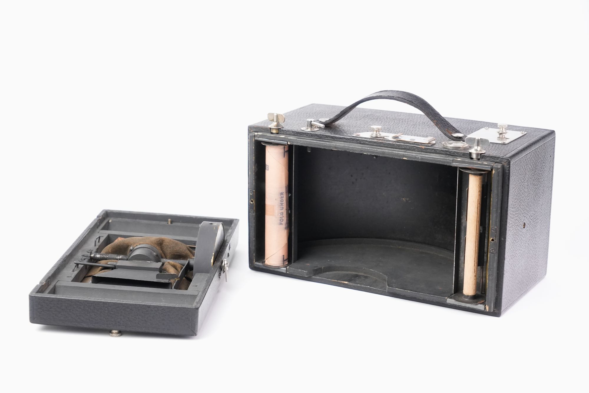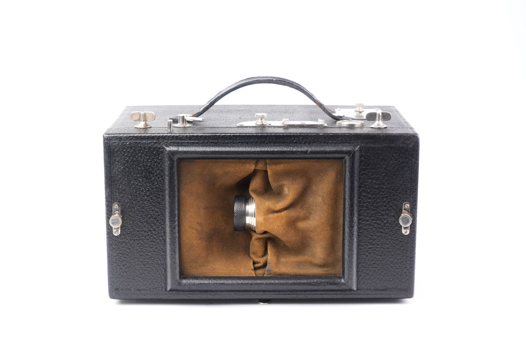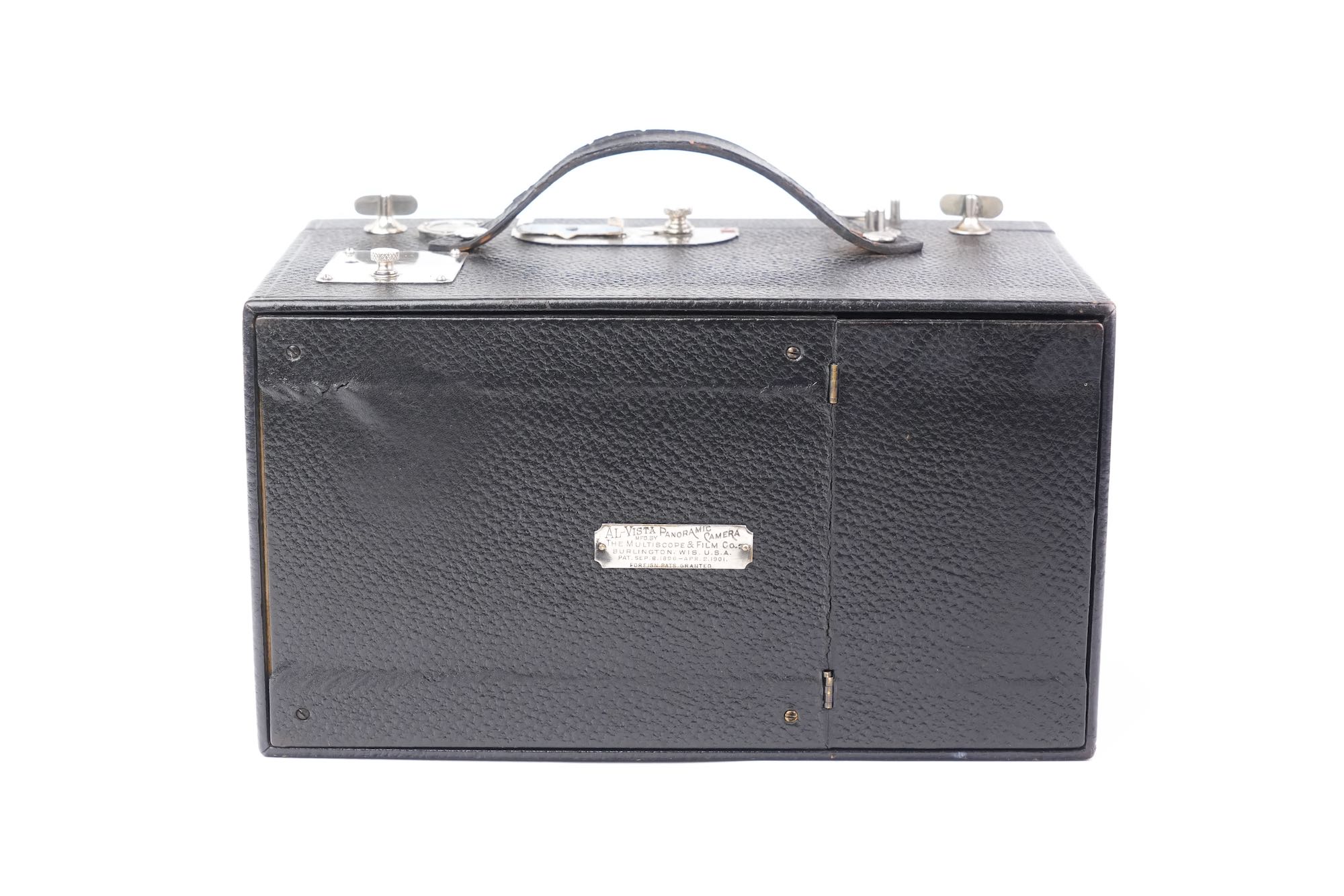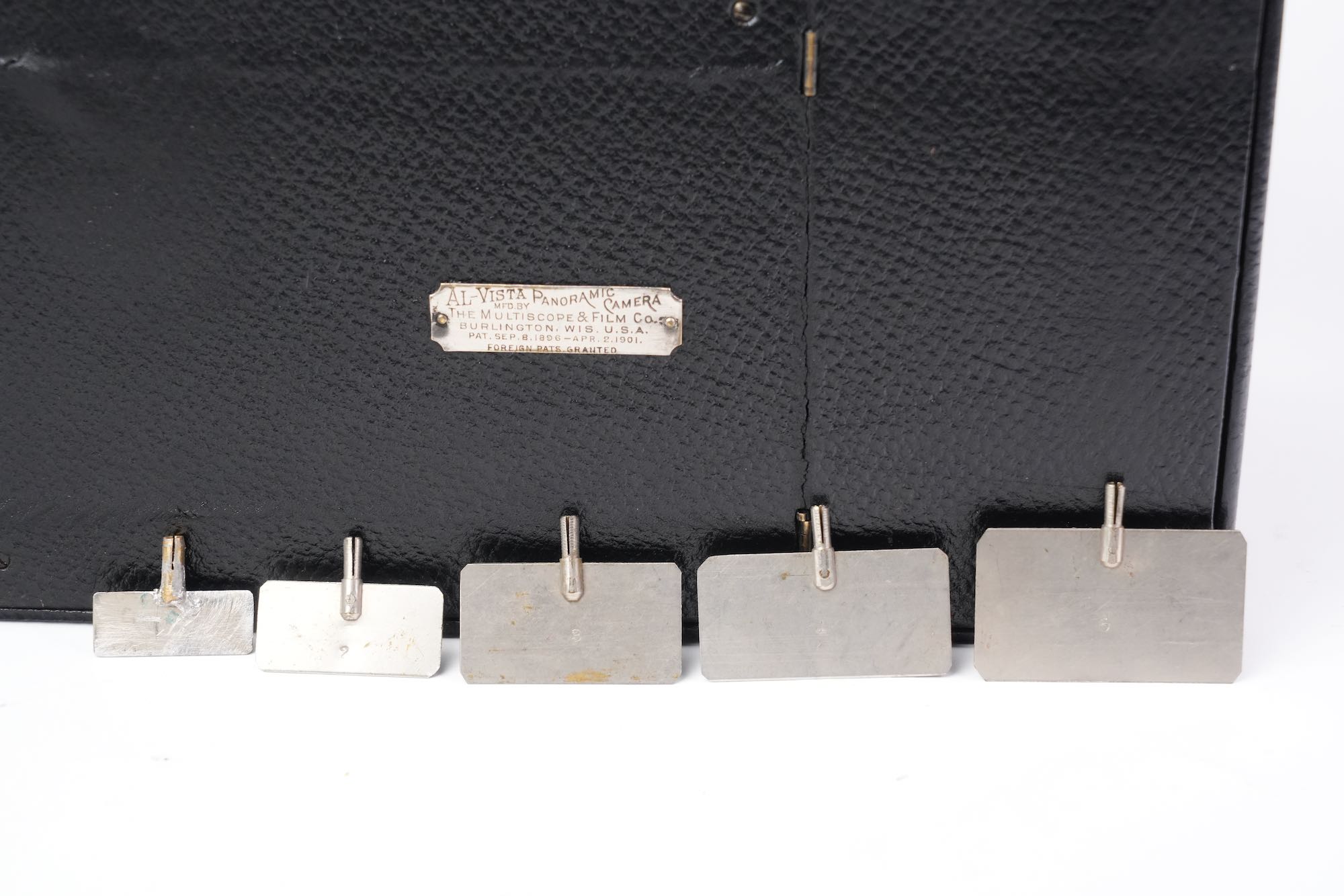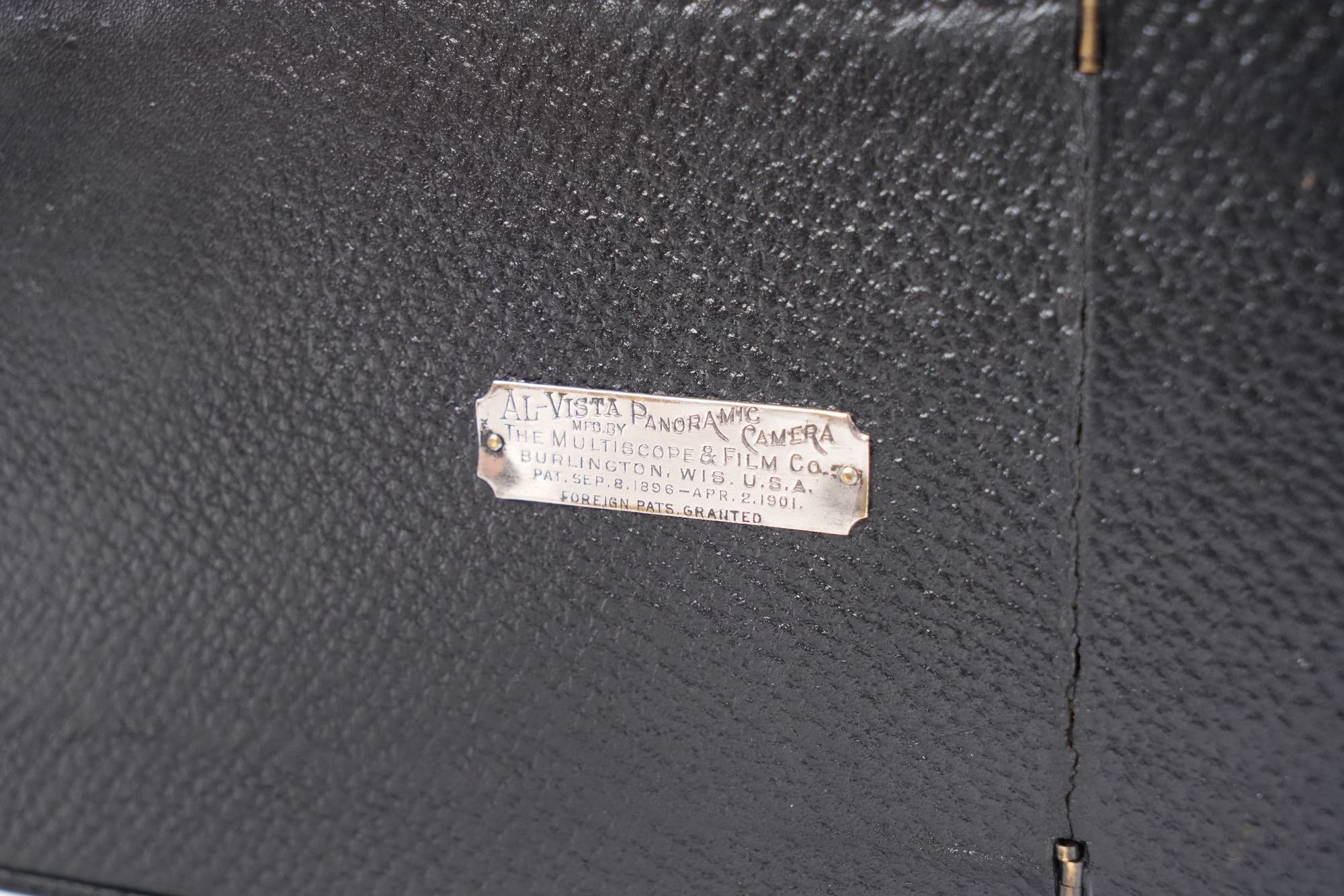 Al-Vista Panoramic Camera, produite vers 1898–1905 par The Multiscope & Film Company à Burlington (Wisconsin, États-Unis), est un appareil photographique panoramique à rotation horizontale conçu pour capturer des images jusqu’à environ 150° sur un film disposé en arc de cercle. Son boîtier en bois gainé de cuir noir, muni d’une poignée supérieure et d’un soufflet en tissu brun protégeant l’objectif, renferme un mécanisme permettant la rotation synchronisée de la lentille pendant l’exposition. L’appareil est accompagné d’un jeu d’ailettes métalliques interchangeables, de tailles variées, servant à réguler la vitesse de rotation de l’objectif — et donc le temps d’exposition — selon les conditions de lumière. Une table d’exposition imprimée figure à l’intérieur du couvercle. Certaines versions de l’Al-Vista pouvaient accepter plusieurs formats de film souple, offrant ainsi une flexibilité d’usage pour différentes largeurs d’image panoramique.