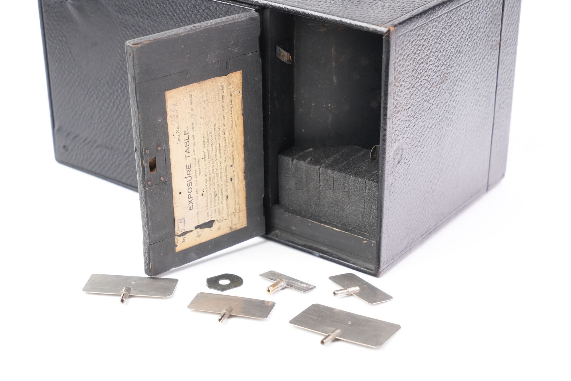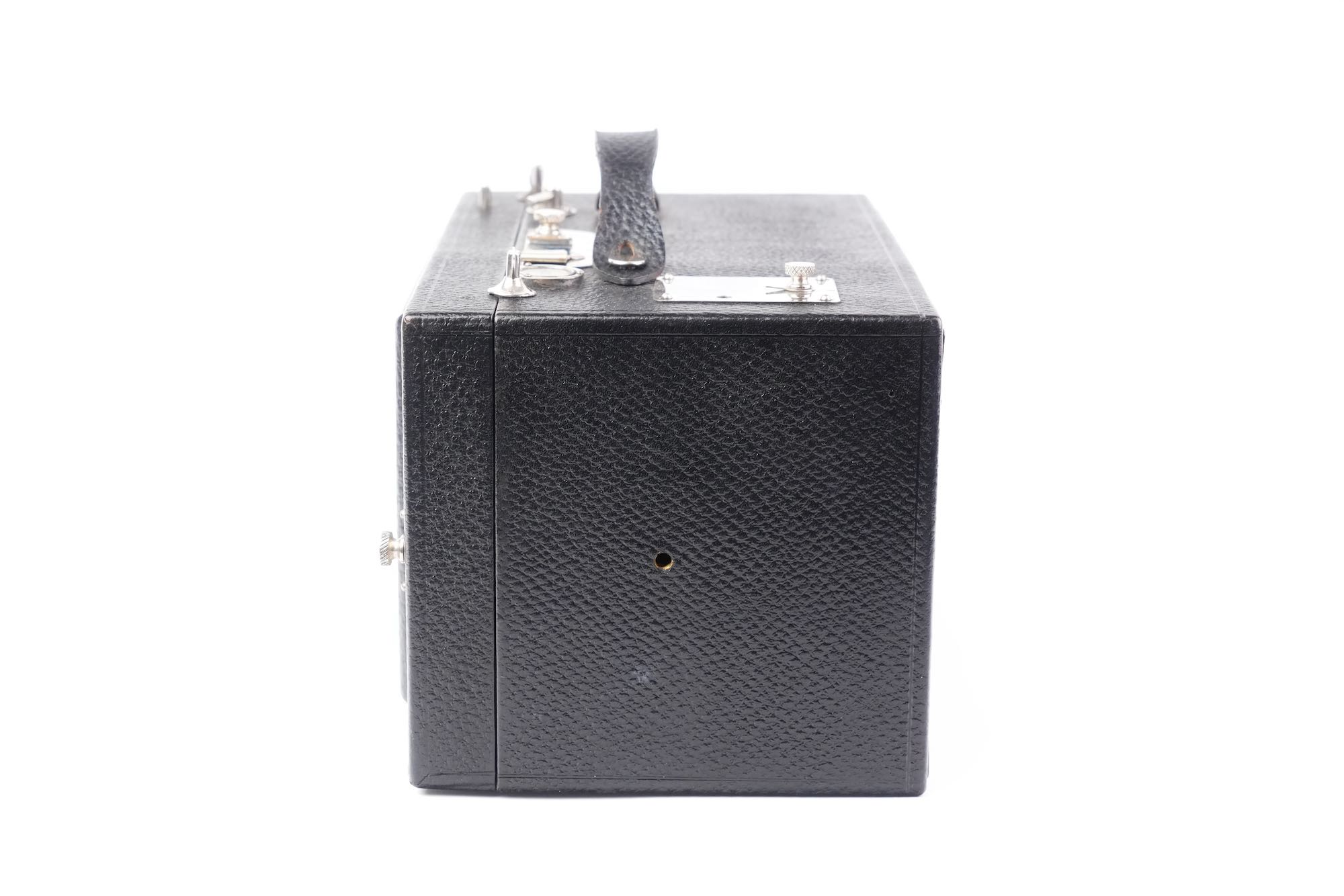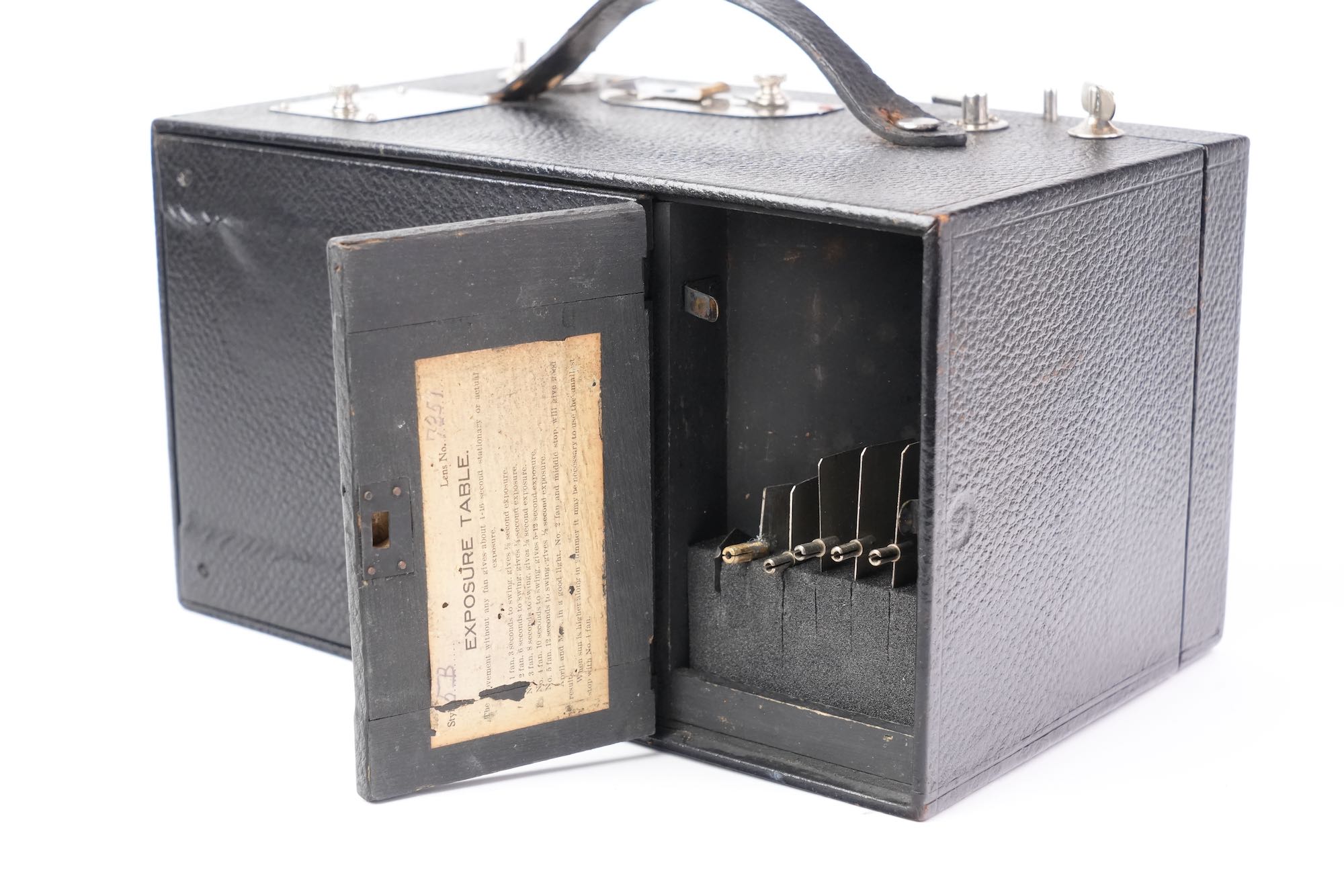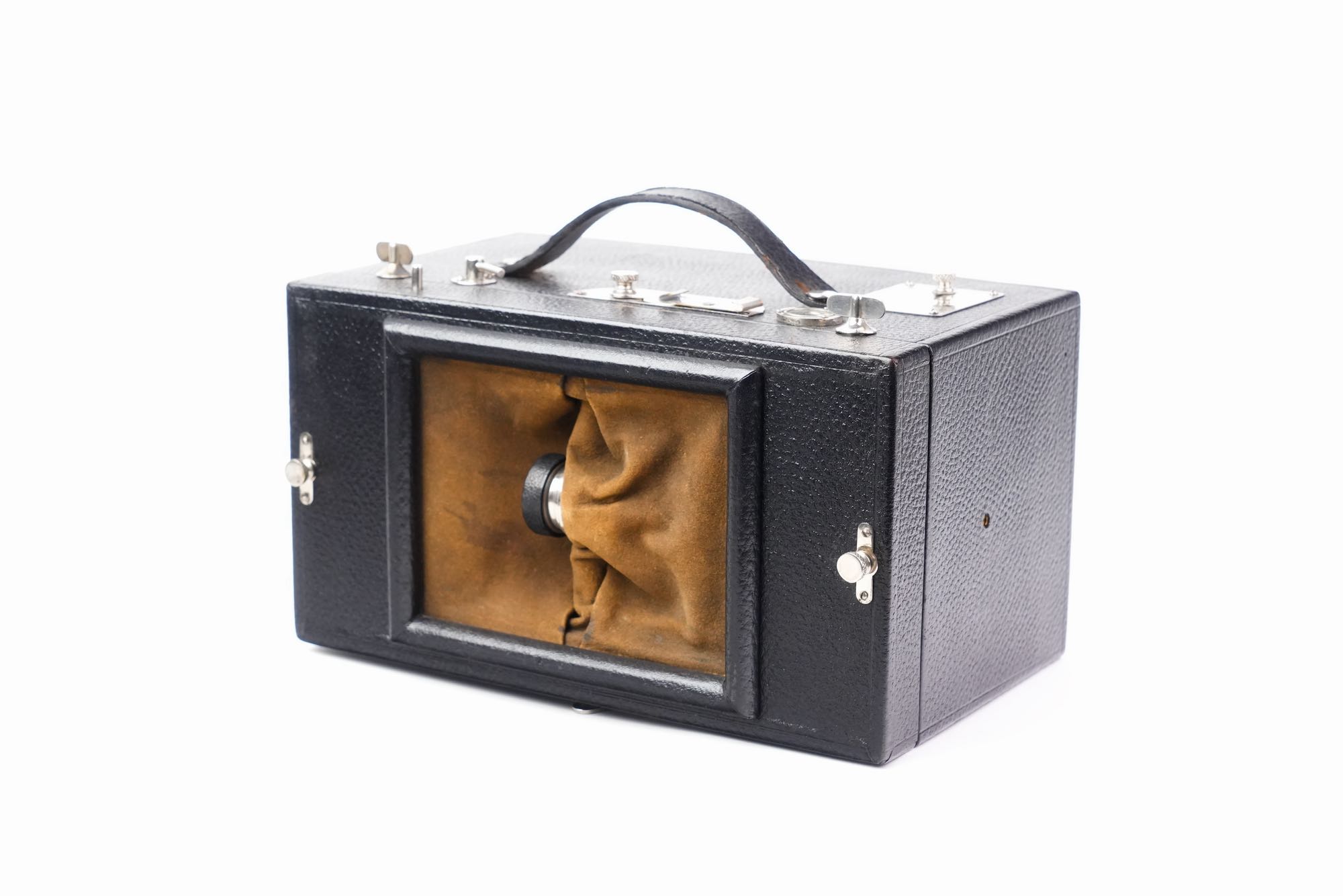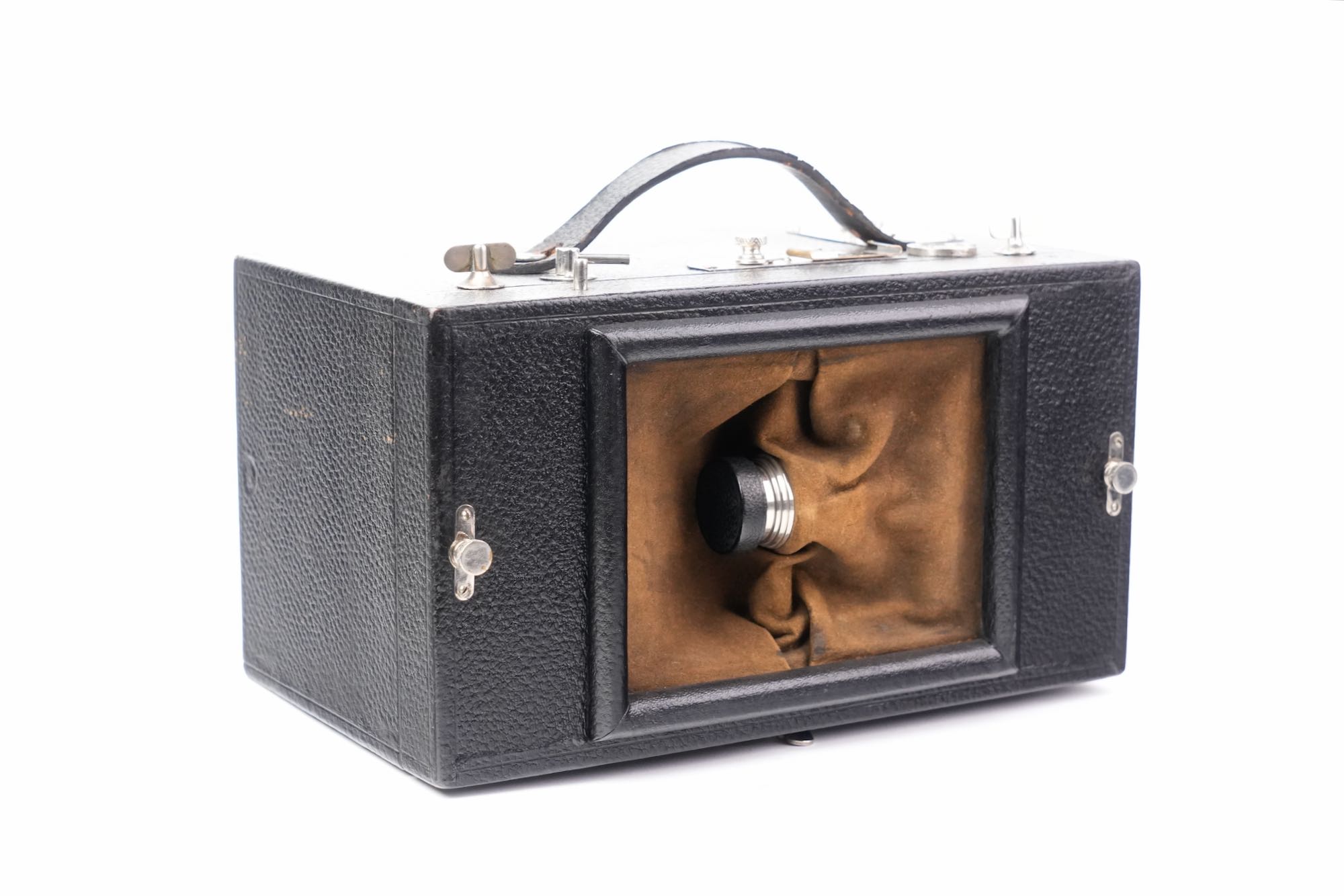 Al-Vista Panoramic Camera, produite vers 1898–1905 par The Multiscope & Film Company à Burlington (Wisconsin, États-Unis), est un appareil photographique panoramique à rotation horizontale conçu pour capturer des images jusqu’à environ 150° sur un film disposé en arc de cercle. Son boîtier en bois gainé de cuir noir, muni d’une poignée supérieure et d’un soufflet en tissu brun protégeant l’objectif, renferme un mécanisme permettant la rotation synchronisée de la lentille pendant l’exposition. L’appareil est accompagné d’un jeu d’ailettes métalliques interchangeables, de tailles variées, servant à réguler la vitesse de rotation de l’objectif — et donc le temps d’exposition — selon les conditions de lumière. Une table d’exposition imprimée figure à l’intérieur du couvercle. Certaines versions de l’Al-Vista pouvaient accepter plusieurs formats de film souple, offrant ainsi une flexibilité d’usage pour différentes largeurs d’image panoramique.