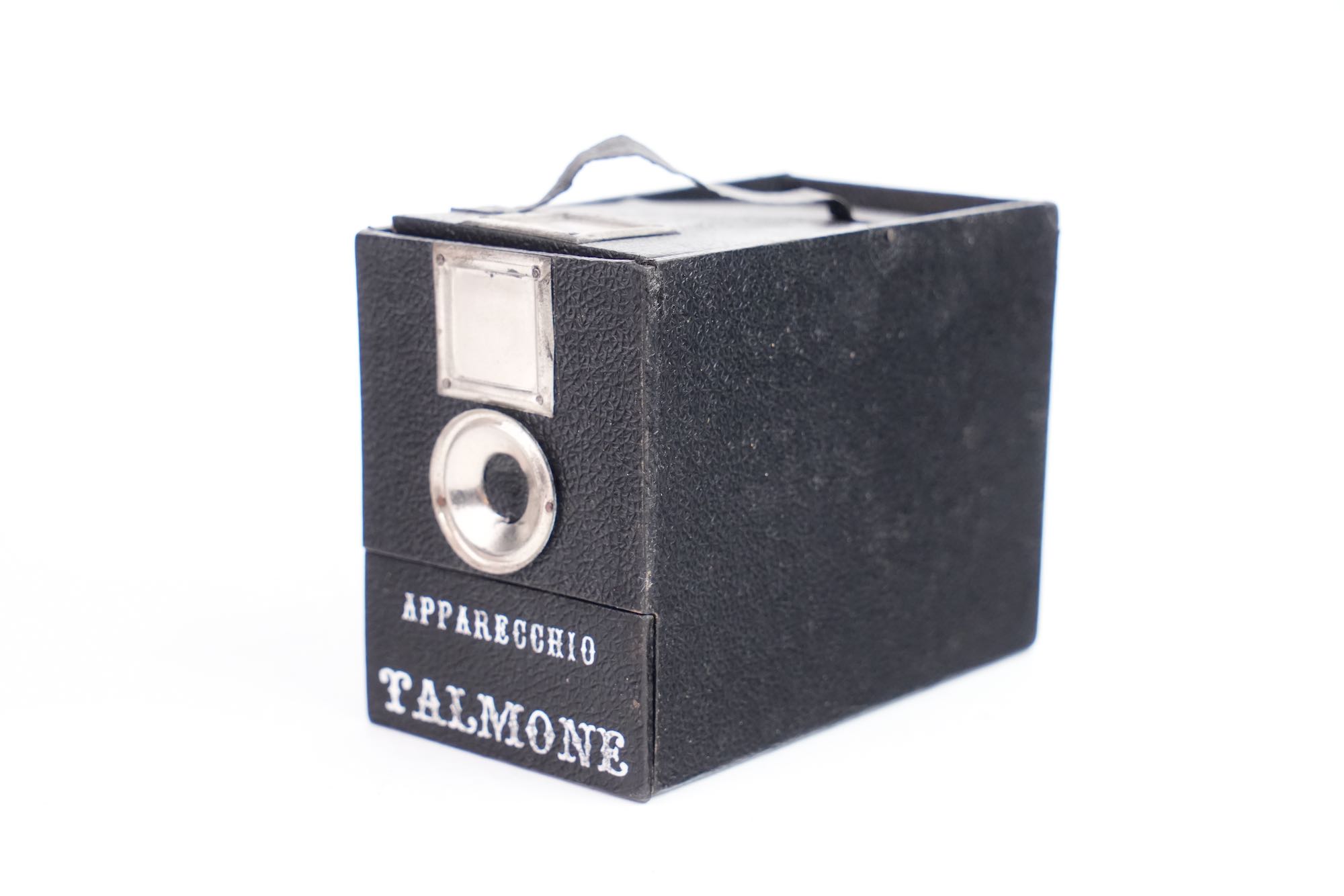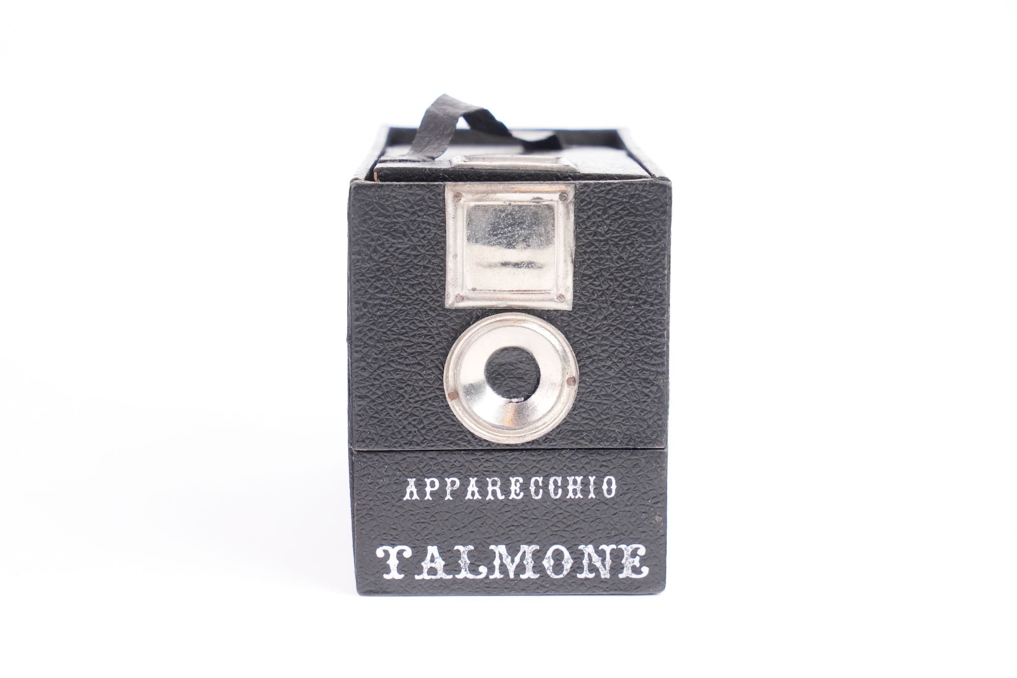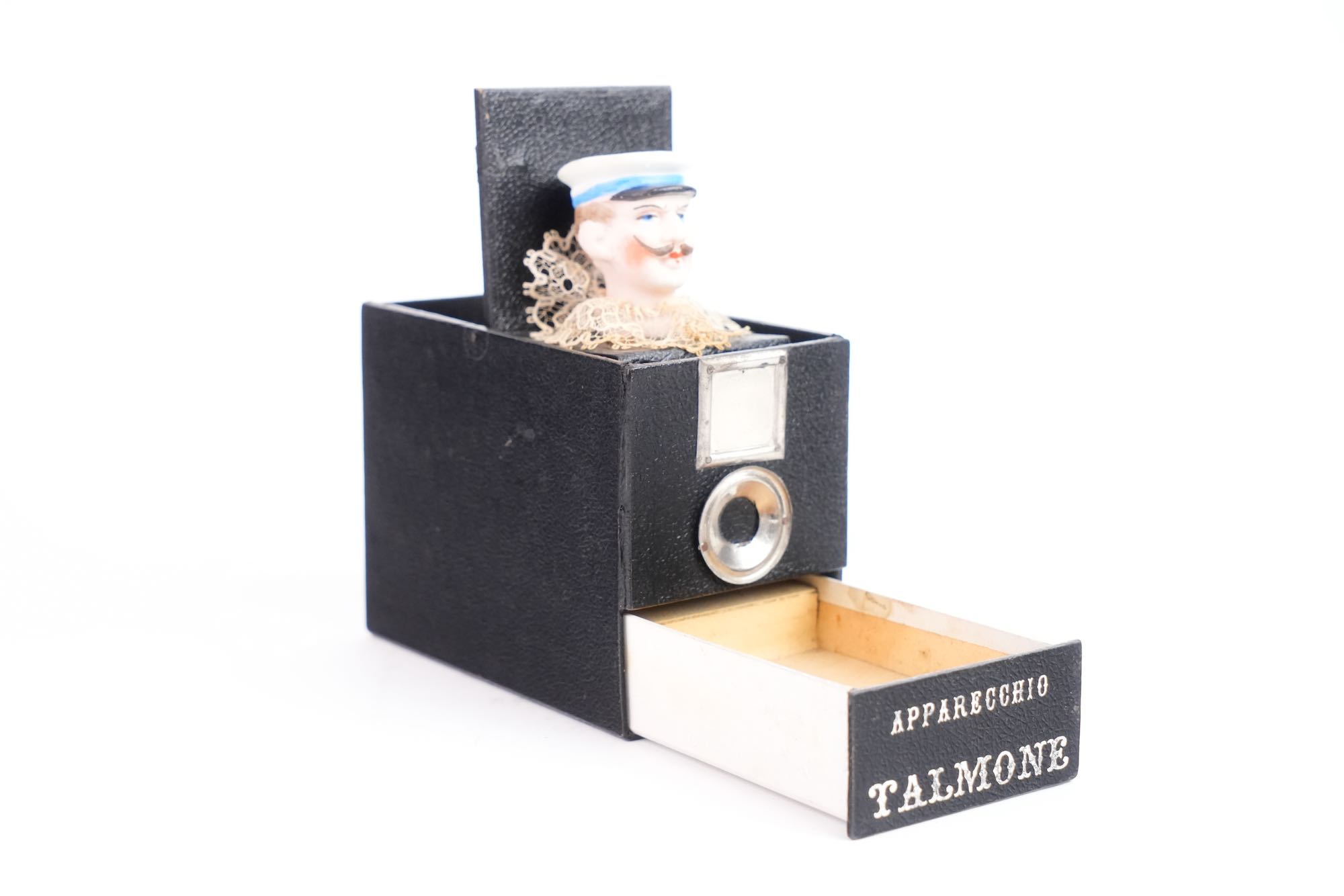 Apparecchio Talmone, Italie, fin XIXᵉ – début XXᵉ siècle. Objet de farce prenant l’apparence d’un appareil photographique, destiné à piéger le public plutôt qu’à produire des images. Présenté comme une caméra, ce boîtier en carton gainé, doté de fausses lentilles et d’un faux viseur, dissimule un mécanisme à tiroir déclenchant l’apparition soudaine d’un personnage dont la tête est en porcelaine, provoquant surprise et amusement au moment supposé de la prise de vue. Ces « caméras attrape » étaient diffusées dans les foires et commerces de curiosités.