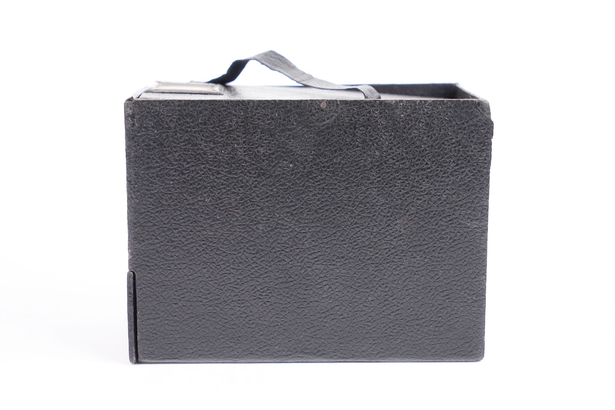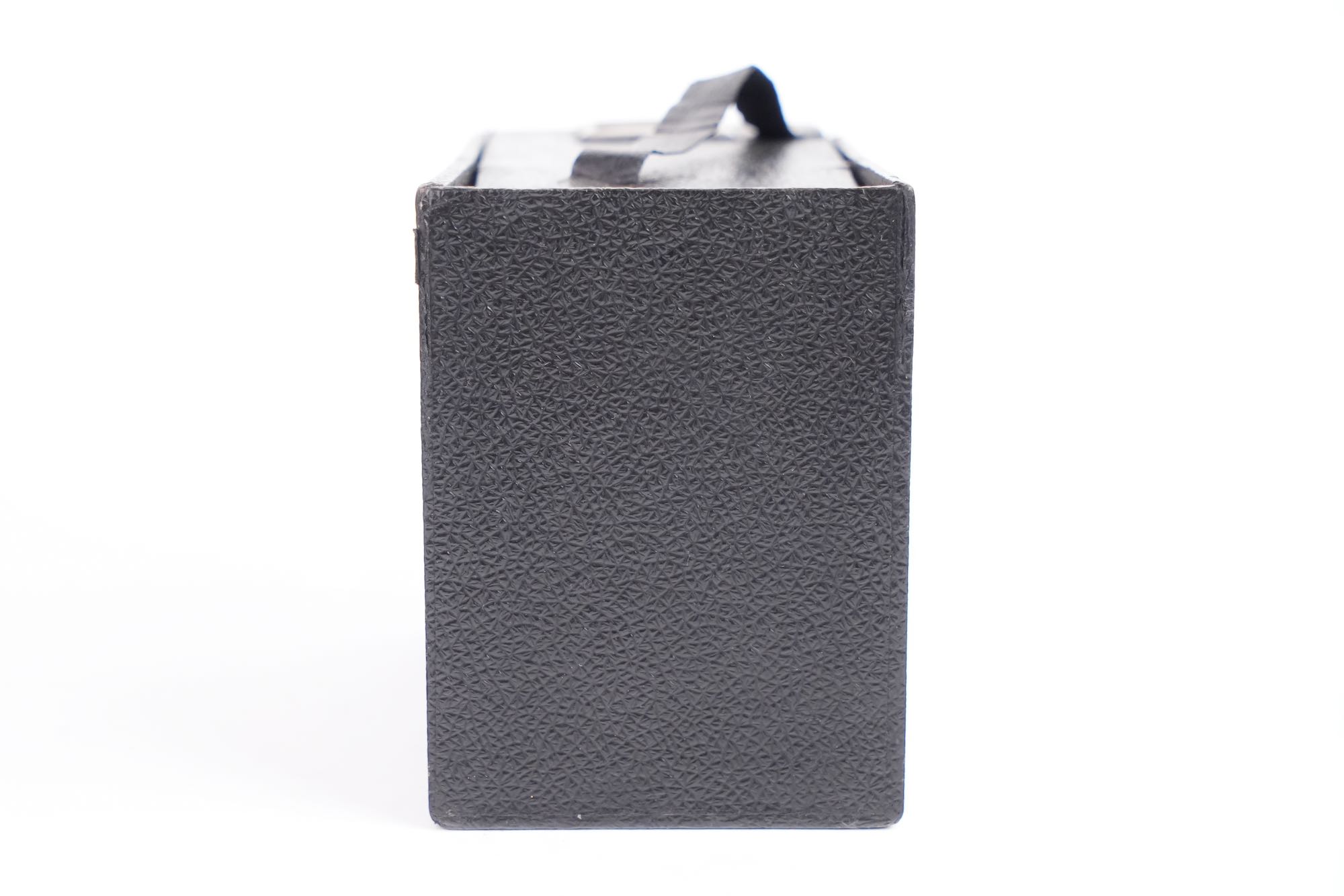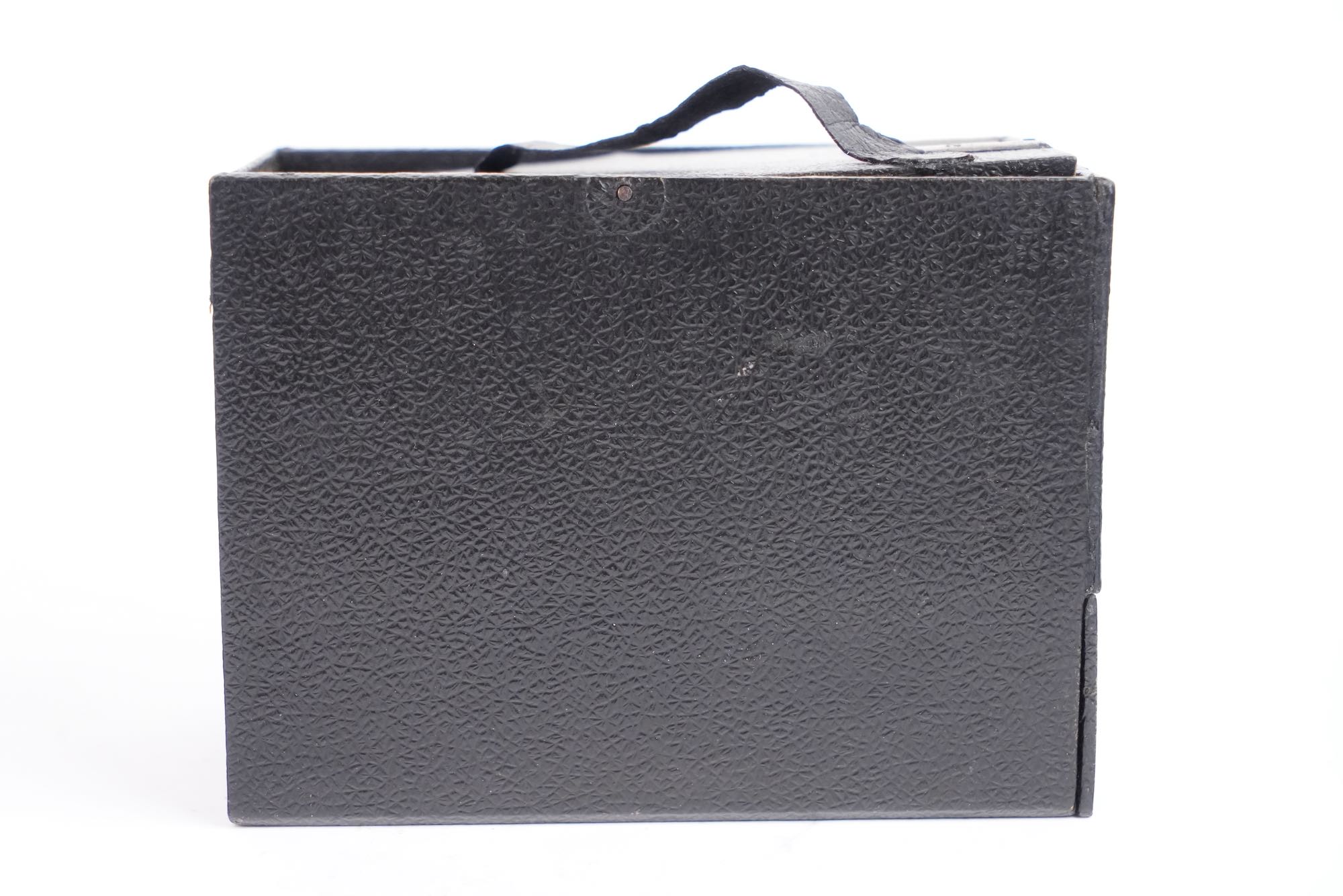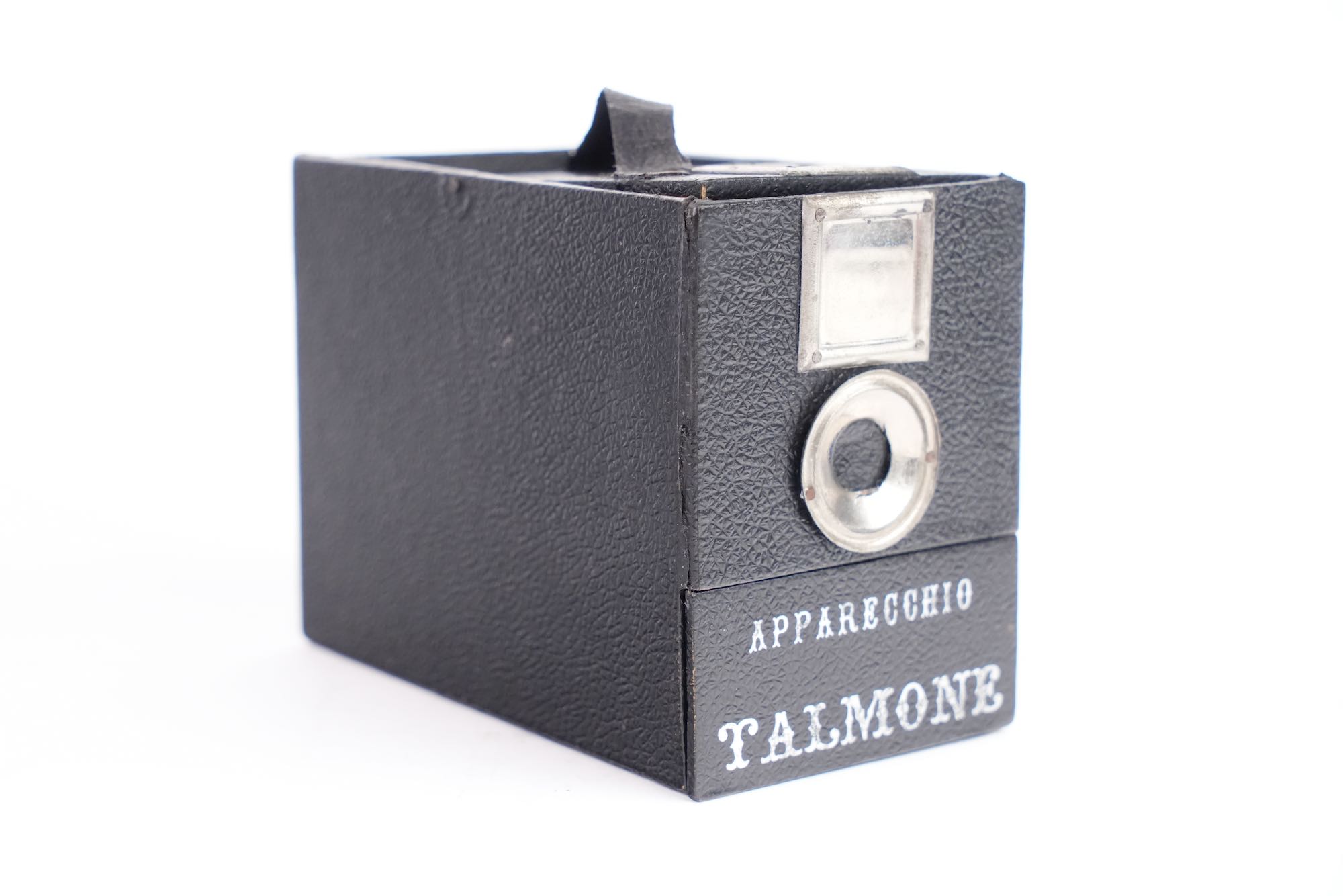 Apparecchio Talmone, Italie, fin XIXᵉ – début XXᵉ siècle. Objet de farce prenant l’apparence d’un appareil photographique, destiné à piéger le public plutôt qu’à produire des images. Présenté comme une caméra, ce boîtier en carton gainé, doté de fausses lentilles et d’un faux viseur, dissimule un mécanisme à tiroir déclenchant l’apparition soudaine d’un personnage dont la tête est en porcelaine, provoquant surprise et amusement au moment supposé de la prise de vue. Ces « caméras attrape » étaient diffusées dans les foires et commerces de curiosités.