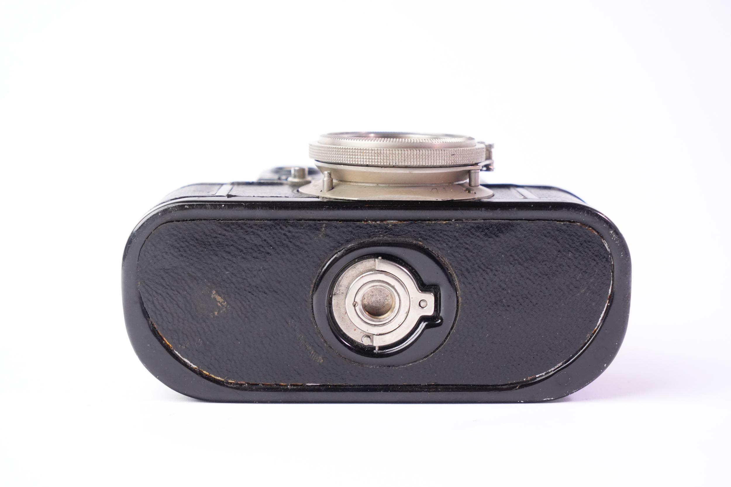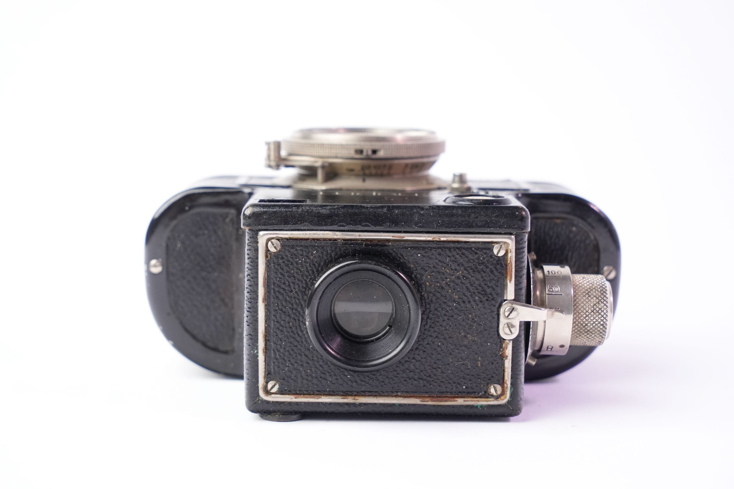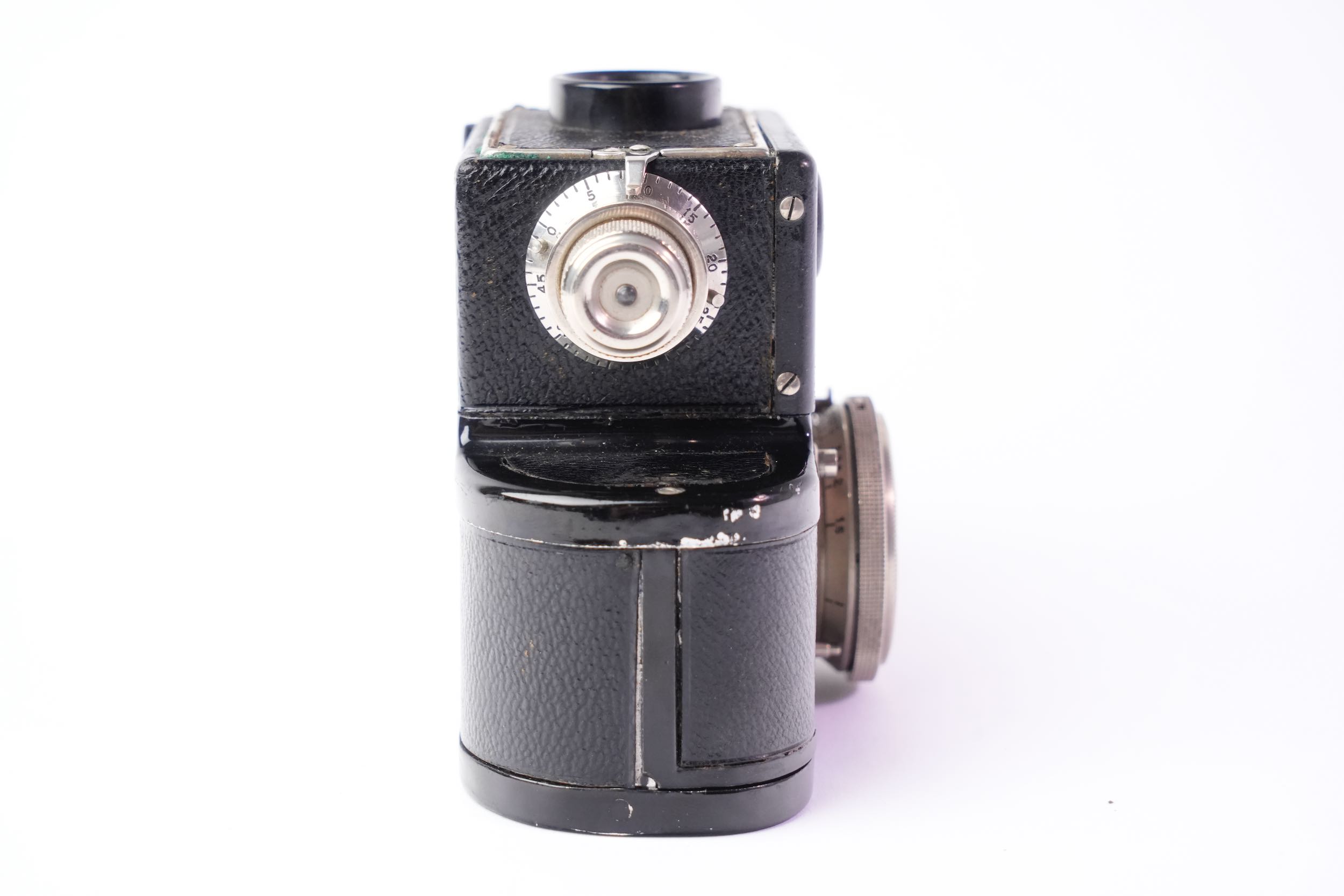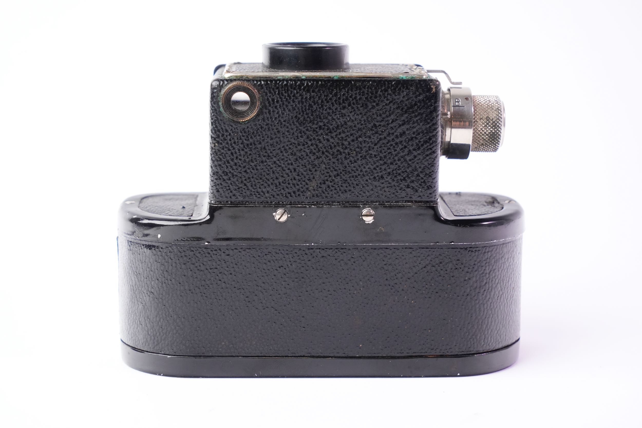Cet exemplaire est équipé de son objectif ГОМЗ Индустар-10 50 mm f/3,5, monture à baïonnette, offrant une qualité optique robuste et un rendu typiquement vintage. L’appareil se distingue par son boîtier métallique gainé de cuir noir, son viseur reflex rudimentaire et son mécanisme d’avance intégré, novateur pour son temps.