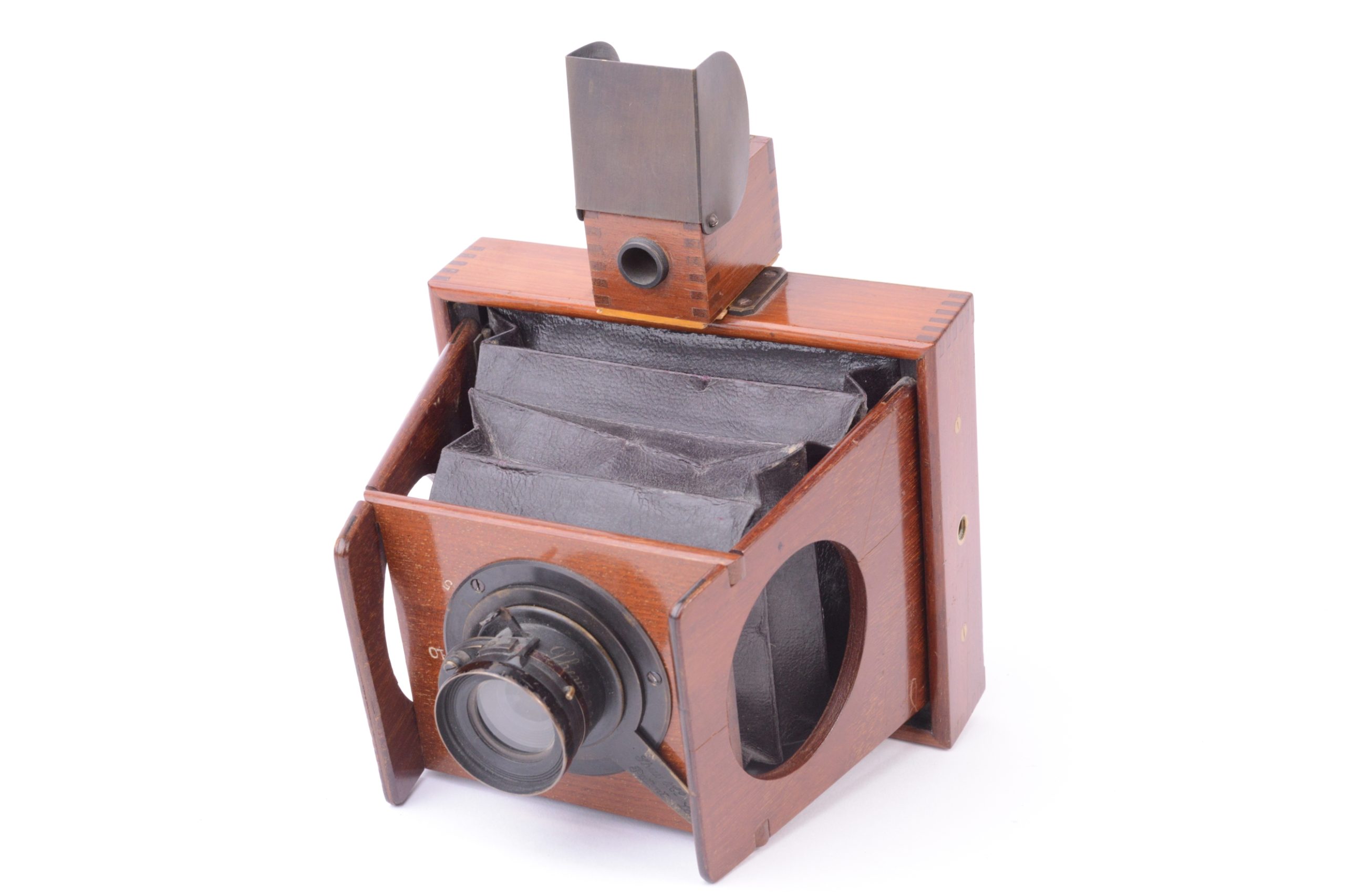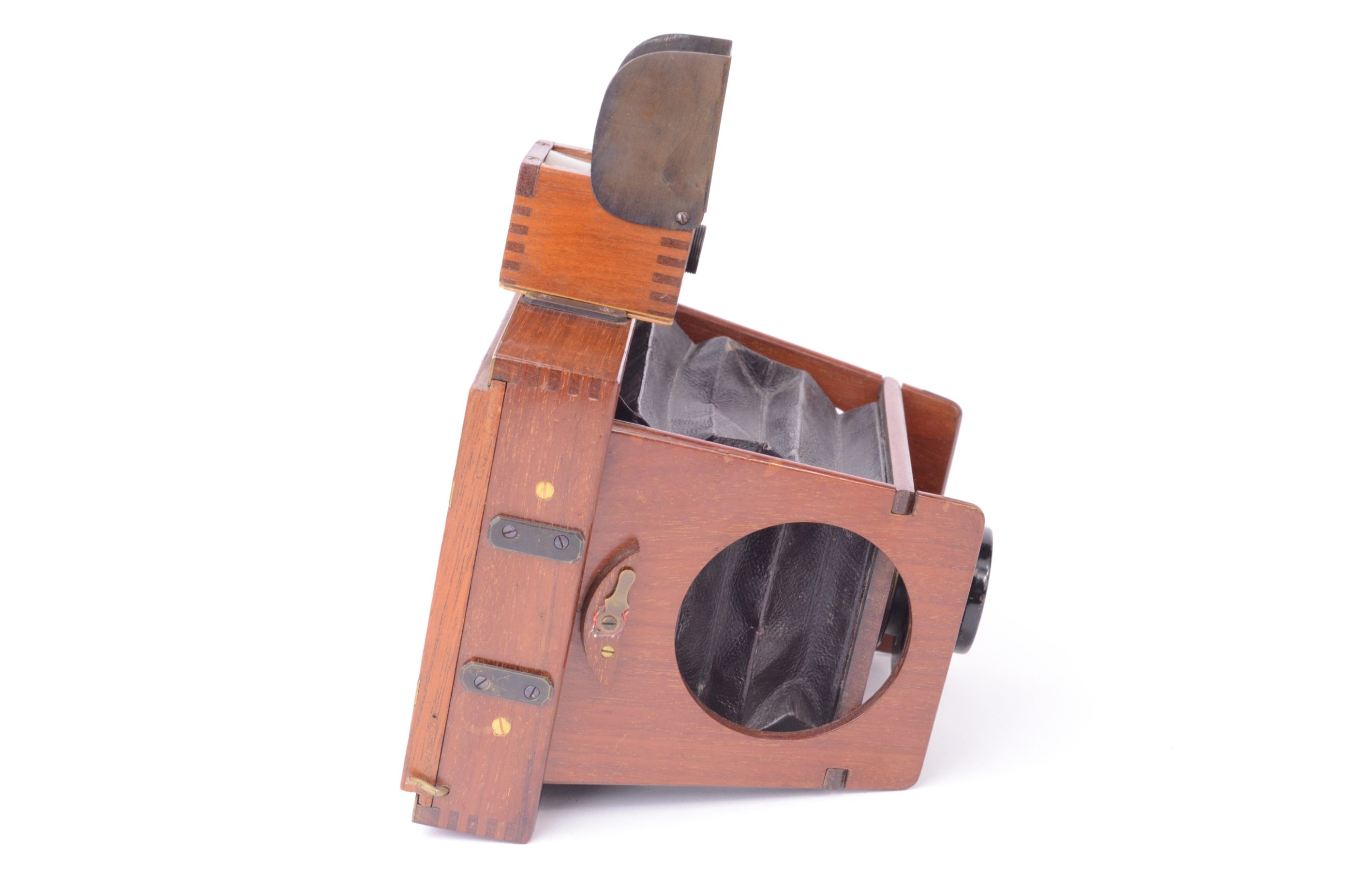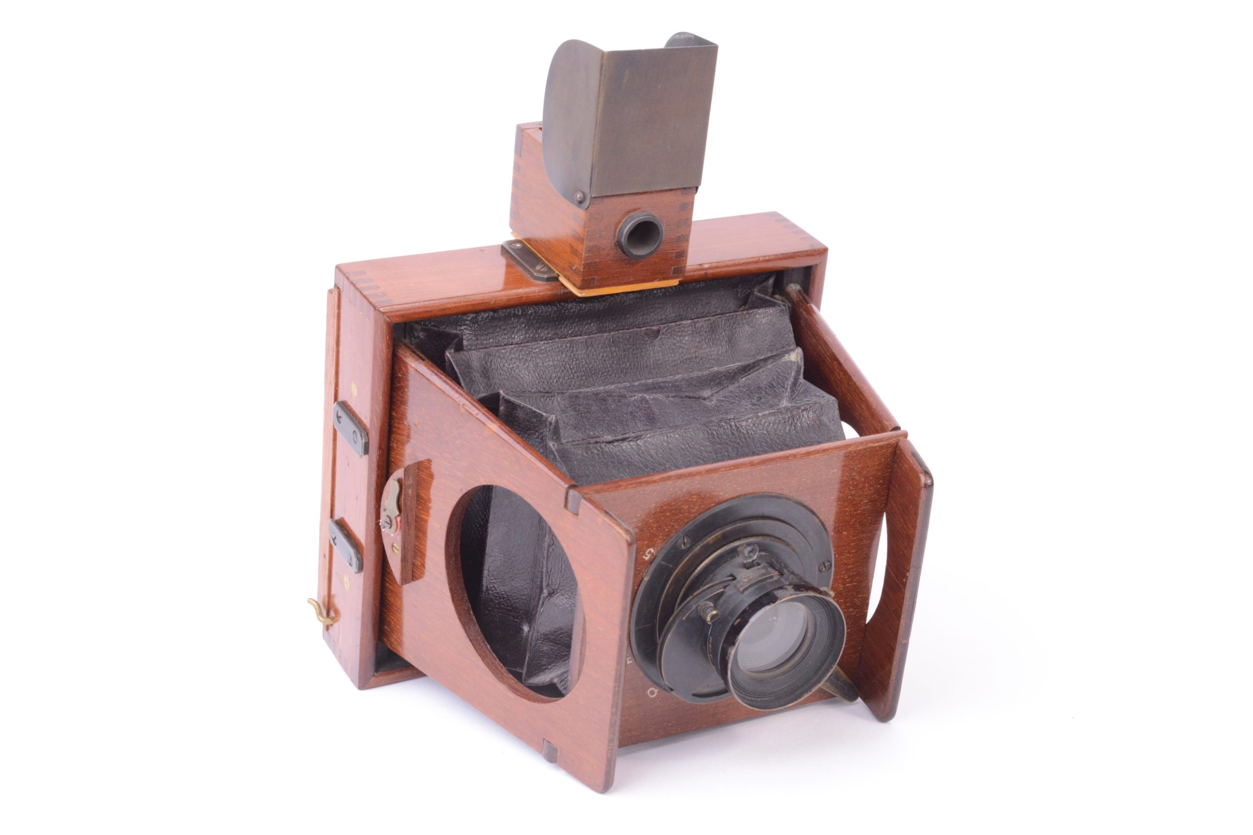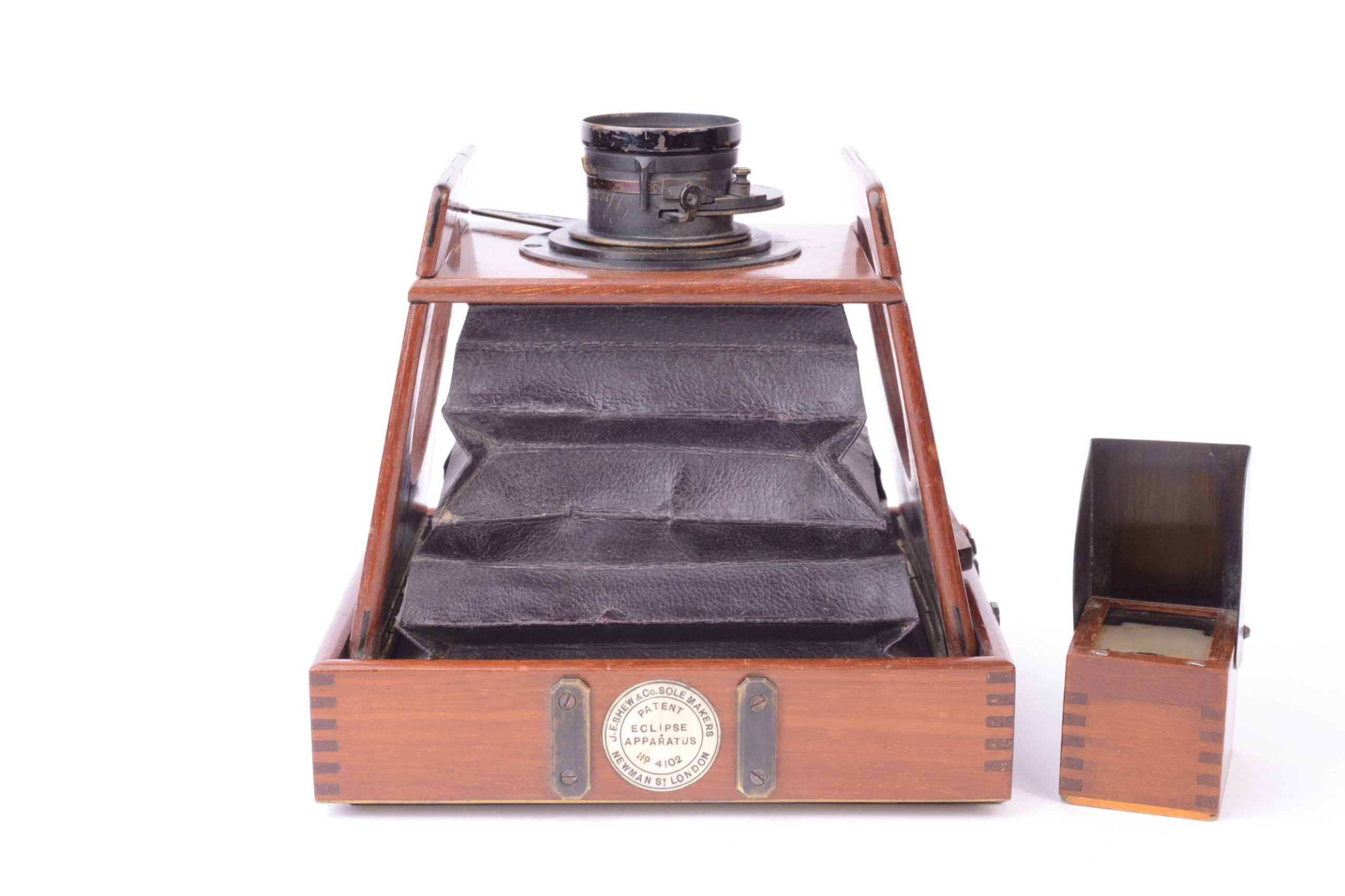 Chambre photographique à joues de Shew & CO London. Format 8x9 cm. Plaque circulaire en ivoirine portant la marque de fabrique précisant notamment « Patent Eclipse Apparatus. – J.E. Shew & Co. Sole Markers ». Vers 1892. Corps et ailettes en acajou. Soufflet pyramidal en cuir marron et coins non rabattus. Obturateur circulaire rotatif « éclipse ». Viseur réflex direct (sur verre dépoli) cubique en bois. Cadre amovible portant le verre dépoli. Trois doubles à volets en acajou.