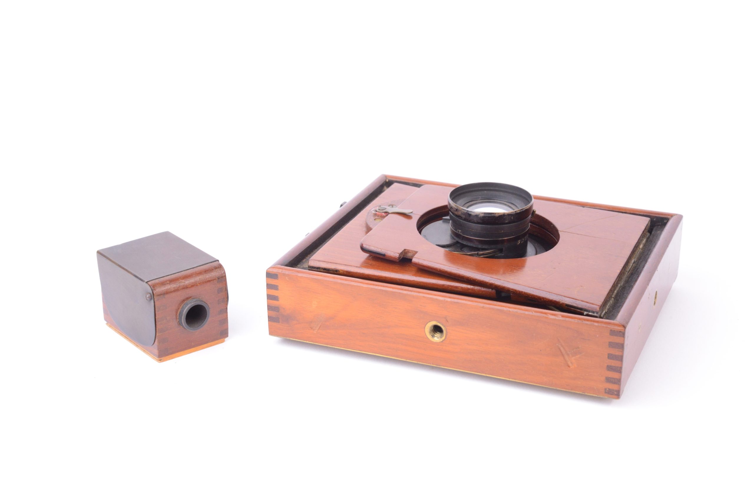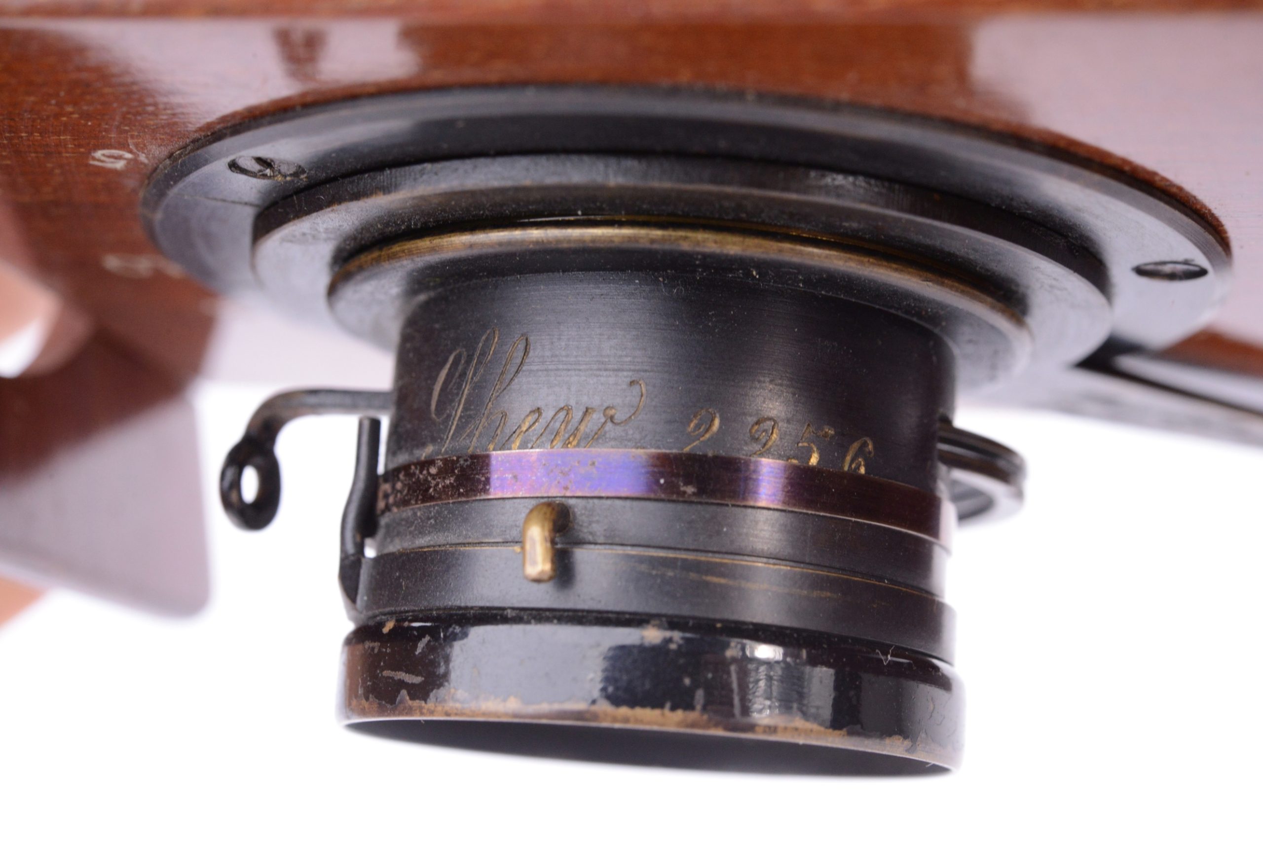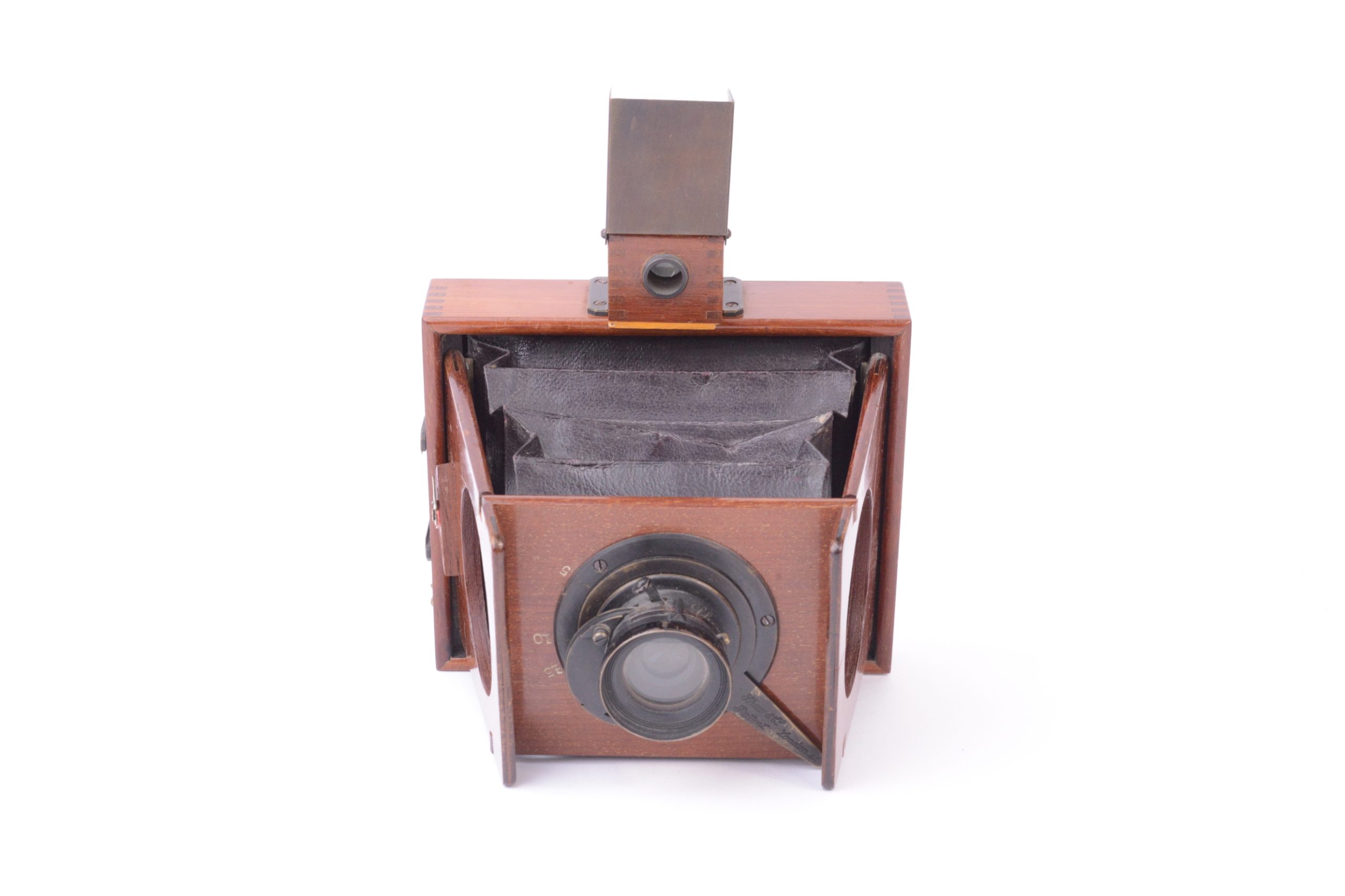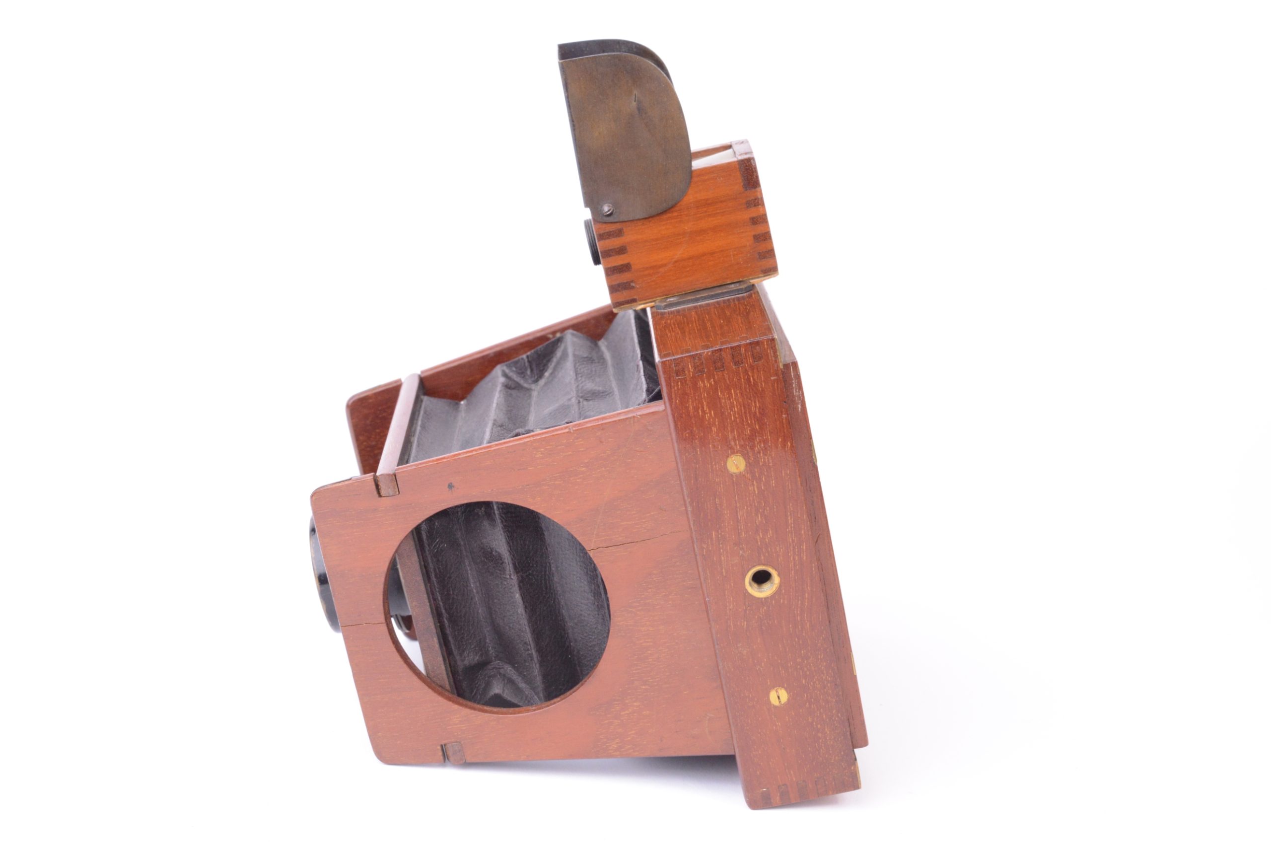 Chambre photographique à joues de Shew & CO London. Format 8x9 cm. Plaque circulaire en ivoirine portant la marque de fabrique précisant notamment « Patent Eclipse Apparatus. – J.E. Shew & Co. Sole Markers ». Vers 1892. Corps et ailettes en acajou. Soufflet pyramidal en cuir marron et coins non rabattus. Obturateur circulaire rotatif « éclipse ». Viseur réflex direct (sur verre dépoli) cubique en bois. Cadre amovible portant le verre dépoli. Trois doubles à volets en acajou.