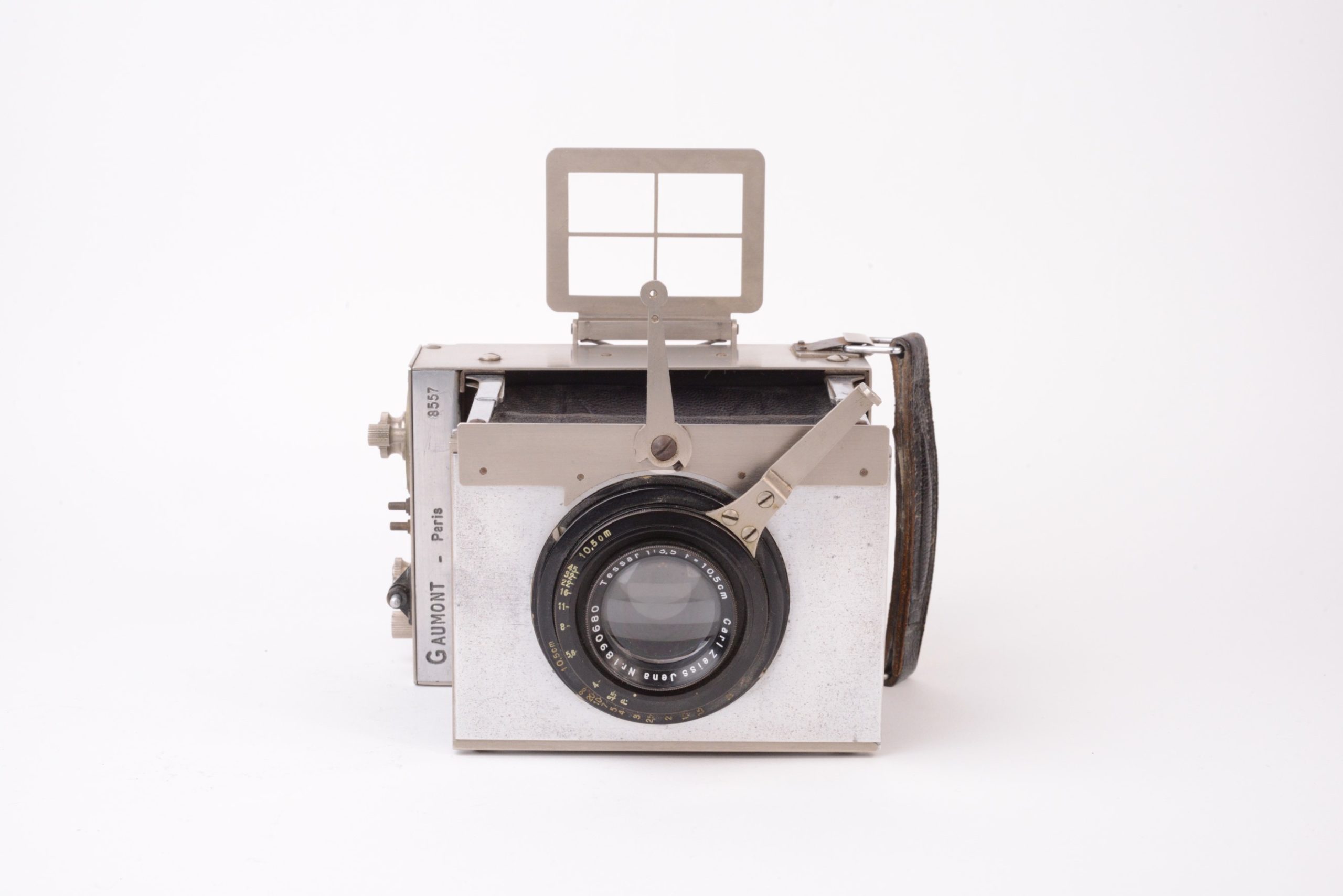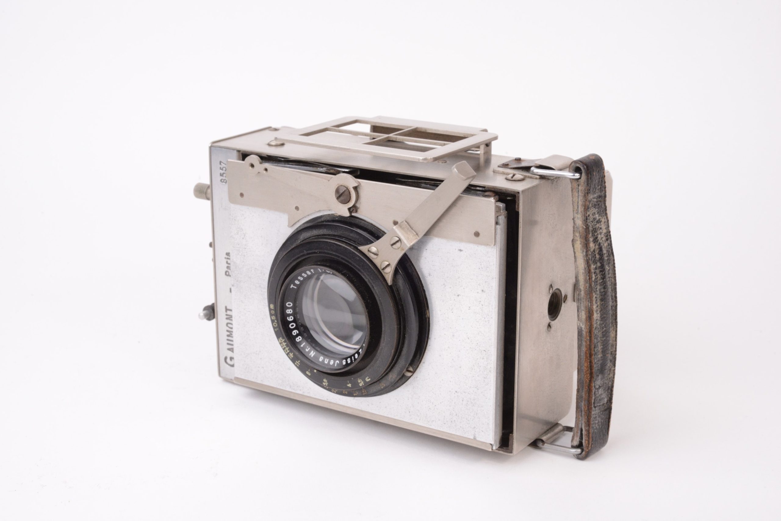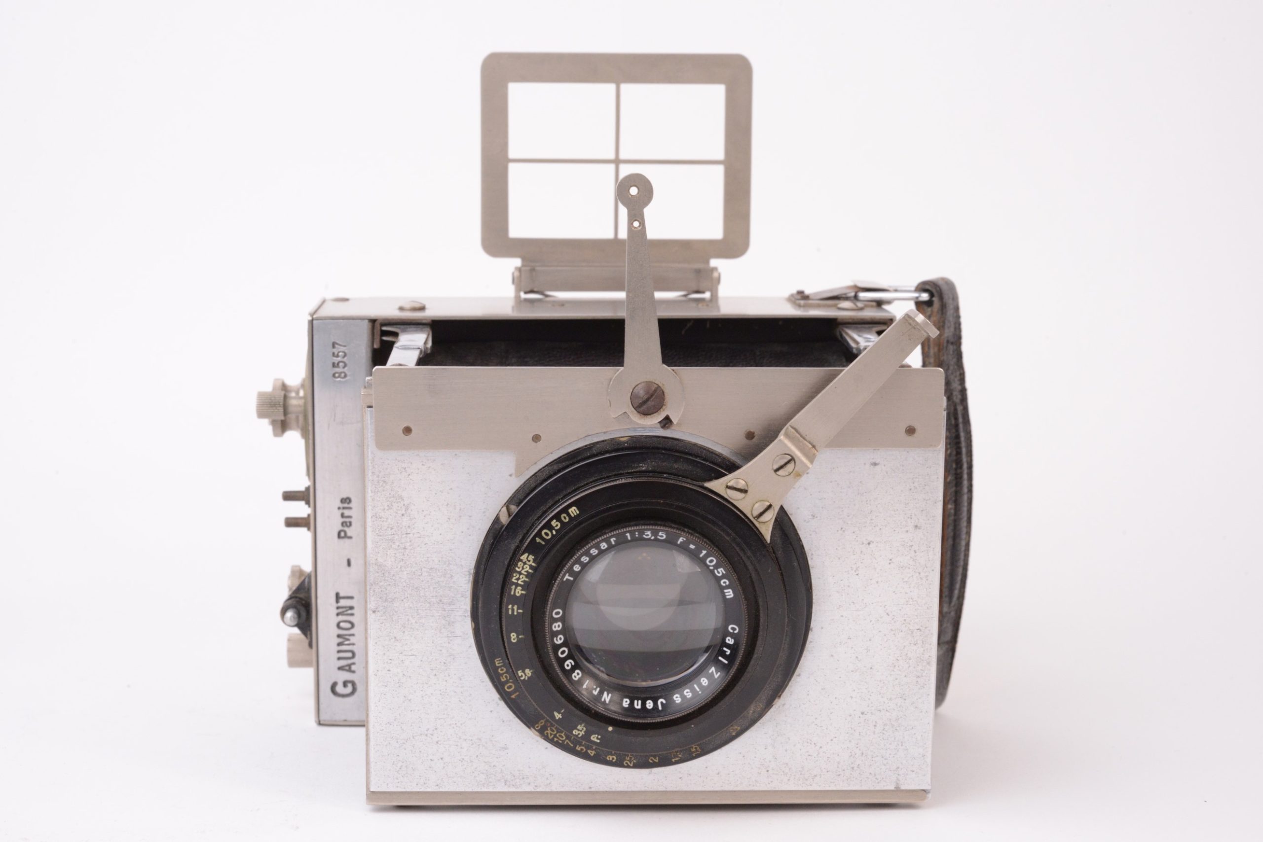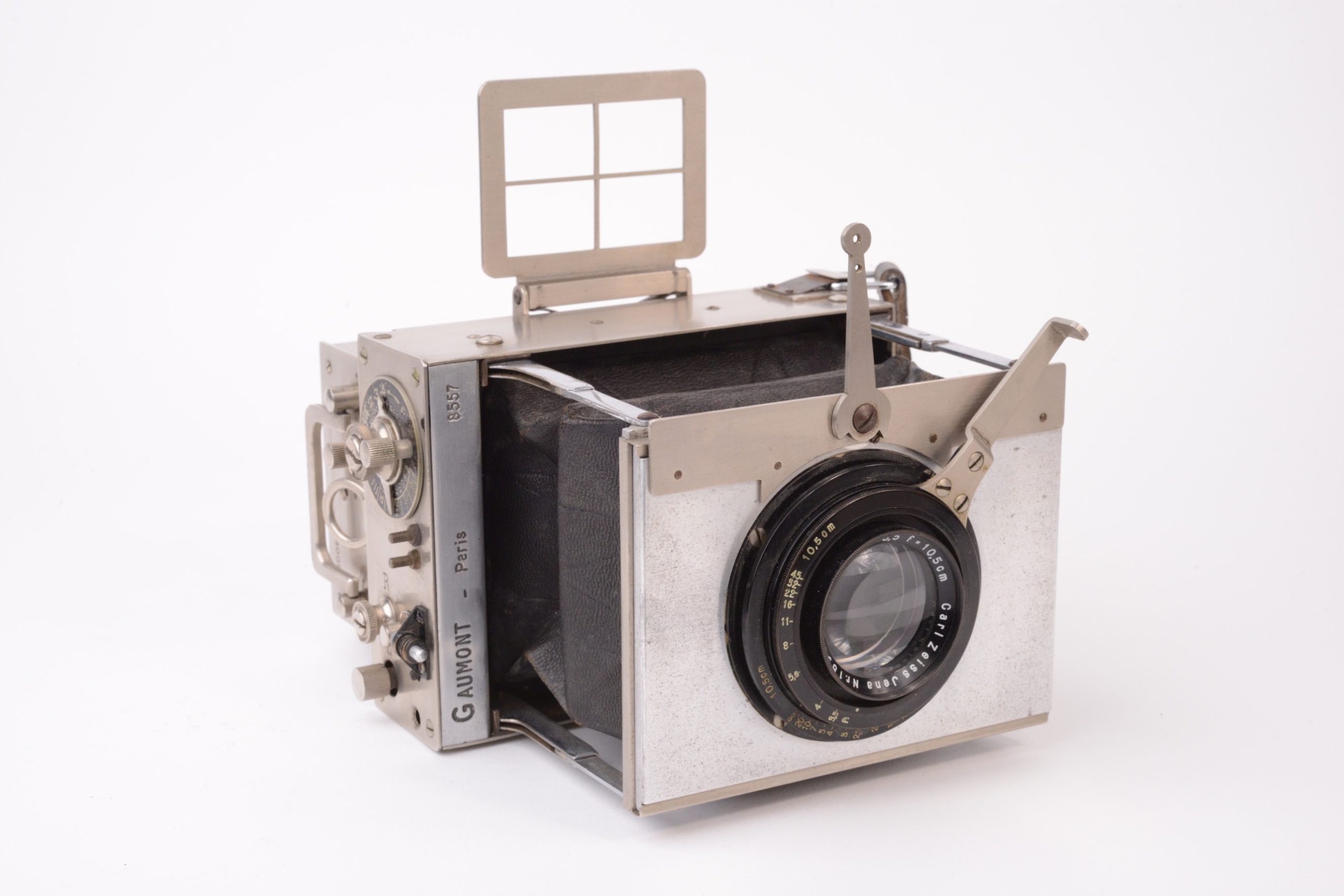Appareil de reportage Spido pliant tropical Gaumont à obturateur de plaque allant de la seconde au 1/2000°. Format 6x9 cm. La chambre est très robuste, construite en laiton nickelé et aluminium. L’objectif est à monture hélicoïdale Carl Zeiss Iéna Tessar f/3,5 de 10,5 cm. La platine avant se décentre. Les articulations des tendeurs sont extra-fortes, en acier nickelé. Le soufflet en maroquin est doublé toile. La Chambre est équipée d’un magasin à escamotage pour douze plaques avec compteur et d’un viseur sportif à large cadre. Numéro de série 8557. Années 1930. Très bel appareil, fonctionnel, rare dans ce format.