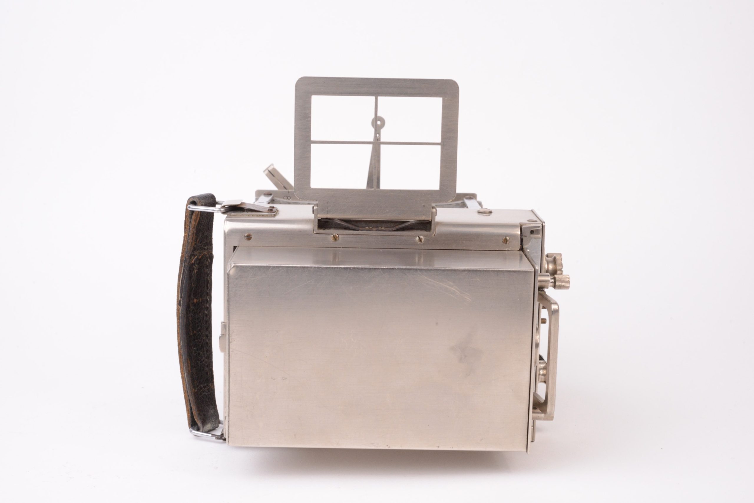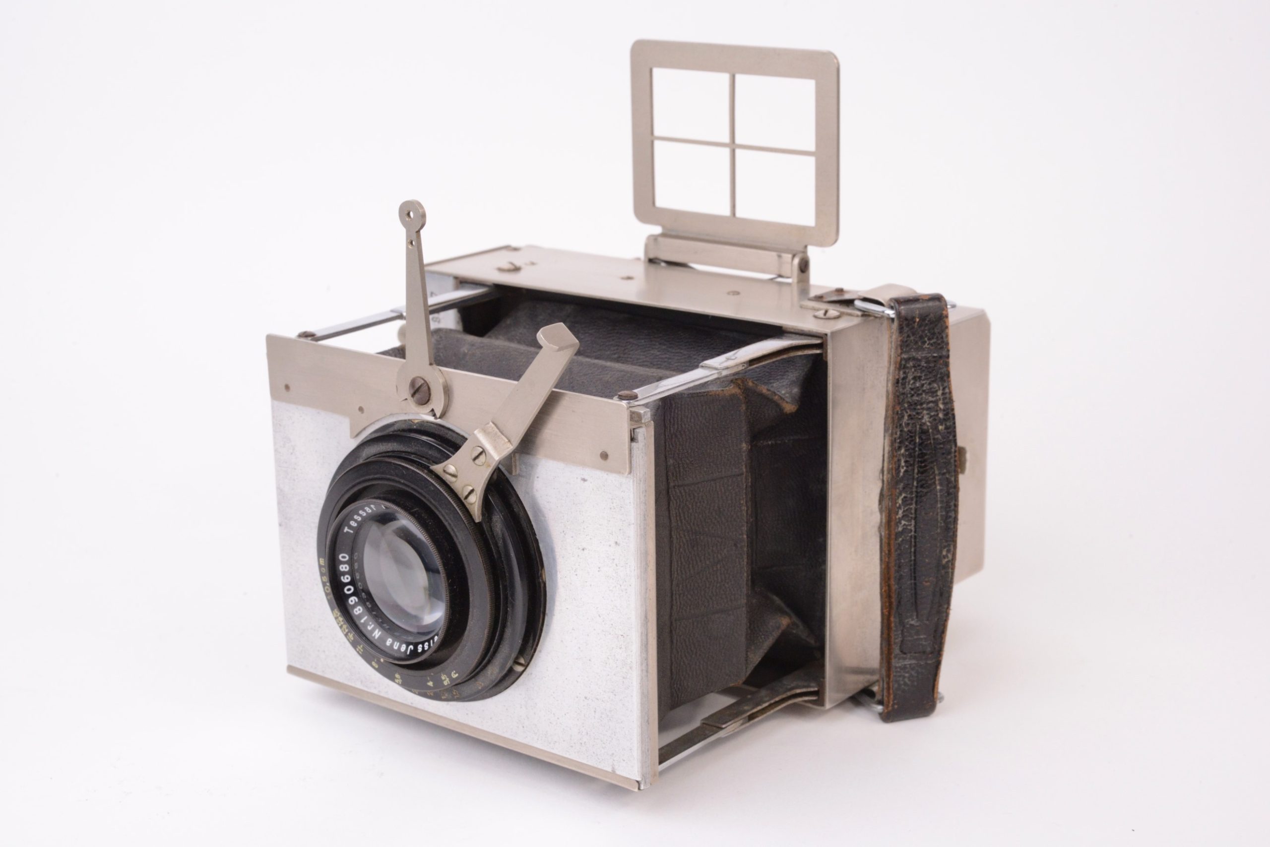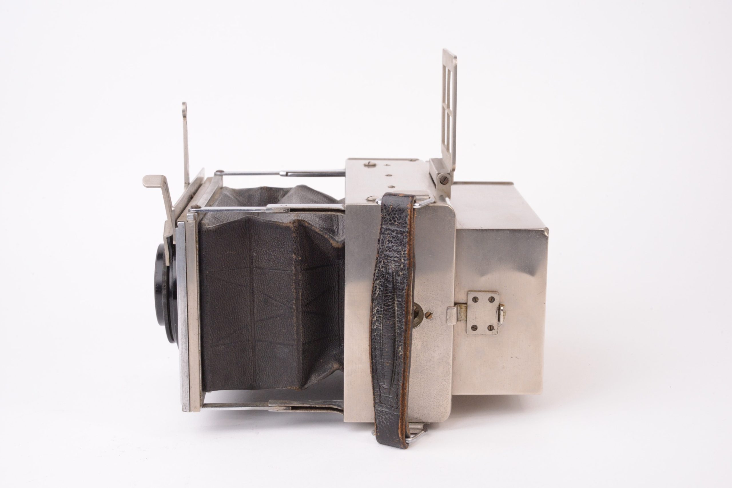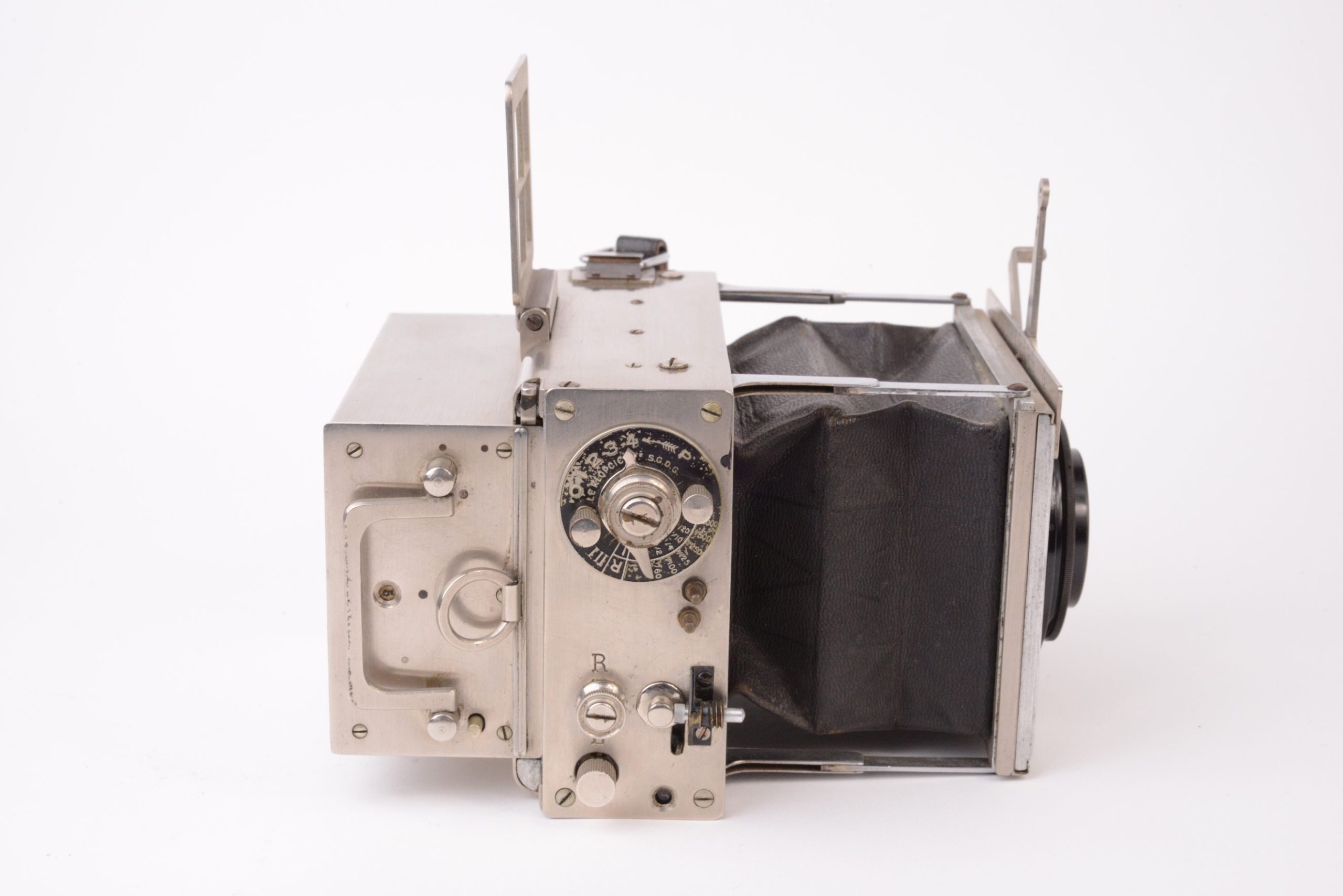 Appareil de reportage Spido pliant tropical Gaumont à obturateur de plaque allant de la seconde au 1/2000°. Format 6x9 cm. La chambre est très robuste, construite en laiton nickelé et aluminium. L’objectif est à monture hélicoïdale Carl Zeiss Iéna Tessar f/3,5 de 10,5 cm. La platine avant se décentre. Les articulations des tendeurs sont extra-fortes, en acier nickelé. Le soufflet en maroquin est doublé toile. La Chambre est équipée d’un magasin à escamotage pour douze plaques avec compteur et d’un viseur sportif à large cadre. Numéro de série 8557. Années 1930. Très bel appareil, fonctionnel, rare dans ce format.