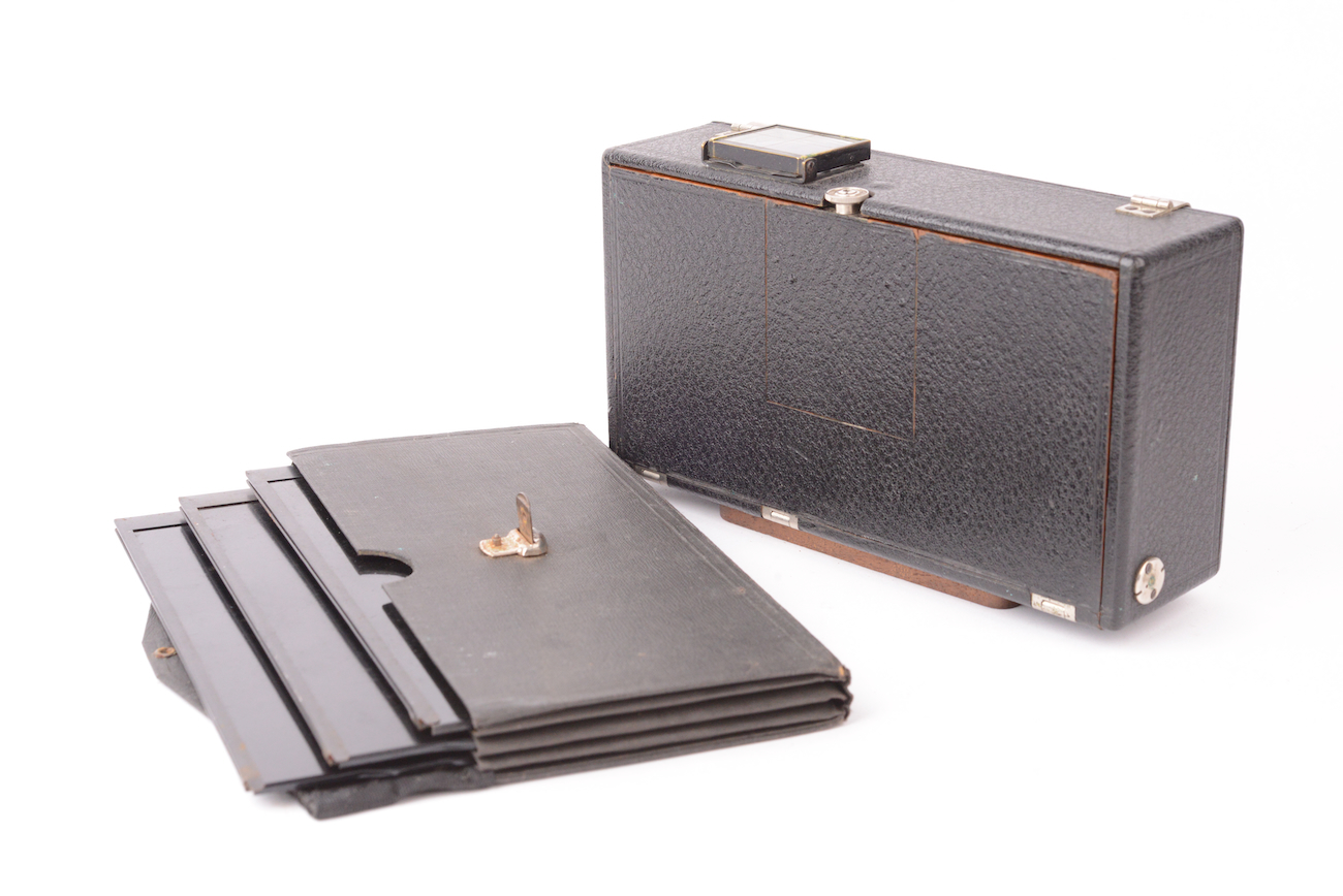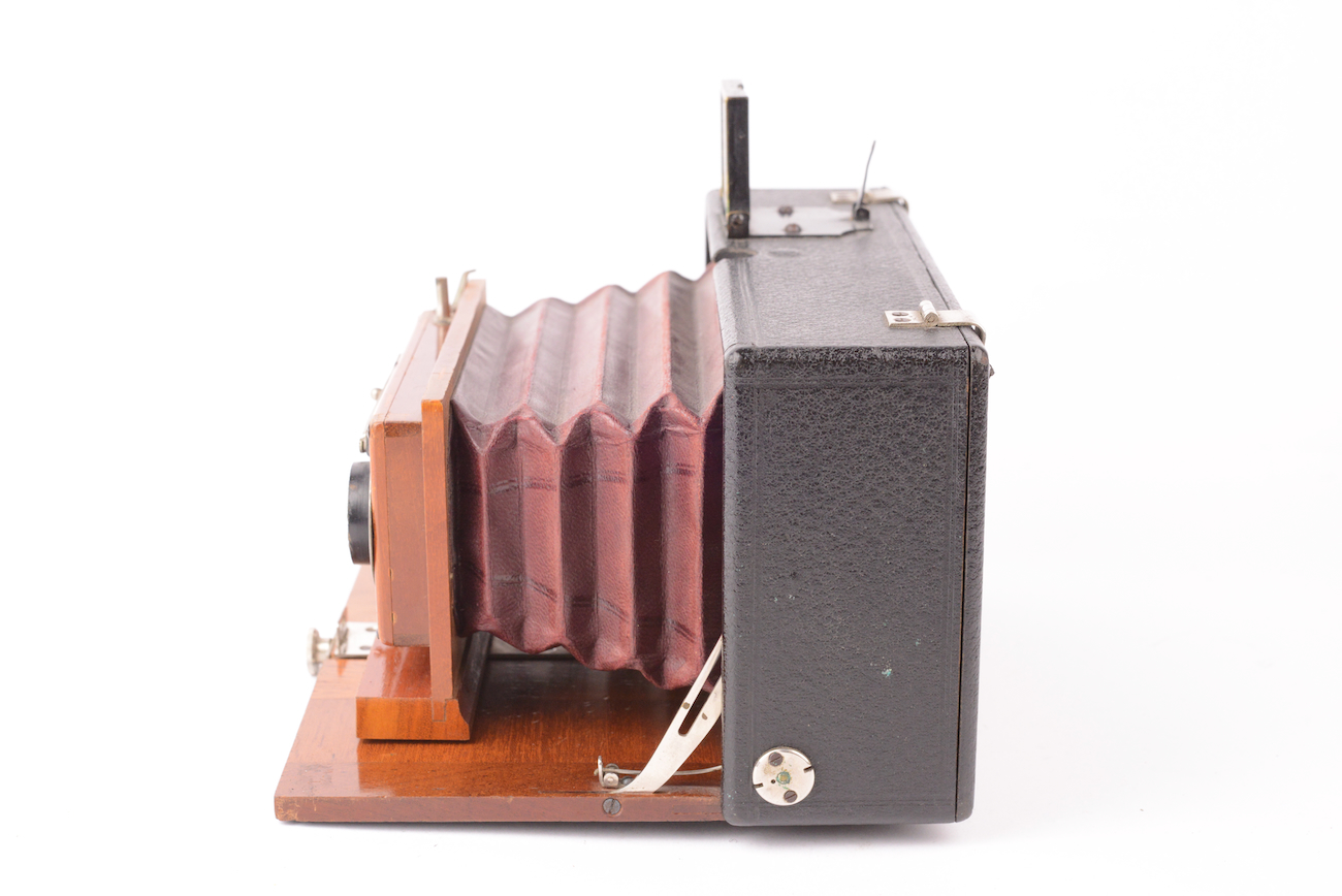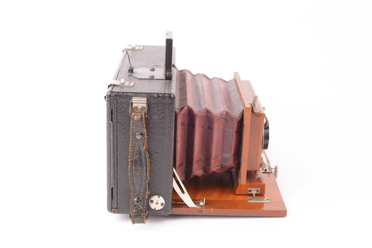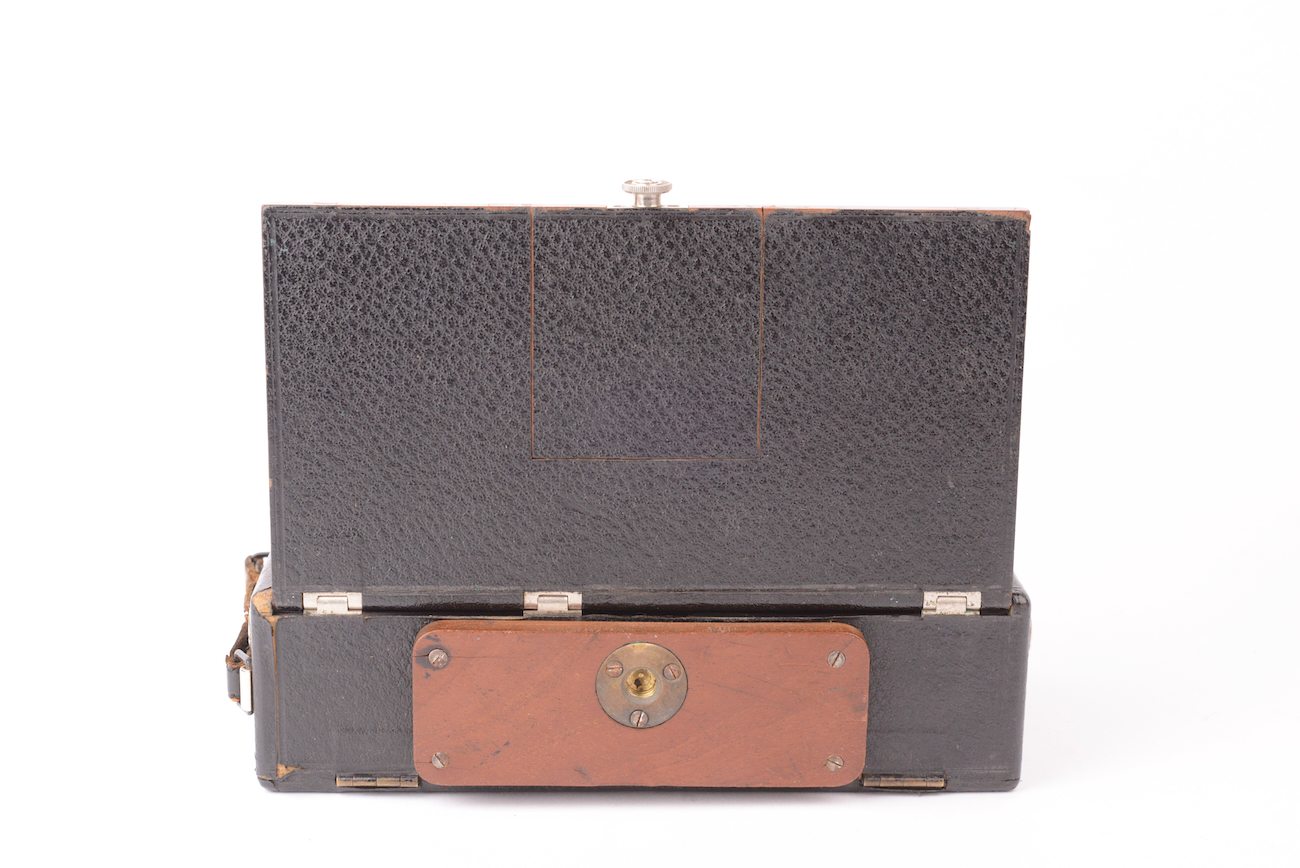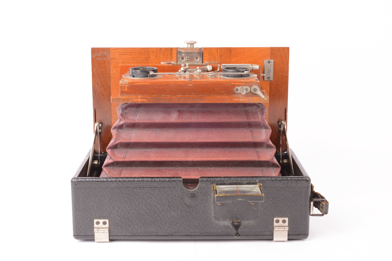 New-Folding Paris. Appareil stéréo et panoramique format 8x17, intérieur acajou, soufflet bordeaux avec châssis métalliques.
