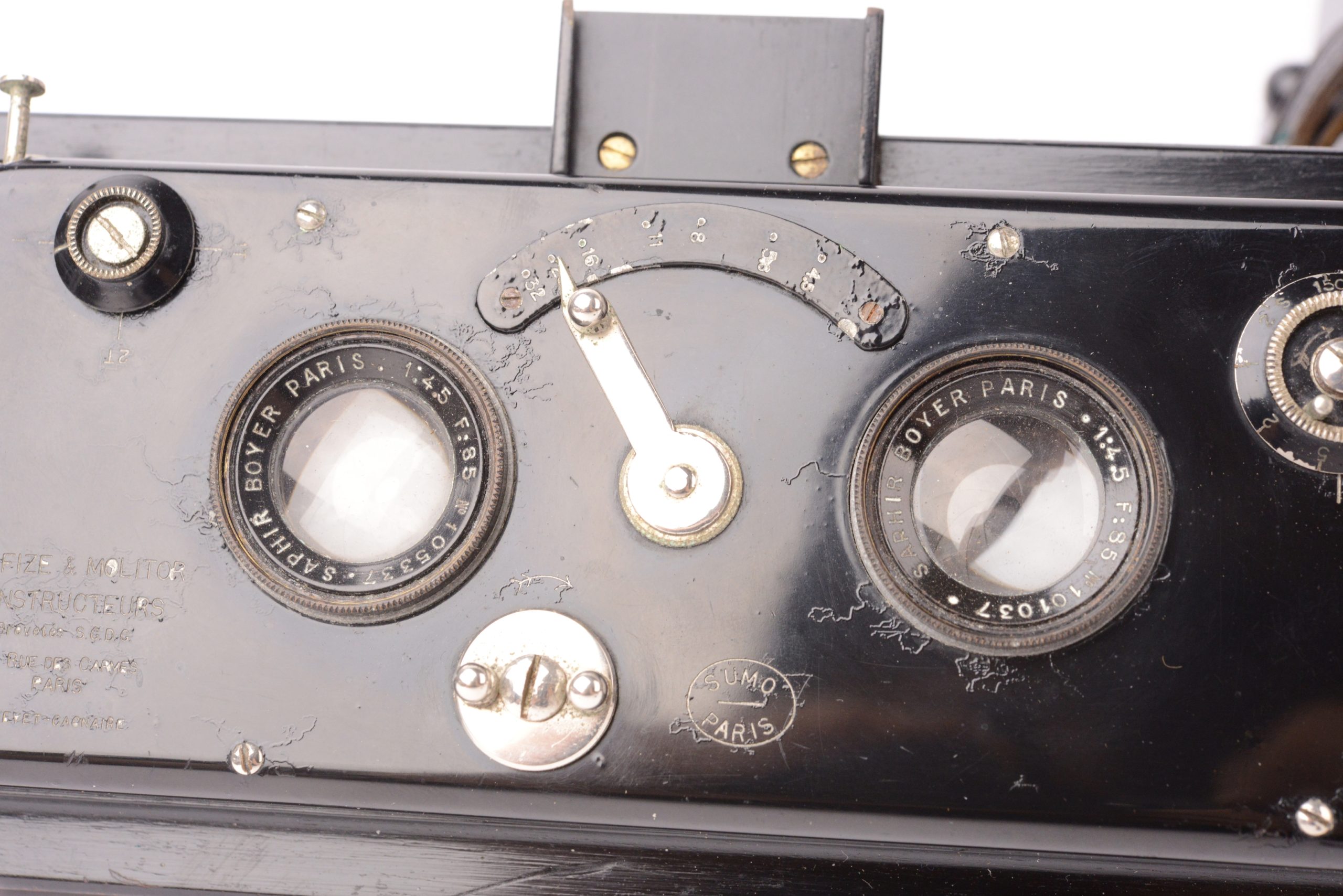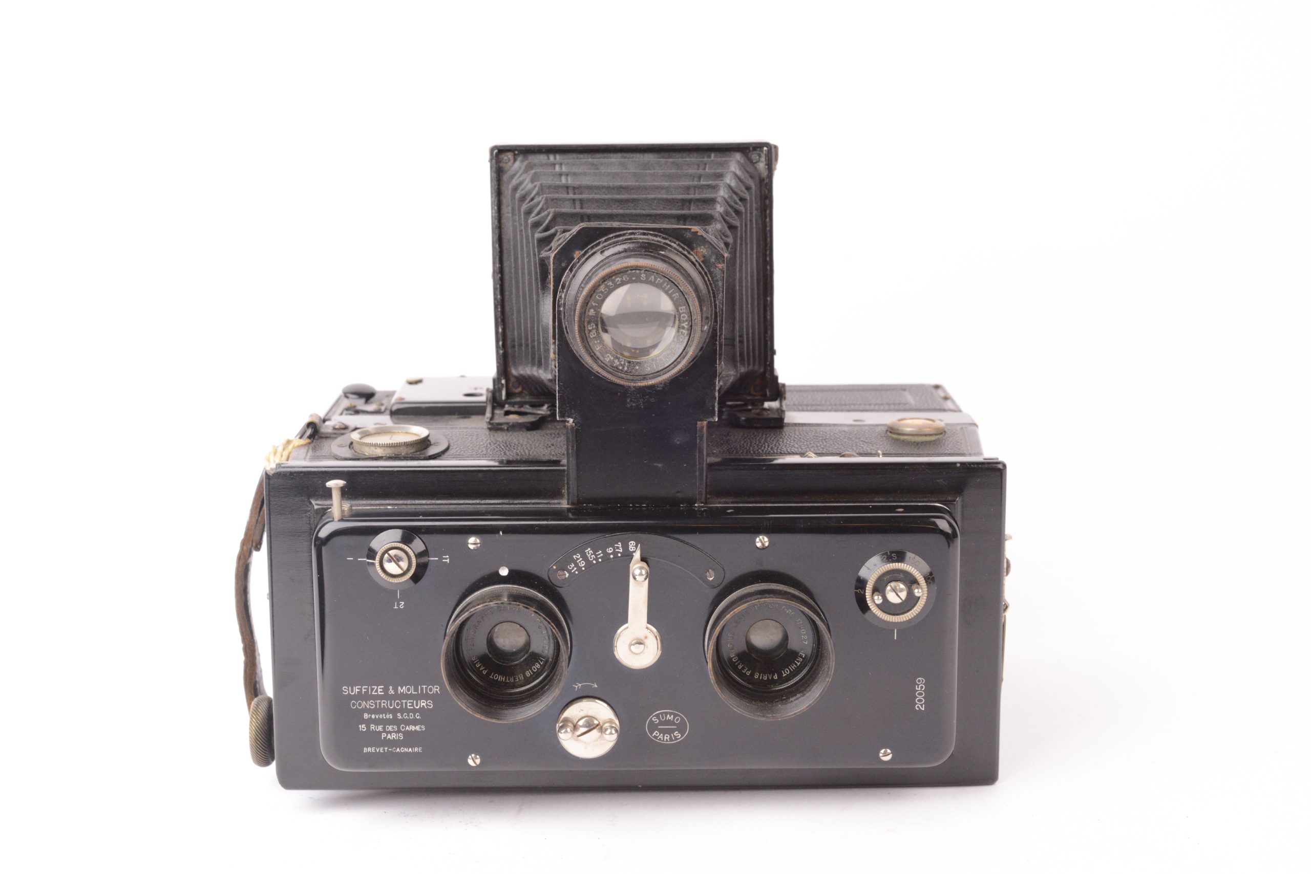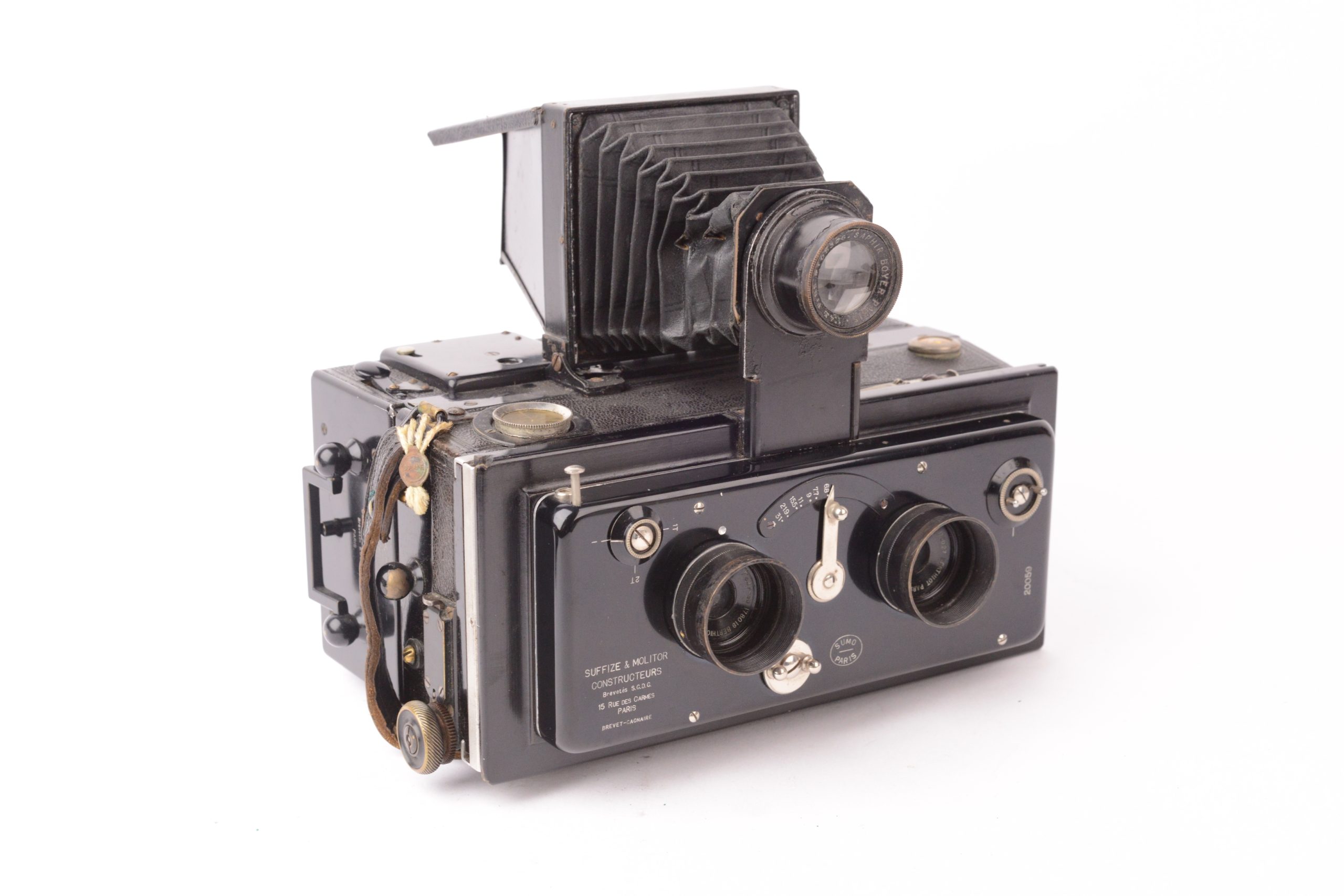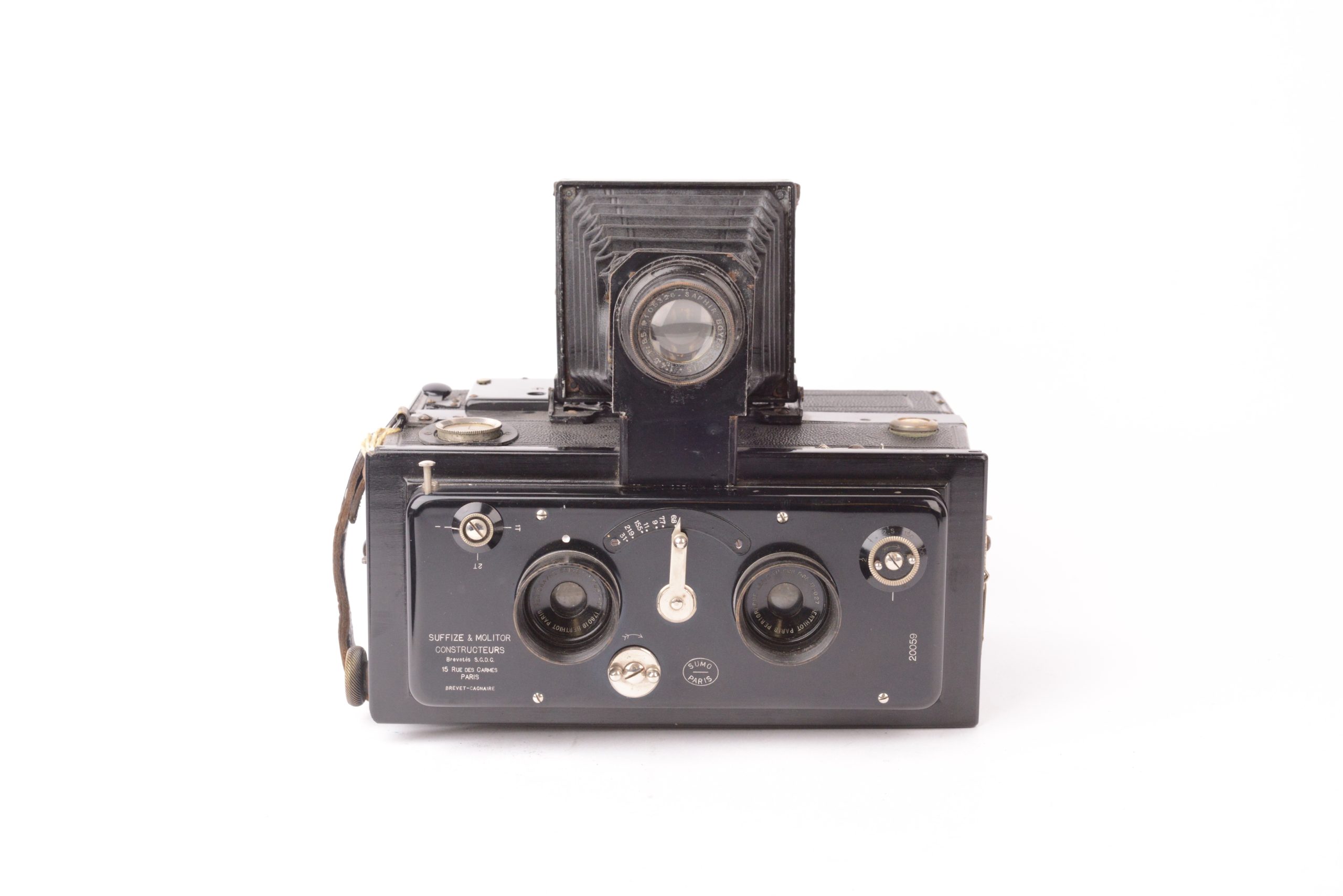 Appareil stéréoscopique Suffize & Molitor. Format 6x13. Vers 1928. L’appareil est équipé d’un dos à plaques escamotables. Le mode de visée est très particulier. Il consiste en une chambre de prise de vue amovible, pliante, à soufflet avec capuchon, dotée d’un objectif Saphir Boyer. Cette chambre prend place sur le dessus de l’appareil. L’appareil possède deux blocs optiques-obturateurs. L’un est équipé d’objectifs Saphir Boyer 1 : 4,5 / 85 mm. L’autre est équipé d’objectifs Perigraphe Berthiot 1 / 6,8 / 65 mm. Le réglage des vitesses s’effectuent par un bouton situé au-dessus de l’objectif droit de l’appareil. Celui de l’ouverture, par un bouton à glissière situé au-dessus de l’objectif gauche. La distance est réglée au moyen d’un bouton à molette situé sur le côté. Rare ensemble en excellent état.
