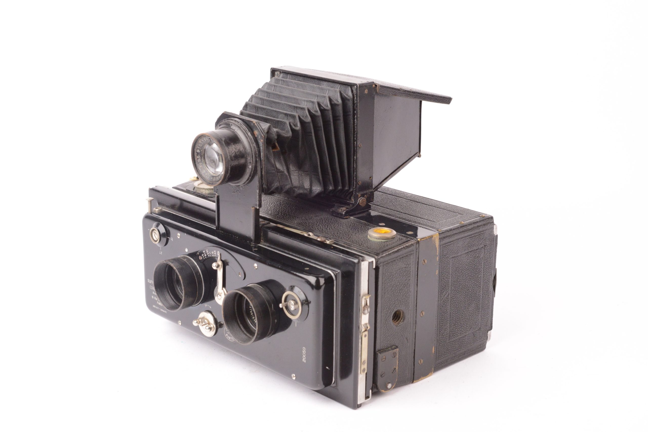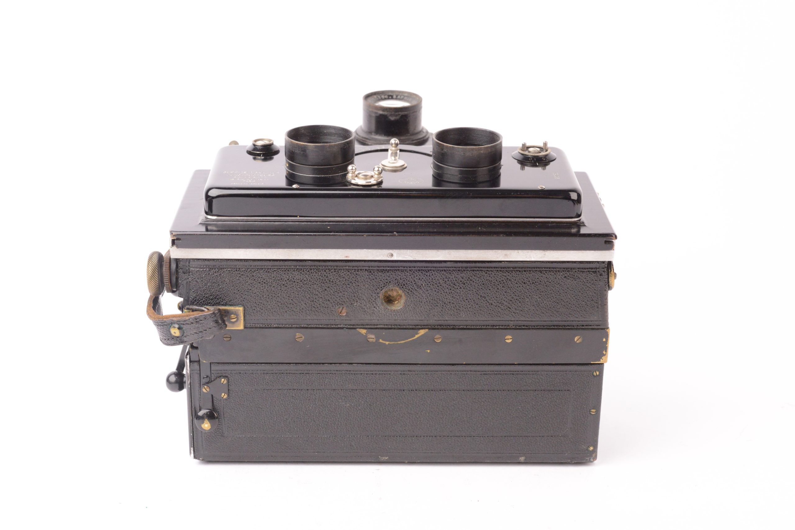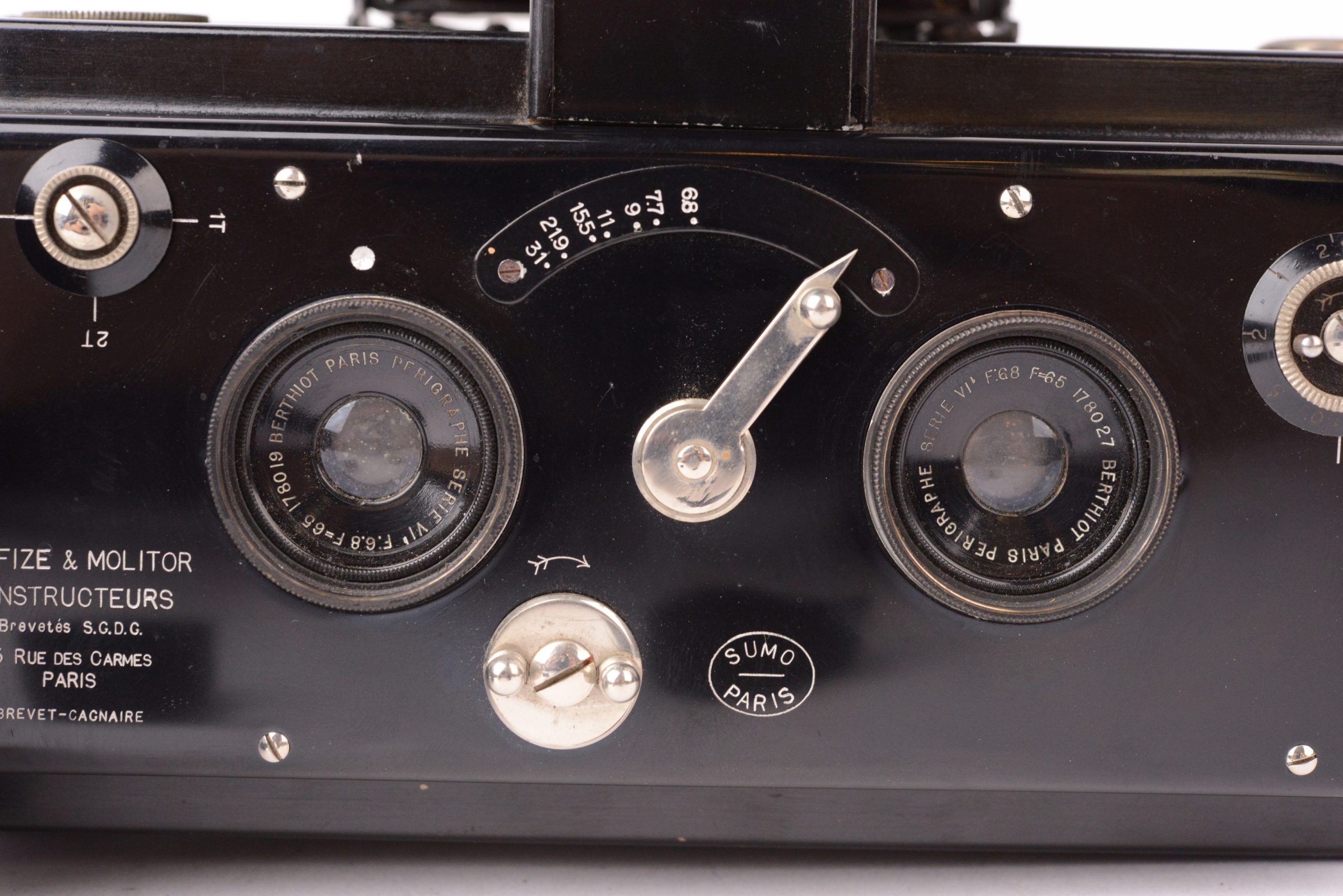 Appareil stéréoscopique Suffize & Molitor. Format 6x13. Vers 1928. L’appareil est équipé d’un dos à plaques escamotables. Le mode de visée est très particulier. Il consiste en une chambre de prise de vue amovible, pliante, à soufflet avec capuchon, dotée d’un objectif Saphir Boyer. Cette chambre prend place sur le dessus de l’appareil. L’appareil possède deux blocs optiques-obturateurs. L’un est équipé d’objectifs Saphir Boyer 1 : 4,5 / 85 mm. L’autre est équipé d’objectifs Perigraphe Berthiot 1 / 6,8 / 65 mm. Le réglage des vitesses s’effectuent par un bouton situé au-dessus de l’objectif droit de l’appareil. Celui de l’ouverture, par un bouton à glissière situé au-dessus de l’objectif gauche. La distance est réglée au moyen d’un bouton à molette situé sur le côté. Rare ensemble en excellent état.