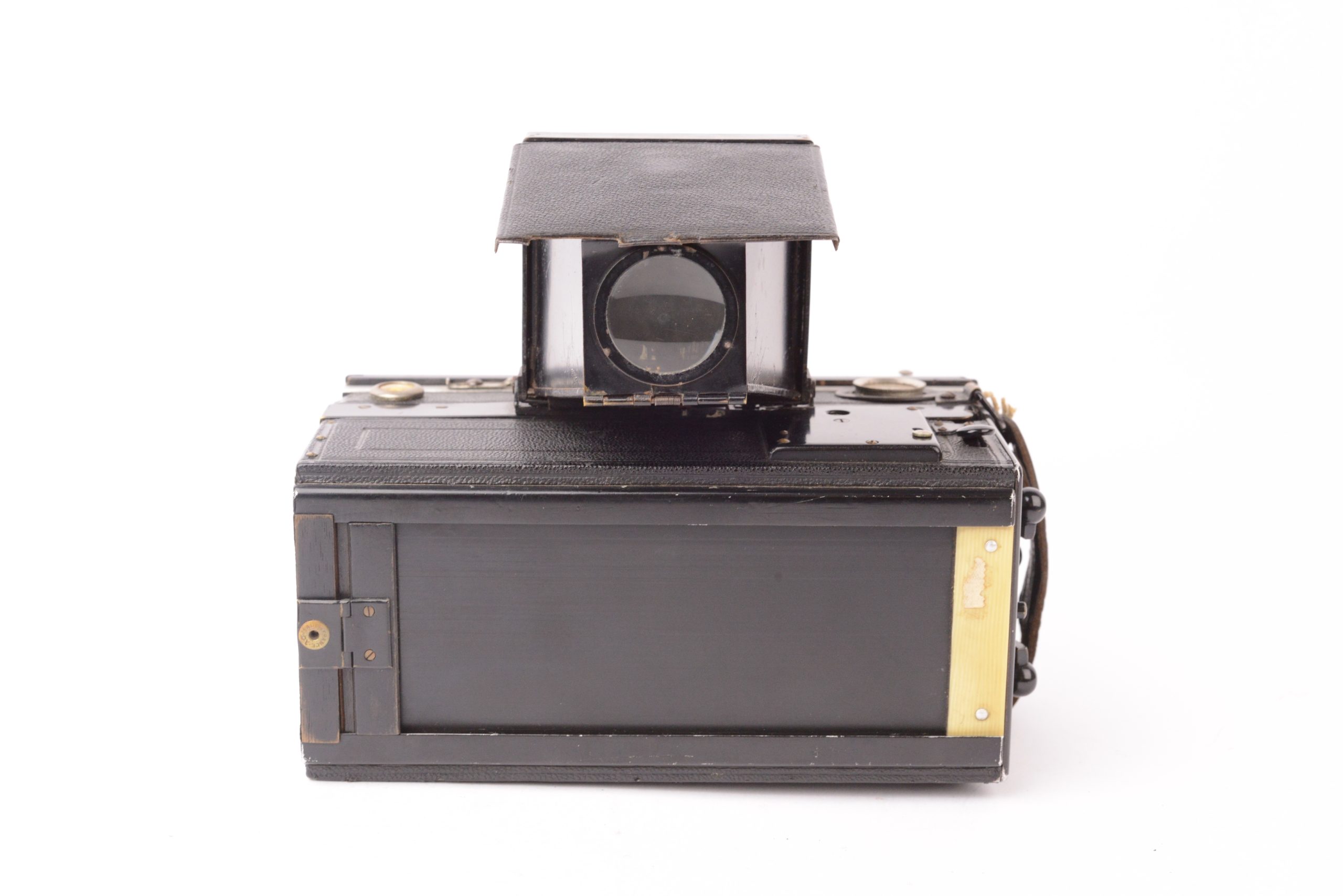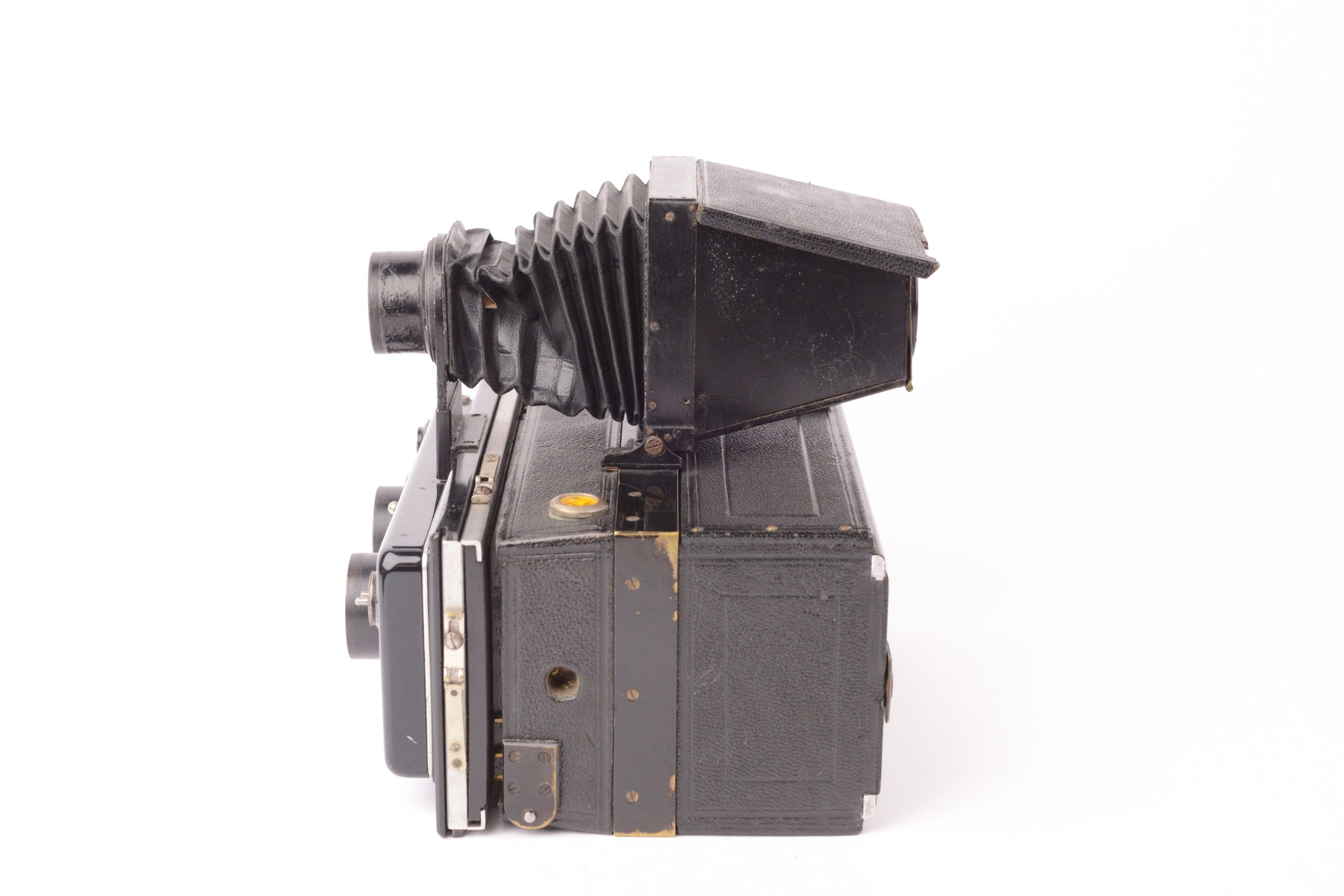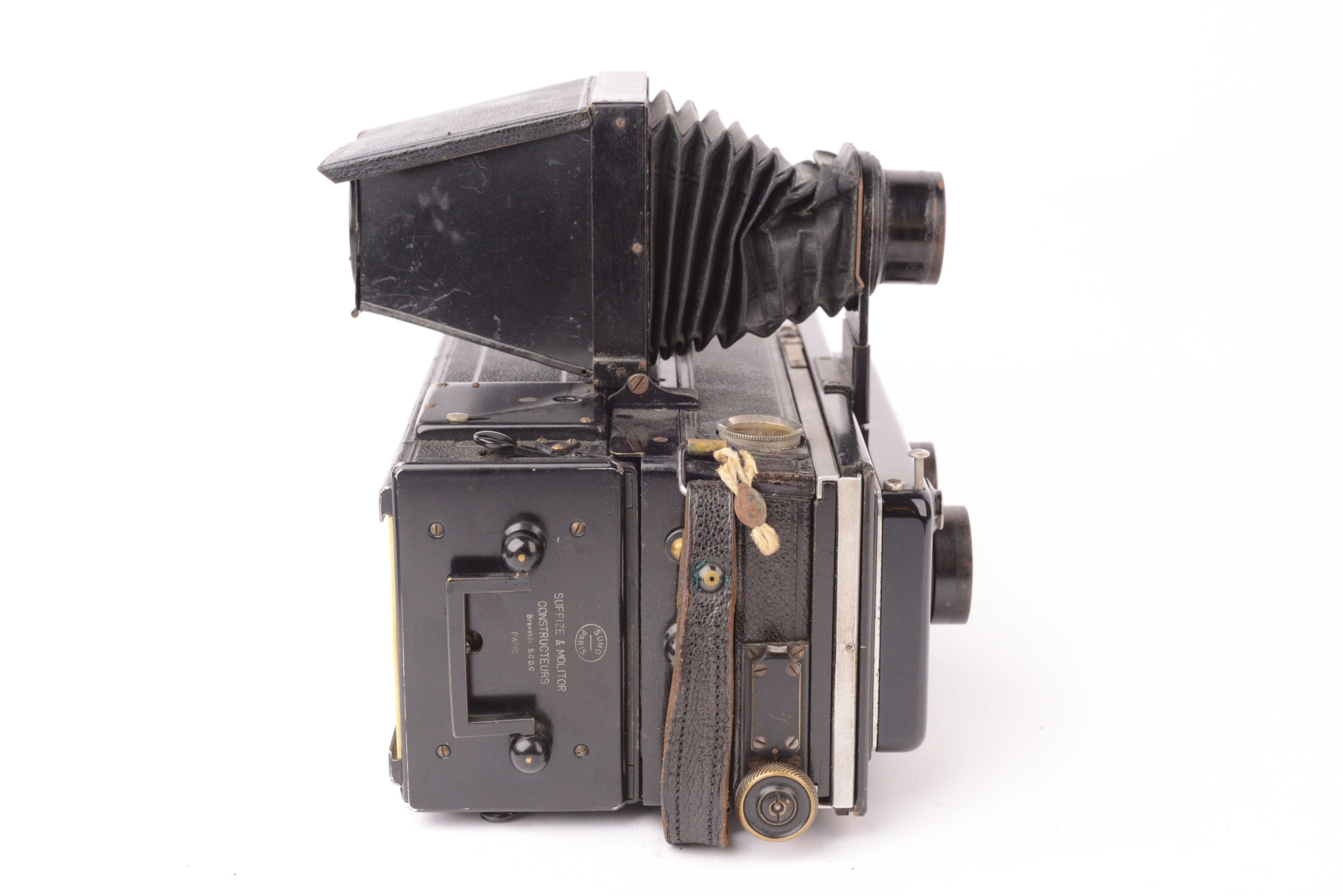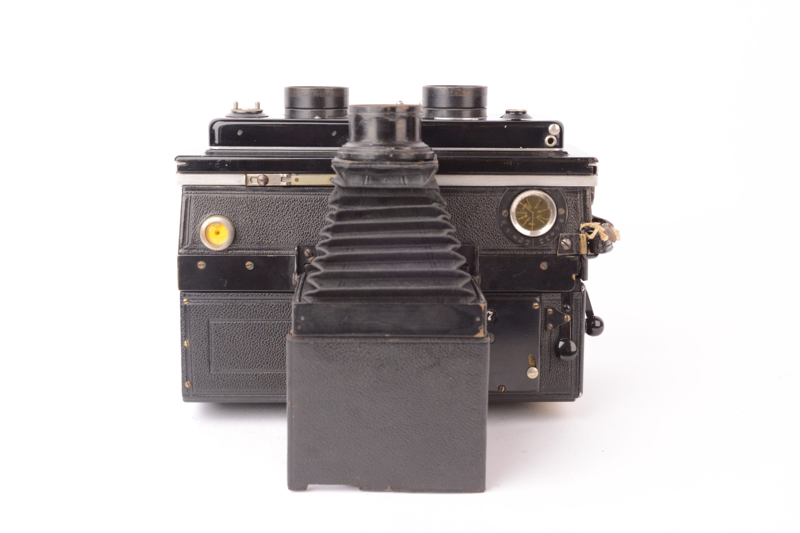 Appareil stéréoscopique Suffize & Molitor. Format 6x13. Vers 1928. L’appareil est équipé d’un dos à plaques escamotables. Le mode de visée est très particulier. Il consiste en une chambre de prise de vue amovible, pliante, à soufflet avec capuchon, dotée d’un objectif Saphir Boyer. Cette chambre prend place sur le dessus de l’appareil. L’appareil possède deux blocs optiques-obturateurs. L’un est équipé d’objectifs Saphir Boyer 1 : 4,5 / 85 mm. L’autre est équipé d’objectifs Perigraphe Berthiot 1 / 6,8 / 65 mm. Le réglage des vitesses s’effectuent par un bouton situé au-dessus de l’objectif droit de l’appareil. Celui de l’ouverture, par un bouton à glissière situé au-dessus de l’objectif gauche. La distance est réglée au moyen d’un bouton à molette situé sur le côté. Rare ensemble en excellent état.