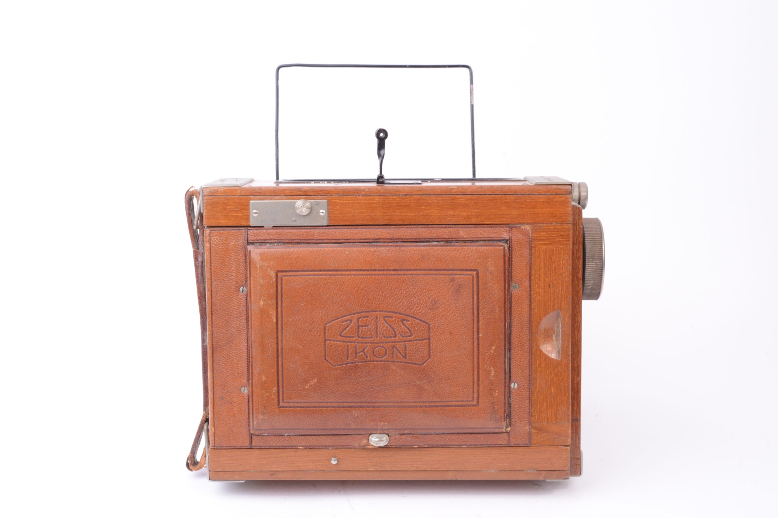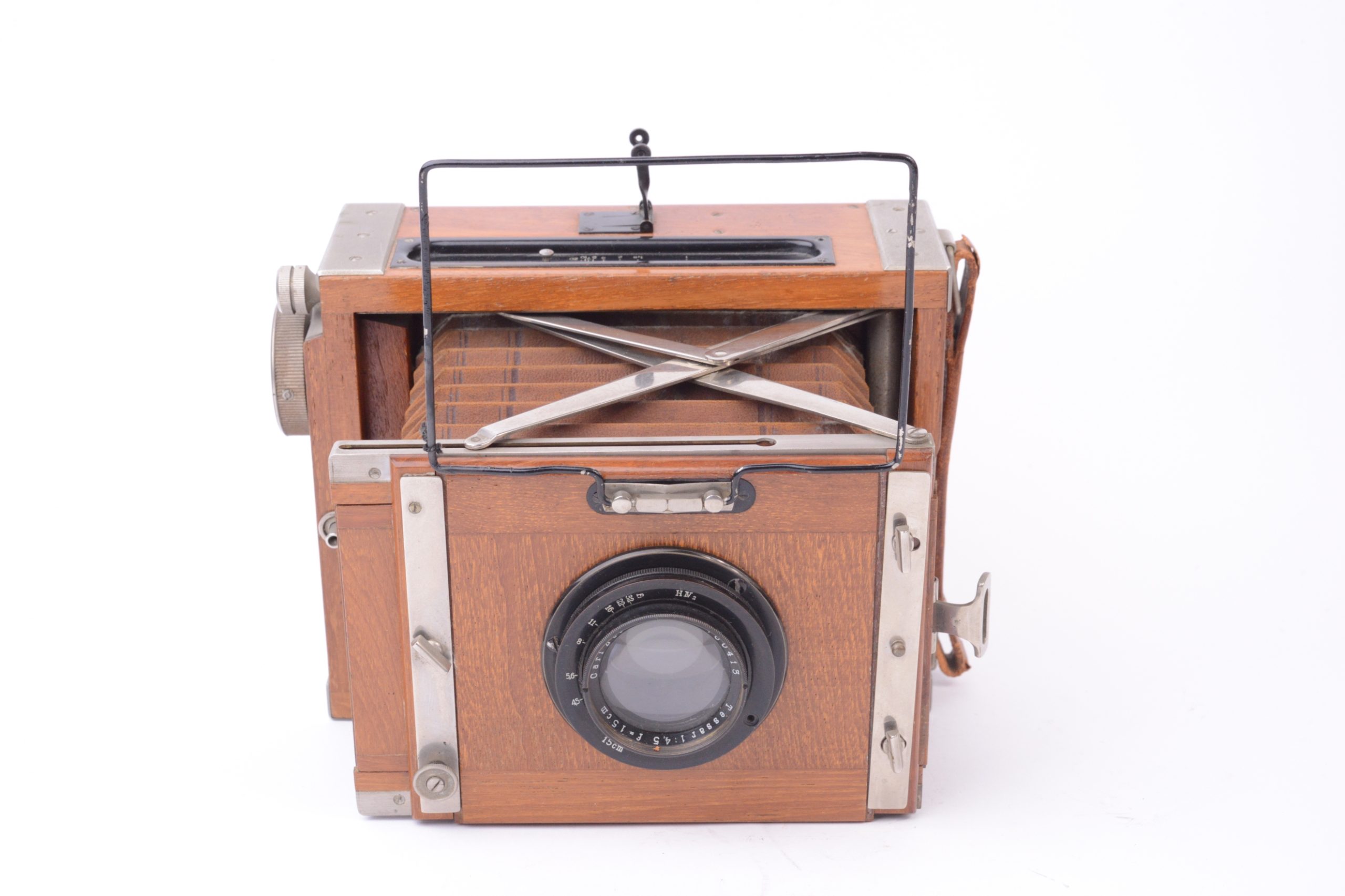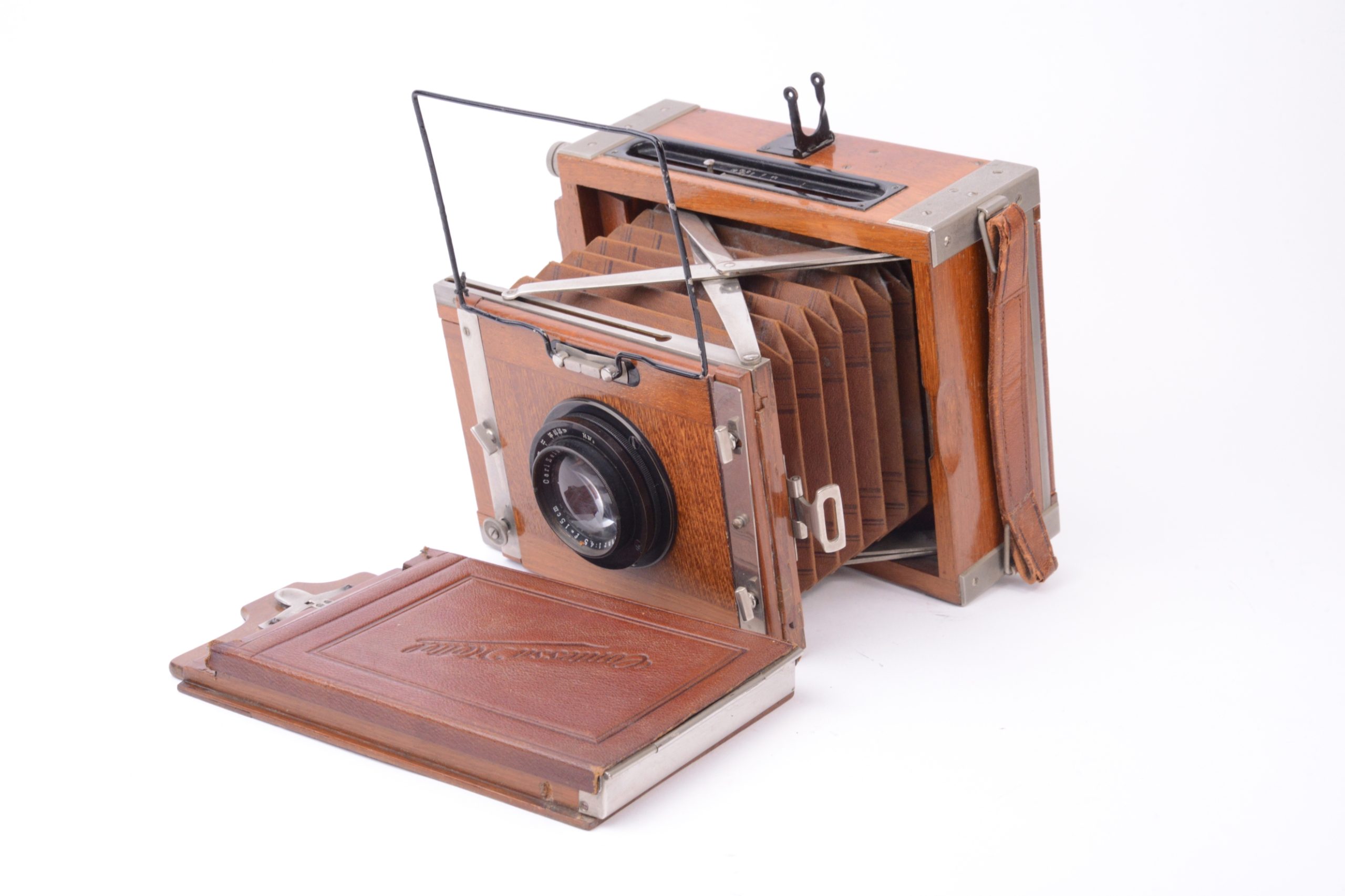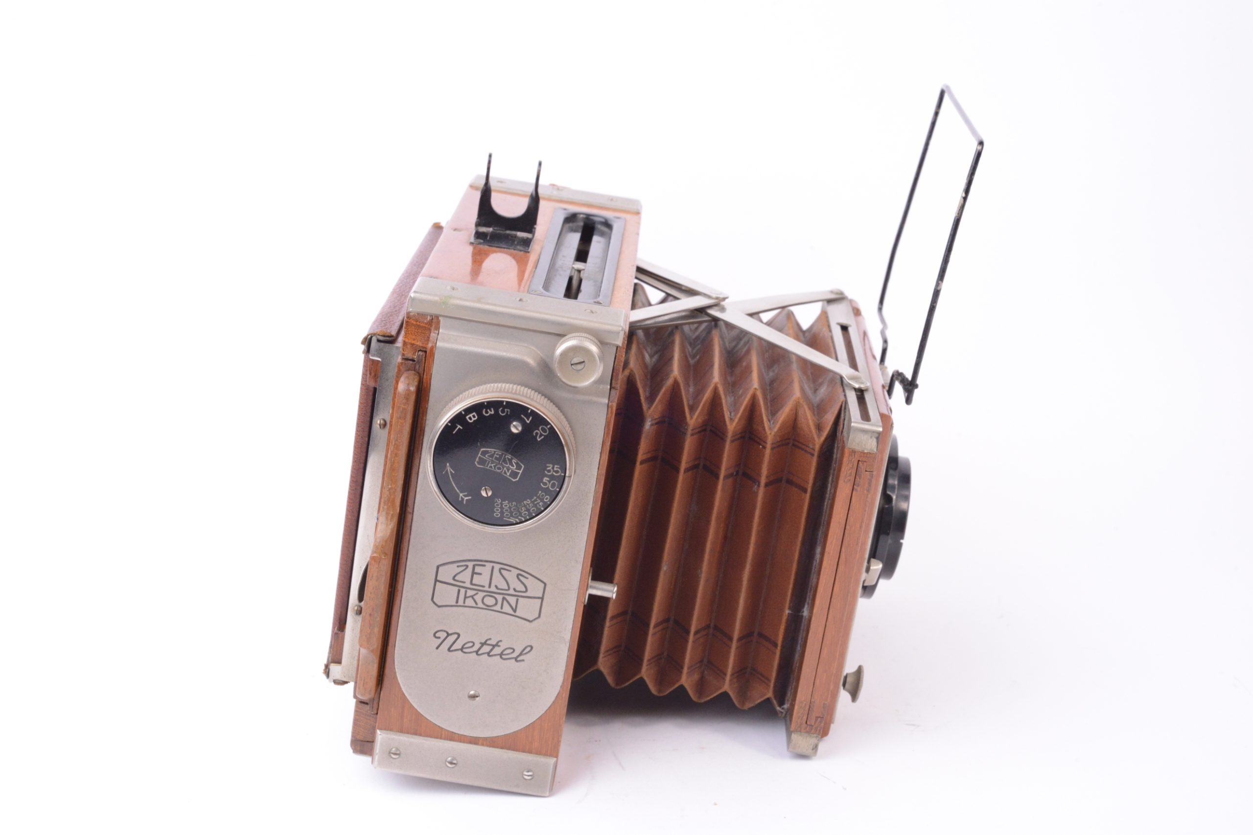 Appareil Zeiss Ikon Nettel Deckrullo tropical. Appareil de reportage à ciseaux utilisant des châssis à plaques au format 9x12 cm. Version tropicale en bois de teck verni, renforcé par ferrures nickelées, rare dans ce format. Obturateur focal à rideau (1 – 1/2000 T, B). Objectif Carl Zeiss Iéna 1 : 4,5 F=15 cm. Mise au point par déplacement du corps avant par vis sans fin agissant sur les ciseaux. Viseur sportif à cadre et mire. Dépoli avec capuchon en cuir havane. Dos plan-film en plus. Vers 1920.