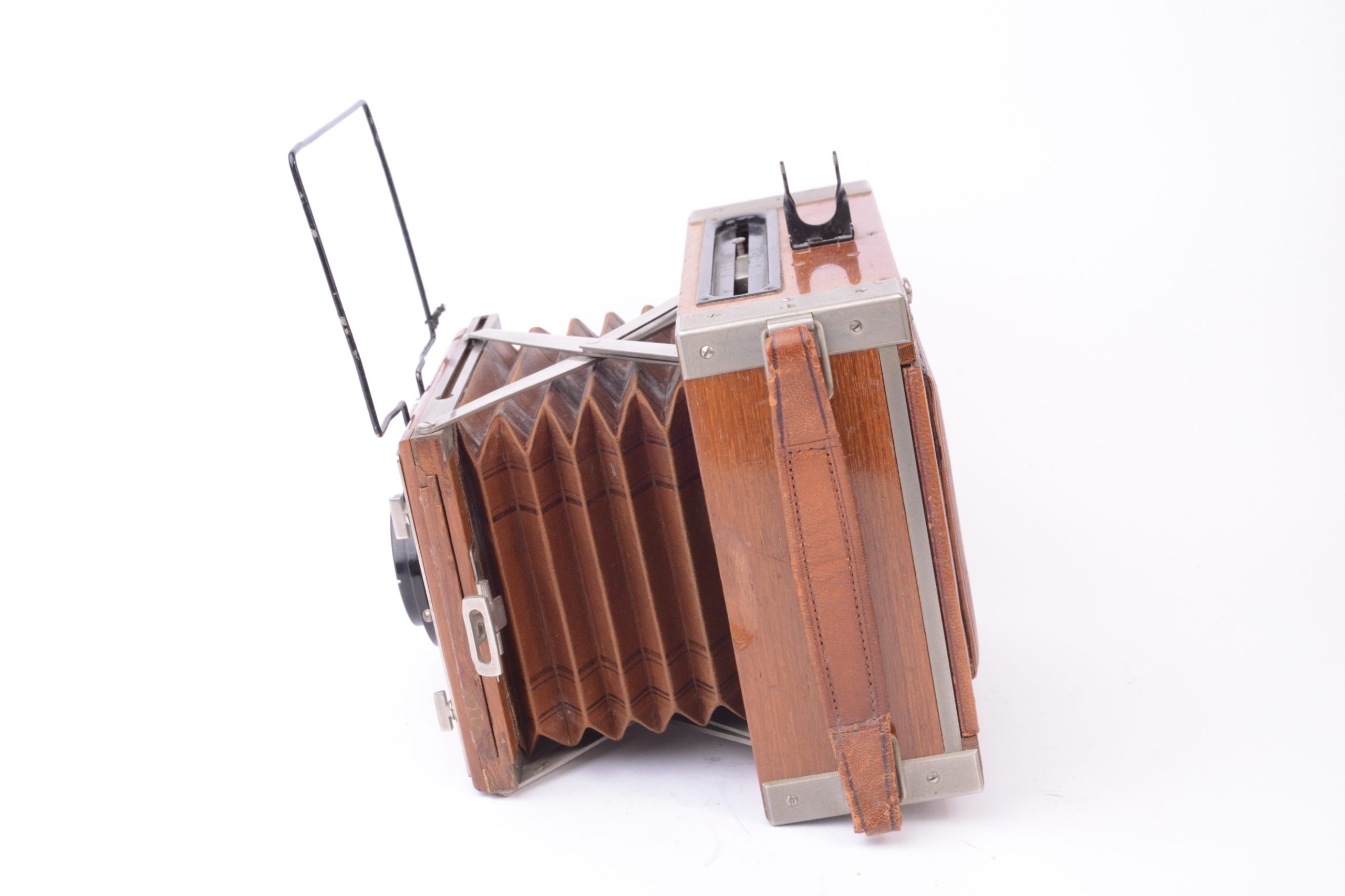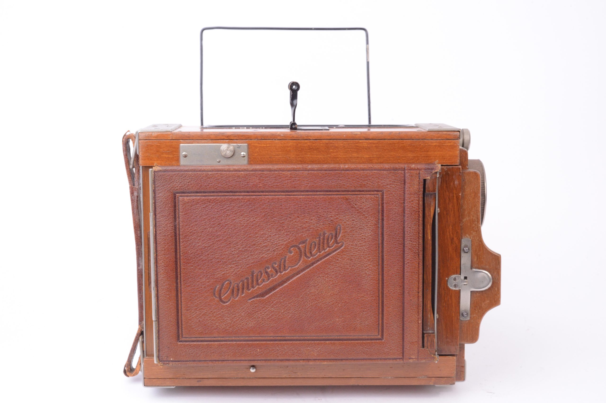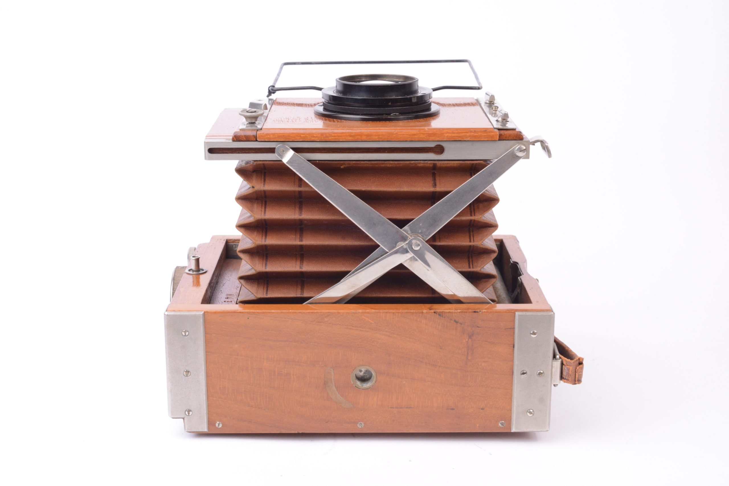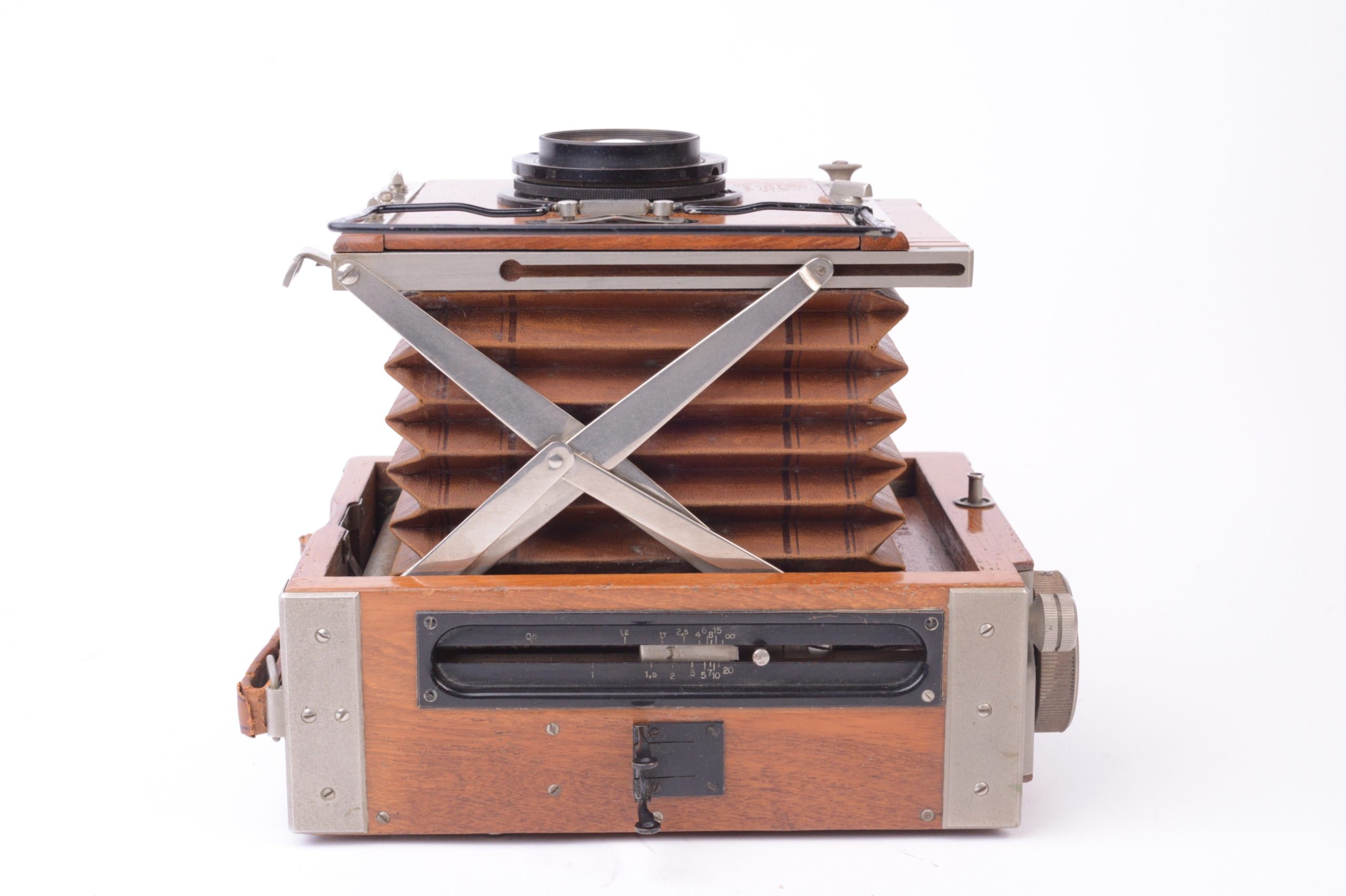 Appareil Zeiss Ikon Nettel Deckrullo tropical. Appareil de reportage à ciseaux utilisant des châssis à plaques au format 9x12 cm. Version tropicale en bois de teck verni, renforcé par ferrures nickelées, rare dans ce format. Obturateur focal à rideau (1 – 1/2000 T, B). Objectif Carl Zeiss Iéna 1 : 4,5 F=15 cm. Mise au point par déplacement du corps avant par vis sans fin agissant sur les ciseaux. Viseur sportif à cadre et mire. Dépoli avec capuchon en cuir havane. Dos plan-film en plus. Vers 1920.