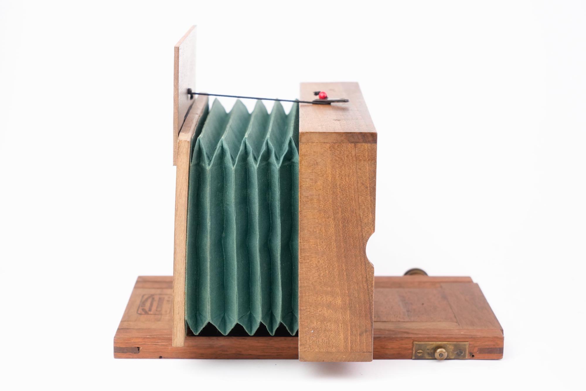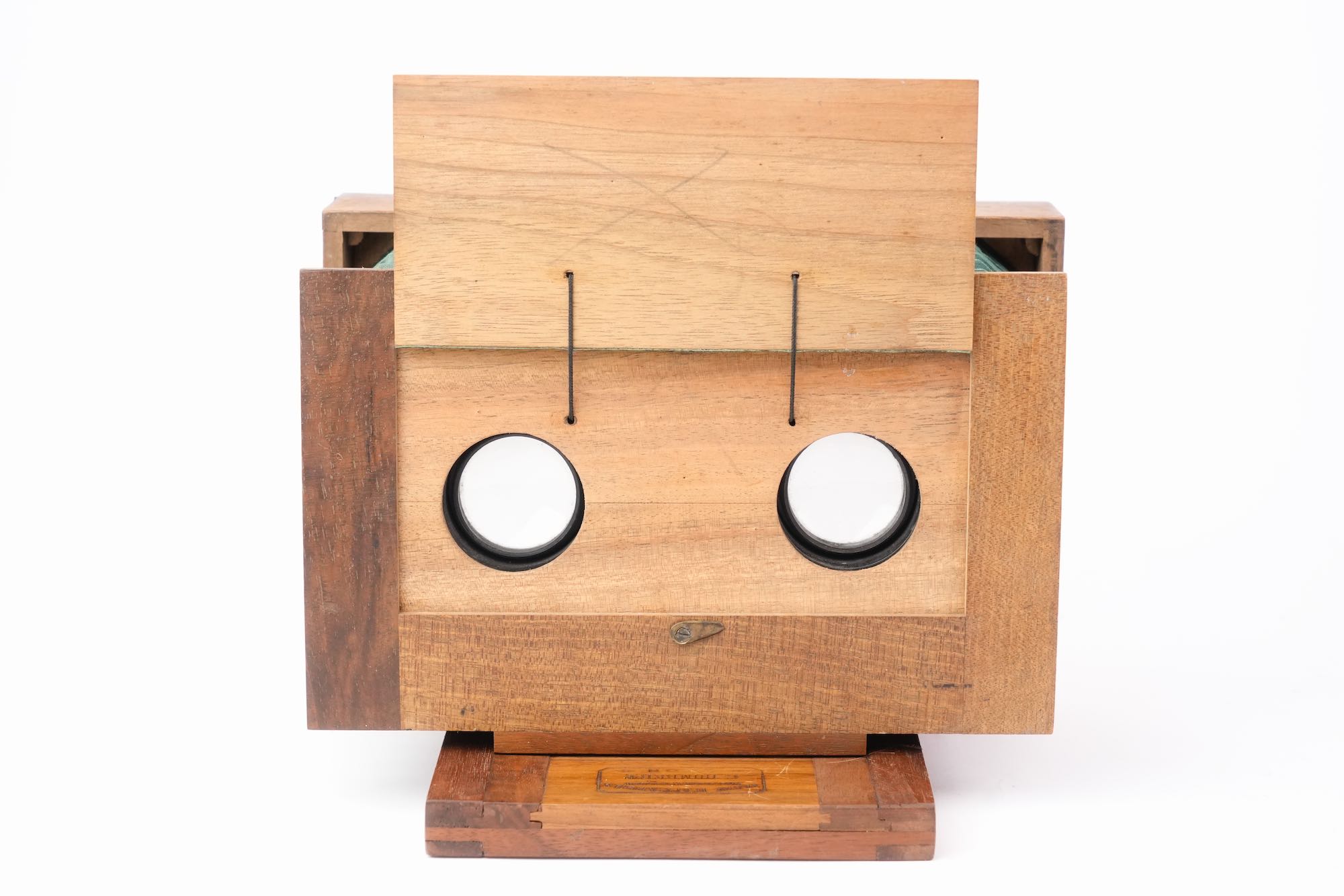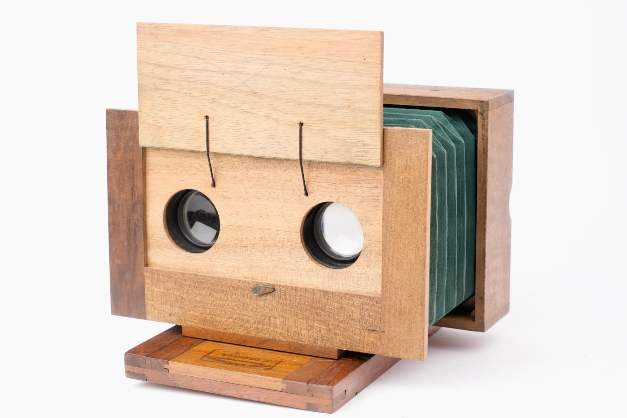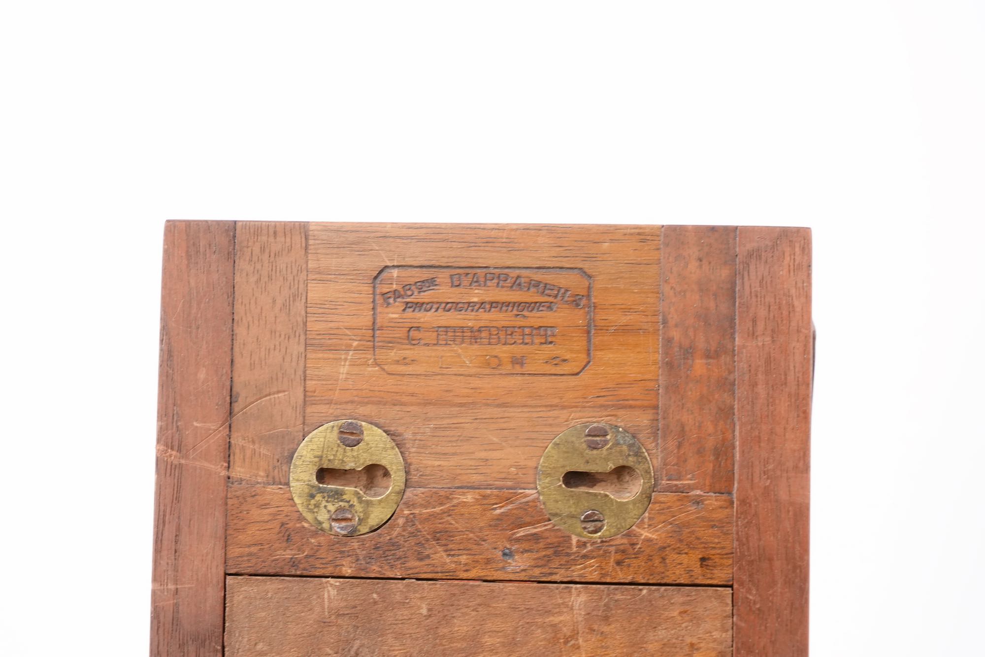 <p data-start="0" data-end="869" data-is-last-node="" data-is-only-node="">Appareil photographique stéréoscopique, fabriqué à Lyon à la fin du XIXᵉ siècle par C. Humbert, comme l’indique la mention gravée « <em data-start="140" data-end="198">Fabrique d’appareils photographiques – C. Humbert – Lyon</em> » portée sur la base ; chambre en bois à soufflet vert, montée sur un socle coulissant, destinée à la prise de vues stéréoscopiques ; l’appareil est équipé de deux objectifs de type ménisque, montés sans mécanisme de diaphragme , traduisant une conception économique et fonctionnelle ; l’obturation est assurée par un volet en bois à abattant placé devant les objectifs, système rudimentaire ; l’ensemble témoigne d’une production locale lyonnaise, sobre et utilitaire mais avec une belle qualité d'assemblage et d'ébénisterie.</p>