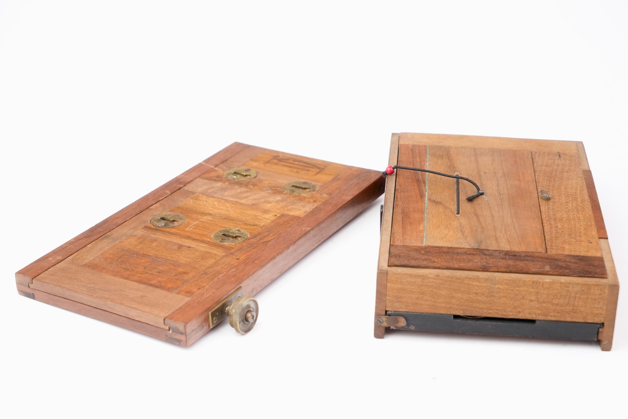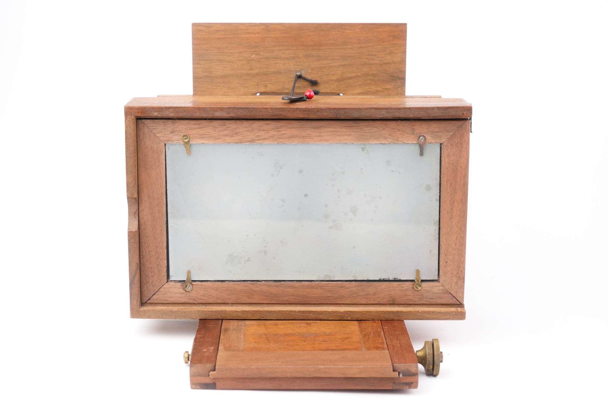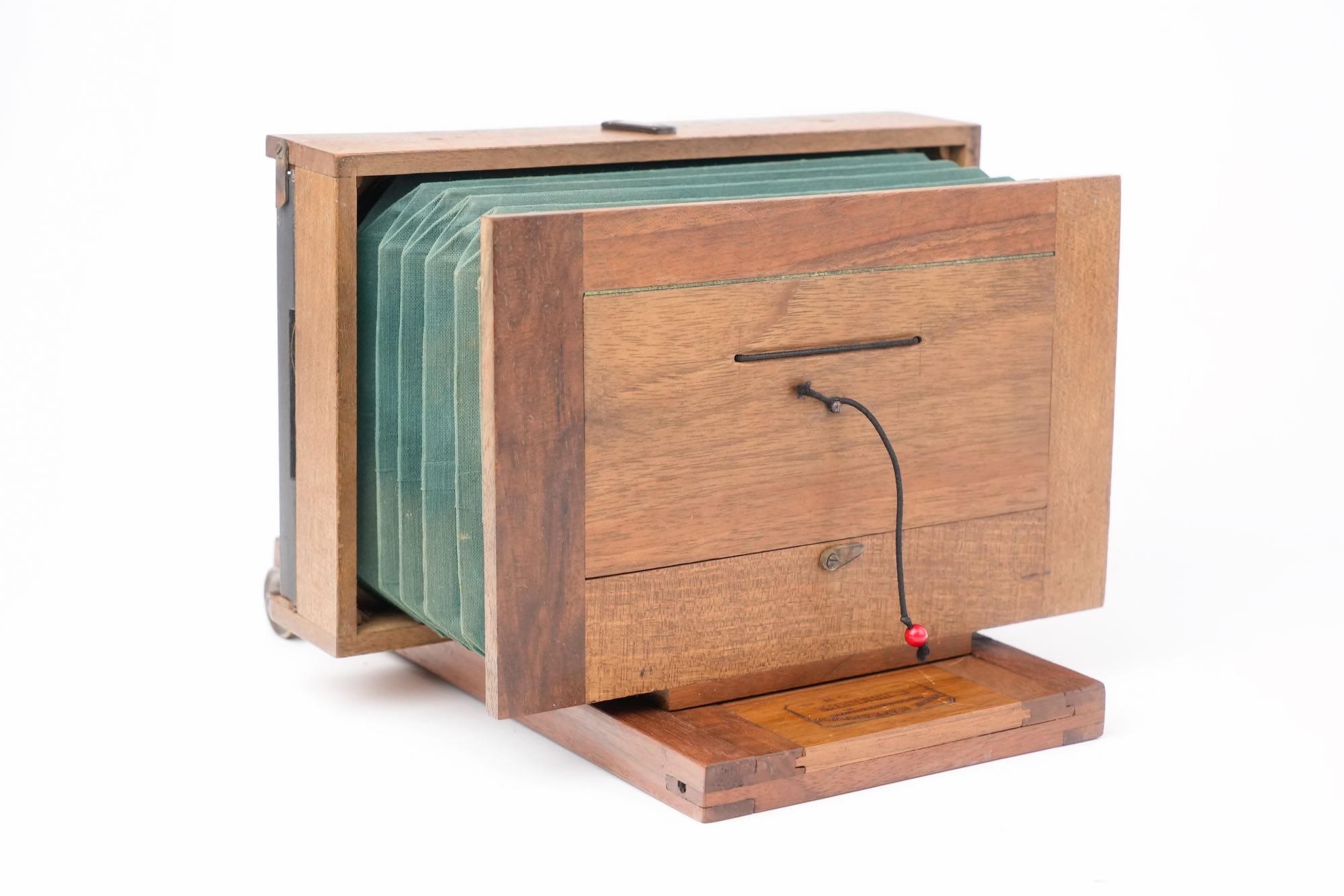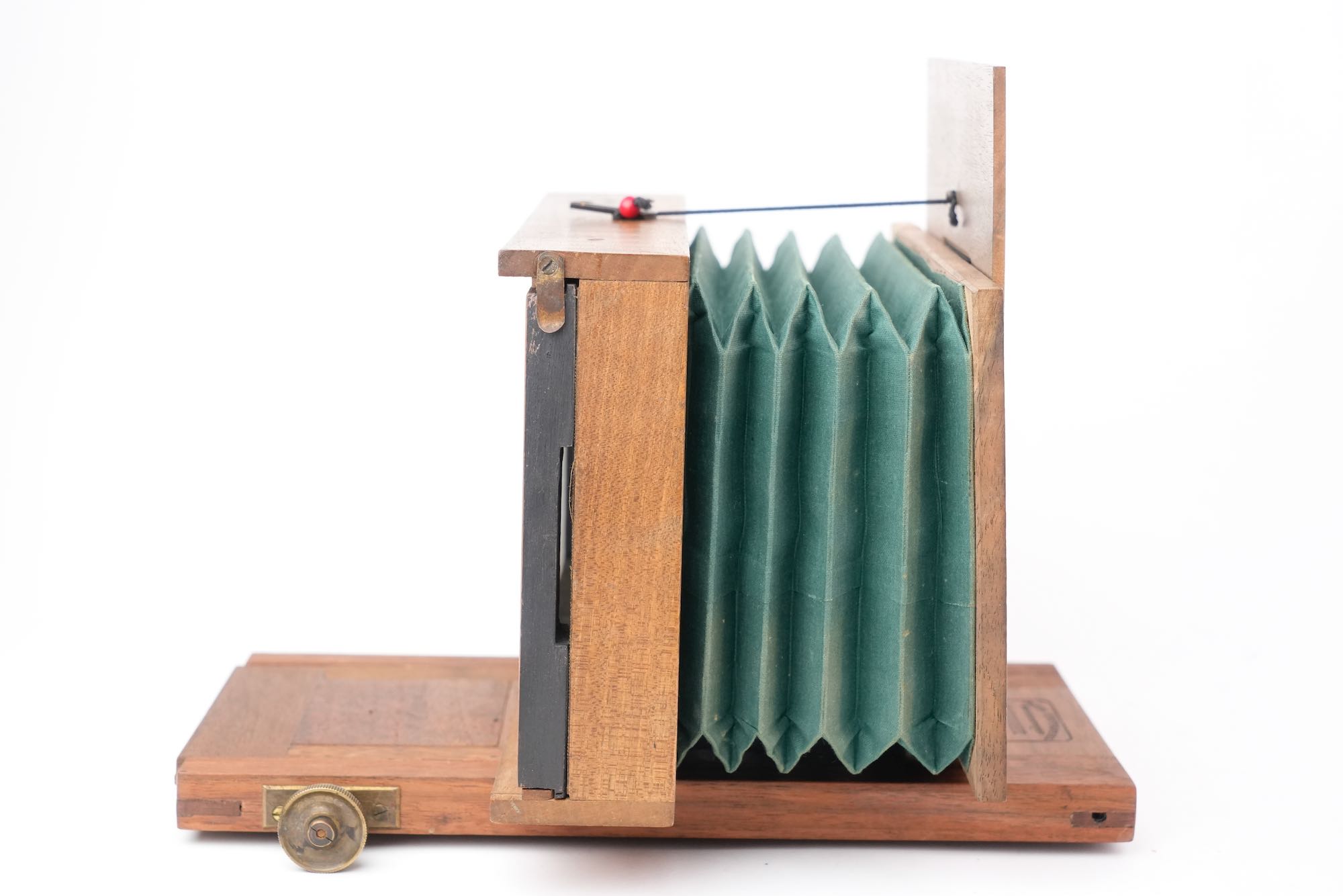 <p data-start="0" data-end="869" data-is-last-node="" data-is-only-node="">Appareil photographique stéréoscopique, fabriqué à Lyon à la fin du XIXᵉ siècle par C. Humbert, comme l’indique la mention gravée « <em data-start="140" data-end="198">Fabrique d’appareils photographiques – C. Humbert – Lyon</em> » portée sur la base ; chambre en bois à soufflet vert, montée sur un socle coulissant, destinée à la prise de vues stéréoscopiques ; l’appareil est équipé de deux objectifs de type ménisque, montés sans mécanisme de diaphragme , traduisant une conception économique et fonctionnelle ; l’obturation est assurée par un volet en bois à abattant placé devant les objectifs, système rudimentaire ; l’ensemble témoigne d’une production locale lyonnaise, sobre et utilitaire mais avec une belle qualité d'assemblage et d'ébénisterie.</p>