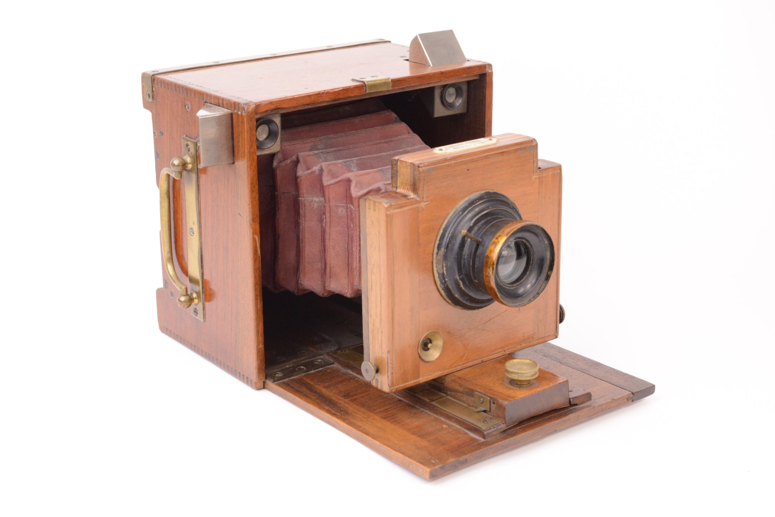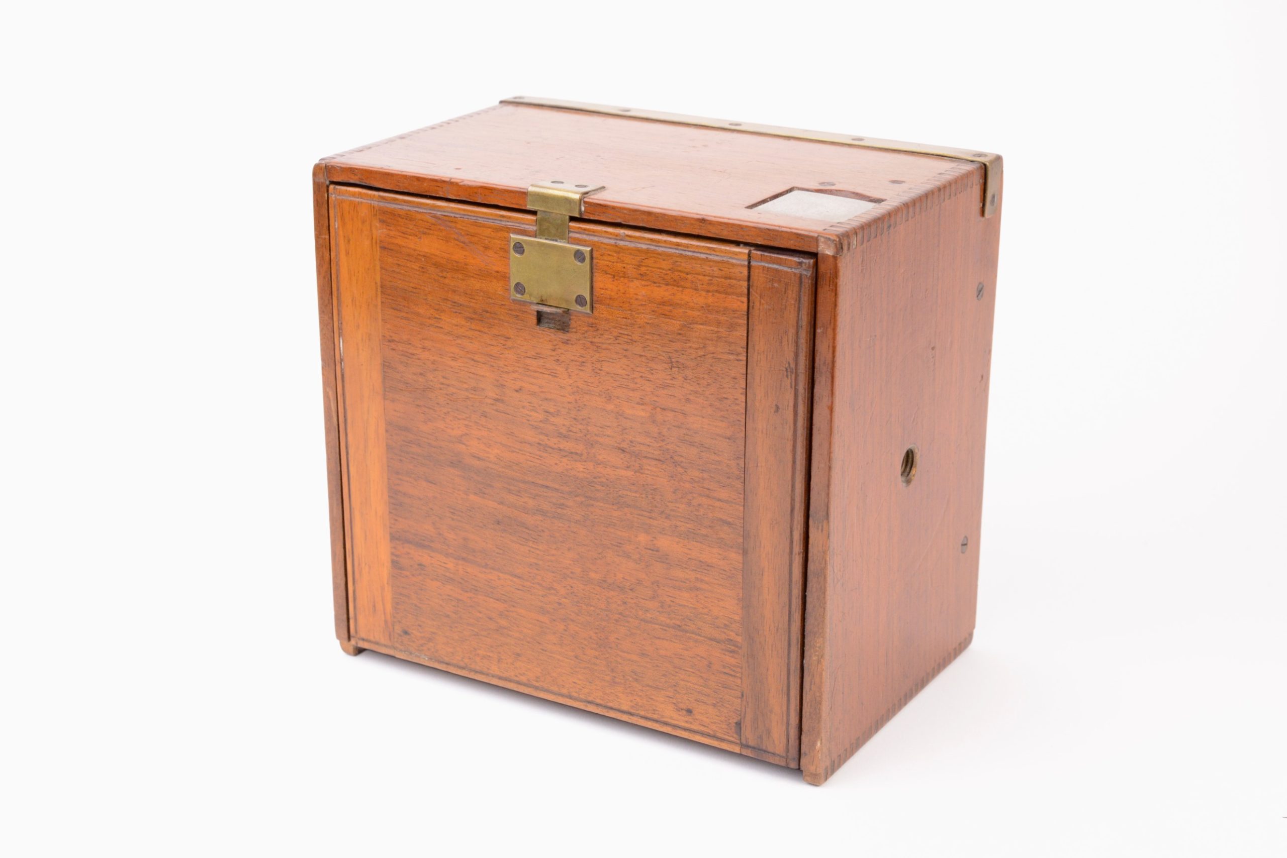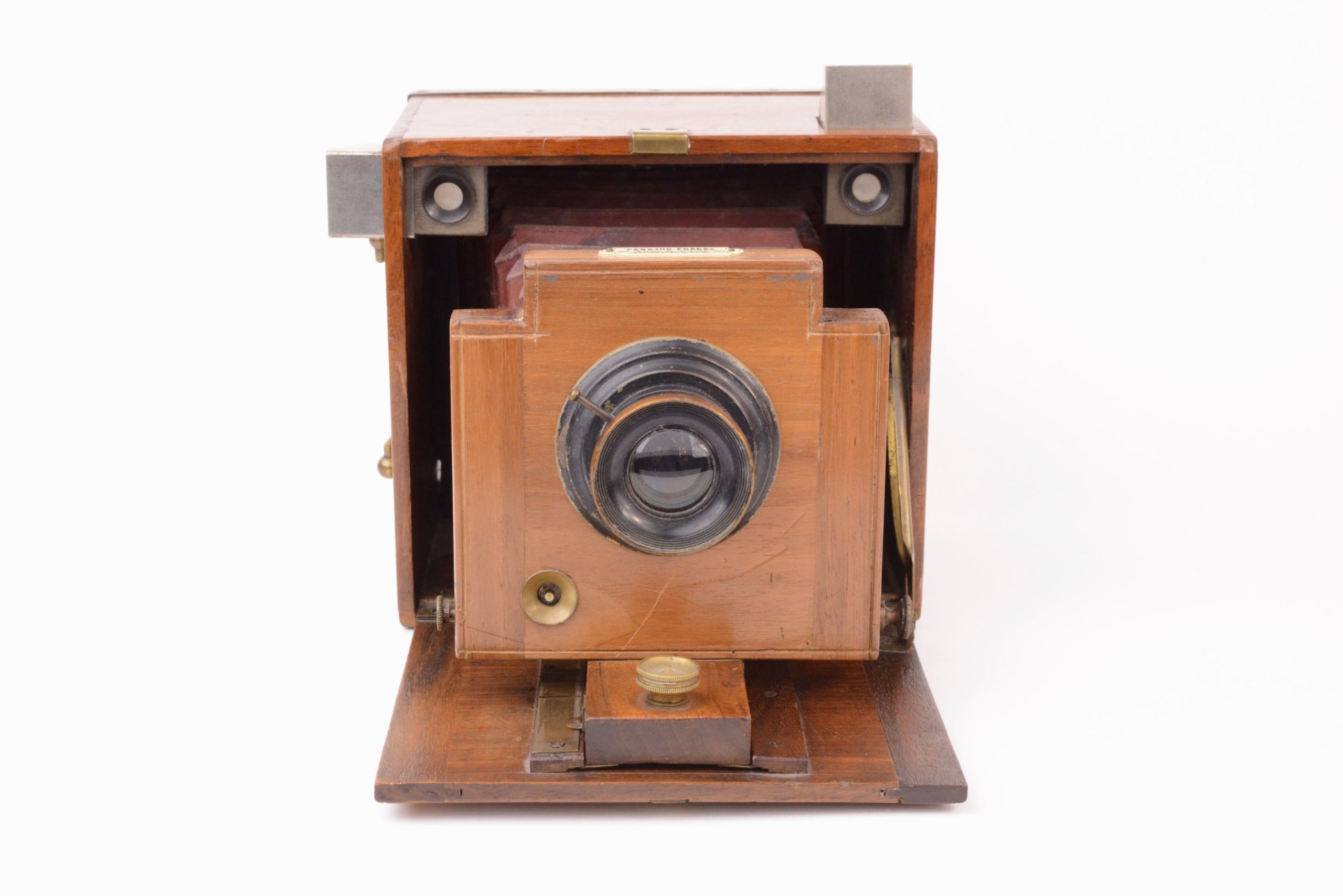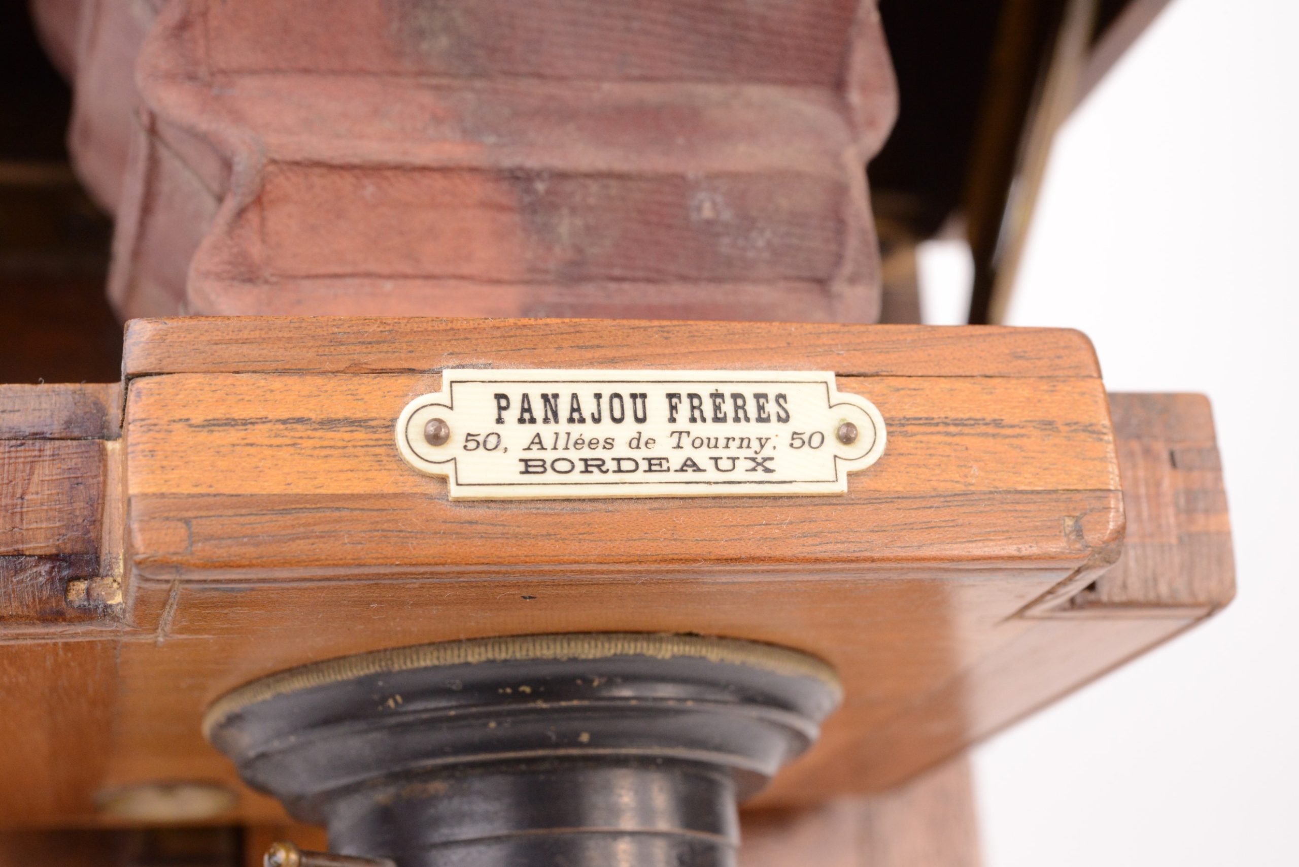 Très rare chambre coffret Panajou Frères au 50 Allées de Tourny à Bordeaux. Format 9x12 cm.  Belle fabrication en noyer semi-verni, avec soufflet pyramidal en cuir rouge. Objectif Alphonse Darlot Planigraphe f/9 de 17,5 cm à diaphragme iris monté sur un obturateur frontal à secteur. Mise au point par déplacement manuel du chariot avant pouvant se bloquer par vis calante.  Présence de deux viseurs réflex à capuchon intégrés dans le cadre du coffret. Dos muni d’un cadre pivotant portant verre dépoli. Poignée de transport en cuivre.  Vers 1895. Appareil très particulier en bel état.