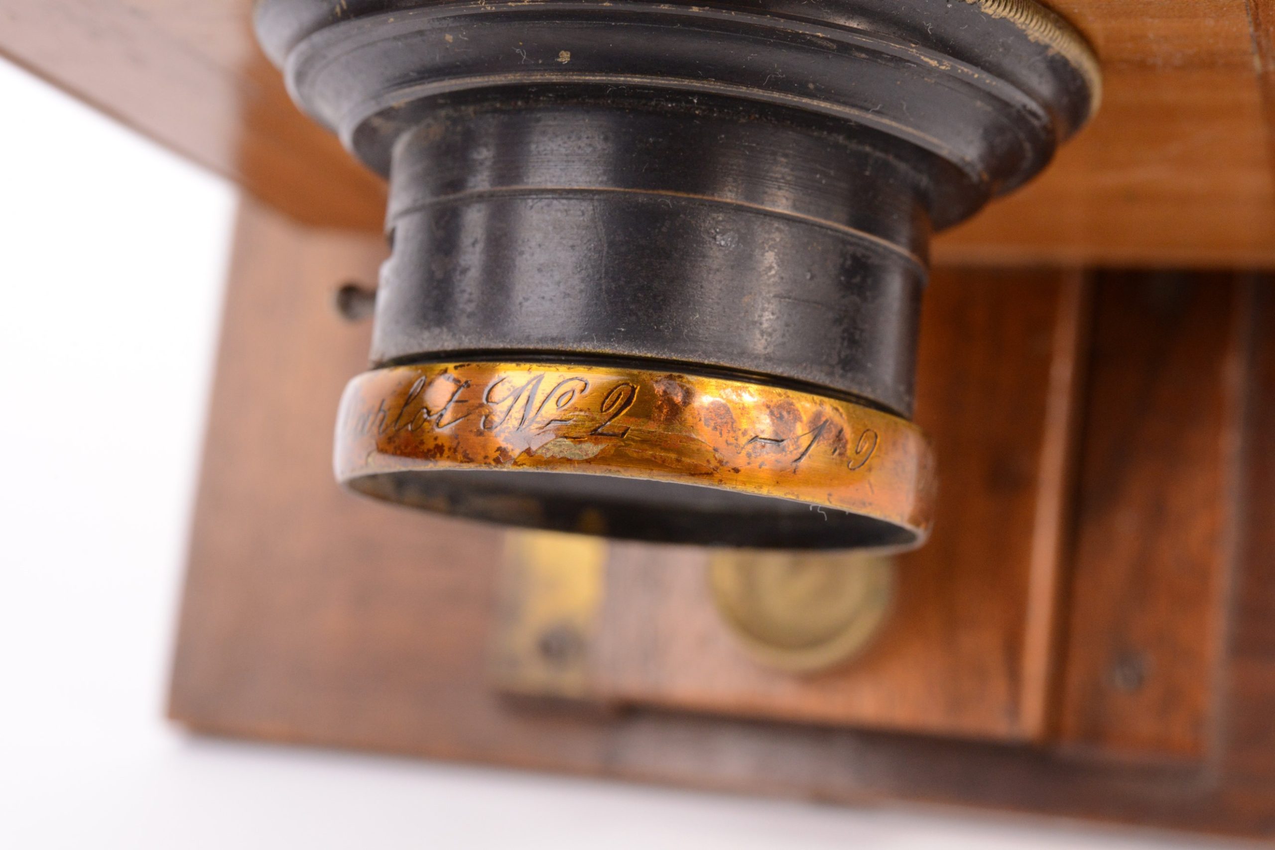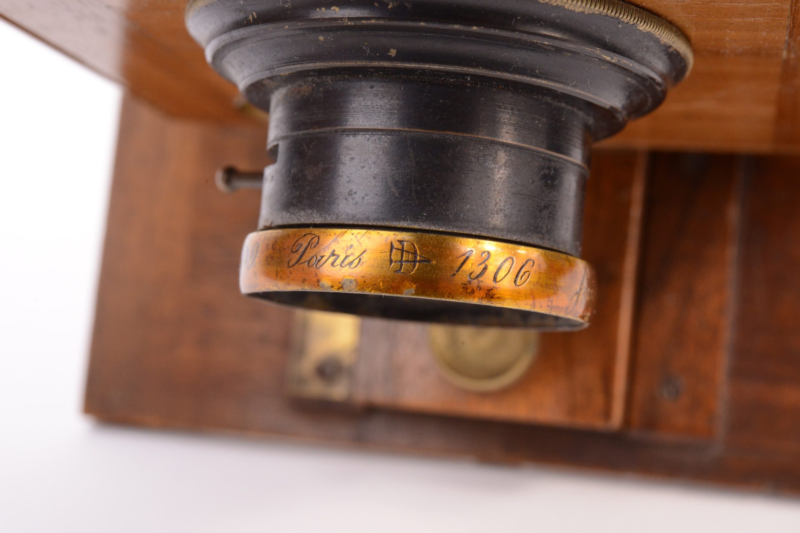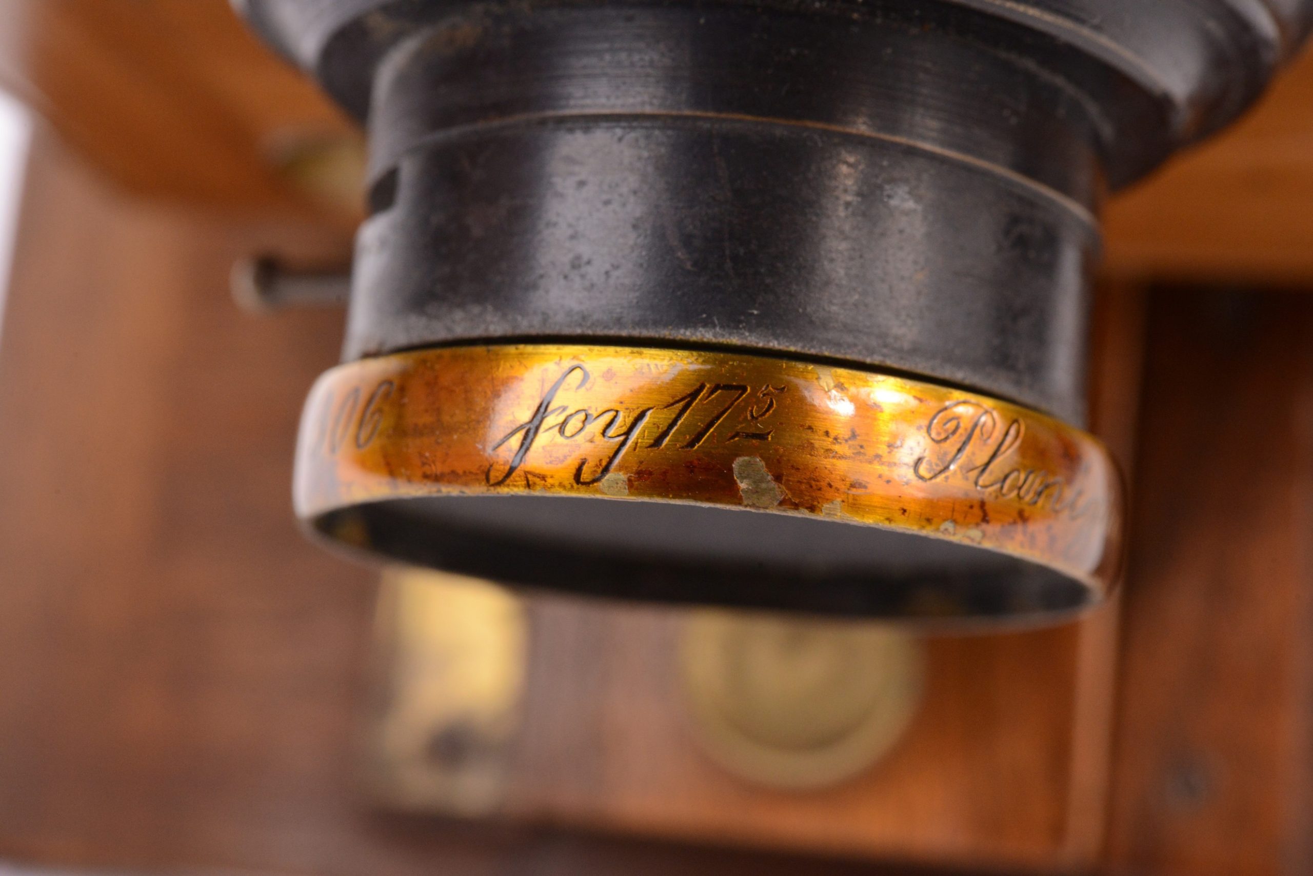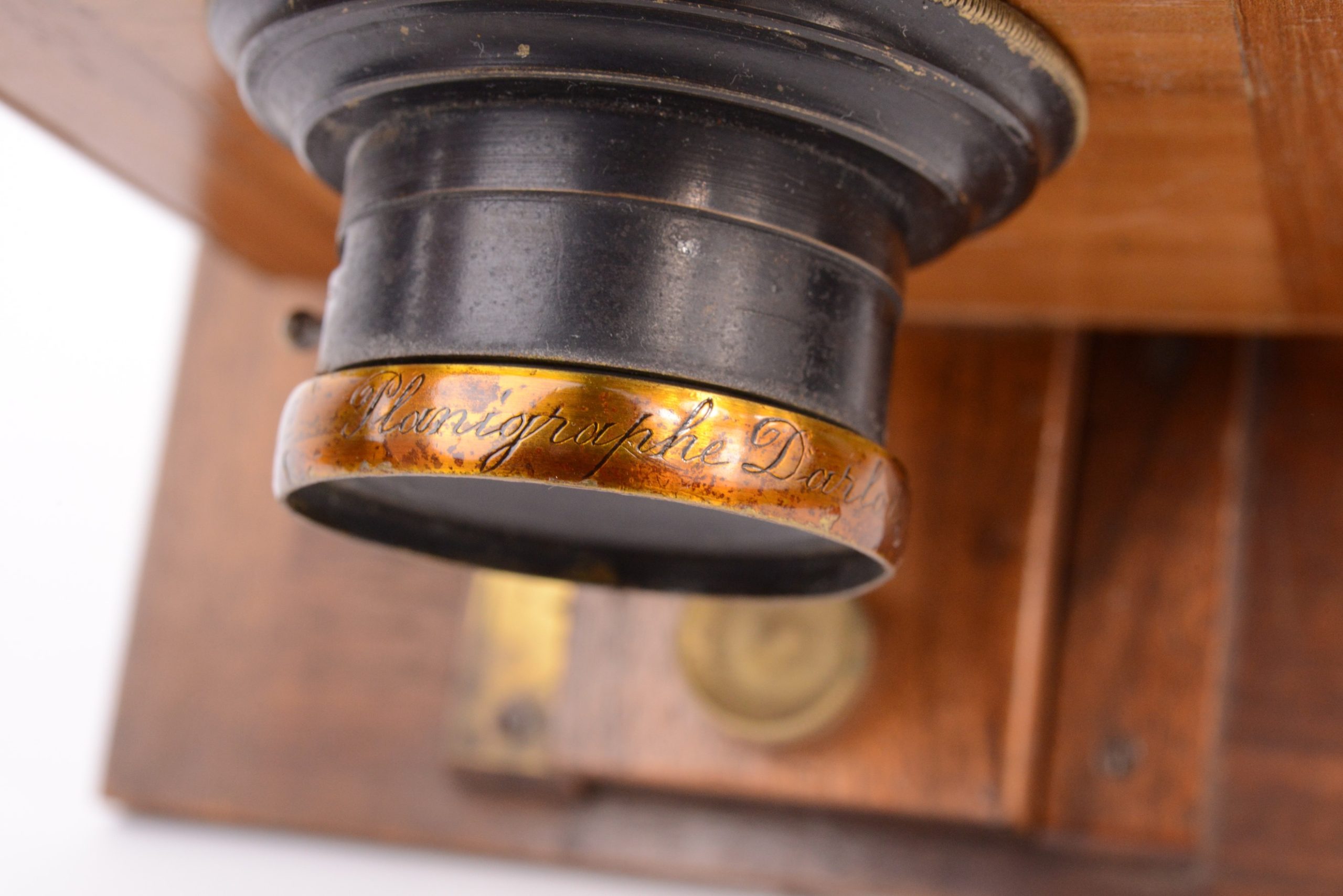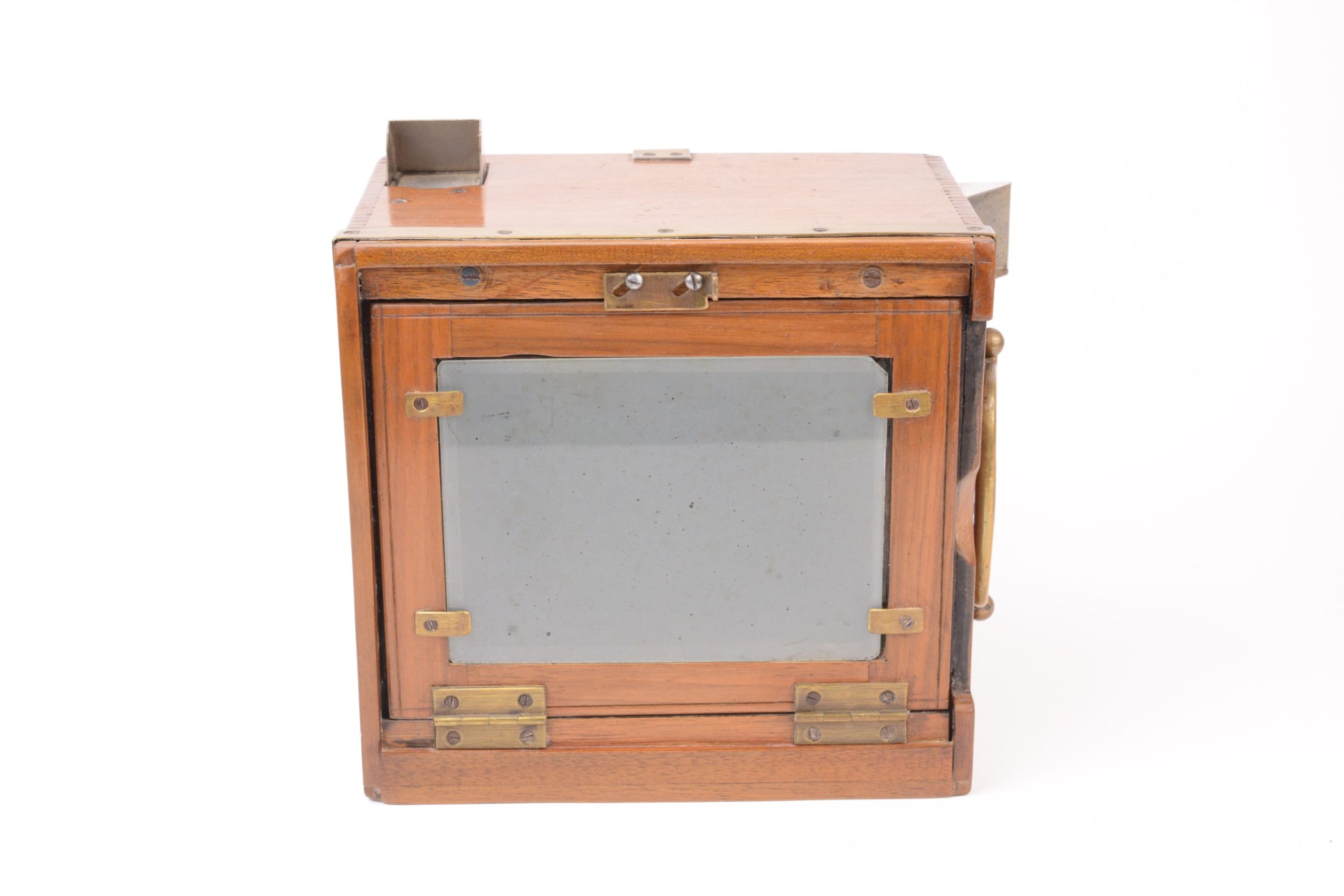 Très rare chambre coffret Panajou Frères au 50 Allées de Tourny à Bordeaux. Format 9x12 cm.  Belle fabrication en noyer semi-verni, avec soufflet pyramidal en cuir rouge. Objectif Alphonse Darlot Planigraphe f/9 de 17,5 cm à diaphragme iris monté sur un obturateur frontal à secteur. Mise au point par déplacement manuel du chariot avant pouvant se bloquer par vis calante.  Présence de deux viseurs réflex à capuchon intégrés dans le cadre du coffret. Dos muni d’un cadre pivotant portant verre dépoli. Poignée de transport en cuivre.  Vers 1895. Appareil très particulier en bel état.