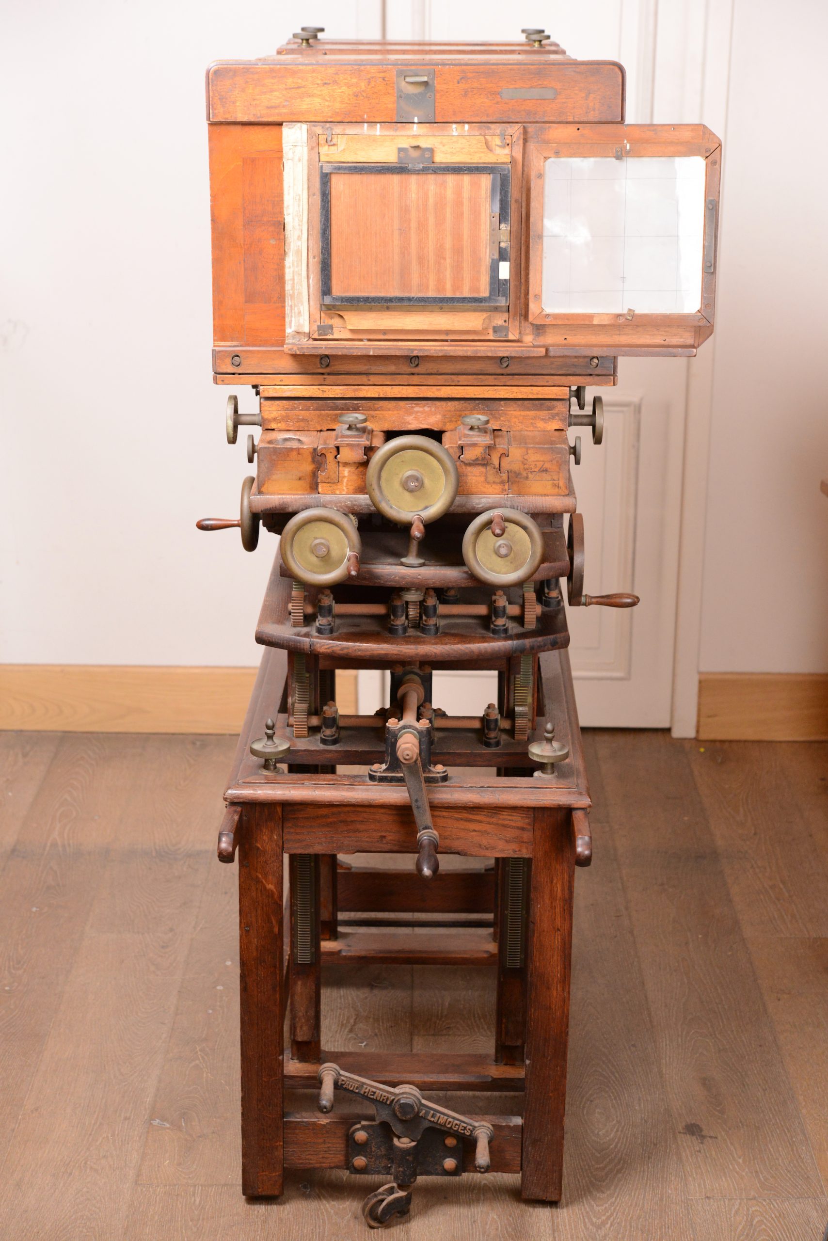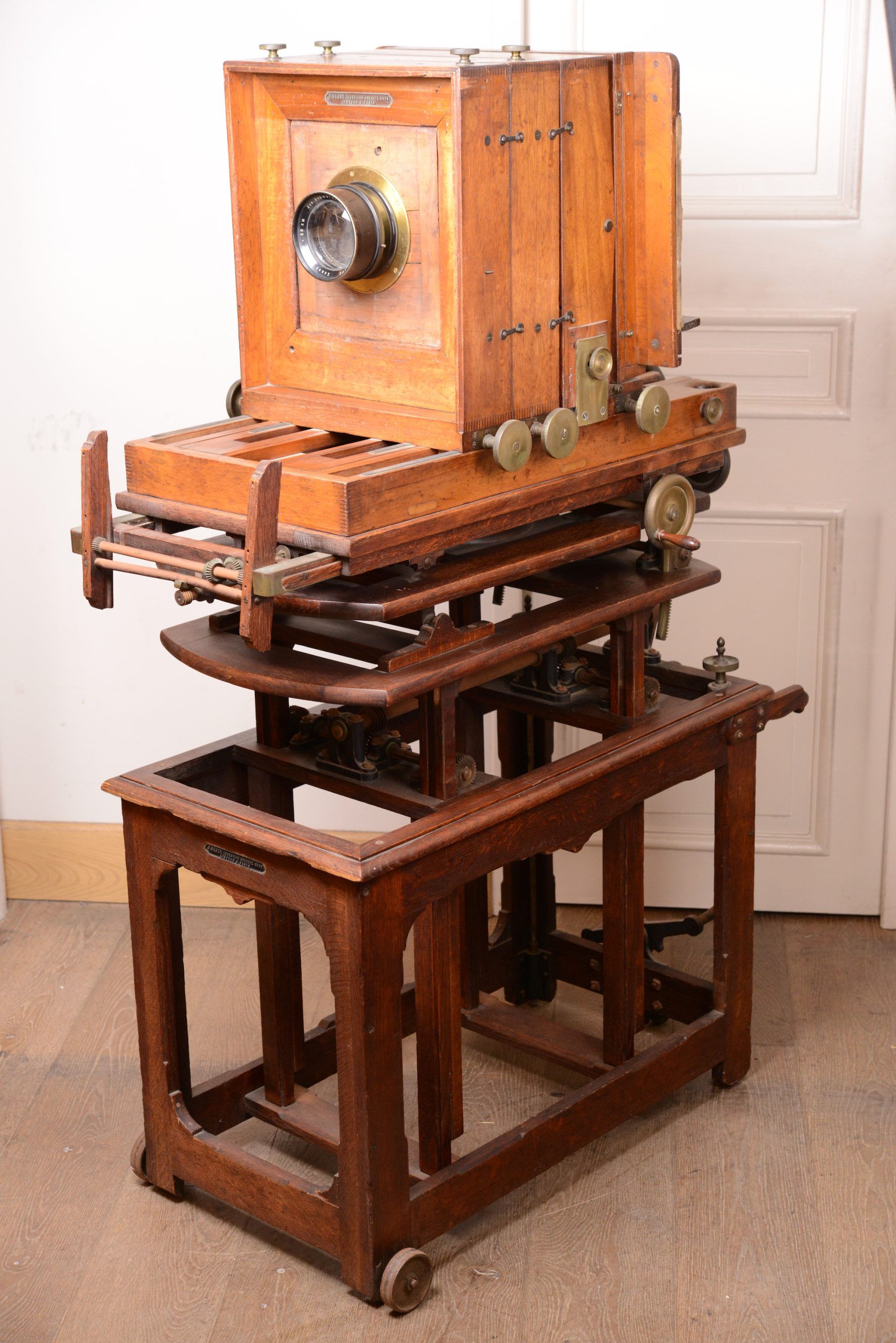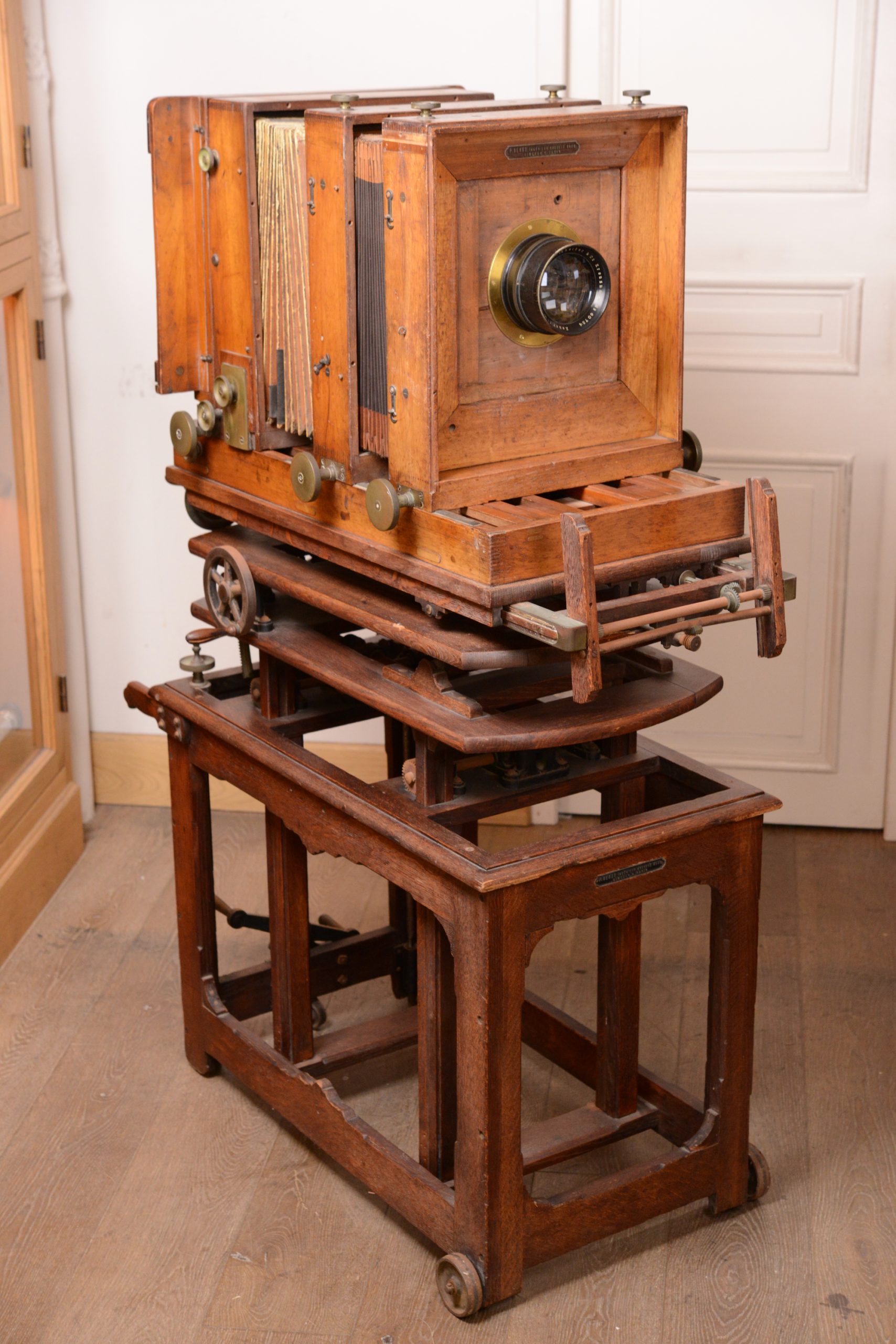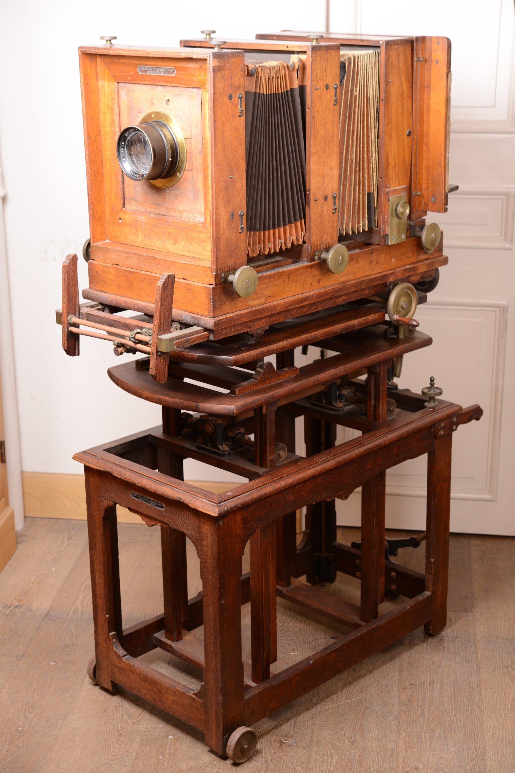Grande chambre d'atelier pour plaques . Henry à Limoges. Avec son très beau pied de studio, confectionné sur mesure, qui permet d'effectuer ajustements, bascules et niveau. Assemblage de qualité avec une construction en bois de noyer et en laiton. En plus de son pied, la chambre vient avec un objectif Schneider & Kreuznach, Xenar, 360mm f/4,5. Longueur 1 m, largeur 60 cm, hauteur 1,43 m.