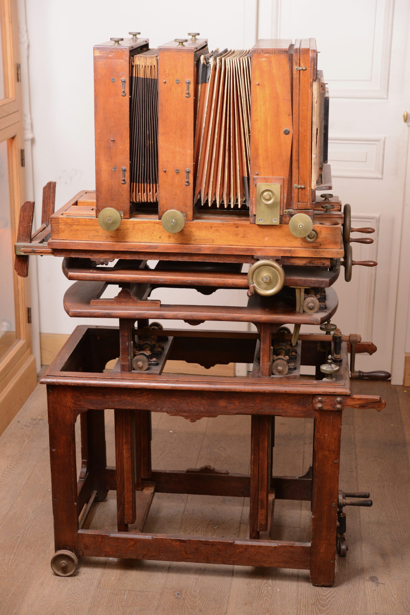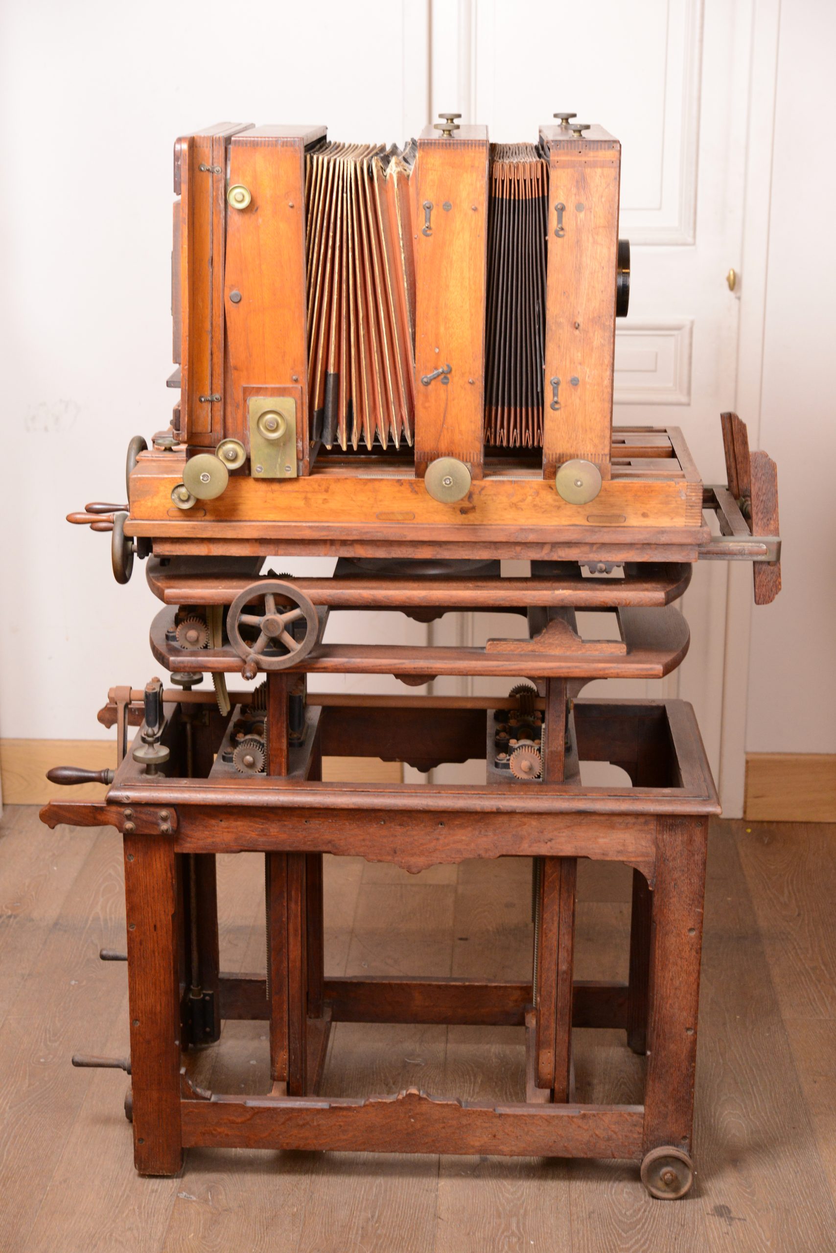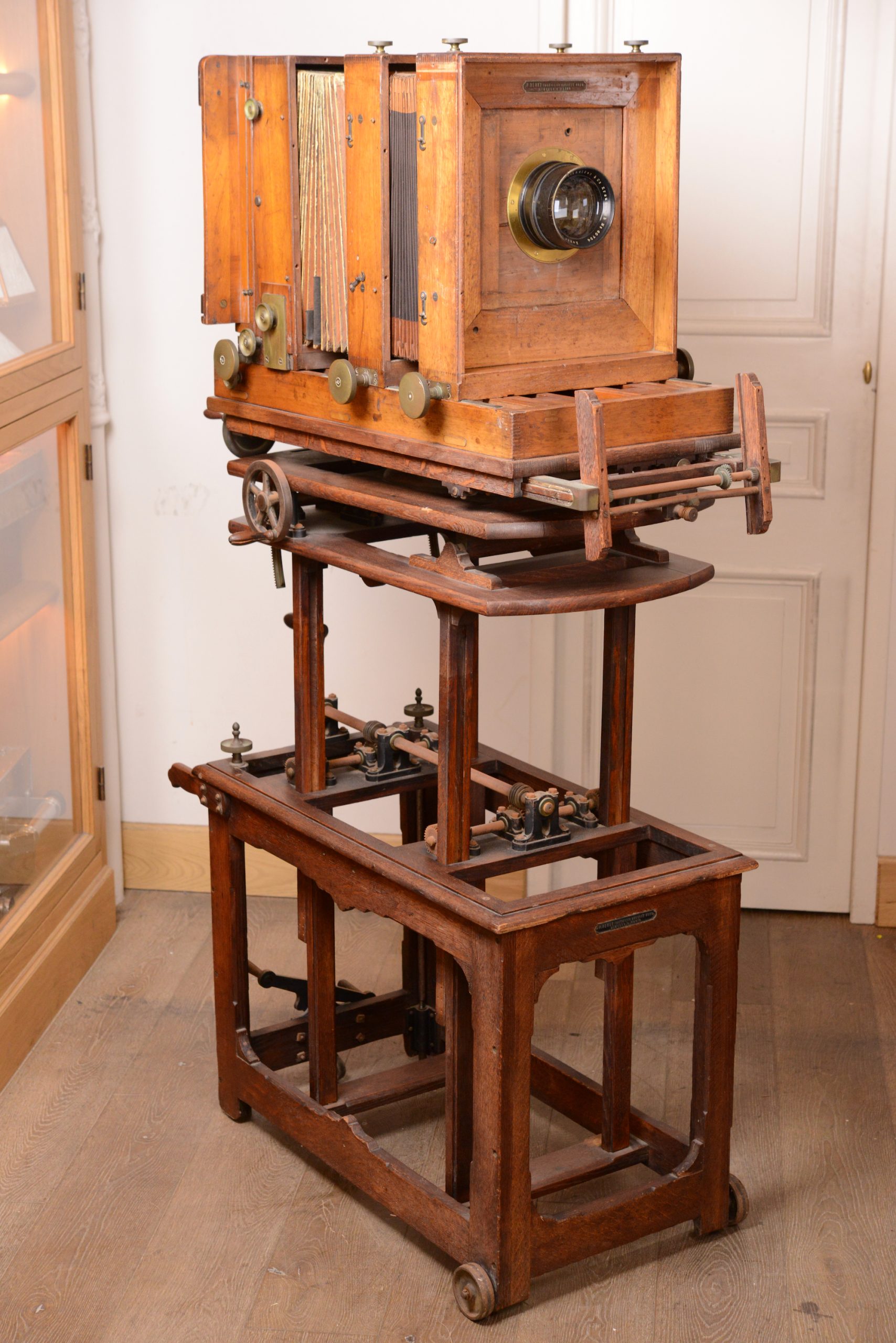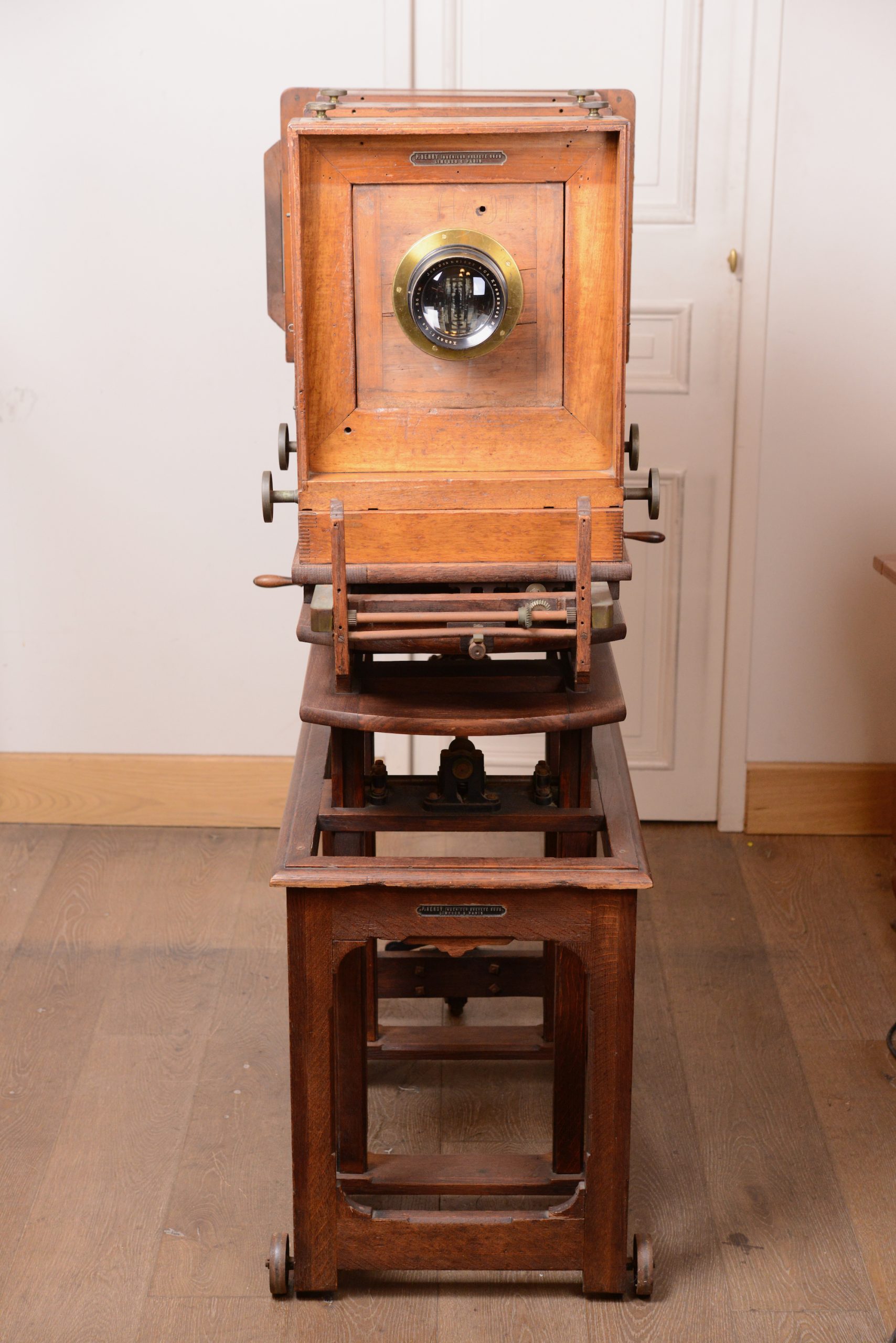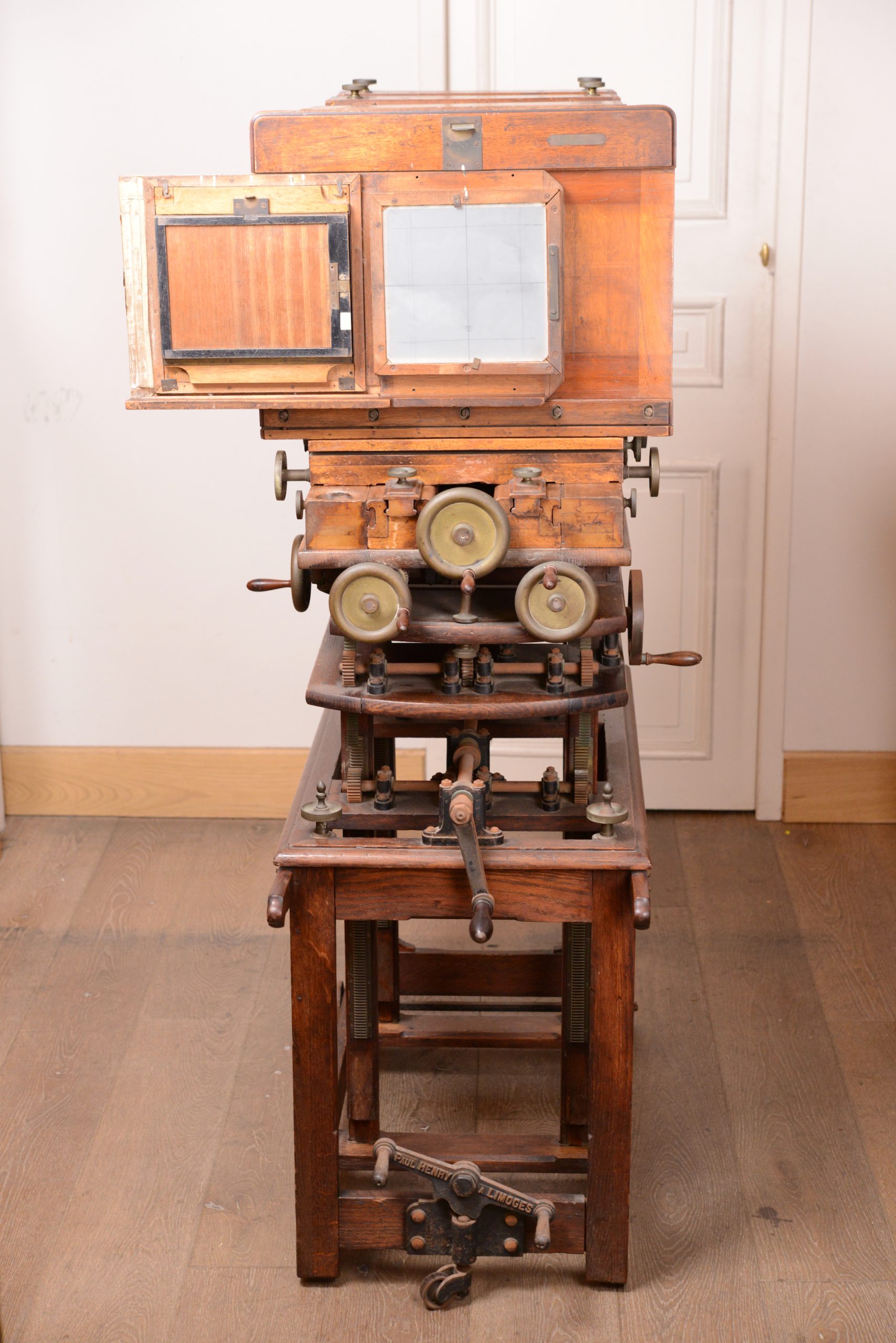 Grande chambre d'atelier pour plaques . Henry à Limoges. Avec son très beau pied de studio, confectionné sur mesure, qui permet d'effectuer ajustements, bascules et niveau. Assemblage de qualité avec une construction en bois de noyer et en laiton. En plus de son pied, la chambre vient avec un objectif Schneider & Kreuznach, Xenar, 360mm f/4,5. Longueur 1 m, largeur 60 cm, hauteur 1,43 m.