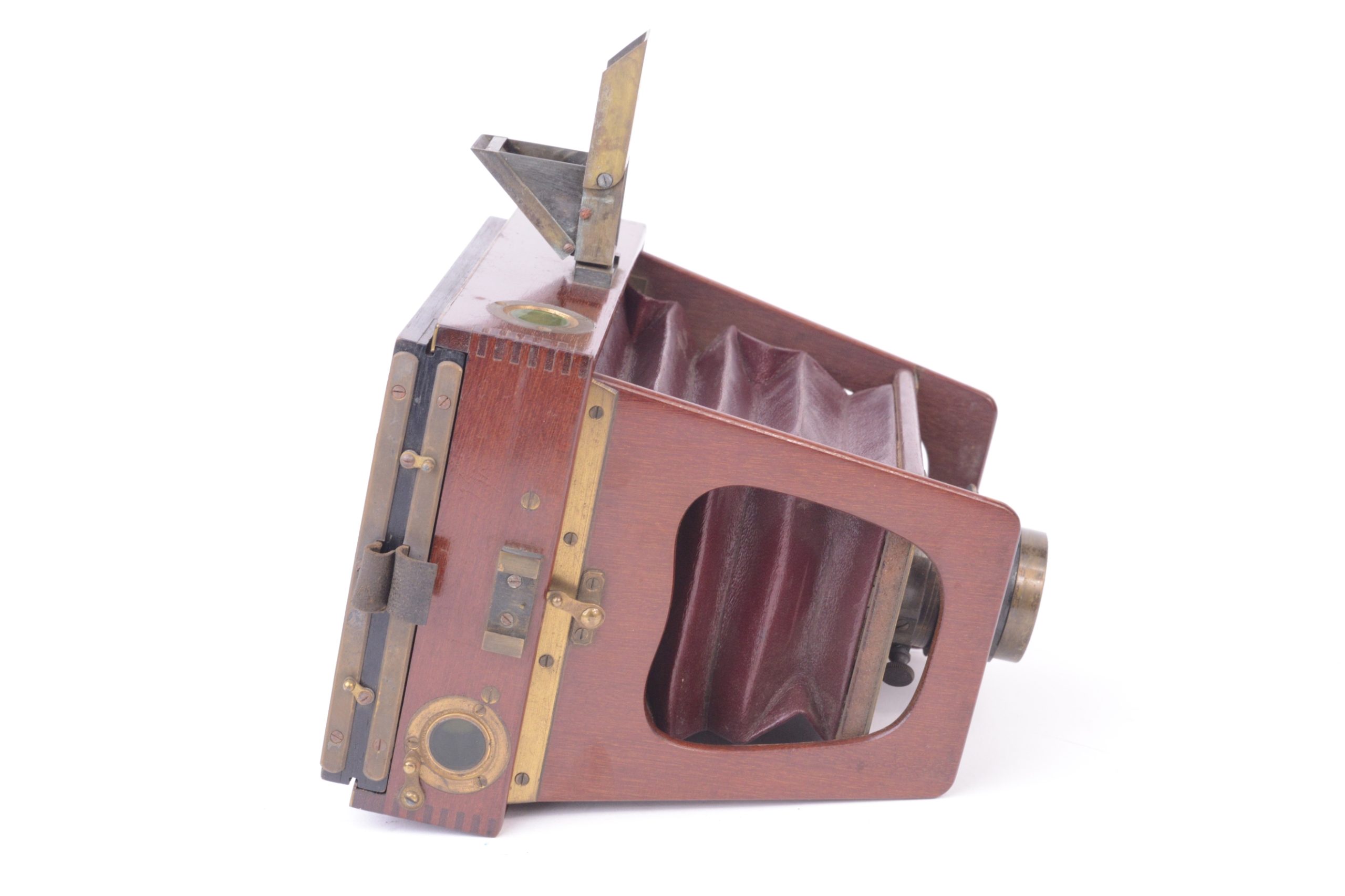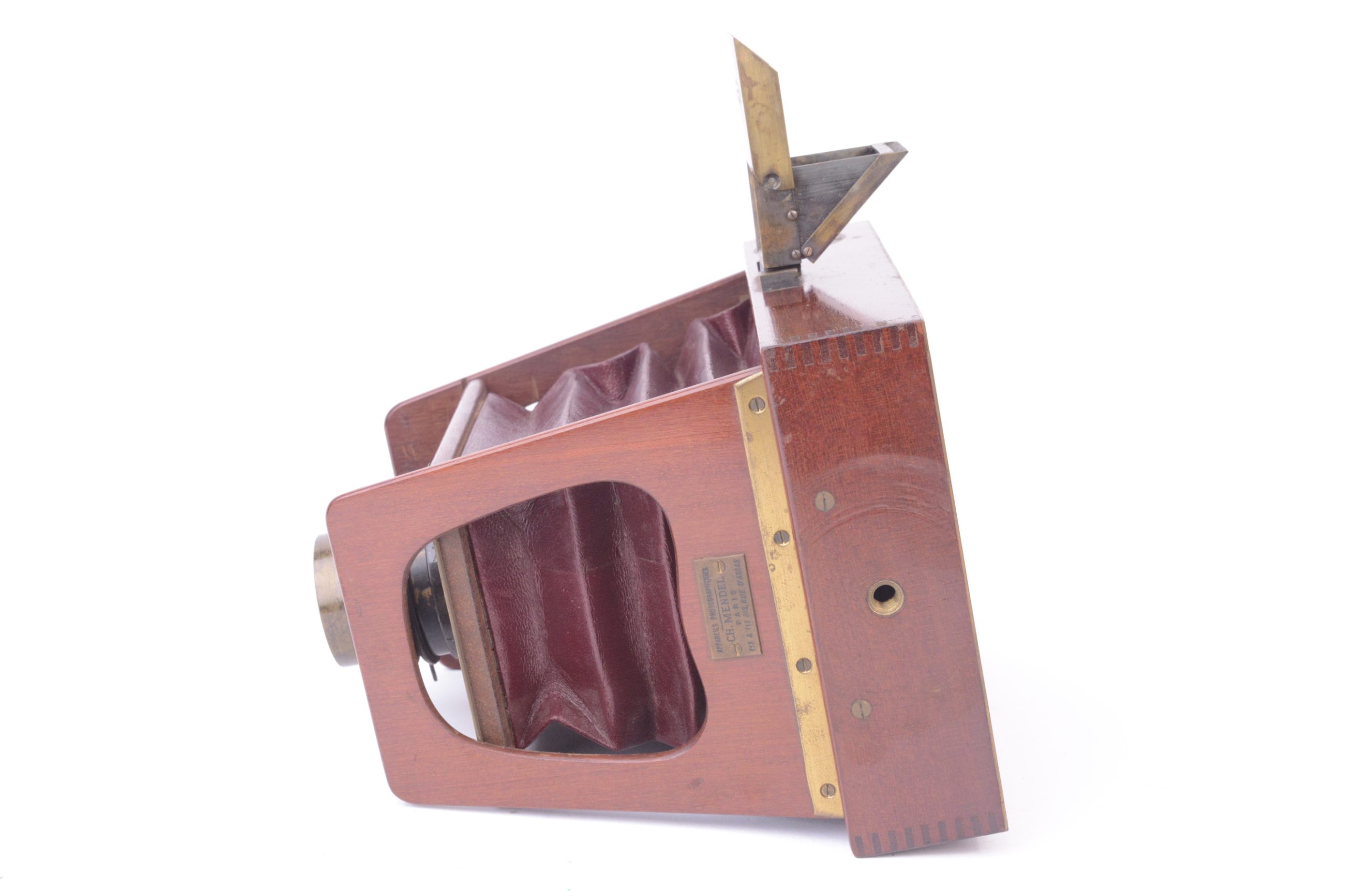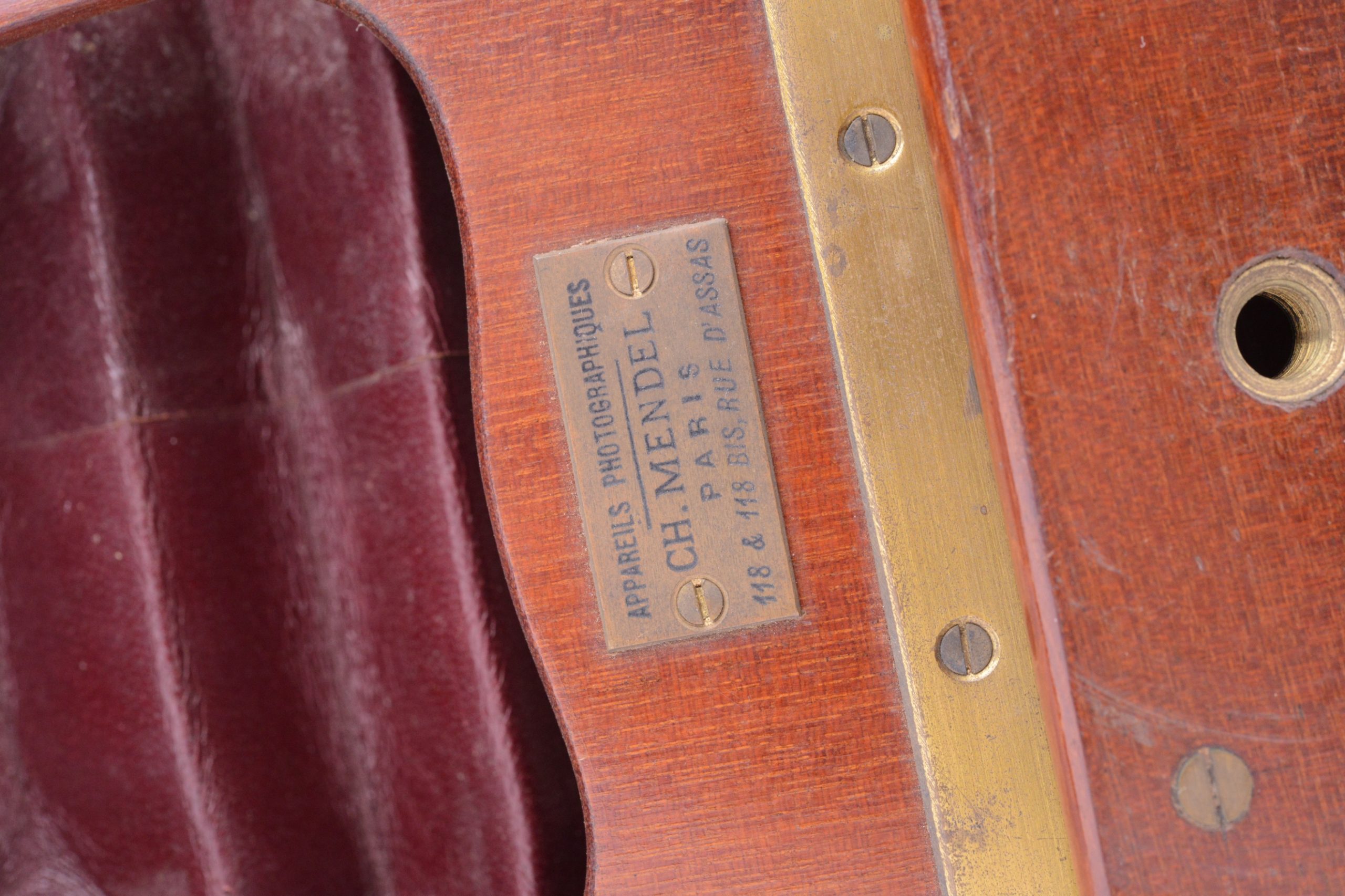 Chambre photographique à joues 9x12 Charles Mendel. Vers 1895. Plaque en cuivre portant la marque de fabrique. Corps et ailettes en acajou. Soufflet pyramidal en cuir rouge et coins non rabattus. Obturateur circulaire rotatif de type « éclipse ». Viseur pliant réflex direct. Déclencheur souple. Cadre amovible portant verre dépoli. Trois doubles à volets en acajou. Sac de transport en coutil gris, d’origine.