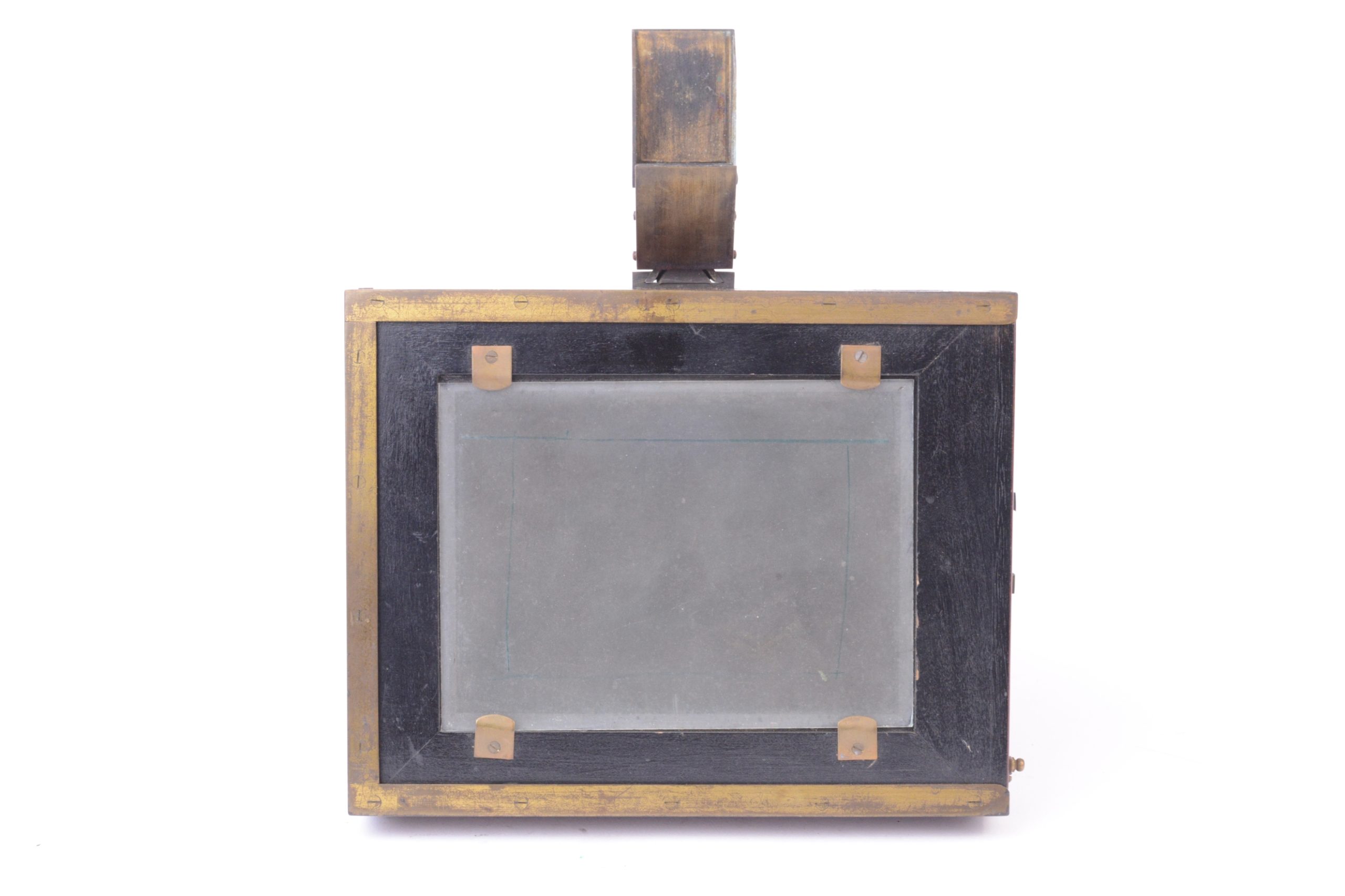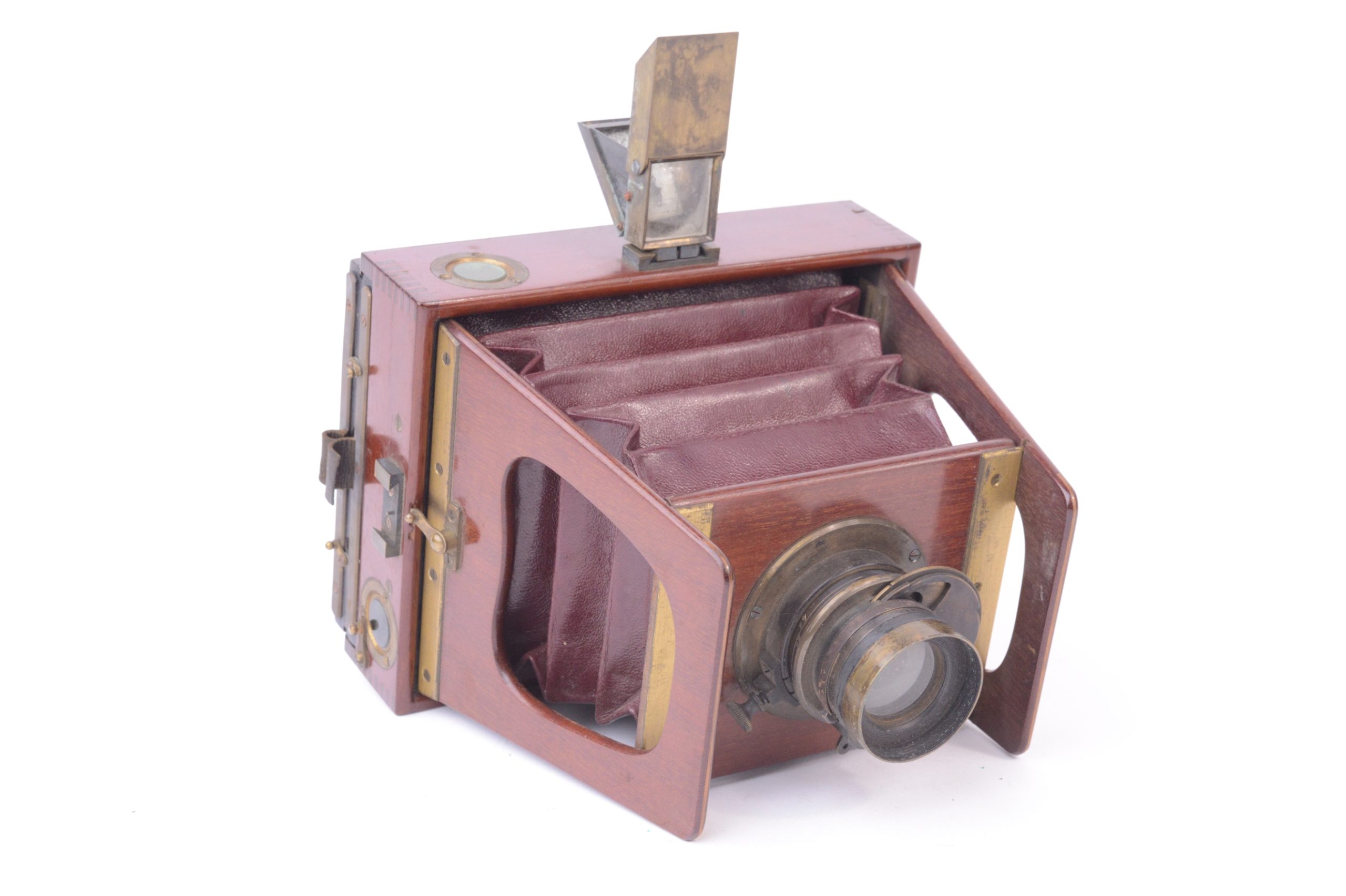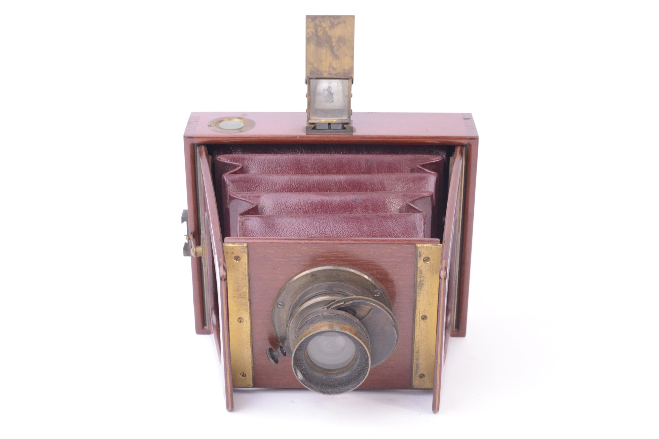 Chambre photographique à joues 9x12 Charles Mendel. Vers 1895. Plaque en cuivre portant la marque de fabrique. Corps et ailettes en acajou. Soufflet pyramidal en cuir rouge et coins non rabattus. Obturateur circulaire rotatif de type « éclipse ». Viseur pliant réflex direct. Déclencheur souple. Cadre amovible portant verre dépoli. Trois doubles à volets en acajou. Sac de transport en coutil gris, d’origine.