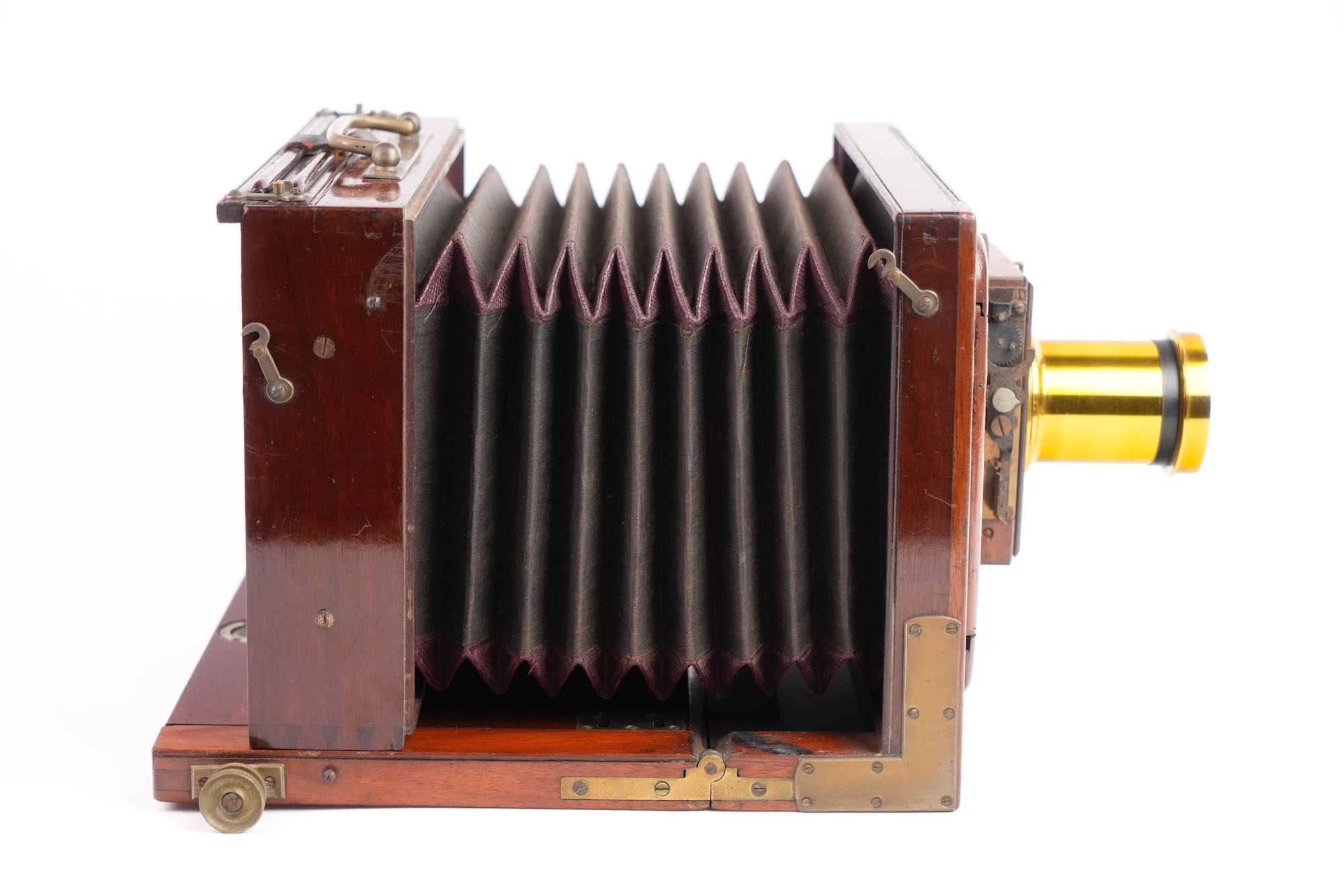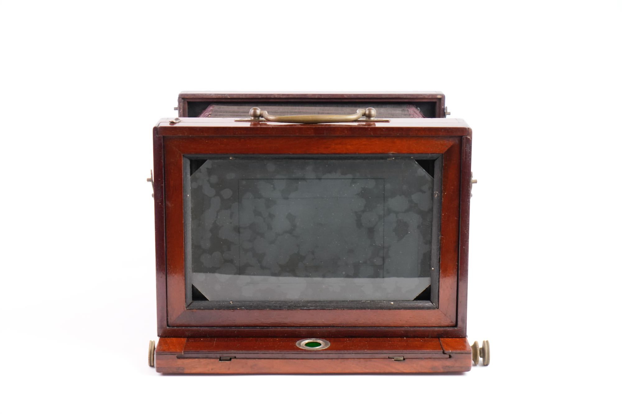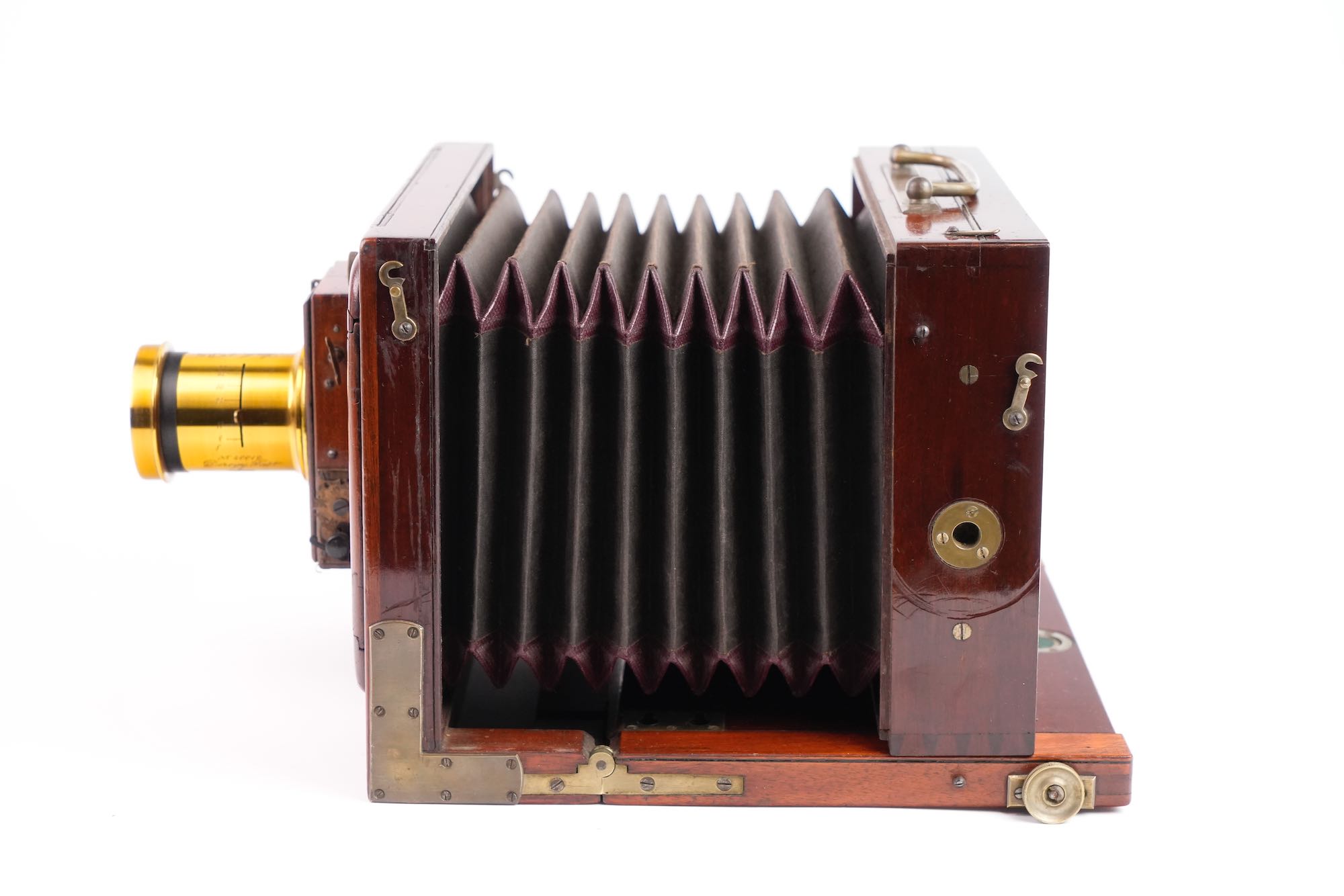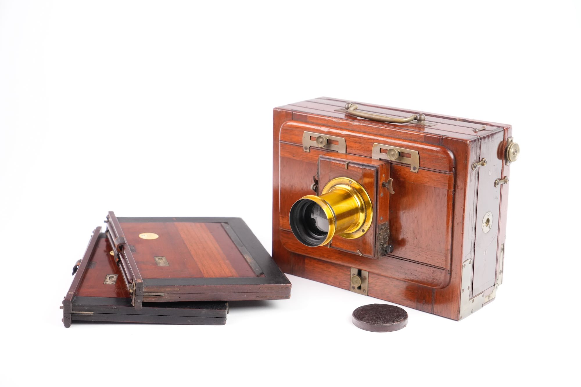 <p data-start="245" data-end="549">Chambre photographique de voyage, attribuée à la maison Baligny, de construction française, réalisée en acajou verni avec renforts et en laiton. L’appareil est conçu pour des plaques 13 × 18 cm. La chambre repose sur un bâti à soufflet accordéon en cuire noire renforcée, monté sur rail à crémaillère assurant une mise au point précise. Le corps avant mobile reçoit une planchette porte-objectif à glissières, équipée ici d’un objectif en laiton à visée centrale, monté sur obturateur à rideau. À l’arrière, on trouve un dos à châssis simple, avec verre dépoli escamotable, maintenu par cadres et ressorts métalliques. L’ensemble est accompagné de 2 châssis bois d’origine, compatibles plaques sèches et collodion. Une poignée de transport latérale en cuir complète l’équipement, très bel état.</p>