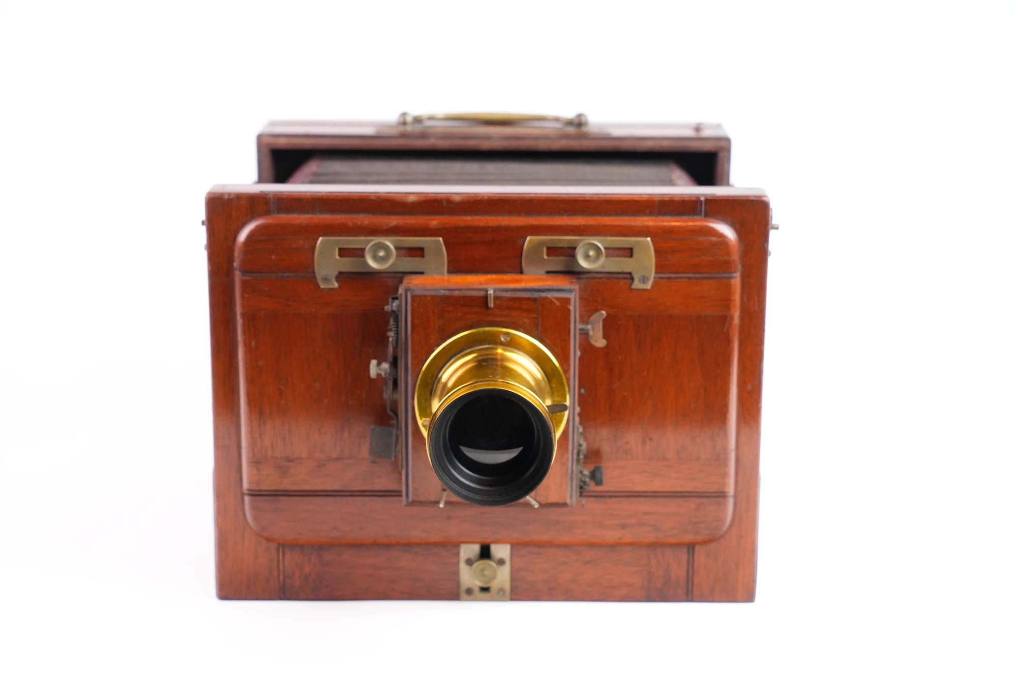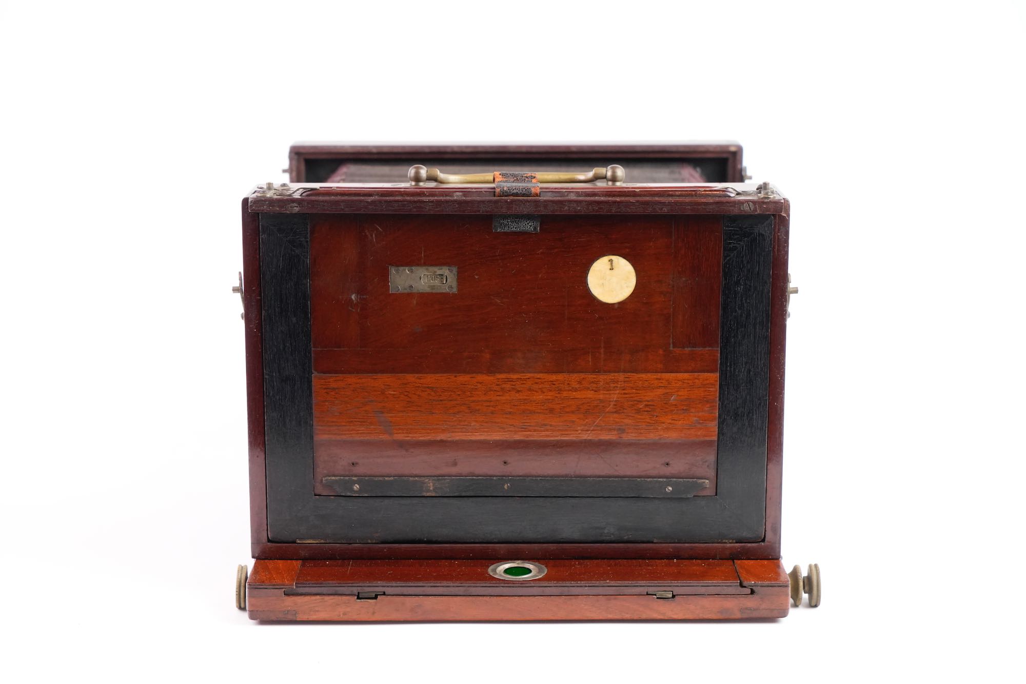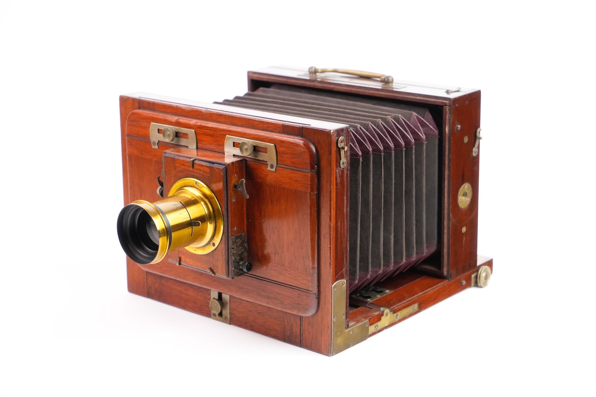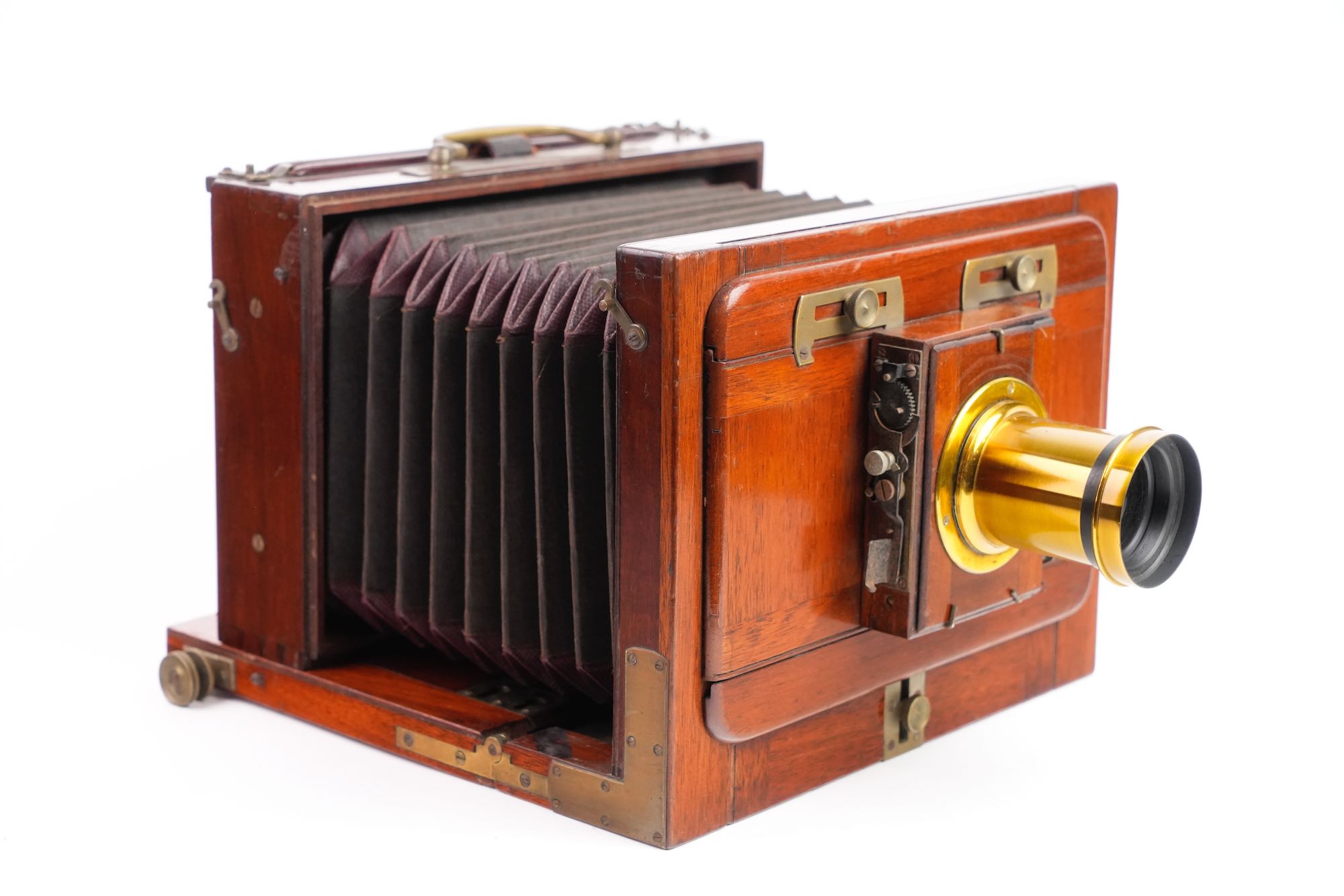 <p data-start="245" data-end="549">Chambre photographique de voyage, attribuée à la maison Baligny, de construction française, réalisée en acajou verni avec renforts et en laiton. L’appareil est conçu pour des plaques 13 × 18 cm. La chambre repose sur un bâti à soufflet accordéon en cuire noire renforcée, monté sur rail à crémaillère assurant une mise au point précise. Le corps avant mobile reçoit une planchette porte-objectif à glissières, équipée ici d’un objectif en laiton à visée centrale, monté sur obturateur à rideau. À l’arrière, on trouve un dos à châssis simple, avec verre dépoli escamotable, maintenu par cadres et ressorts métalliques. L’ensemble est accompagné de 2 châssis bois d’origine, compatibles plaques sèches et collodion. Une poignée de transport latérale en cuir complète l’équipement, très bel état.</p>