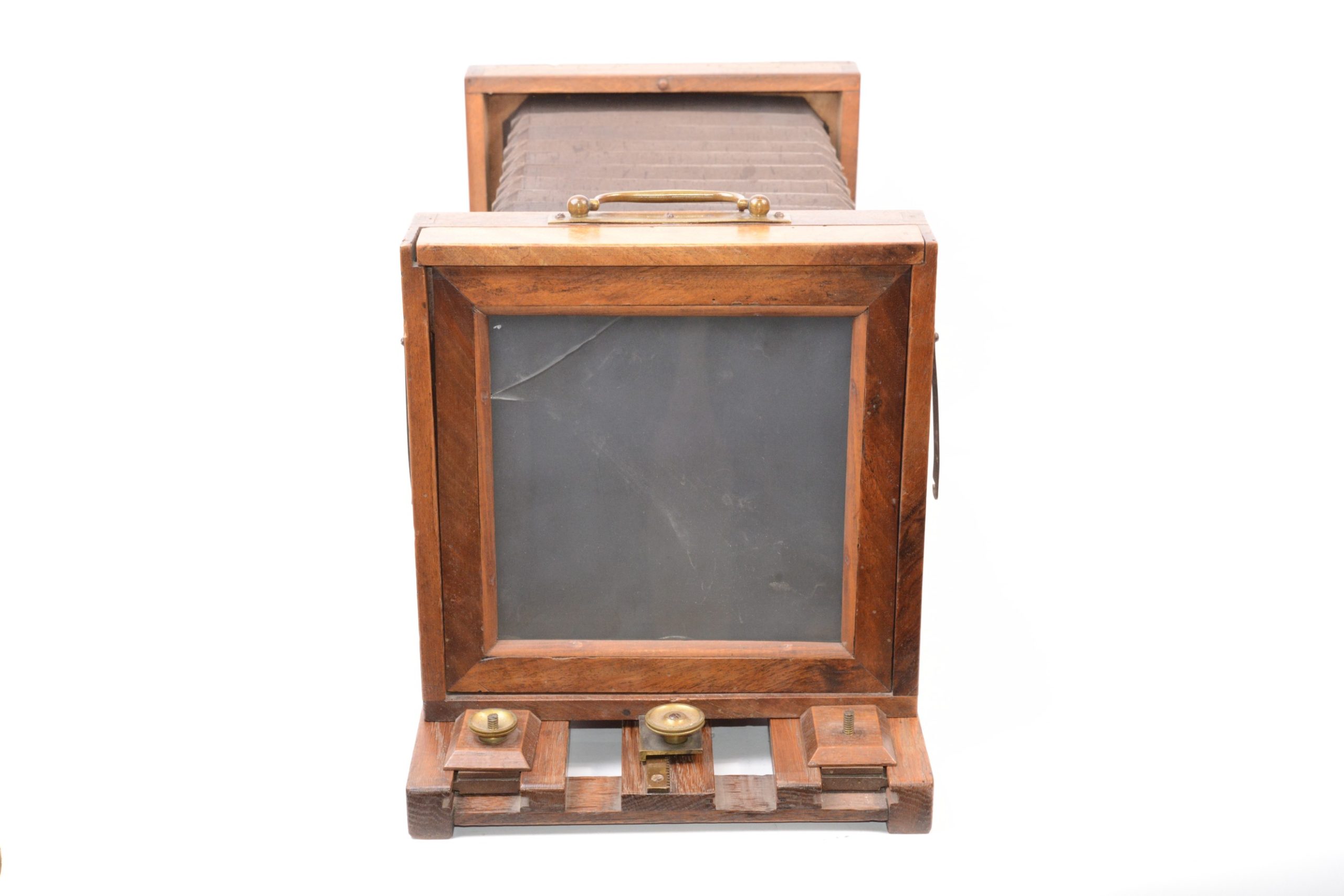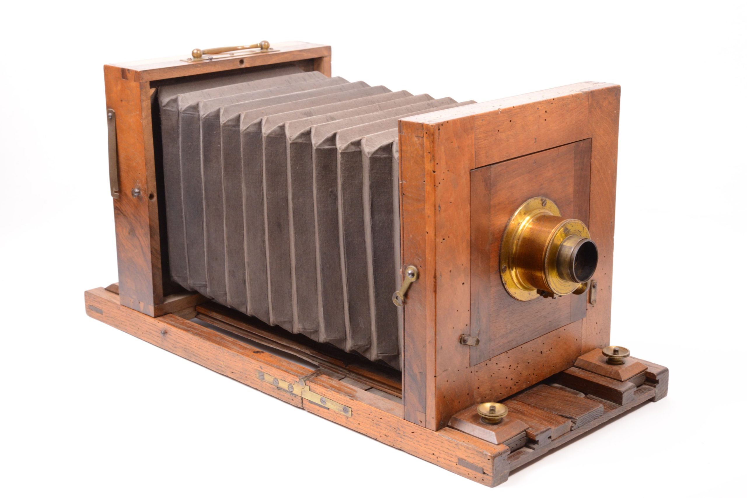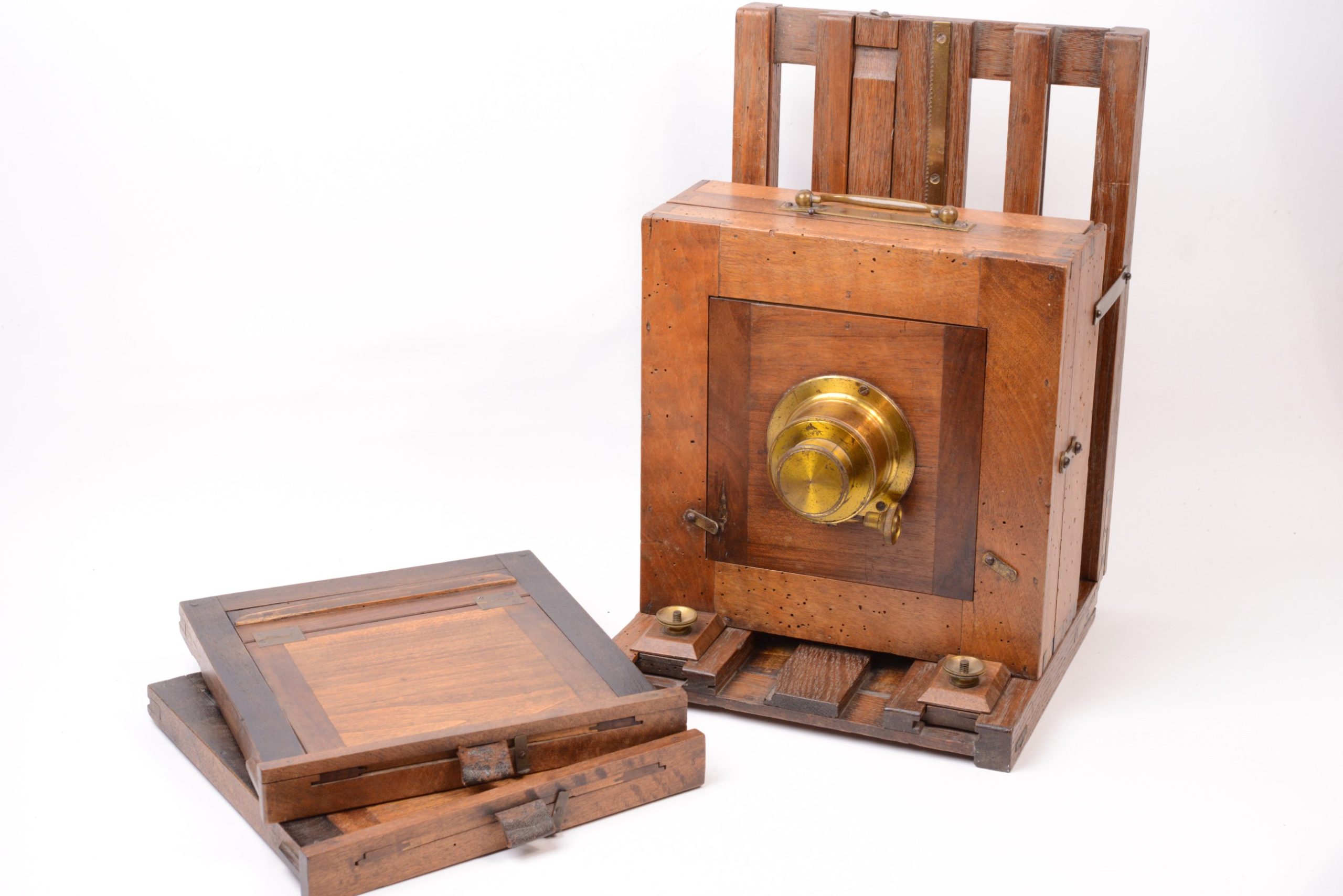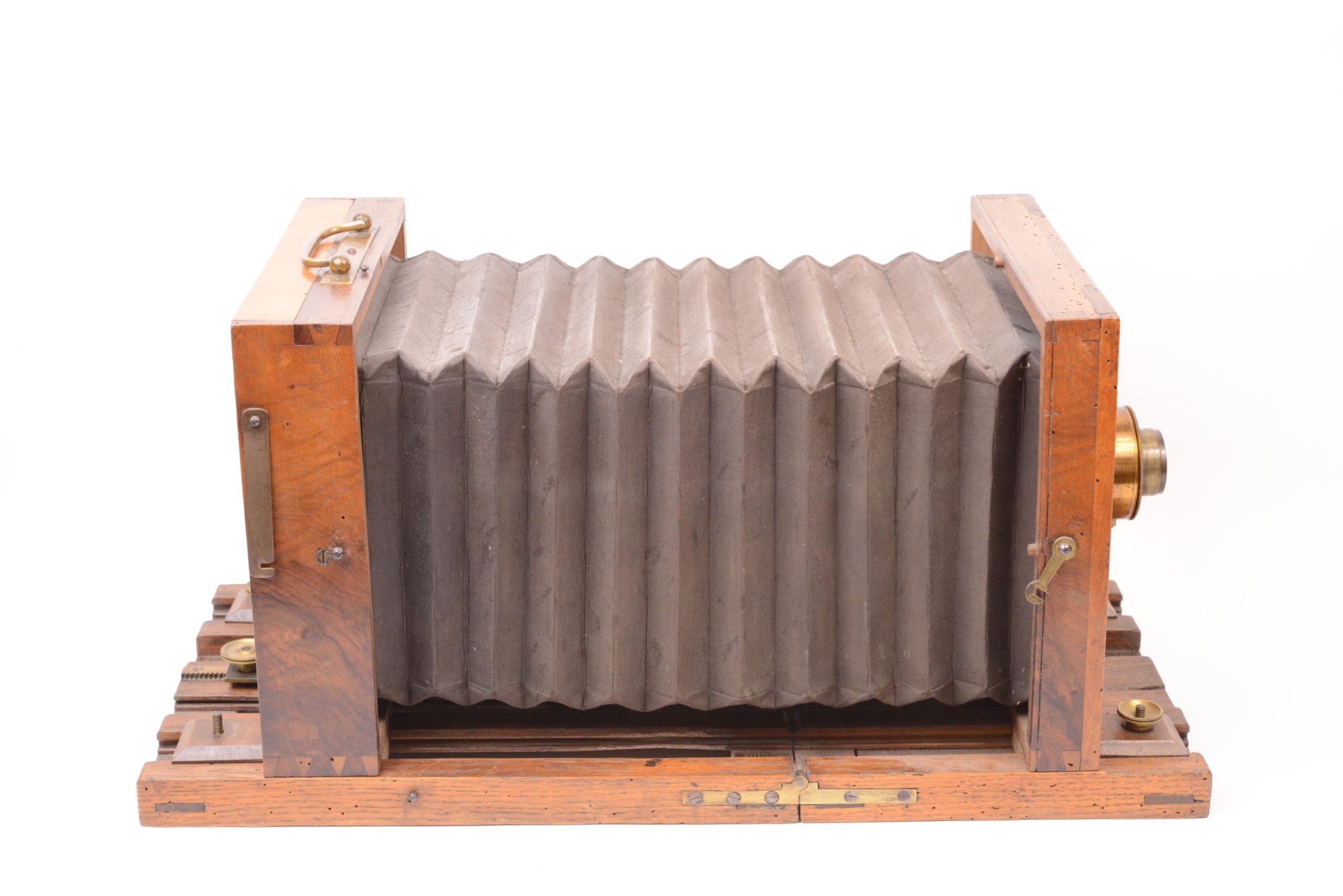 Chambre photographique de studio d’époque collodion, au format 13x18. Construction traditionnelle française en vieux noyer, avec assemblages de l’ébénisterie par queues d’aronde. Soufflet en tissu noir. Mise au point par glissement sur rails des deux corps de la chambre. Objectif Darlot en laiton pour paysage. Cadre avec verre dépoli. Présence de deux châssis simples à volets, dont l’un possède un cadre réducteur pour format 9x12 cm.