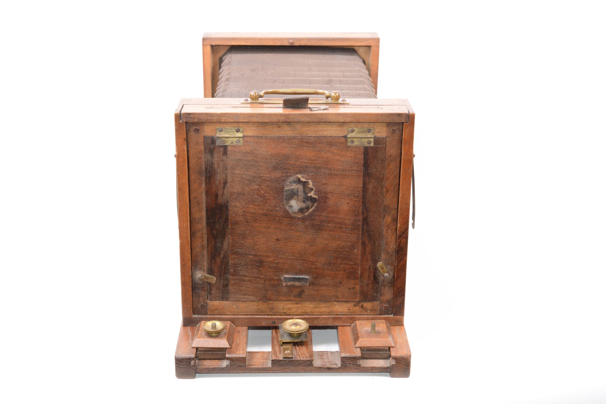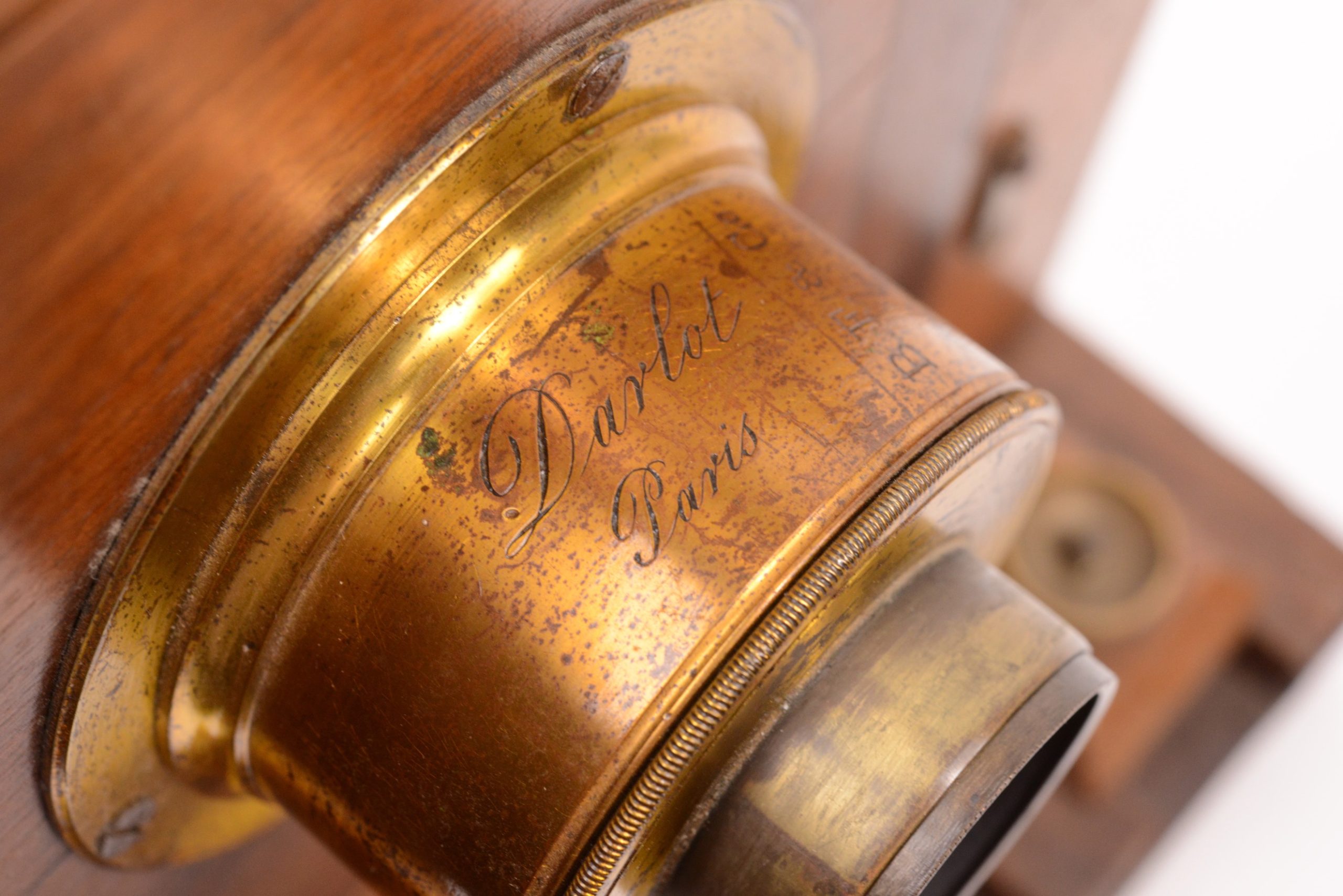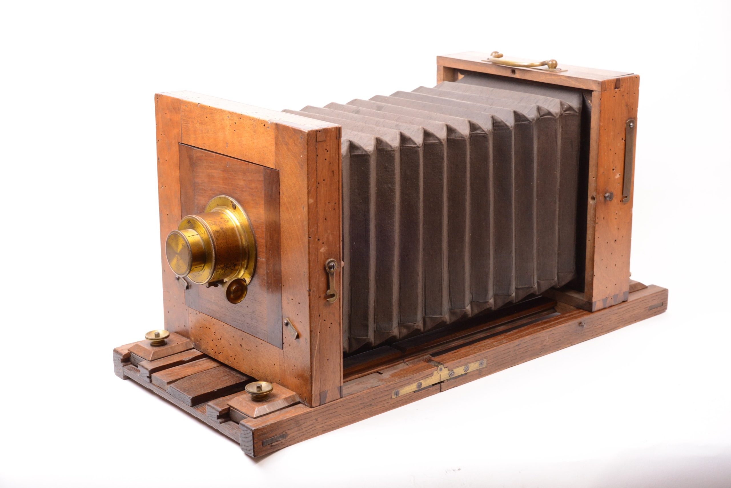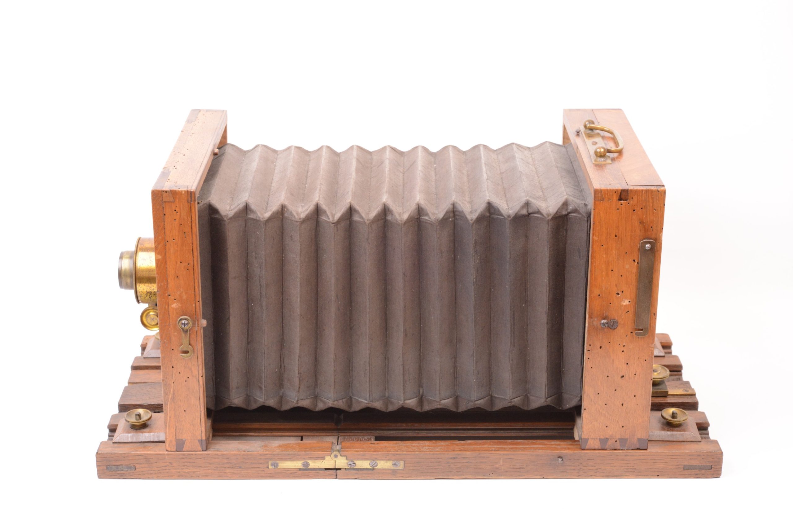 Chambre photographique de studio d’époque collodion, au format 13x18. Construction traditionnelle française en vieux noyer, avec assemblages de l’ébénisterie par queues d’aronde. Soufflet en tissu noir. Mise au point par glissement sur rails des deux corps de la chambre. Objectif Darlot en laiton pour paysage. Cadre avec verre dépoli. Présence de deux châssis simples à volets, dont l’un possède un cadre réducteur pour format 9x12 cm.
