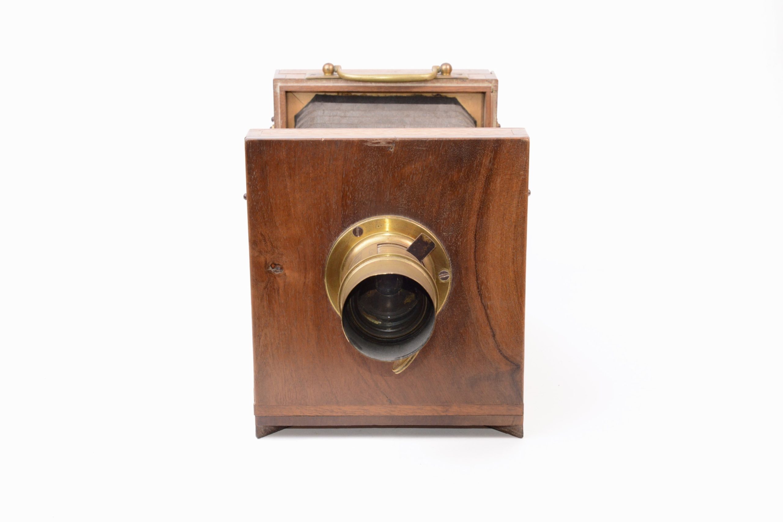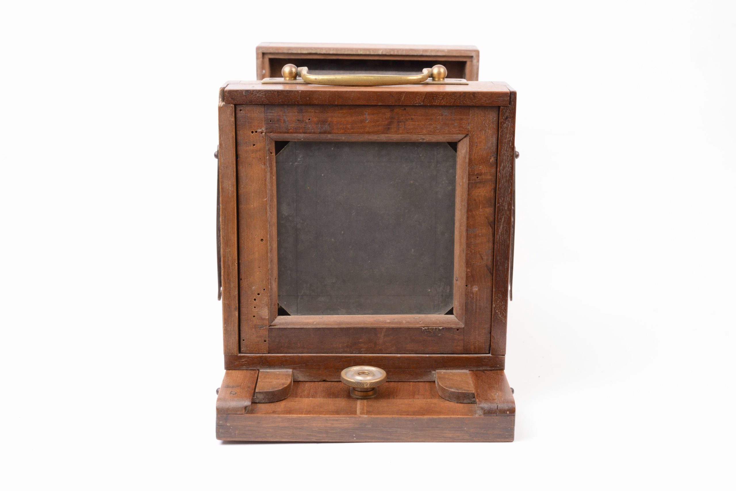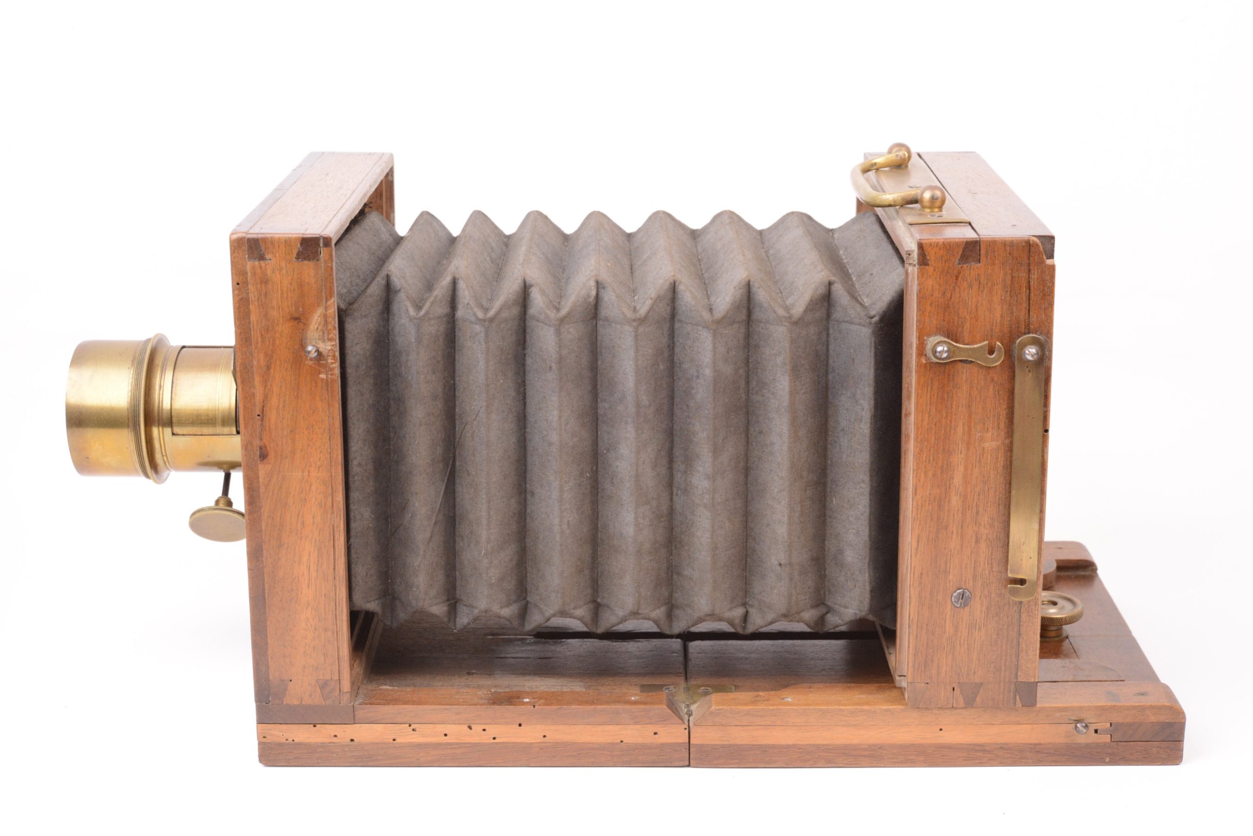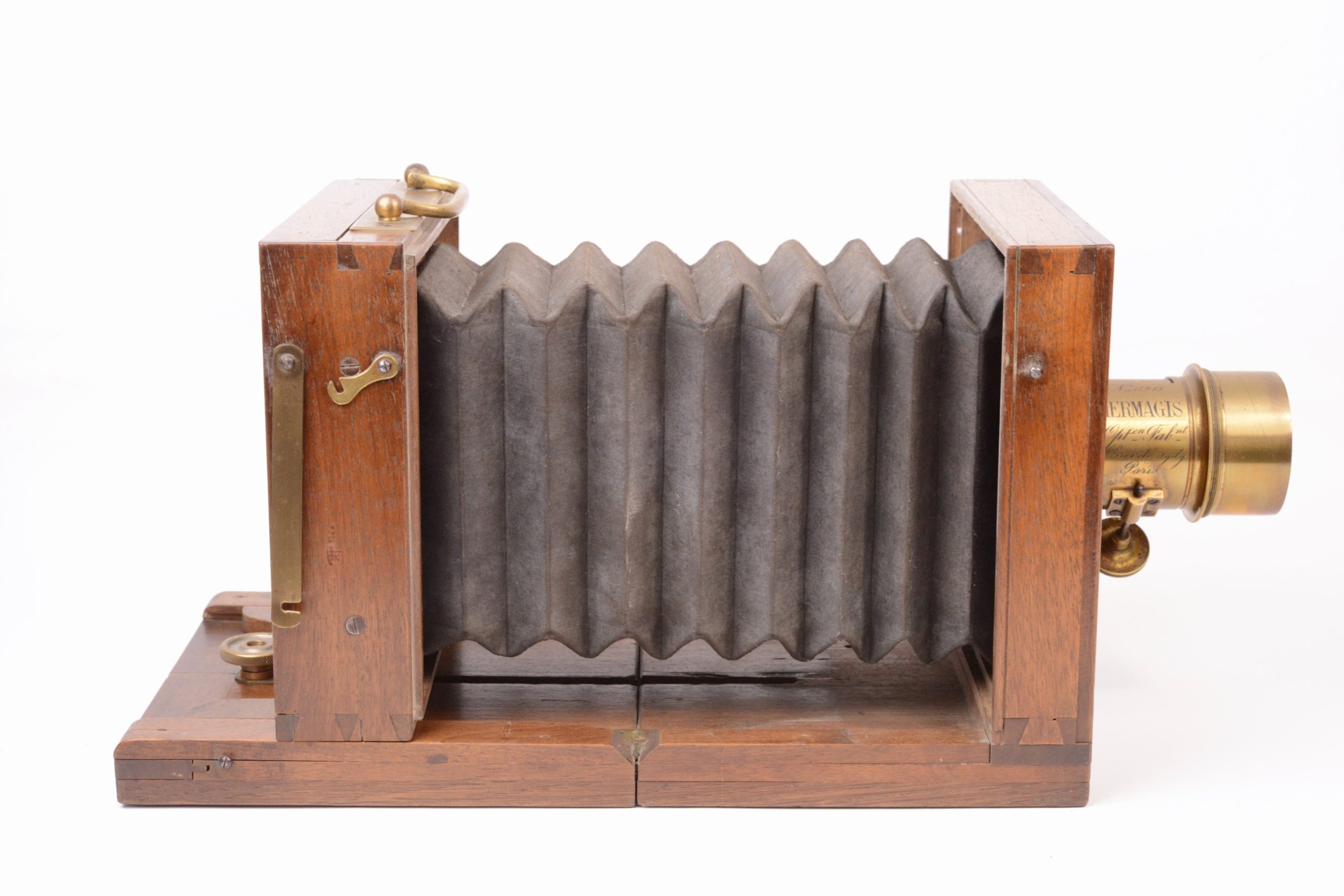 Chambre de voyage époque collodion. 1/4 de plaque. Objectif Hermagis à portrait de type Petzval, avec diaphragme à vannes. Format 9x12 cm. Belle fabrication en vieux noyer, avec assemblages de l’ébénisterie par queues d’aronde. Soufflet en tissu noir. Présence d’un châssis d’origine ainsi que du cadre dépoli. Hauteur 21 cm et largeur 19 cm. Vers 1860. Peu courant.