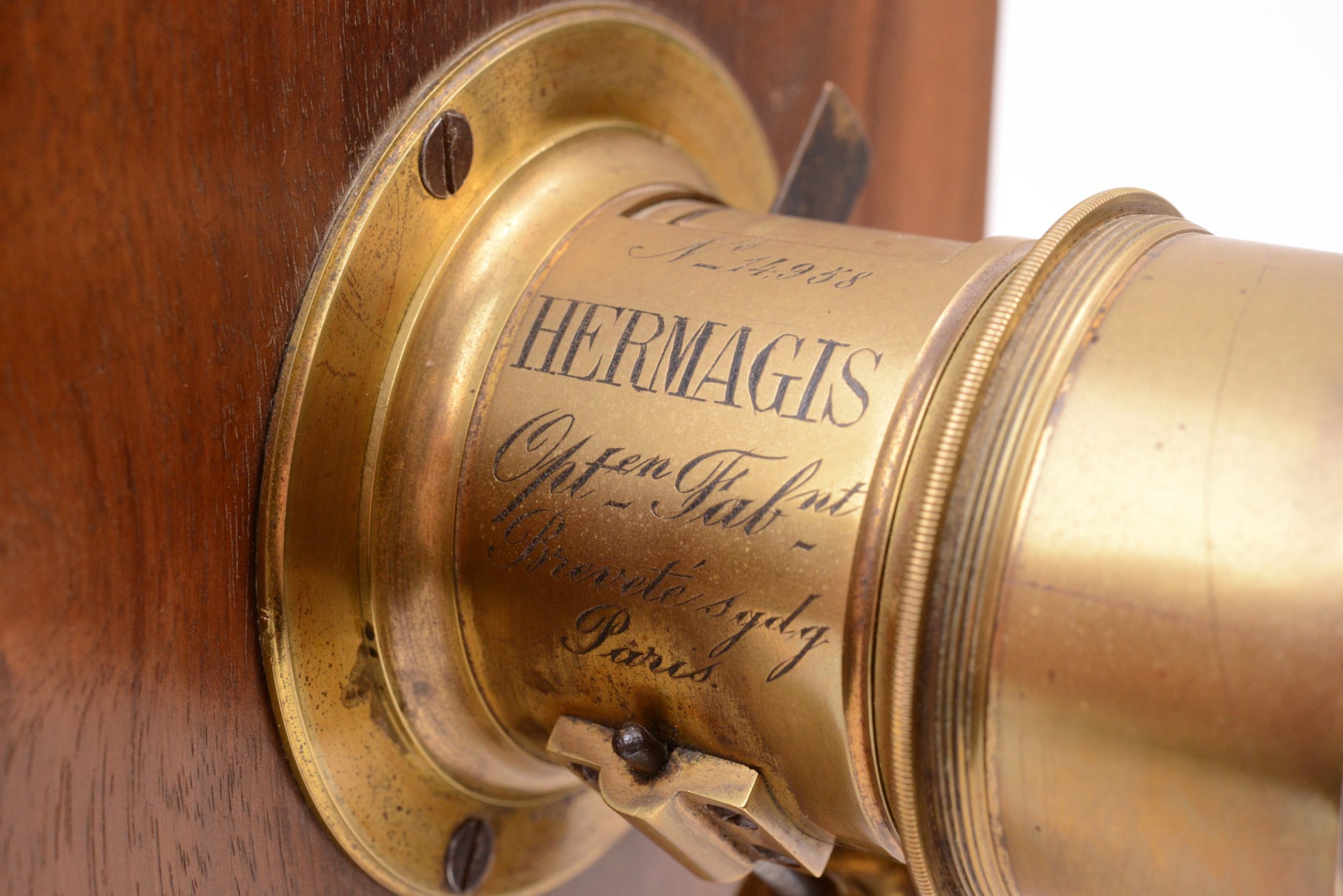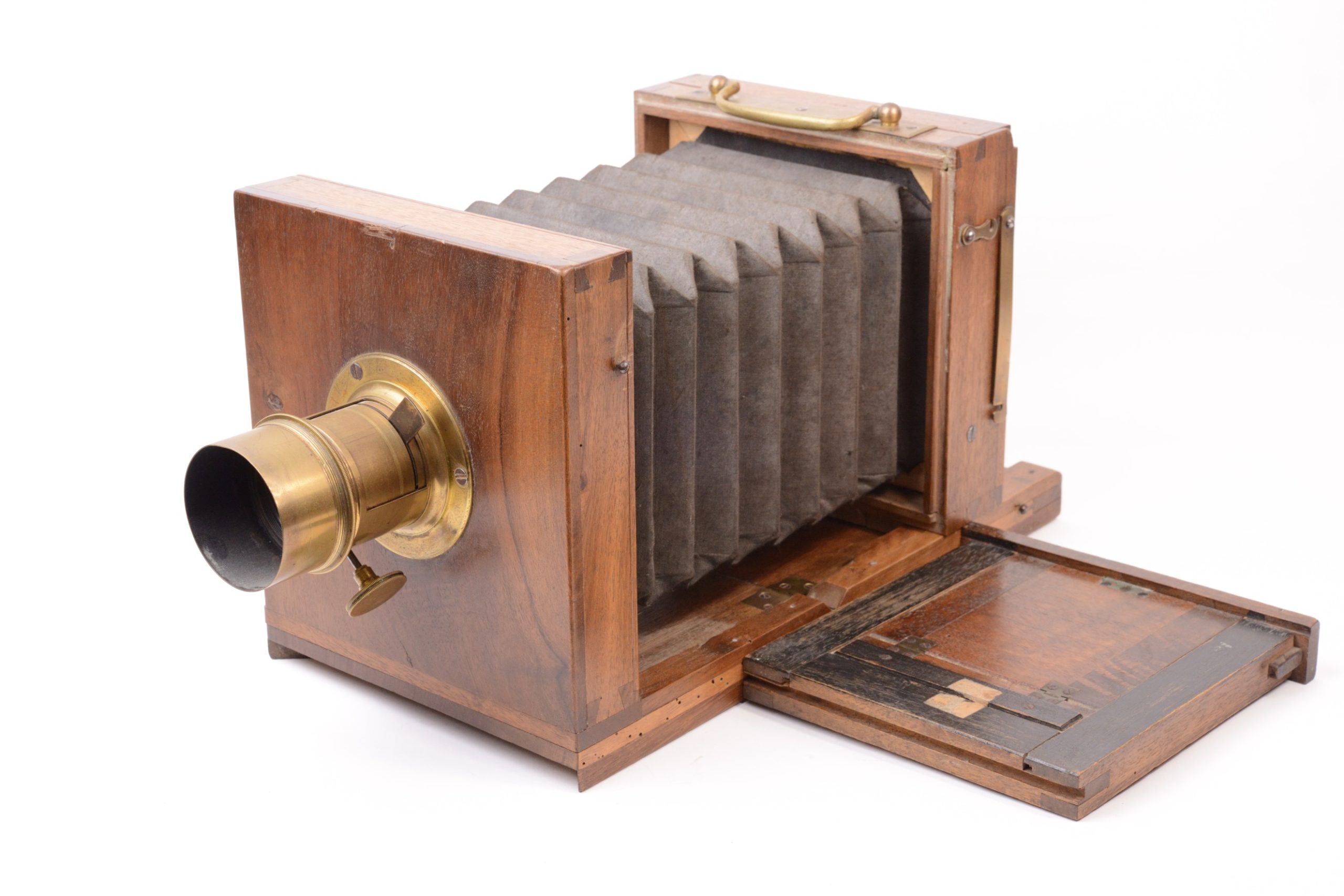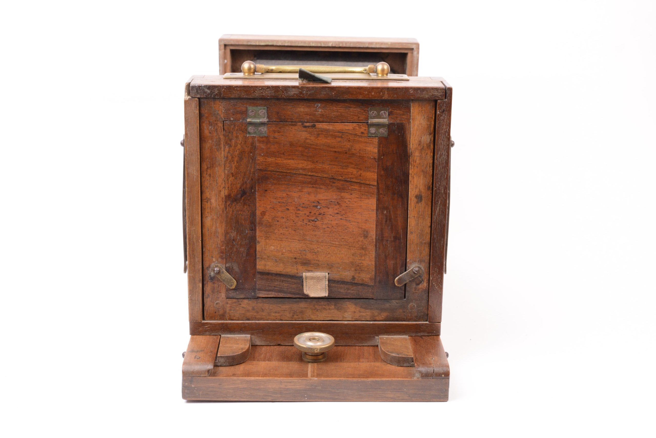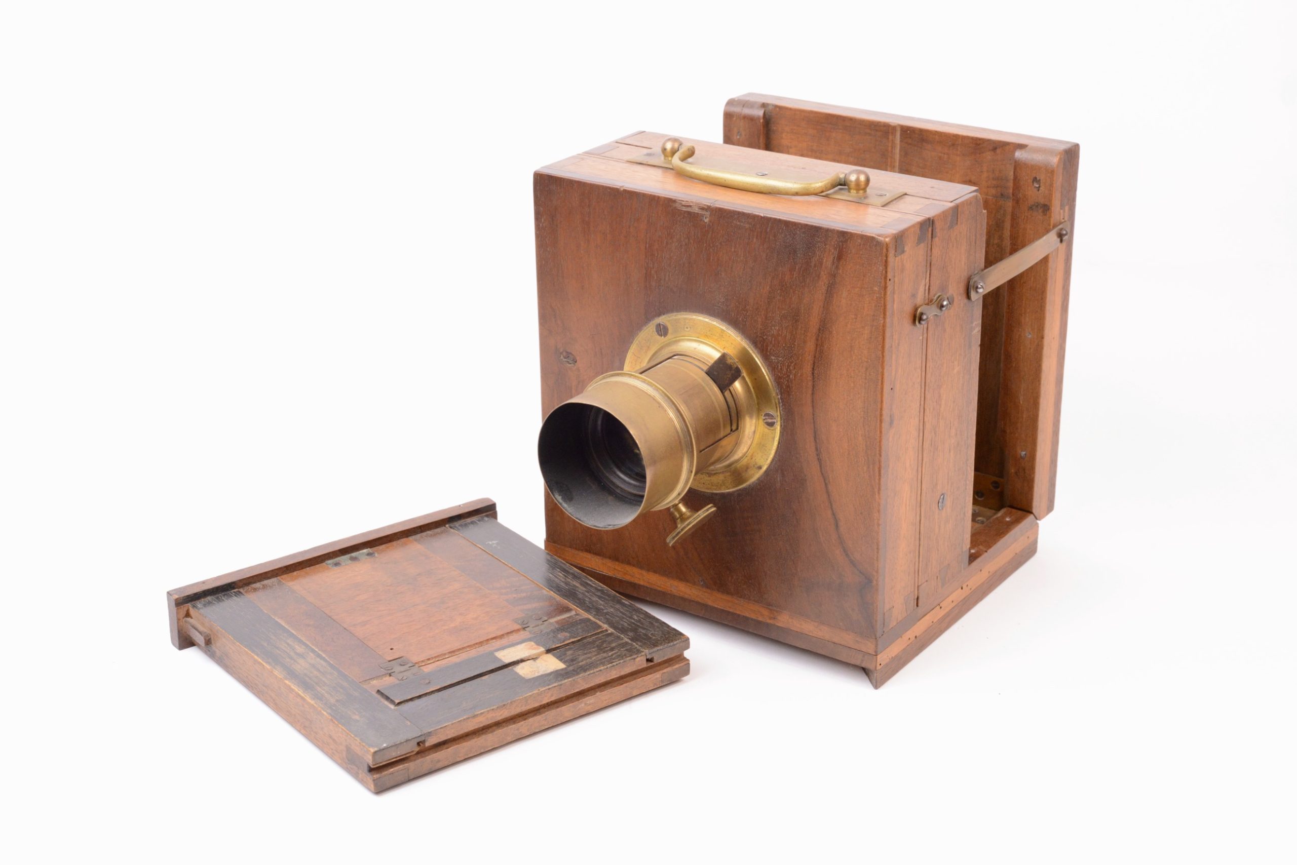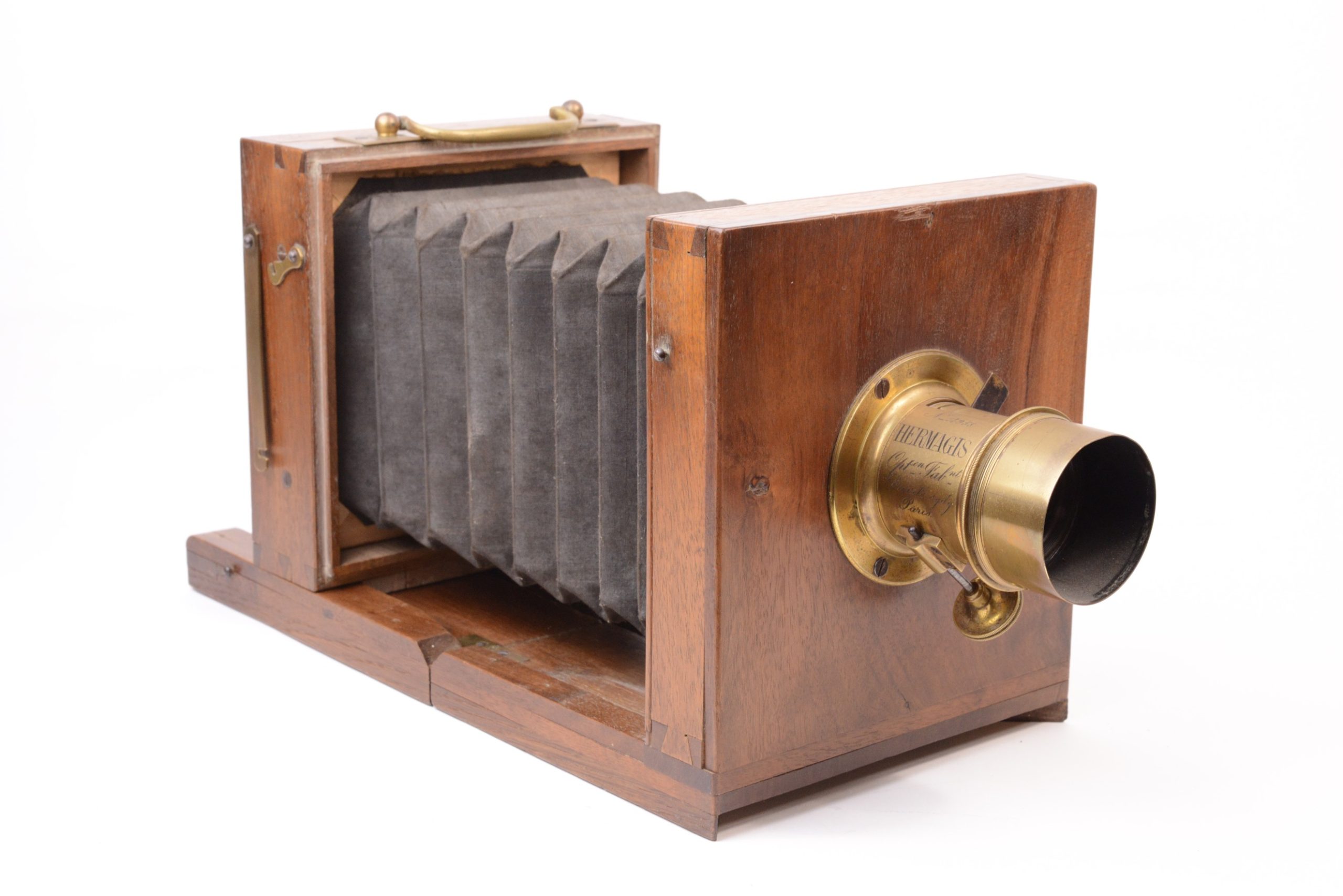 Chambre de voyage époque collodion. 1/4 de plaque. Objectif Hermagis à portrait de type Petzval, avec diaphragme à vannes. Format 9x12 cm. Belle fabrication en vieux noyer, avec assemblages de l’ébénisterie par queues d’aronde. Soufflet en tissu noir. Présence d’un châssis d’origine ainsi que du cadre dépoli. Hauteur 21 cm et largeur 19 cm. Vers 1860. Peu courant.