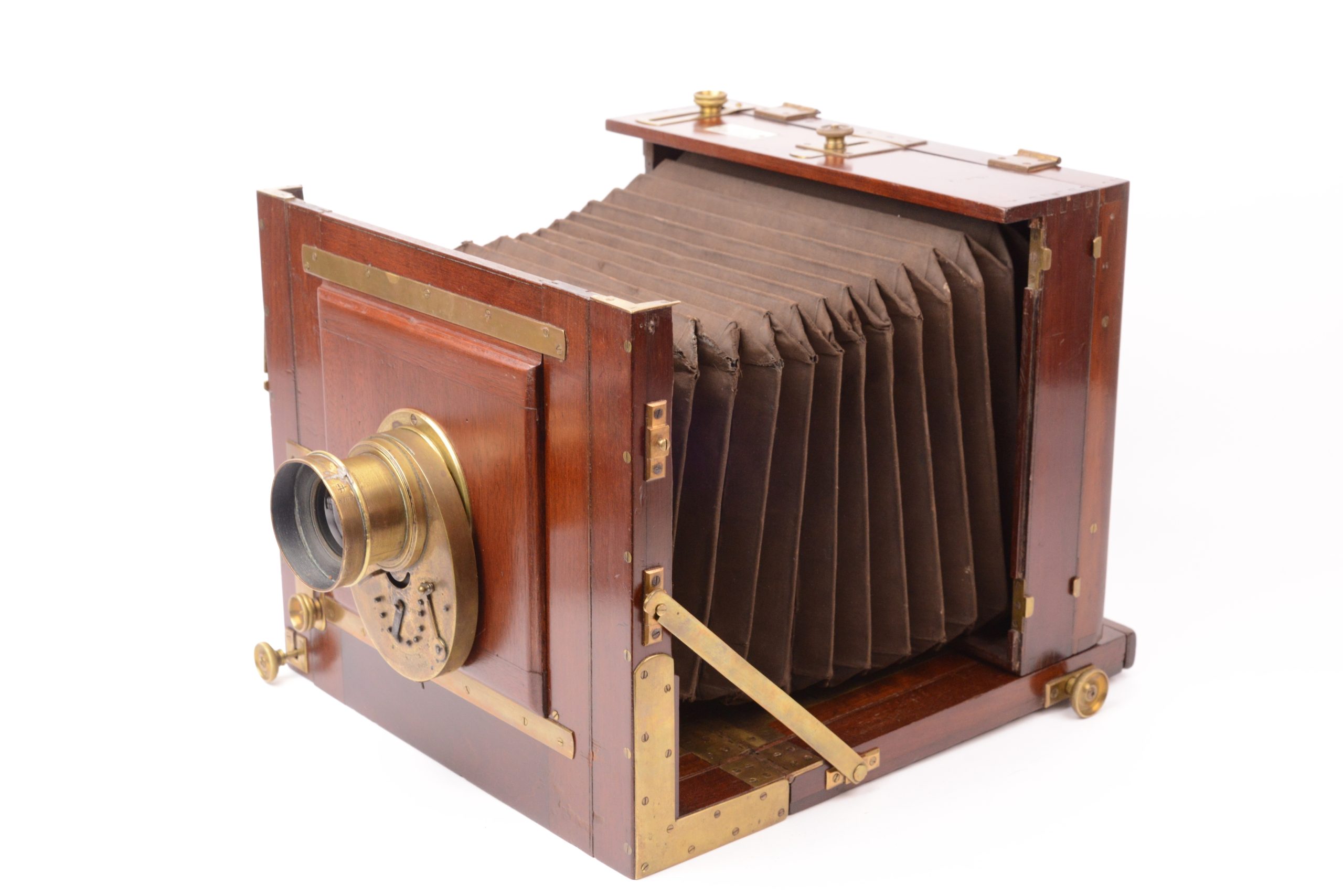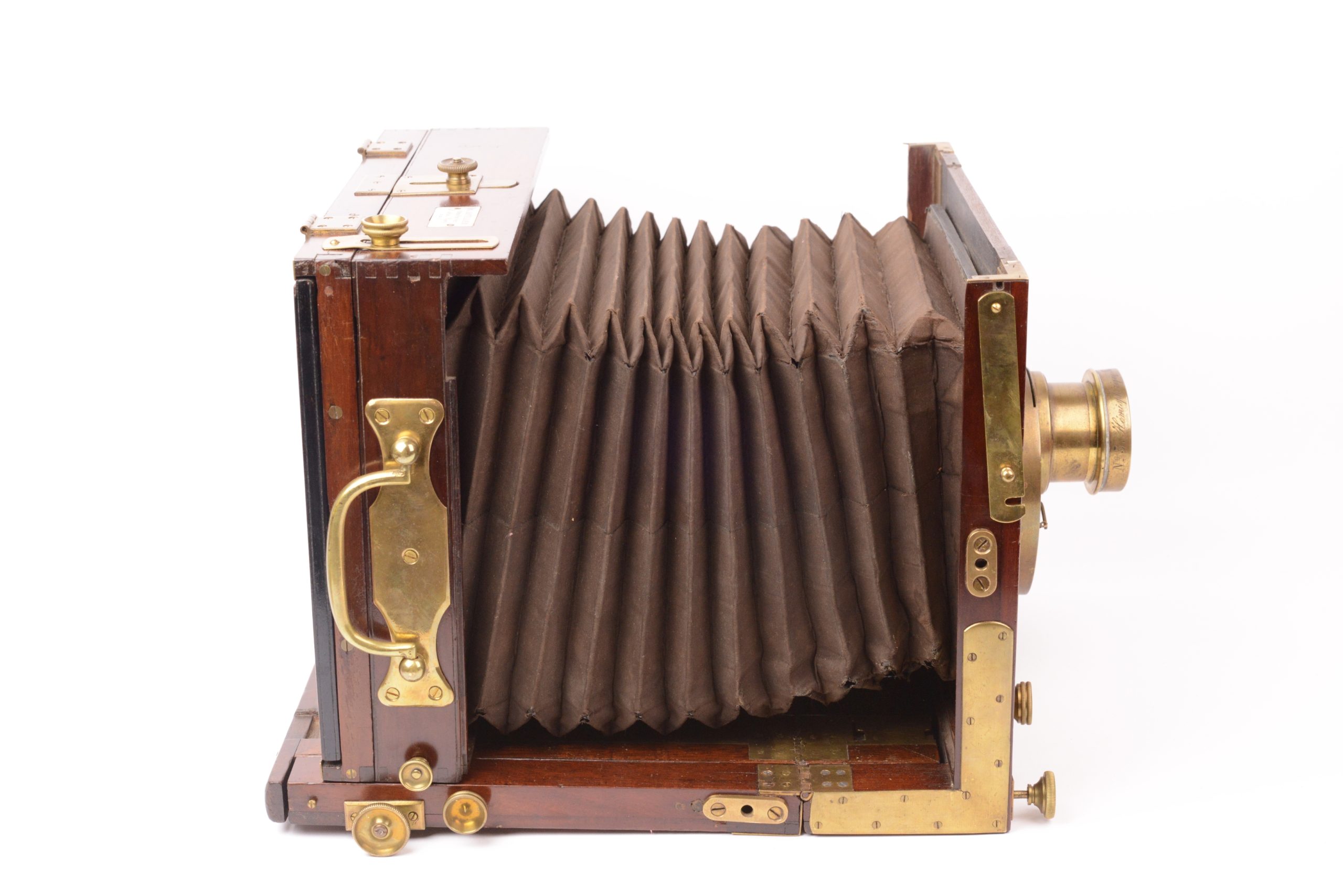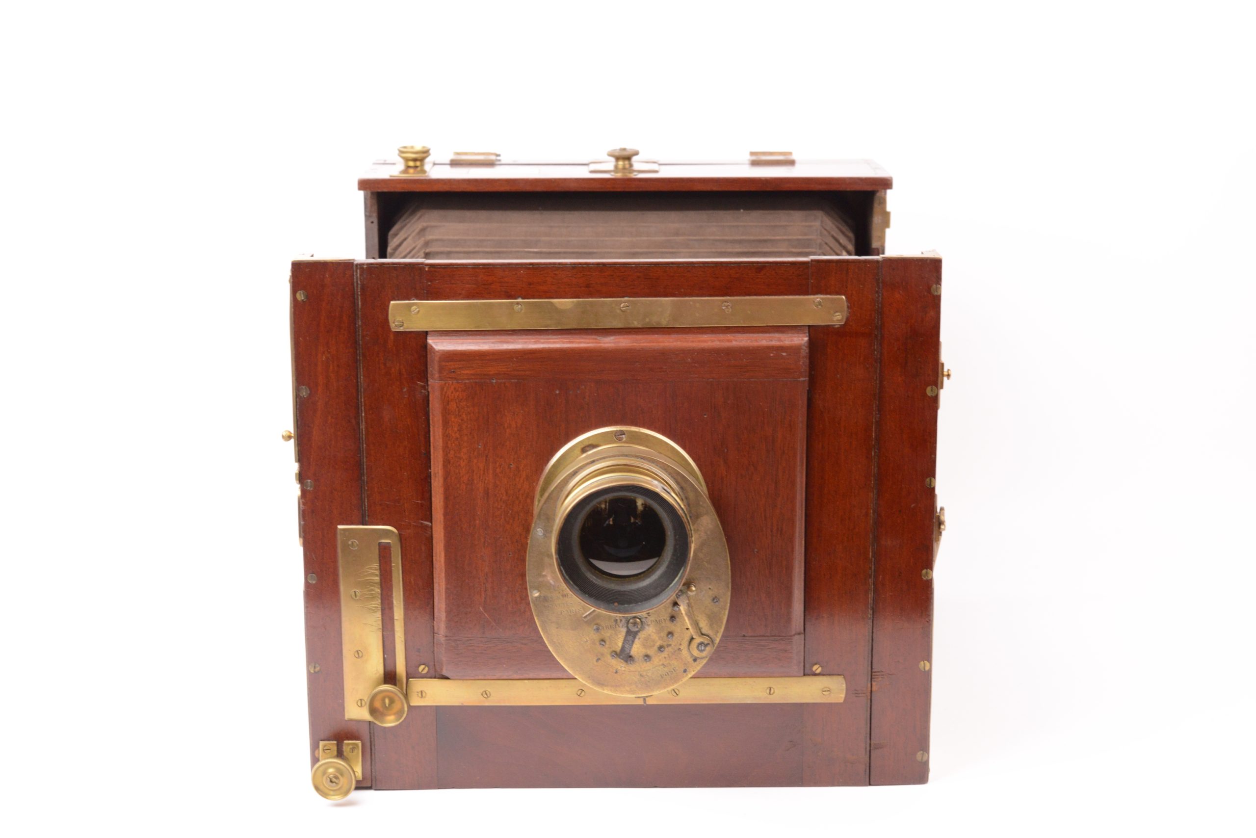 Chambre Duchâtellier Paris. Format 18x24 cm. Vers 1895. Plaque de fabrique portant mentions « <em>Duchâtellier Constructeur 70 rue des Rigoles Paris</em> ». Belle fabrication, ébénisterie en acajou rouge avec soufflet en cuir à coins rabattus. Garnitures métalliques en laiton poli. Obturateur tout en laiton rotatif à secteur Londe & Dessoudeix. Objectif Hémisphérique A. Darlot. Système de bascule du dos à l’arrière. Cadre pivotant portant verre dépoli. Planchette porte objectif refaite.