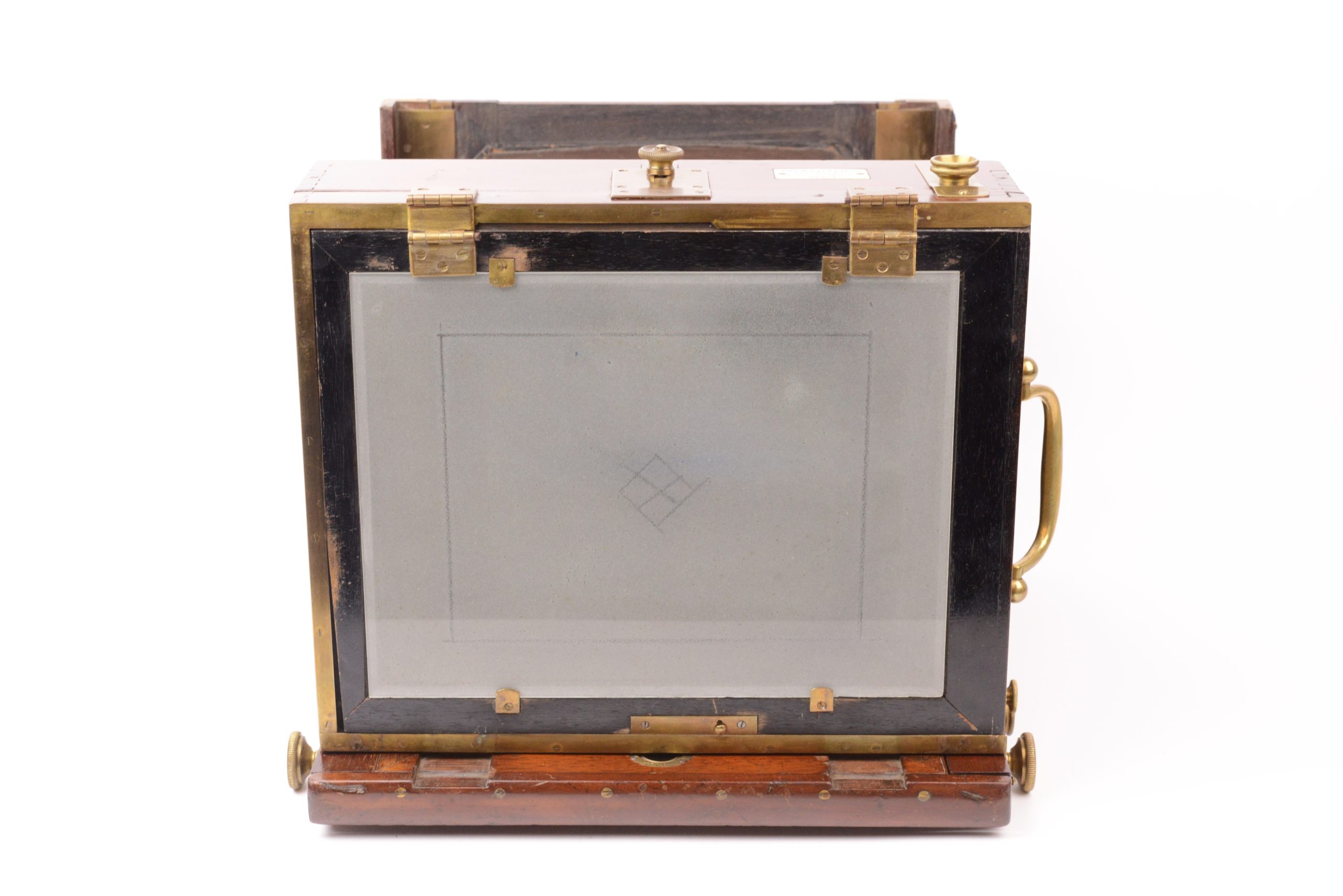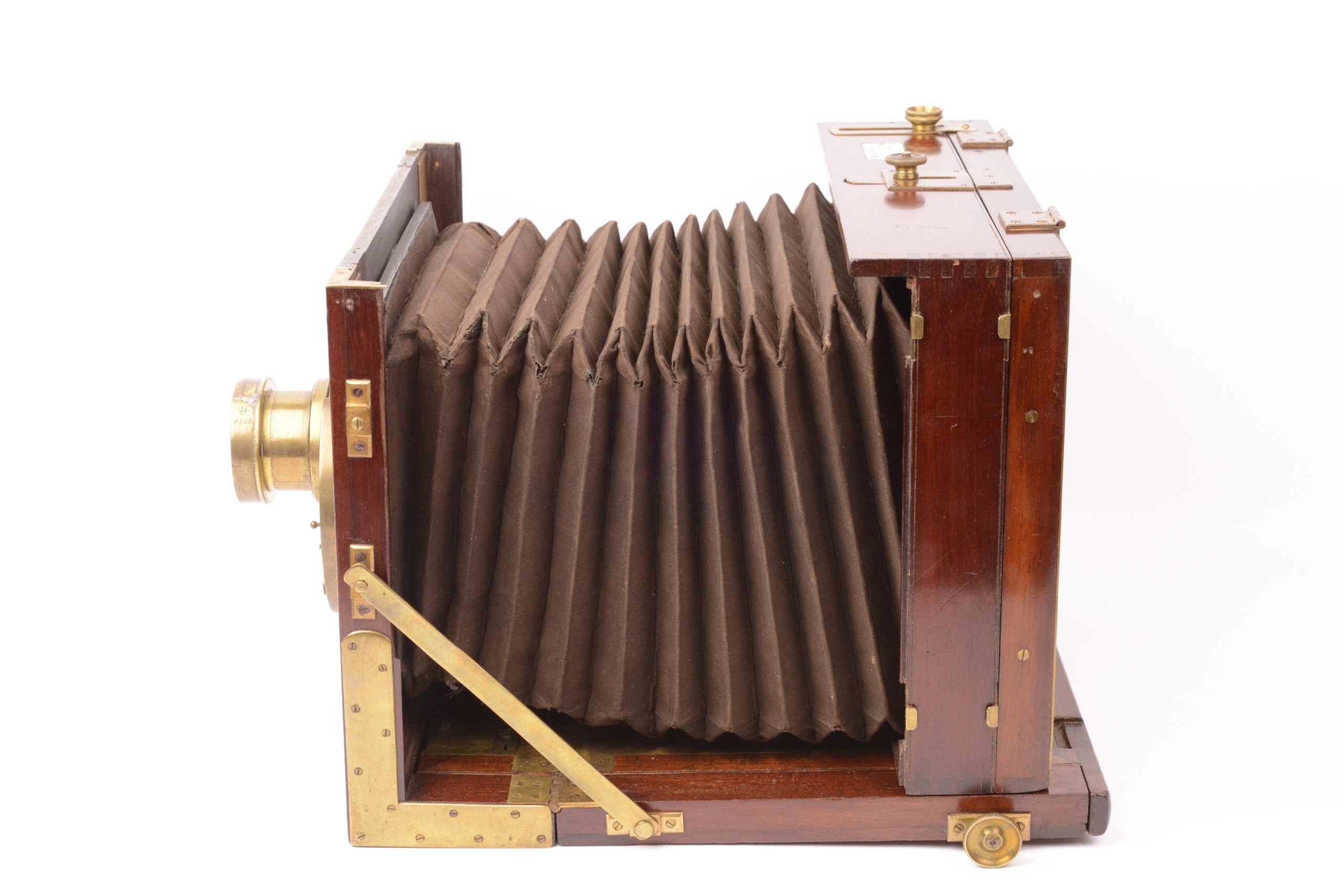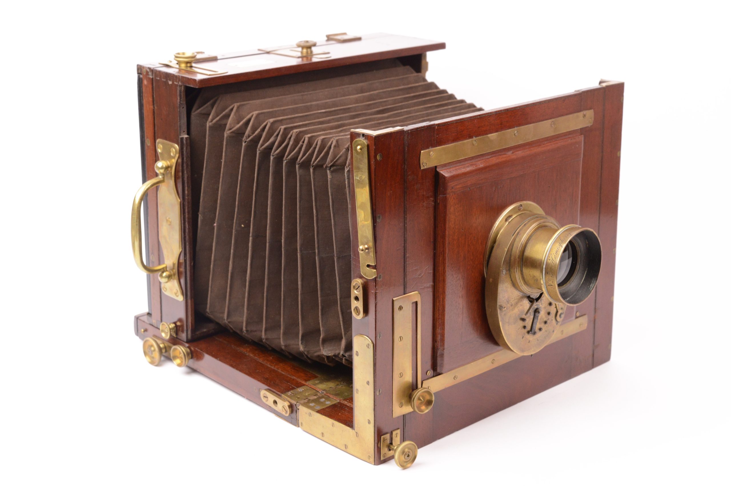 Chambre Duchâtellier Paris. Format 18x24 cm. Vers 1895. Plaque de fabrique portant mentions « <em>Duchâtellier Constructeur 70 rue des Rigoles Paris</em> ». Belle fabrication, ébénisterie en acajou rouge avec soufflet en cuir à coins rabattus. Garnitures métalliques en laiton poli. Obturateur tout en laiton rotatif à secteur Londe & Dessoudeix. Objectif Hémisphérique A. Darlot. Système de bascule du dos à l’arrière. Cadre pivotant portant verre dépoli. Planchette porte objectif refaite.