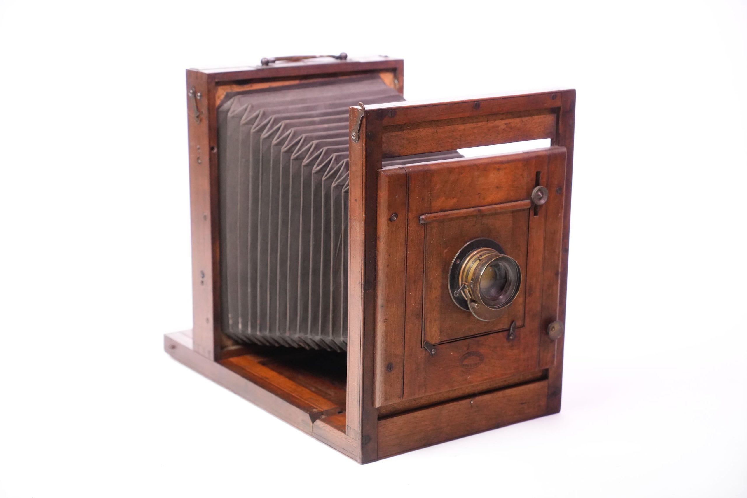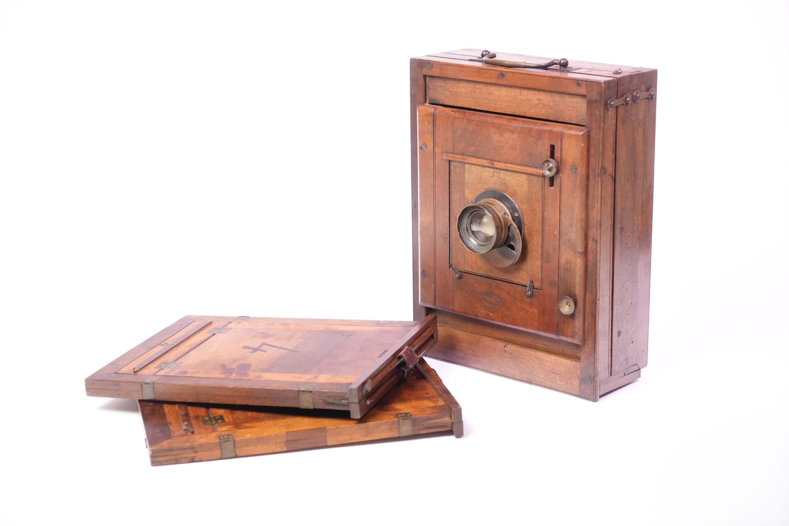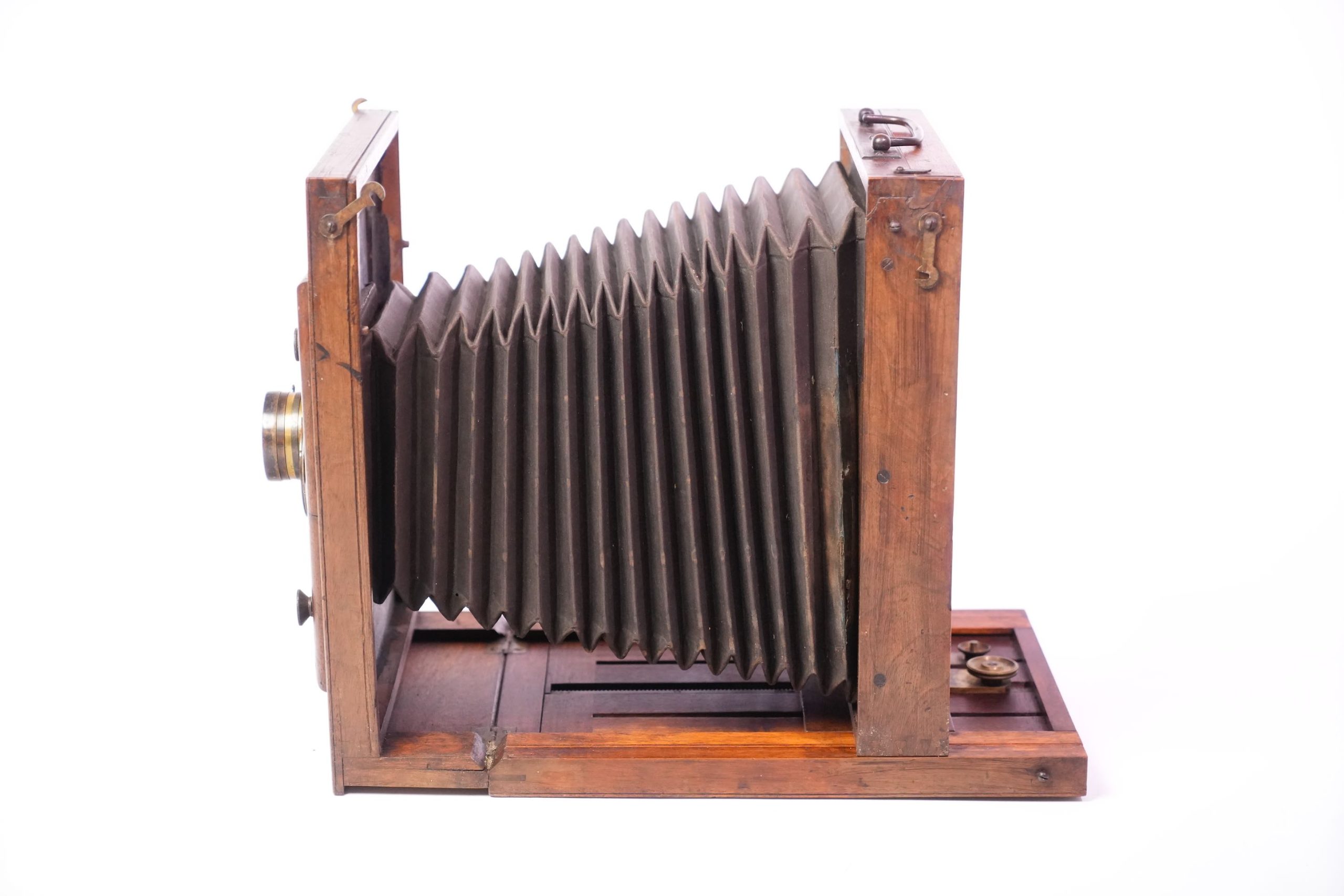 Chambre photographique d’époque au collodion sec, format 18 × 24 cm, vers 1870 Appareil de grand format typique de la transition entre le procédé au collodion humide et l’avènement des plaques au gélatino-bromure d’argent. Entièrement réalisé en noyer ciré avec ferrures en laiton poli, cet appareil combine élégance artisanale et précision fonctionnelle. Le soufflet noir permet le tirage variable pour la mise au point, tandis que la planchette avant accueille un objectif grand angle en laiton équipé d’un diaphragme rotatif. L’appareil est accompagné de 2 châssis doubles en bois pour plaques 18×24 cm, utilisés dans les ateliers ou pour la photographie d’extérieur.